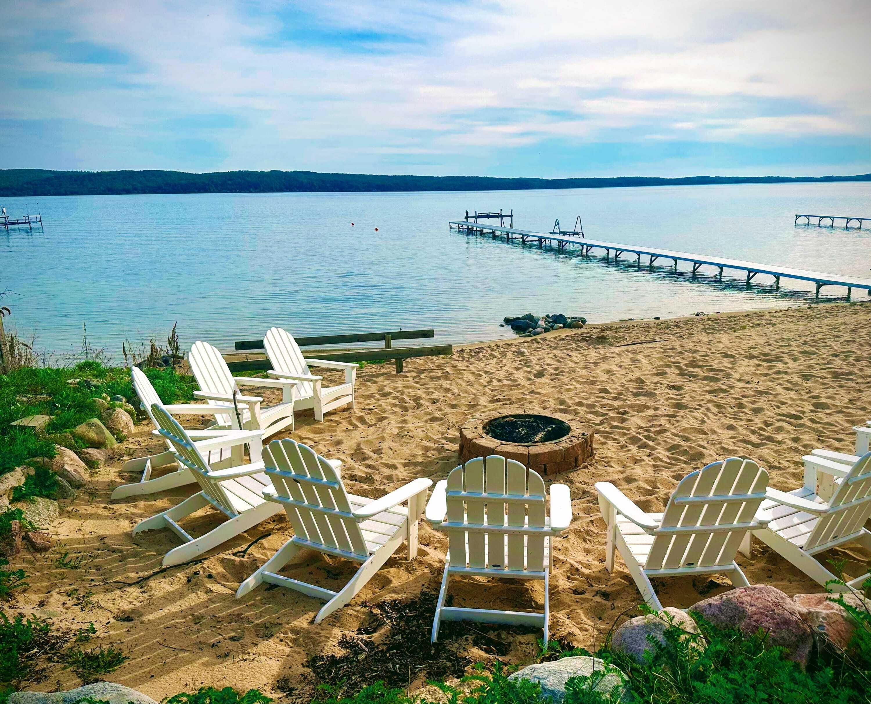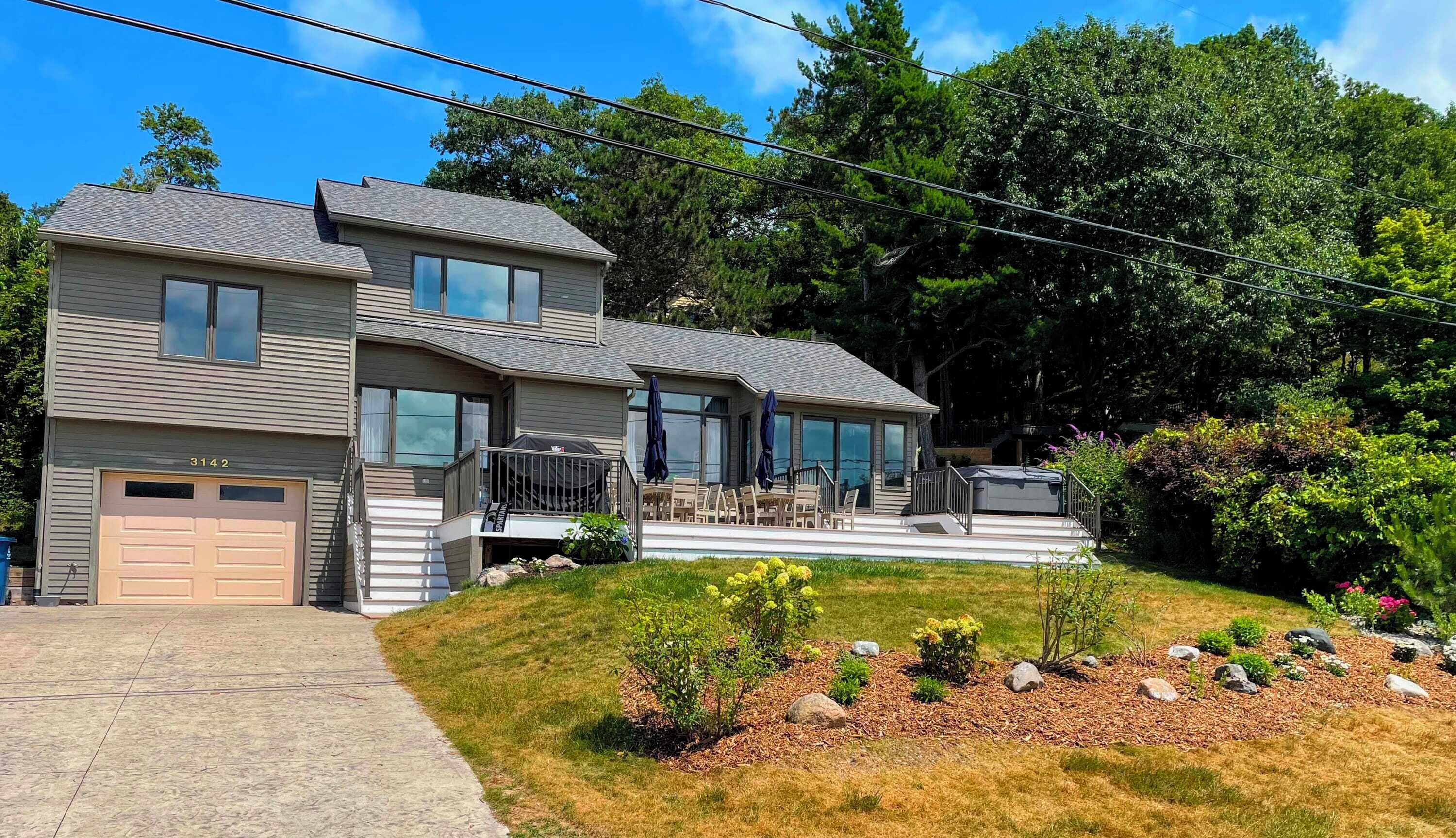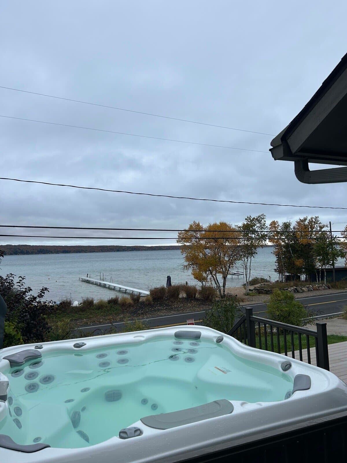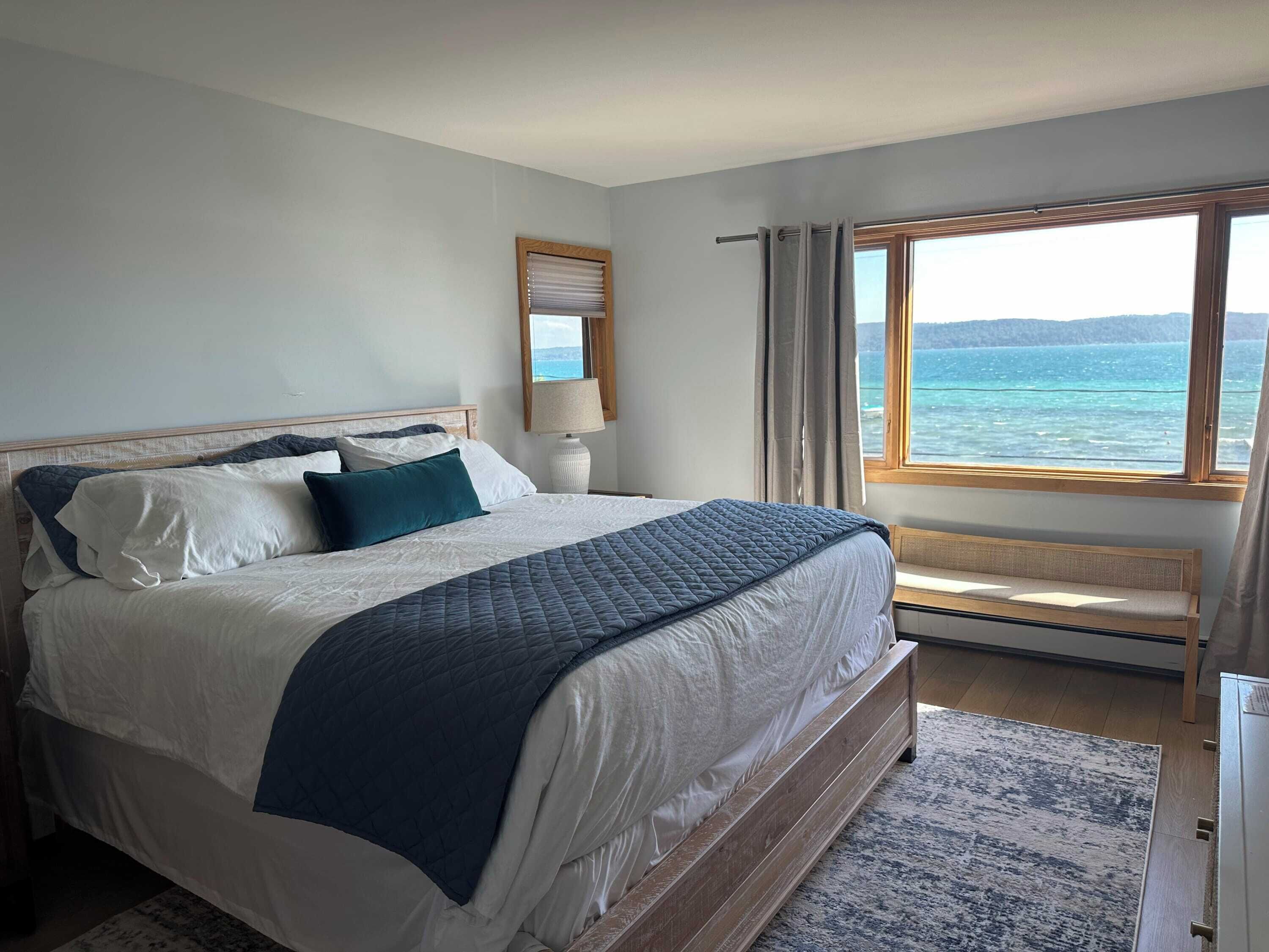 Crystal Lake Hillside with Private Sandy Beach Summary:This unique and spacious, renovated lakefront vacation home is the kind of place that Up North dreams are made of! Plenty of room for everyone -including the pups! Large deck in front with hot tub, and a spectacular view of sparkling Crystal Lake. **The house is separated from the beach by the road that circles Crystal Lake. It is not a busy road. ALL guests must be 25+ unless accompanied by a parent or guardian. See pet fee info below.The Space:Once inside this uniquely situated hillside home, you are treated to lake views from the main floor's array of large windows. The open floorplan on the main floor includes living room, dining and kitchen. Making your way up the extended grand staircase you'll find private bedrooms at each landing. In the main home there are: 5 bedrooms total, 3 full bathrooms, two kitchens, and a laundry room. Main House includes:1st Level - Living Room, Dining Area, Main Kitchen 2nd Level- Bedroom 1: Queen- Bedroom 2: Queen- Laundry room- Full bathroom with tub3rd level - Bedroom 3: Master King - Full bathroom4th level - Bedroom 4: Balcony room: King + Twin trundle daybed- Bedroom 5: 3 Bunk beds (6 twin mattresses)- Full bathroom- Kitchenette Outside:You will have access to a firepit and a private, sandy beachfront just across the street. There is a hot tub on the front deck overlooking the water, open year-round!In the summer months a dock and mooring ball will be available as well. This spacious lakefront home is 4,298 square feet in total.Guest Access:Parking: There is space for 4 standard sized vehicles in the front driveway. No garage parking at this time. Welcome to northern Michigan, where our wintertime weather can swing from glorious to ferocious in a flash. Each of our properties has snow removal service scheduled to plow with each snowfall amounting to at least 3 inches of snow. If the vehicle you bring is not 4-Wheel or All-Wheel Drive, please be aware of the potential risks accessing the property when snow is present.The Neighborhood:Crystal Lake is considered to be one of the most beautiful lakes in northern Michigan.Other Things to Note:*Please Note: All guests staying at this property must be 25 or older unless accompanied by a parent or guardian. This will be verified after booking confirmation.*A damage waiver fee is required by Golden Swan for each stay. For this property, the fee is $149 and provides our guests with accidental damage coverage up to $2500. If the amount of damage exceeds this, or if the damage is found to have occurred with malicious intent, Golden Swan retains the right to seek damages beyond that amount.High chair and pack n play available upon request for an additional fee.There is a non-refundable credit card processing fee applied to all reservations.If the reservation is 14 days or longer there will be a required mid-stay clean. This is also available upon request for a shorter length of stay.Dogs are allowed with an additional fee, with a maximum of 2 dogs. Please be advised that it is absolutely imperative for all renters to keep their dogs on a leash at all times. While we truly appreciate and value pets, ensuring that our furry friends are leashed or properly secured is of utmost importance to us. Please take your pup with you or kennel them when you leave the home. We cannot have lonely barking dogs left at our property. Please be considerate and clean up after your pet.DOCK: You can expect the dock to be available for use Memorial Weekend through Labor Day Weekend. Please only use the dock for 15-minute loading and unloading of passengers. A mooring ball just beyond it is available for mooring between boat rides. Winds and waves pick up super-quick and can cause damage to boats and docks. There are no protective dock bumpers to prevent potential boat-docking issues.