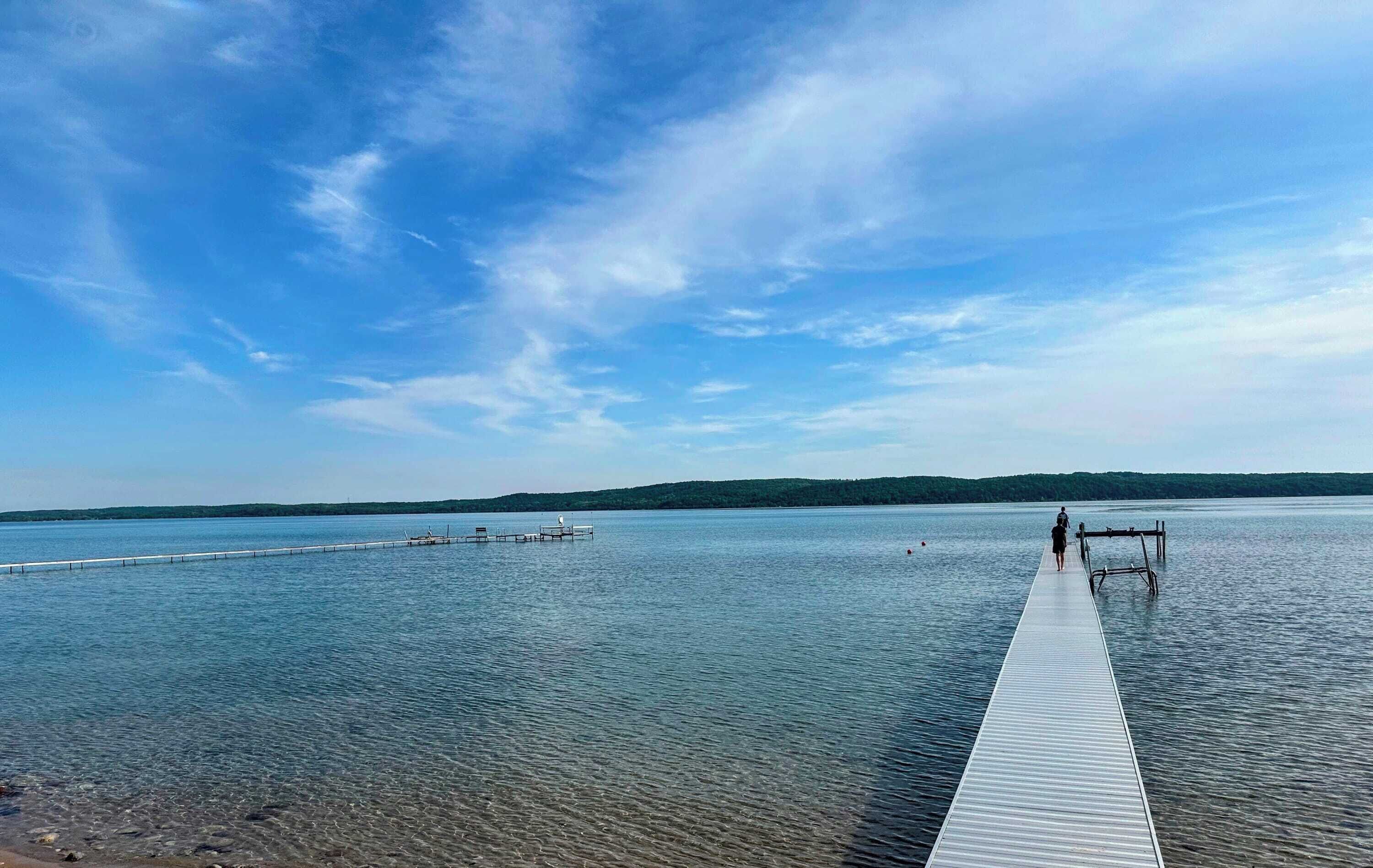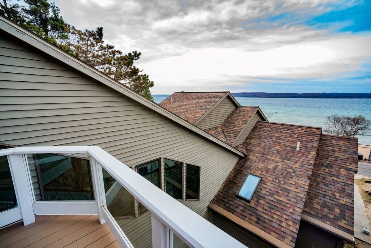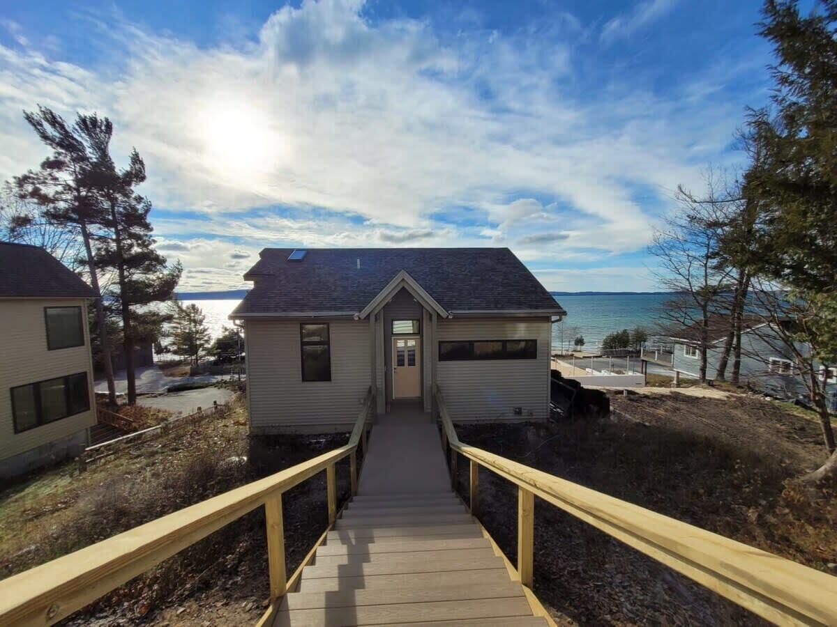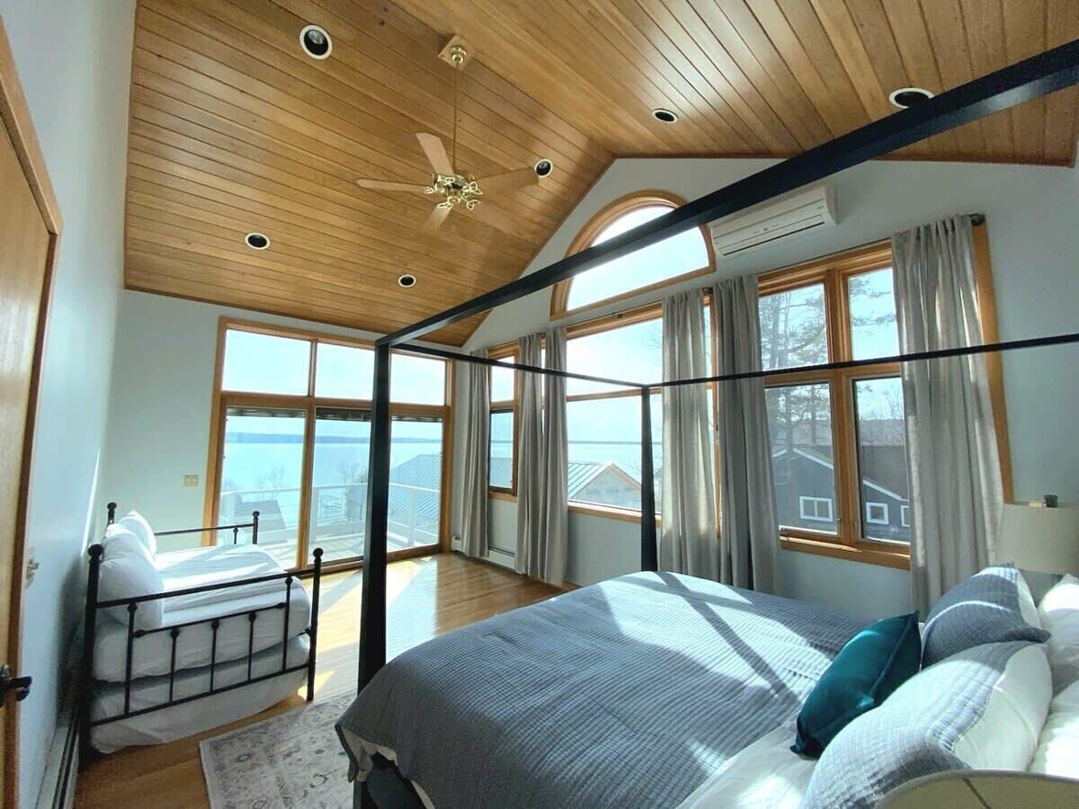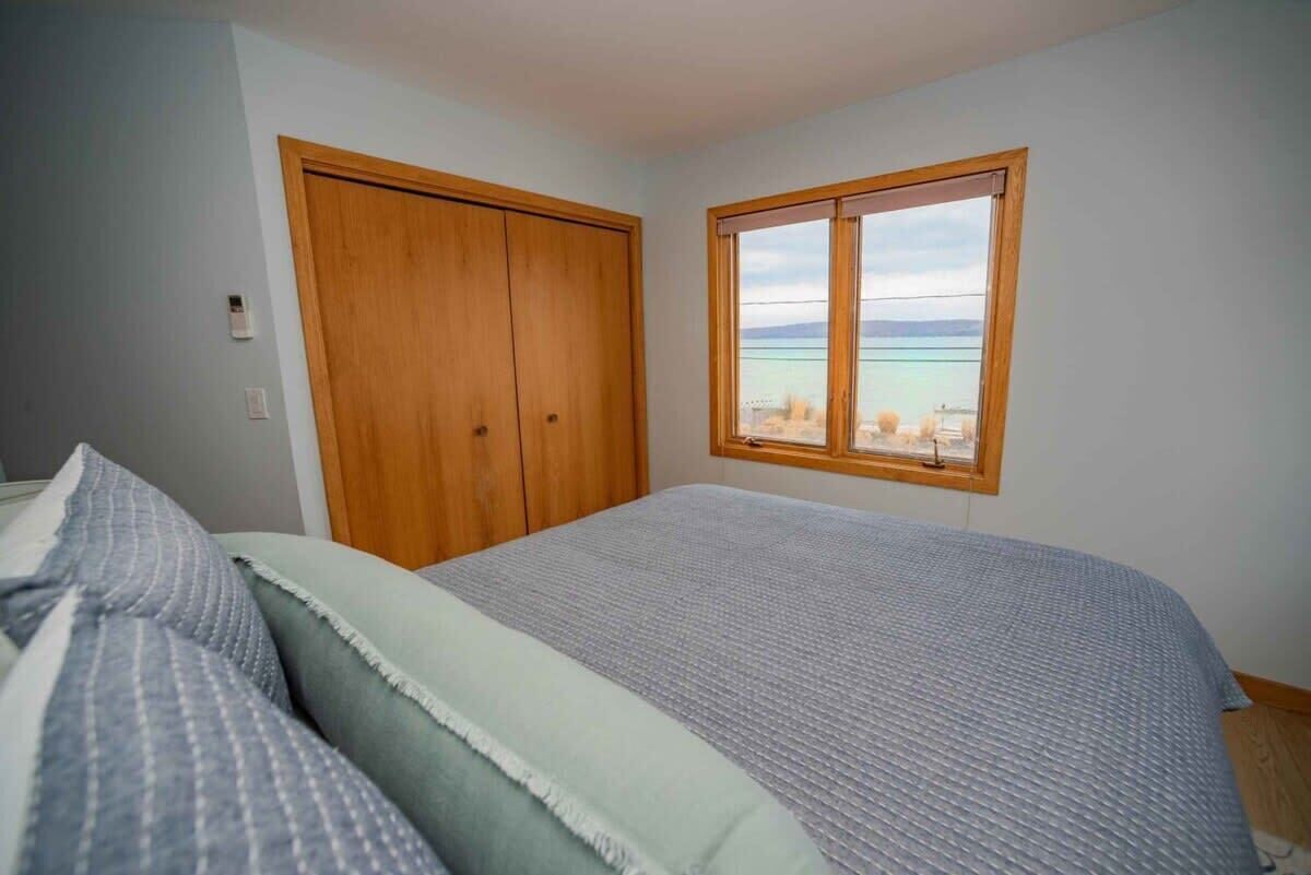 Crystal Lake Hillside with Private Sandy Beach Summary:This unique and spacious, renovated lakefront vacation home is the kind of place that Up North dreams are made of! Plenty of room for everyone -including the pups! Large deck in front with hot tub, and a spectacular view of sparkling Crystal Lake. **The house is separated from the beach by the road that circles Crystal Lake. It is not a busy road. ALL guests must be 25+ unless accompanied by a parent or guardian. See pet fee info below.The Space:Once inside this uniquely situated hillside home, you are treated to lake views from the main floor's array of large windows. The open floorplan on the main floor includes living room, dining and kitchen. Making your way up the extended grand staircase you'll find private bedrooms at each landing. In the main home there are: 5 bedrooms total, 3 full bathrooms, two kitchens, and a laundry room. Main House includes:1st Level - Living Room, Dining Area, Main Kitchen 2nd Level- Bedroom 1: Queen- Bedroom 2: Queen- Laundry room- Full bathroom with tub3rd level - Bedroom 3: Master King - Full bathroom4th level - Bedroom 4: Balcony room: King + Twin trundle daybed- Bedroom 5: 3 Bunk beds (6 twin mattresses)- Full bathroom- Kitchenette Outside:You will have access to a firepit and a private, sandy beachfront just across the street. There is a hot tub on the front deck overlooking the water, open year-round!In the summer months a dock and mooring ball will be available as well. This spacious lakefront home is 4,298 square feet in total.Guest Access:Parking: There is space for 4 standard sized vehicles in the front driveway. No garage parking at this time. Welcome to northern Michigan, where our wintertime weather can swing from glorious to ferocious in a flash. Each of our properties has snow removal service scheduled to plow with each snowfall amounting to at least 3 inches of snow. If the vehicle you bring is not 4-Wheel or All-Wheel Drive, please be aware of the potential risks accessing the property when snow is present.The Neighborhood:Crystal Lake is considered to be one of the most beautiful lakes in northern Michigan.Other Things to Note:*Please Note: All guests staying at this property must be 25 or older unless accompanied by a parent or guardian. This will be verified after booking confirmation.*A damage waiver fee is required by Golden Swan for each stay. For this property, the fee is $149 and provides our guests with accidental damage coverage up to $2500. If the amount of damage exceeds this, or if the damage is found to have occurred with malicious intent, Golden Swan retains the right to seek damages beyond that amount.High chair and pack n play available upon request for an additional fee.There is a non-refundable credit card processing fee applied to all reservations.If the reservation is 14 days or longer there will be a required mid-stay clean. This is also available upon request for a shorter length of stay.Dogs are allowed with an additional fee, with a maximum of 2 dogs. Please be advised that it is absolutely imperative for all renters to keep their dogs on a leash at all times. While we truly appreciate and value pets, ensuring that our furry friends are leashed or properly secured is of utmost importance to us. Please take your pup with you or kennel them when you leave the home. We cannot have lonely barking dogs left at our property. Please be considerate and clean up after your pet.DOCK: You can expect the dock to be available for use Memorial Weekend through Labor Day Weekend. Please only use the dock for 15-minute loading and unloading of passengers. A mooring ball just beyond it is available for mooring between boat rides. Winds and waves pick up super-quick and can cause damage to boats and docks. There are no protective dock bumpers to prevent potential boat-docking issues.