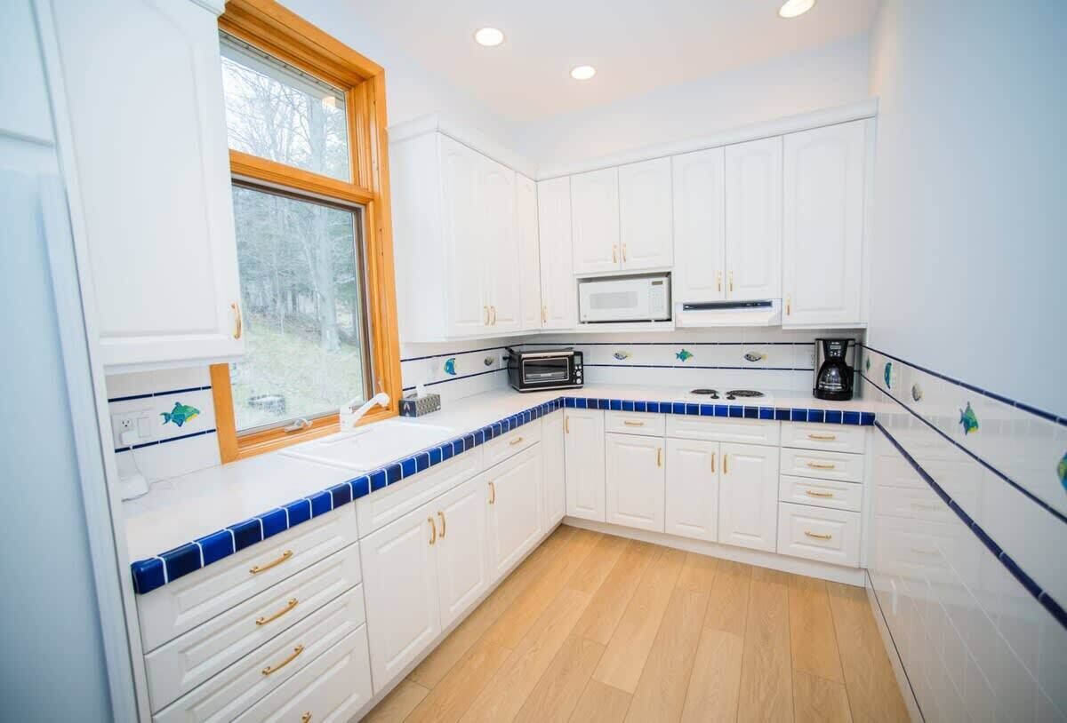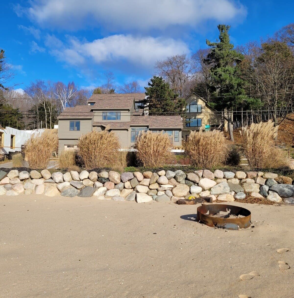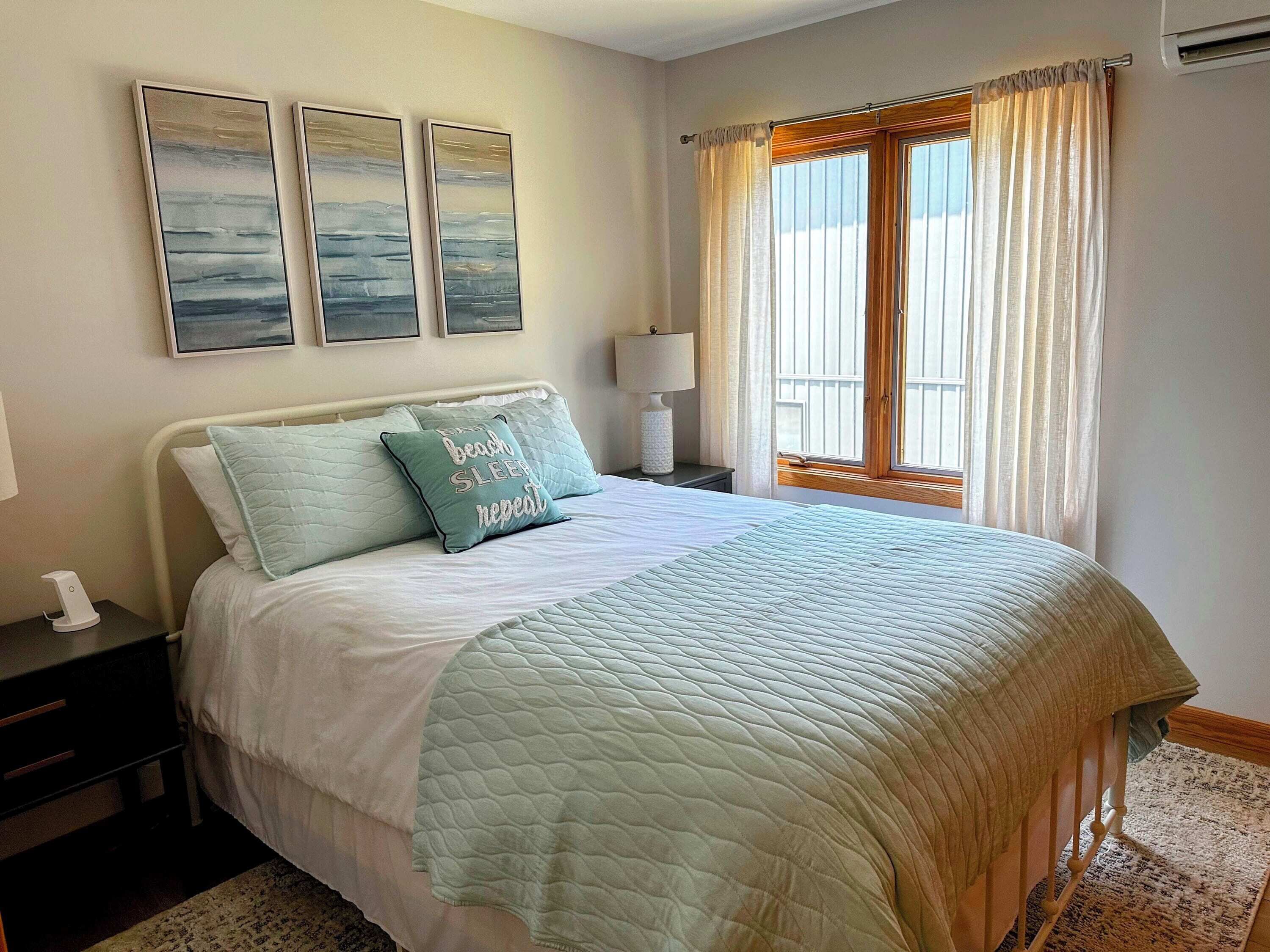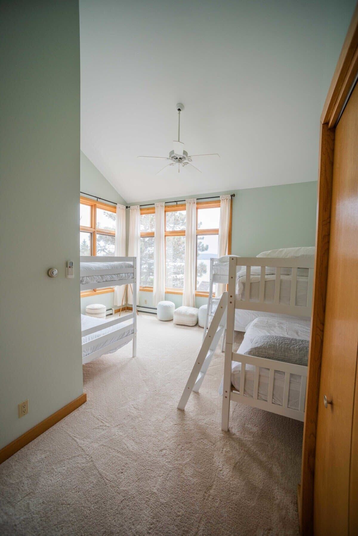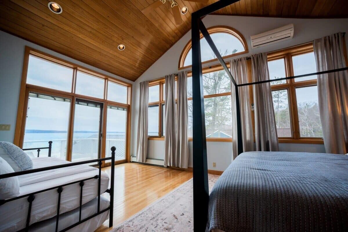 Crystal Lake Hillside with Private Sandy Beach Summary:This unique and spacious, renovated lakefront vacation home is the kind of place that Up North dreams are made of! Plenty of room for everyone -including the pups! Large deck in front with hot tub, and a spectacular view of sparkling Crystal Lake. **The house is separated from the beach by the road that circles Crystal Lake. It is not a busy road. ALL guests must be 25+ unless accompanied by a parent or guardian. See pet fee info below.The Space:Once inside this uniquely situated hillside home, you are treated to lake views from the main floor's array of large windows. The open floorplan on the main floor includes living room, dining and kitchen. Making your way up the extended grand staircase you'll find private bedrooms at each landing. In the main home there are: 5 bedrooms total, 3 full bathrooms, two kitchens, and a laundry room. Main House includes:1st Level - Living Room, Dining Area, Main Kitchen 2nd Level- Bedroom 1: Queen- Bedroom 2: Queen- Laundry room- Full bathroom with tub3rd level - Bedroom 3: Master King - Full bathroom4th level - Bedroom 4: Balcony room: King + Twin trundle daybed- Bedroom 5: 3 Bunk beds (6 twin mattresses)- Full bathroom- Kitchenette Outside:You will have access to a firepit and a private, sandy beachfront just across the street. There is a hot tub on the front deck overlooking the water, open year-round!In the summer months a dock and mooring ball will be available as well. This spacious lakefront home is 4,298 square feet in total.Guest Access:Parking: There is space for 4 standard sized vehicles in the front driveway. No garage parking at this time. Welcome to northern Michigan, where our wintertime weather can swing from glorious to ferocious in a flash. Each of our properties has snow removal service scheduled to plow with each snowfall amounting to at least 3 inches of snow. If the vehicle you bring is not 4-Wheel or All-Wheel Drive, please be aware of the potential risks accessing the property when snow is present.The Neighborhood:Crystal Lake is considered to be one of the most beautiful lakes in northern Michigan.Other Things to Note:*Please Note: All guests staying at this property must be 25 or older unless accompanied by a parent or guardian. This will be verified after booking confirmation.*A damage waiver fee is required by Golden Swan for each stay. For this property, the fee is $149 and provides our guests with accidental damage coverage up to $2500. If the amount of damage exceeds this, or if the damage is found to have occurred with malicious intent, Golden Swan retains the right to seek damages beyond that amount.High chair and pack n play available upon request for an additional fee.There is a non-refundable credit card processing fee applied to all reservations.If the reservation is 14 days or longer there will be a required mid-stay clean. This is also available upon request for a shorter length of stay.Dogs are allowed with an additional fee, with a maximum of 2 dogs. Please be advised that it is absolutely imperative for all renters to keep their dogs on a leash at all times. While we truly appreciate and value pets, ensuring that our furry friends are leashed or properly secured is of utmost importance to us. Please take your pup with you or kennel them when you leave the home. We cannot have lonely barking dogs left at our property. Please be considerate and clean up after your pet.DOCK: You can expect the dock to be available for use Memorial Weekend through Labor Day Weekend. Please only use the dock for 15-minute loading and unloading of passengers. A mooring ball just beyond it is available for mooring between boat rides. Winds and waves pick up super-quick and can cause damage to boats and docks. There are no protective dock bumpers to prevent potential boat-docking issues.