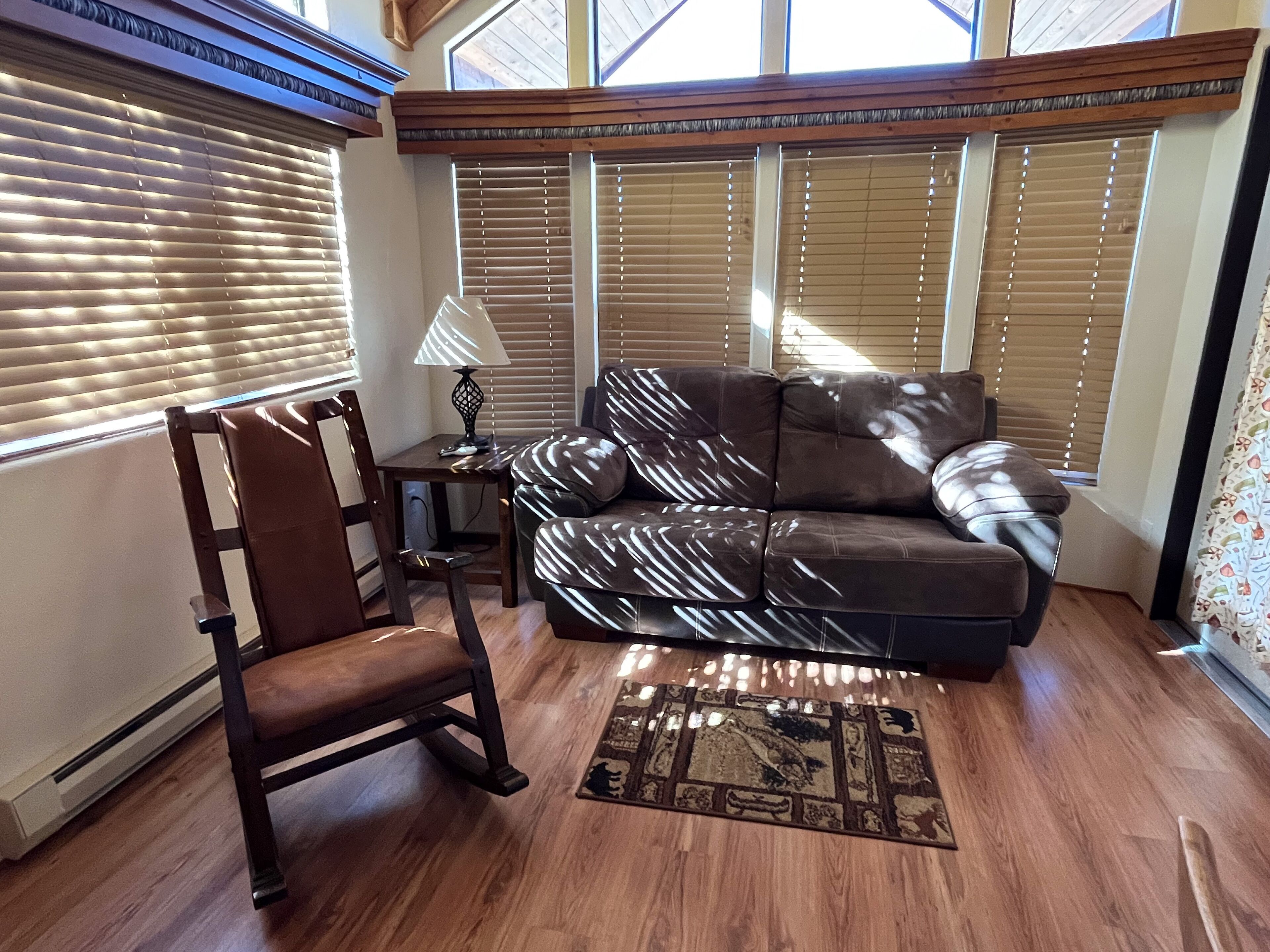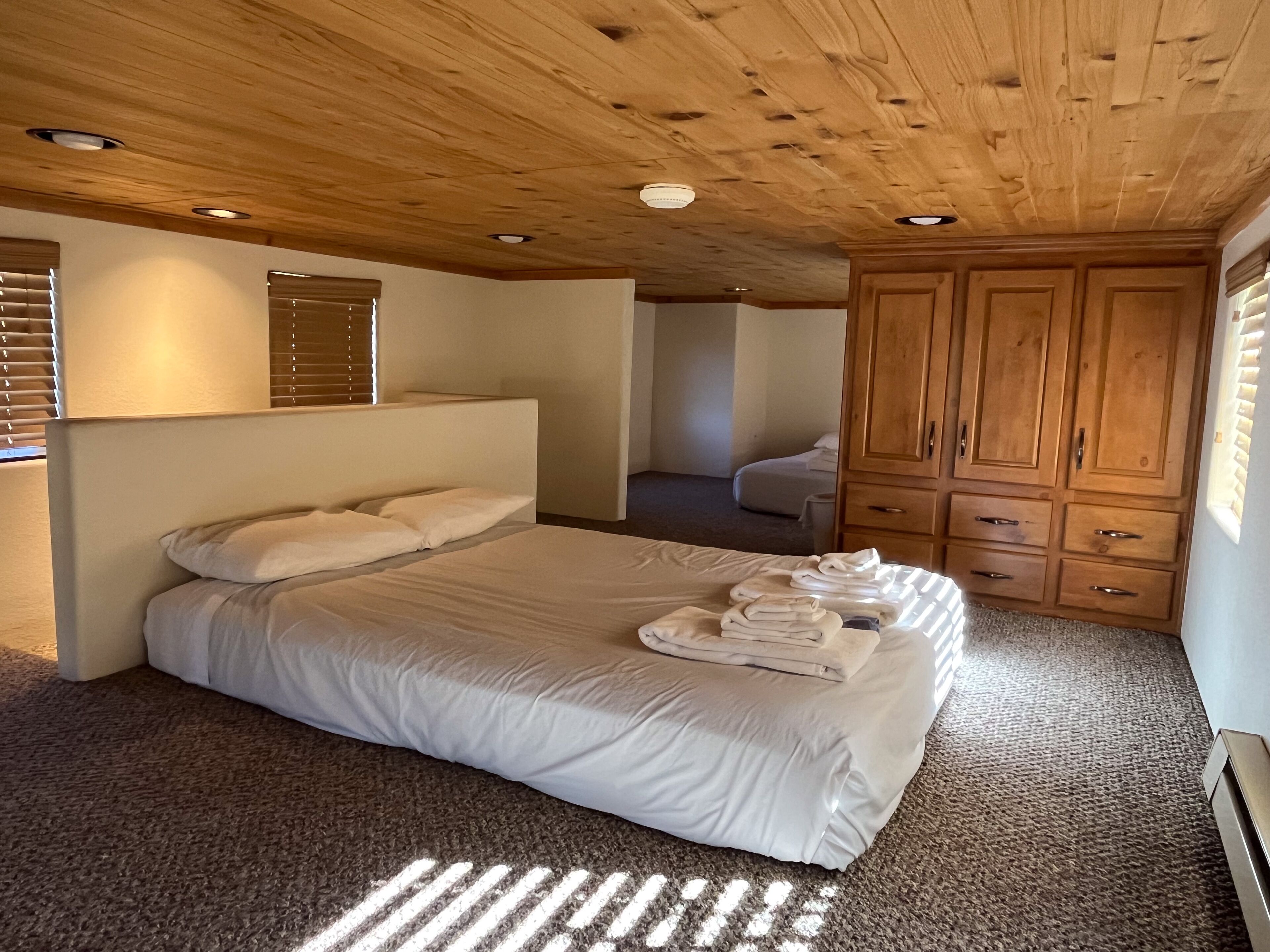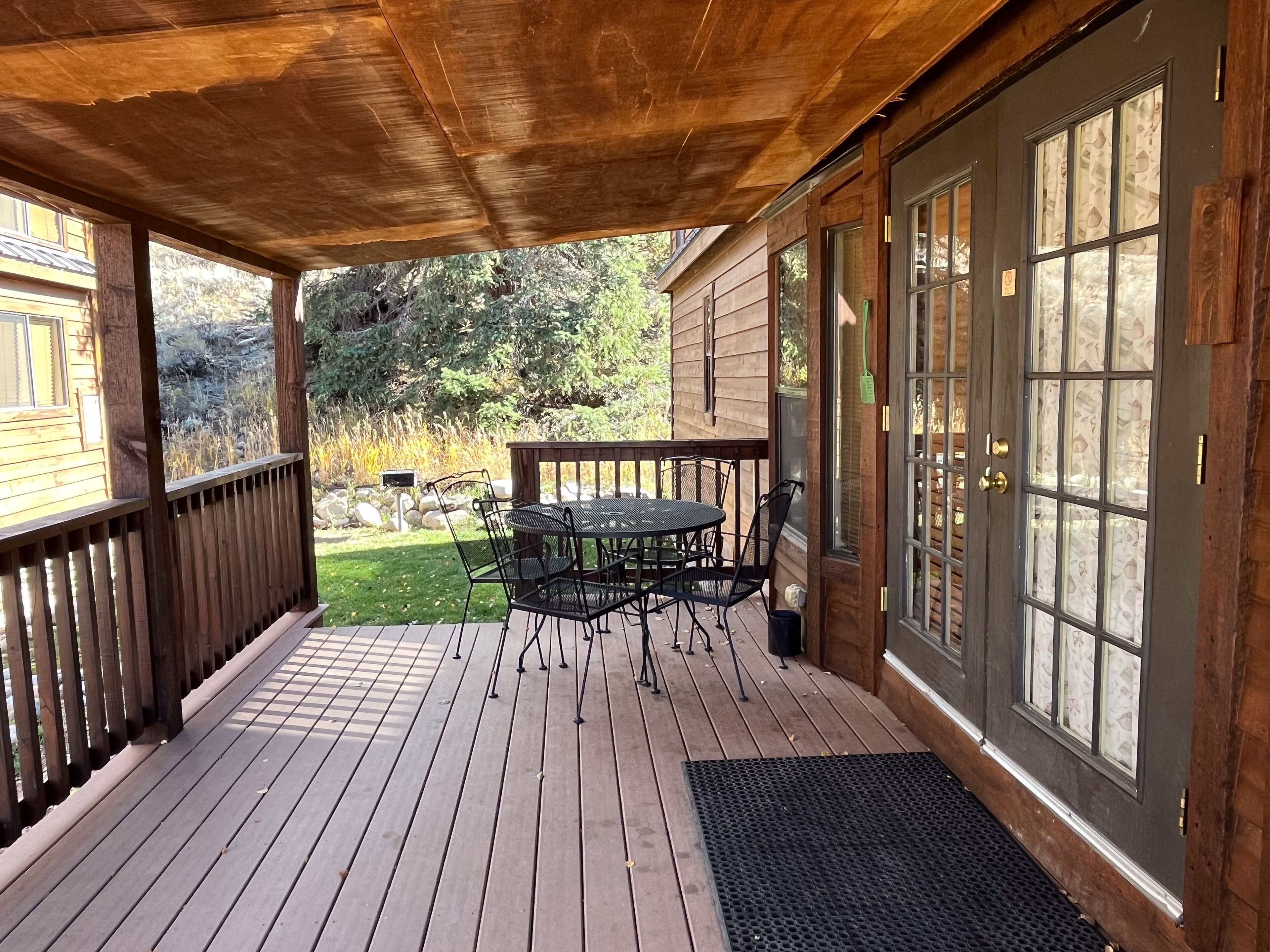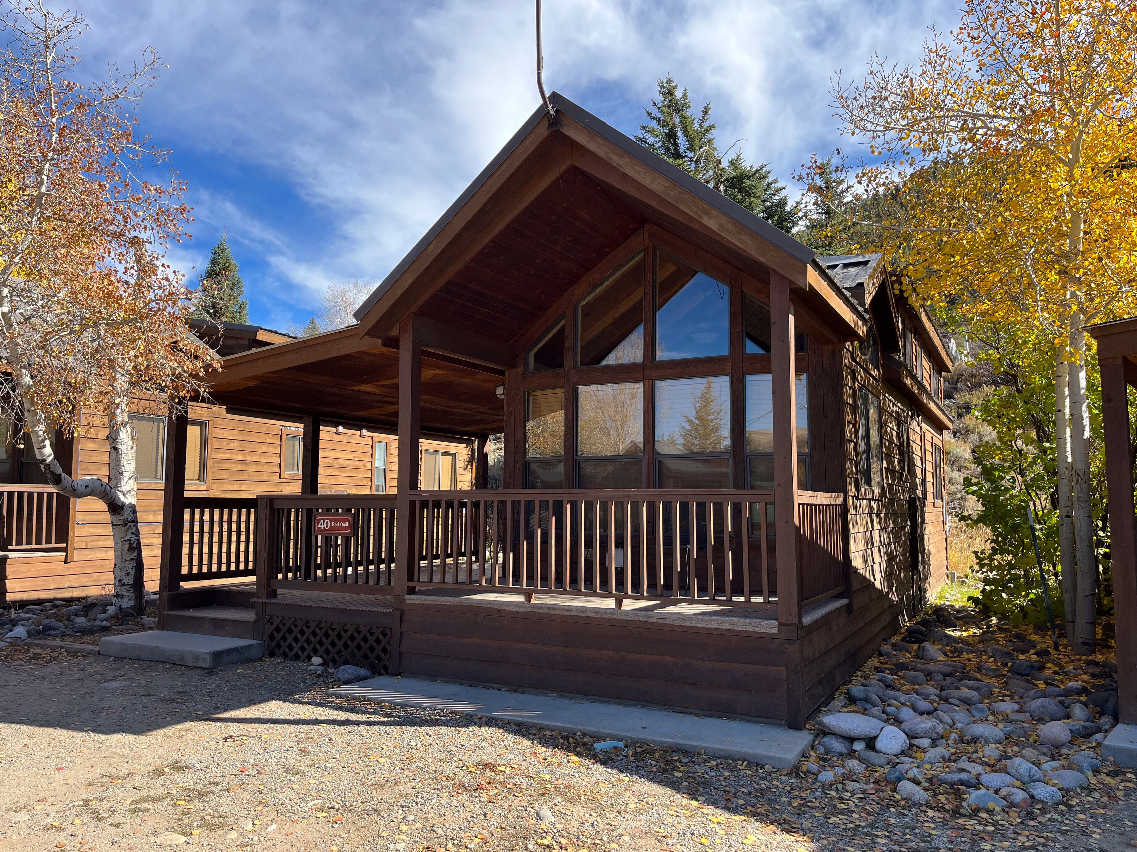 Cozy "Tiny Home" style Cabin Perfect for Couples and Families Red Quill (Every cabin is named after a fly pattern.) Cabins 39-44 are identical styles with cabin 49 being similar but having a slightly different layout. These tiny home “mountain chalets” offer all the amenities of a cabin in a modern and compact package. They are perfect for families. There is a private bedroom downstairs and a low ceiling (4 feet high) sleeping loft upstairs with mattresses on the floor. Kids love to have their own space to crawl around up here. If anyone is very big or tall, these may not be the best cabin choice. *Note of caution for small children: the steps going up to the loft are steep and narrow and could present a falling hazard. The railing in the upper sleeping loft is high but a small child could potentially climb over, presenting a dangerous falling hazard. If you have small children, a gate for the loft stairwell is recommended.• Approximately 400 square feet • The bedroom has a Queen size bed and the loft has 2 full size mattresses on the floor • Full size sofa in living room (not a hide-a-bed).• Covered open deck with patio table/chairs• Nearby community fire ring may be used• Supplies included: paper towels, toilet paper, facial tissues, bar soap, hairdryer, trash bags, dish soap • Not included: Anything edible (including coffee, condiments, spices), laundry detergent, shampoo and toiletries• Parking is somewhat limited in these cabins and is limited to 2 vehicles per unit or a vehicle and small trailer (not longer than a full size pick-up truck) unhitched and parked side by side with the vehicle. Additional vehicles and longer trailers may require parking separate from the cabin and fees may apply. • All Three Rivers Resort guests have access to private fishing on the Taylor River bordering the resort property.**For VRBO guests, please refer to your reservation confirmation sent to your email after booking for check-in and unit details. We operate like a hotel with a front desk.** All units are designated as non-smoking (including marijuana). Dogs allowed for an additional nightly fee, maximum of 2 dogs. No cats or other animals. Dogs may not be left alone in cabins at any time. Nightly rate is based on 4 people. Maximum occupancy is 4. Rates are typically higher during the peak season from May – September/early October and during holiday periods. Rates are adjusted based on occupancy and can change at any time. For exact rates, enter your trip dates in the availability search.**If online search results produce a limited listing of available units for your dates, please call us as availability can change quickly. For one night only or arrival within the next 2 days, you must contact the office directly.**