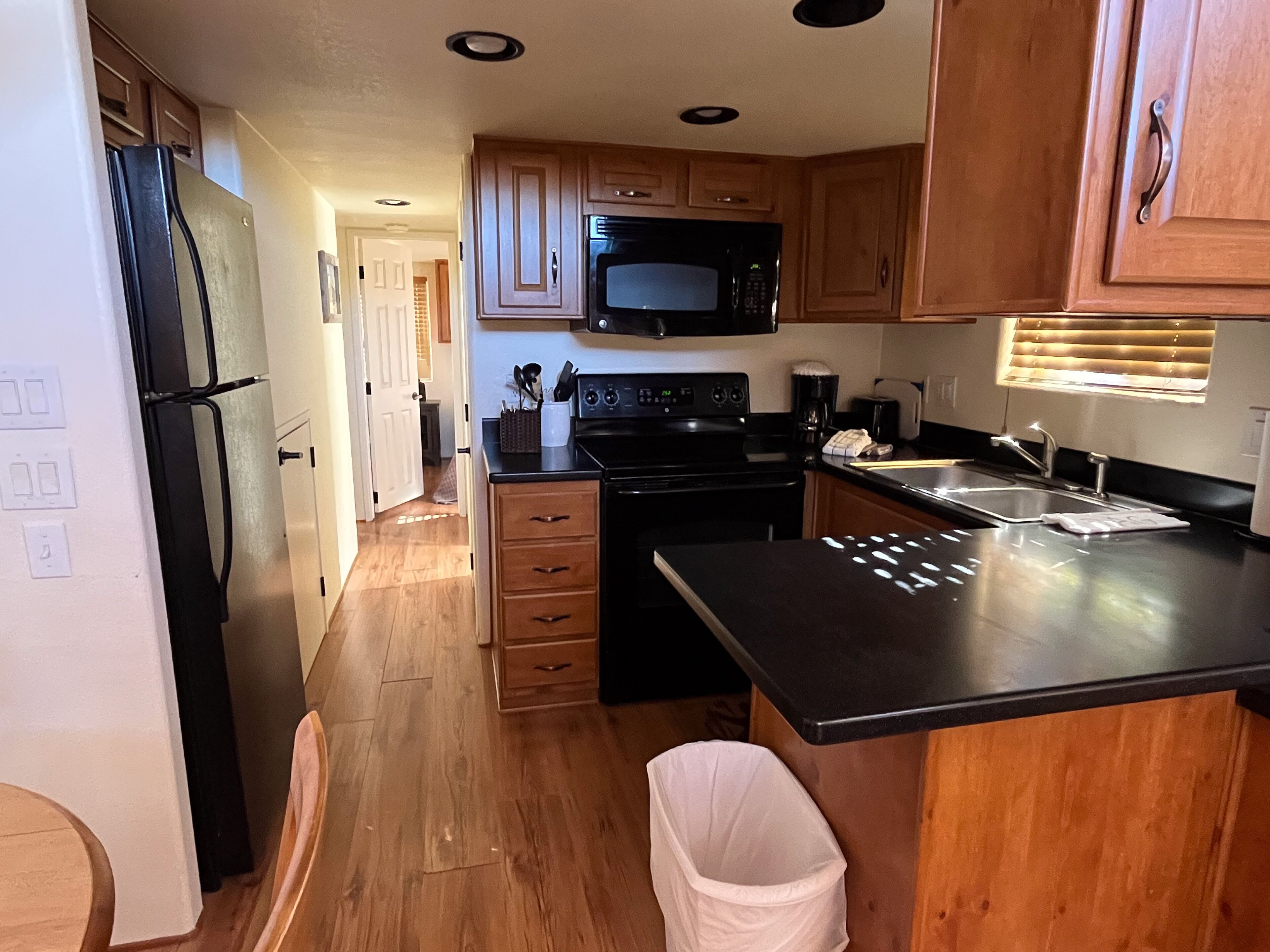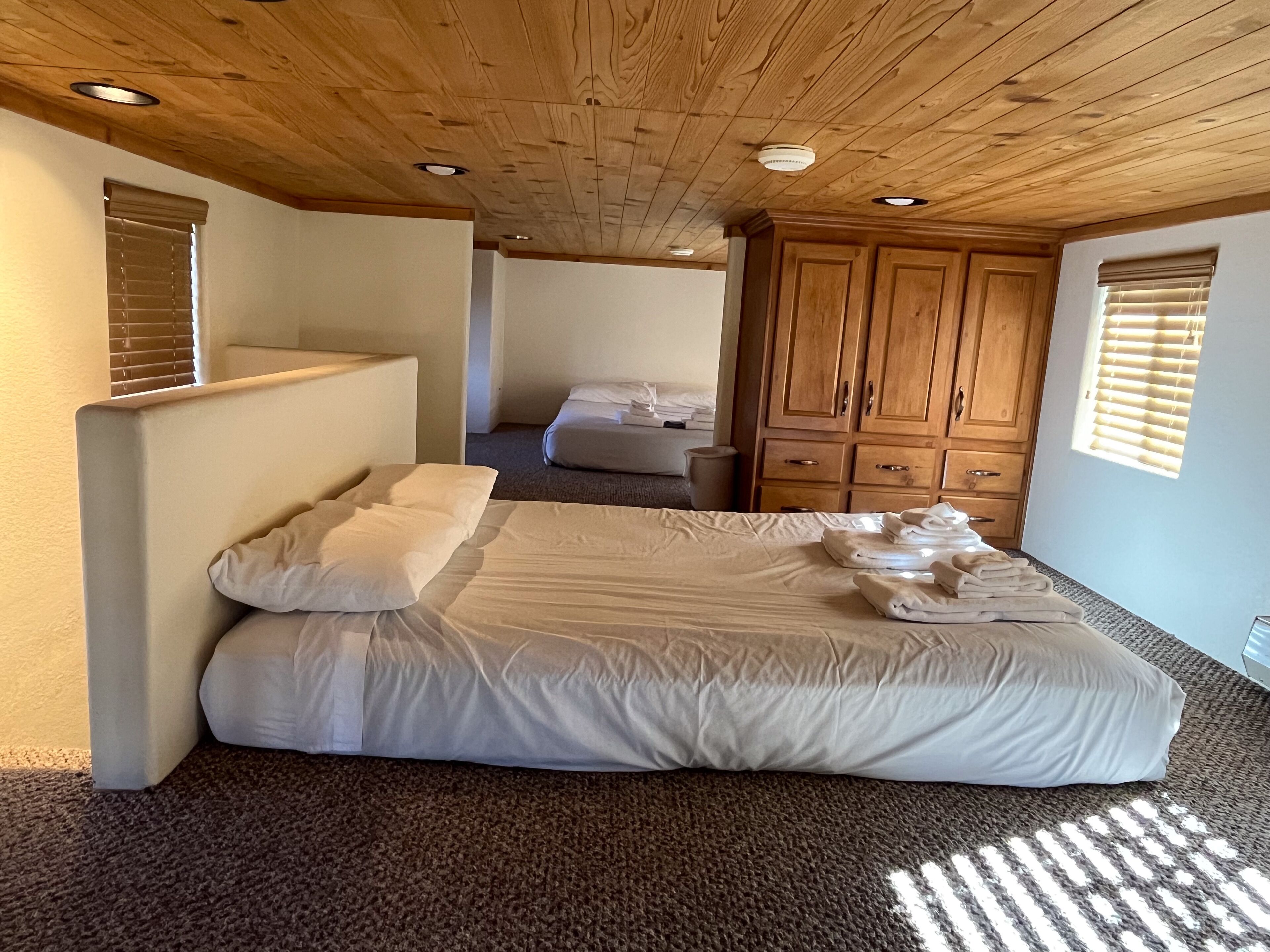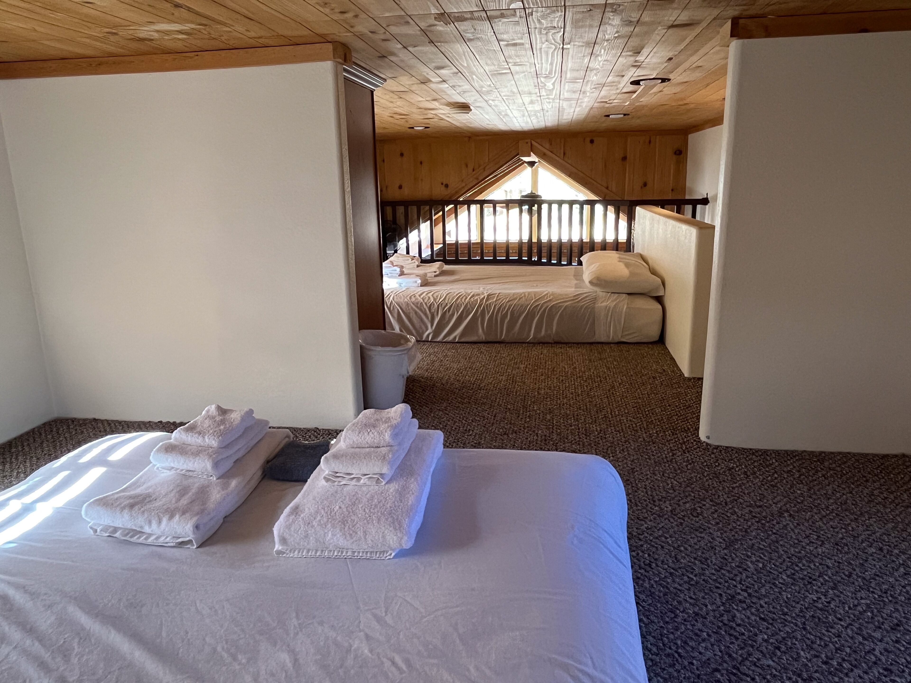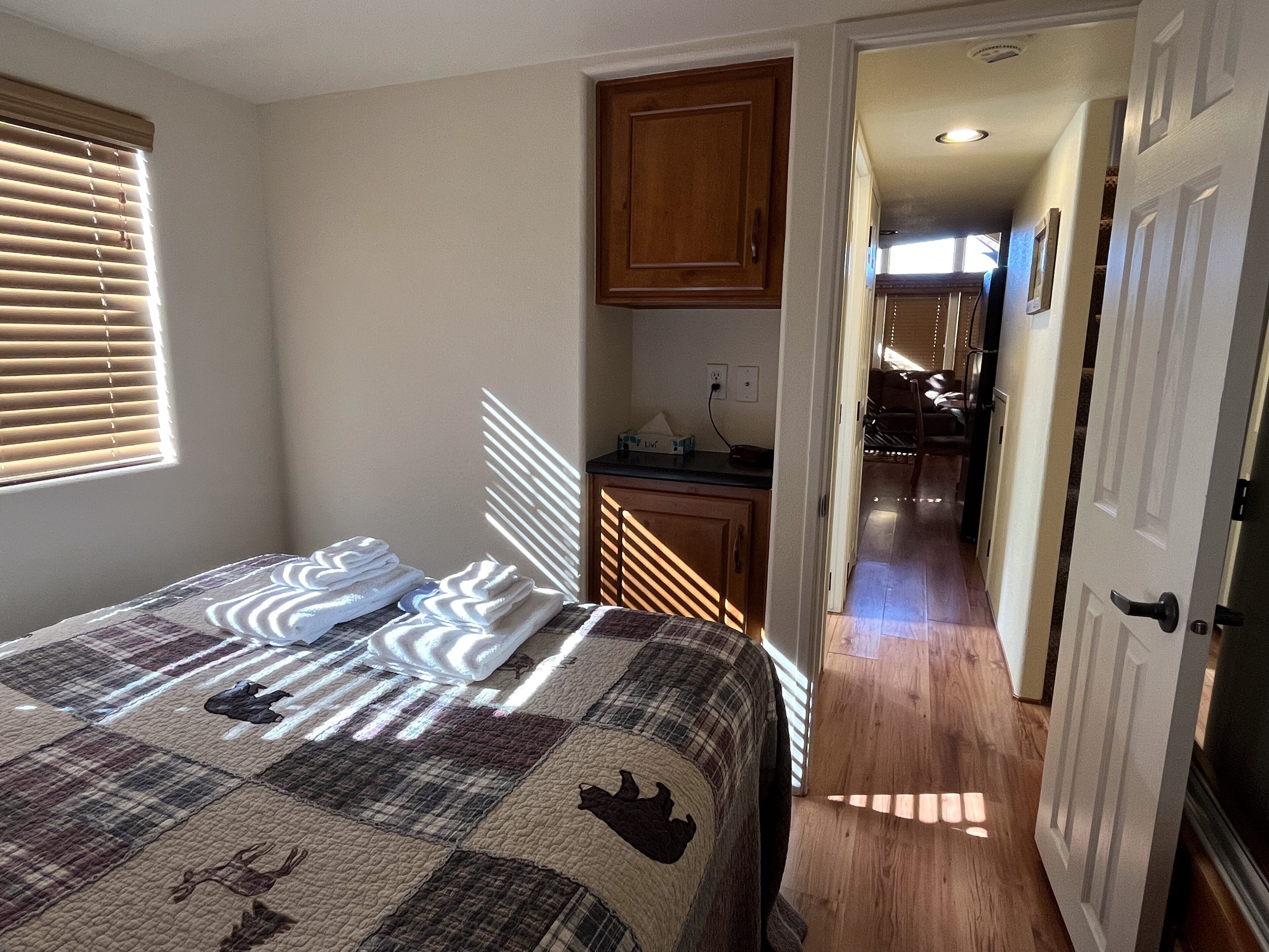 Cozy "Tiny Home" style Cabin Perfect for Couples and Families Red Quill (Every cabin is named after a fly pattern.) Cabins 39-44 are identical styles with cabin 49 being similar but having a slightly different layout. These tiny home “mountain chalets” offer all the amenities of a cabin in a modern and compact package. They are perfect for families. There is a private bedroom downstairs and a low ceiling (4 feet high) sleeping loft upstairs with mattresses on the floor. Kids love to have their own space to crawl around up here. If anyone is very big or tall, these may not be the best cabin choice. *Note of caution for small children: the steps going up to the loft are steep and narrow and could present a falling hazard. The railing in the upper sleeping loft is high but a small child could potentially climb over, presenting a dangerous falling hazard. If you have small children, a gate for the loft stairwell is recommended.• Approximately 400 square feet • The bedroom has a Queen size bed and the loft has 2 full size mattresses on the floor • Full size sofa in living room (not a hide-a-bed).• Covered open deck with patio table/chairs• Nearby community fire ring may be used• Supplies included: paper towels, toilet paper, facial tissues, bar soap, hairdryer, trash bags, dish soap • Not included: Anything edible (including coffee, condiments, spices), laundry detergent, shampoo and toiletries• Parking is somewhat limited in these cabins and is limited to 2 vehicles per unit or a vehicle and small trailer (not longer than a full size pick-up truck) unhitched and parked side by side with the vehicle. Additional vehicles and longer trailers may require parking separate from the cabin and fees may apply. • All Three Rivers Resort guests have access to private fishing on the Taylor River bordering the resort property.**For VRBO guests, please refer to your reservation confirmation sent to your email after booking for check-in and unit details. We operate like a hotel with a front desk.** All units are designated as non-smoking (including marijuana). Dogs allowed for an additional nightly fee, maximum of 2 dogs. No cats or other animals. Dogs may not be left alone in cabins at any time. Nightly rate is based on 4 people. Maximum occupancy is 4. Rates are typically higher during the peak season from May – September/early October and during holiday periods. Rates are adjusted based on occupancy and can change at any time. For exact rates, enter your trip dates in the availability search.**If online search results produce a limited listing of available units for your dates, please call us as availability can change quickly. For one night only or arrival within the next 2 days, you must contact the office directly.**