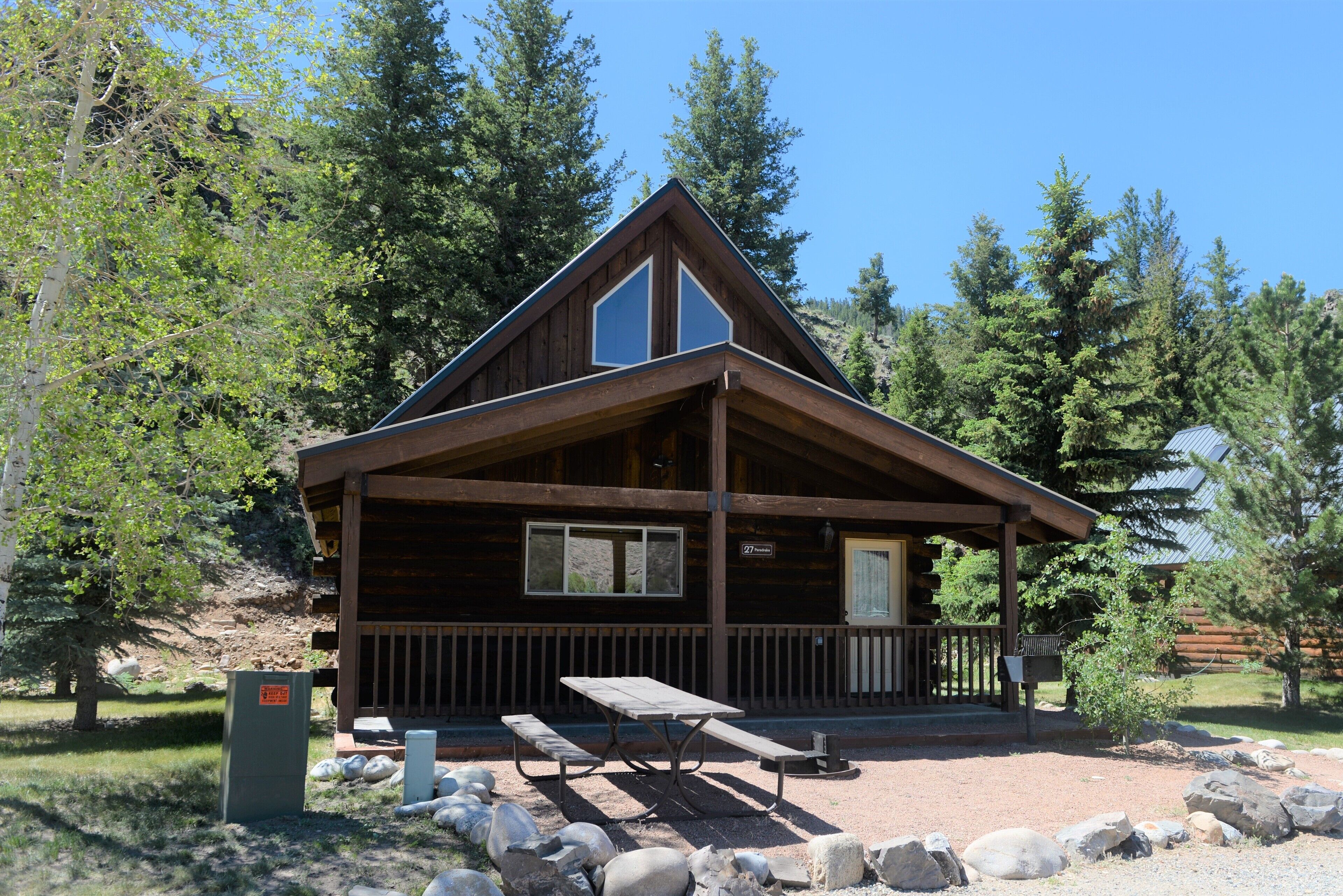 Roomy Taylor Canyon Cabin With Private Fishing Access “Paradrake” (Every cabin is named after a fly pattern.) **We regret to inform you that shared hot tubs will be closed down permanently. Private hot tubs remain open.**Cabins 27, 28 and 29 are the same type of cabin. Considered “premium” lodging, they are some of our most popular cabins for larger families or groups. These cabins feel more like a home than a mountain cabin. There are two private bedrooms downstairs and upstairs is an open, full size loft (an adult can stand fully) with additional beds and space for belongings. If you like a cabin to feel more like home than camp, this cabin is for you. • Approximately 1152 square feet• Queen size bed in each bedroom and 2 additional queen size beds in the loft• Sink/Vanity in each bedroom• Supplies included: paper towels, toilet paper, facial tissues, trash bags, dish soap, shampoo, conditioner, body wash, hairdryer• Not included: Anything edible (including coffee, condiments, spices), laundry detergent• Plenty of parking here for 2 vehicles and toy trailers• All Three Rivers Resort guests have access to private fishing on the Taylor River bordering the resort property.**For VRBO guests, please refer to your reservation confirmation sent to your email after booking for check-in and unit details. We operate like a hotel with a front desk.** All units are designated as non-smoking (including marijuana). Dogs allowed for an additional nightly fee, maximum of 2 dogs. No cats or other animals. Dogs may not be left alone in cabins at any time. Nightly rate is based on 8 people. Maximum occupancy is 8. Rates are typically higher during the peak season from May – September/early October and during holiday periods. Rates are adjusted based on occupancy and can change at any time. For exact rates, enter your trip dates in the availability search.**If online search results produce a limited listing of available units for your dates, please call us as availability can change quickly. For one night only or arrival within the next 2 days, you must contact the office directly.**