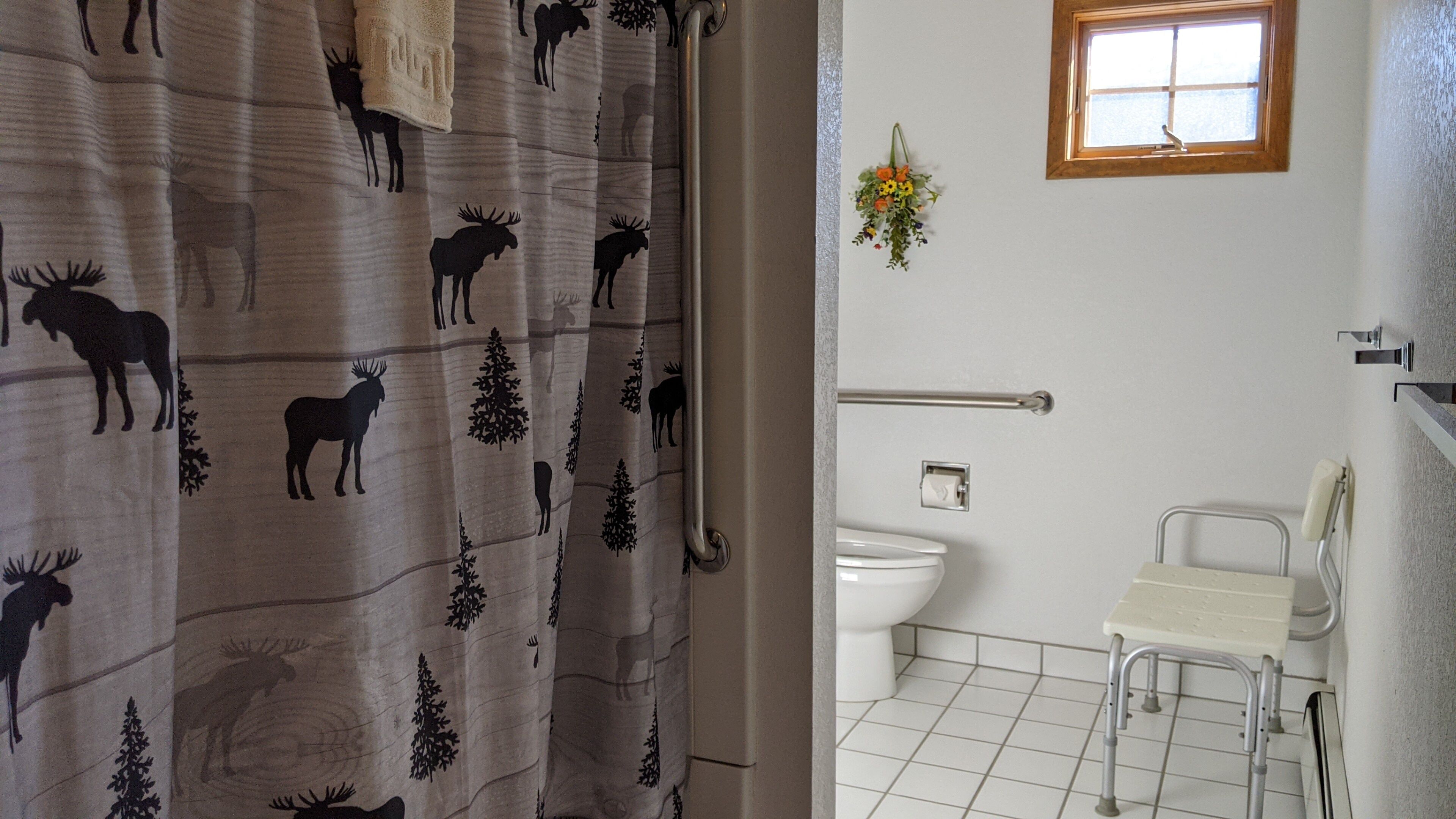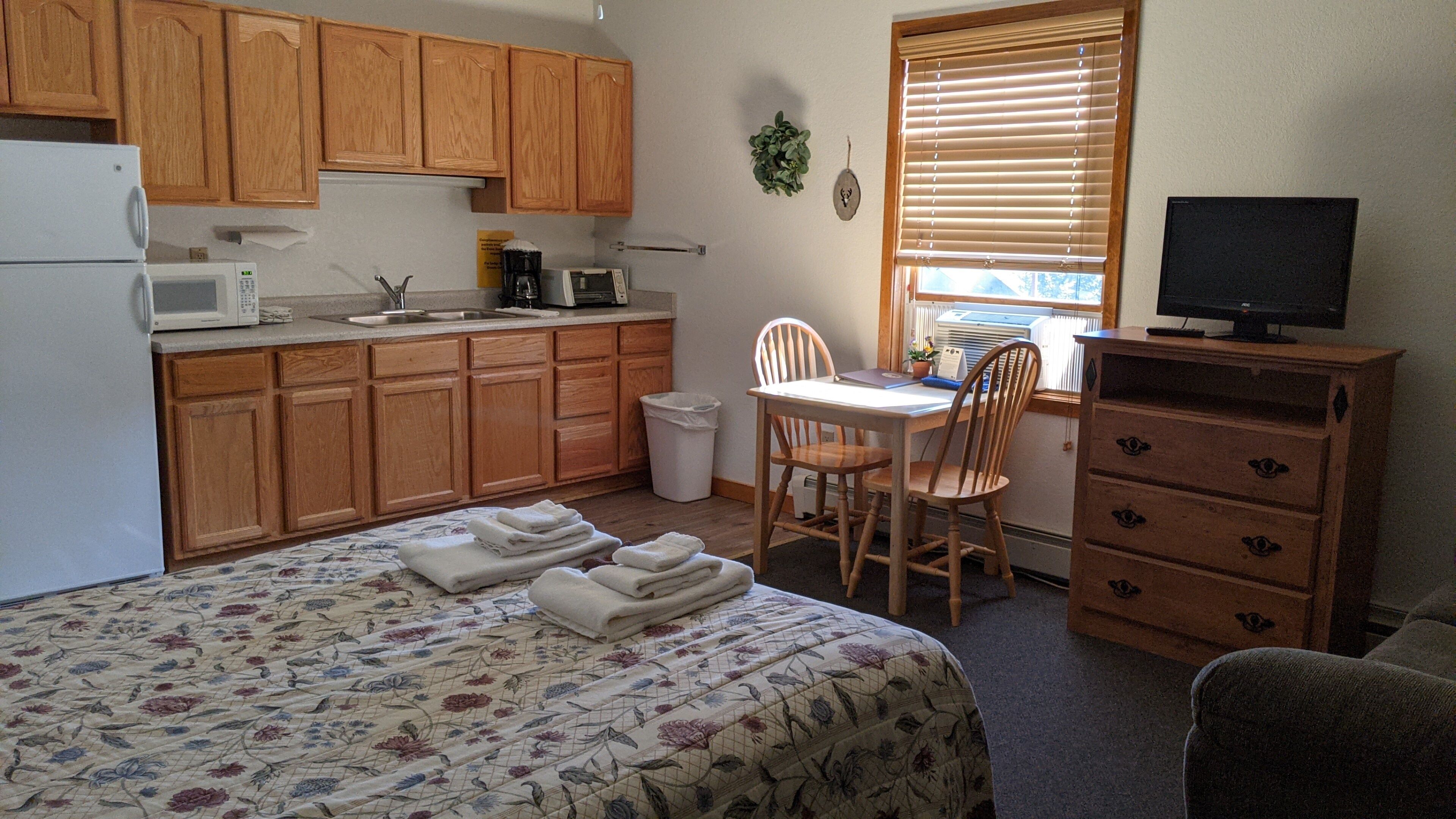 Hotel Style Lodge Room w/Kitchenette **This is the only "handicap accessible" room. It offers more space to move around as well as a shower and bathroom to accommodate wheelchairs.** If you do not require handicap accessibility, please consider booking a different unit with us. Our lodge rooms offer hotel-style accommodations plus a kitchenette (no stove/oven) in every unit. These are the only units at the resort that offer air conditioning in the summer. They are located above the main store/office and are accessible from an interior stairwell or an exterior ramp. Like all of our lodging, we do not offer daily housekeeping. We supply basics like linens, soap and kitchenware. Guests supply toiletries and any food. Pets are not allowed in these rooms. The rooms are best suited for 2 people since there is only one bed. • Queen size bed plus a sofa (not a hide-a-bed). If an extra bed is needed, please bring an air mattress or sleeping bag.• Bathroom has a tub/shower• Supplies included: paper towels, toilet paper, facial tissues, bar soap, hairdryer, trash bags, dish soap • Not included: Anything edible (coffee and filters available though), laundry detergent, shampoo and toiletries• Parking in the main resort parking lot for one vehicle. Inquire about additional parking if needed.All units are designated as non-smoking (including marijuana). Dogs are not allowed in these rooms. Nightly rate is based on 2 people. Maximum occupancy is 4 (but no more than 2 is recommended). Extra person fees may apply if more than 2 people. Rates are typically higher during the peak season from May – September/early October and during holiday periods. Rates are adjusted based on occupancy and can change at any time. For exact rates, enter your trip dates in the availability search.**If online search results produce a limited listing of available units for your dates, please call us as availability can change quickly. For arrival within the next 2 days, you must contact the office directly.**