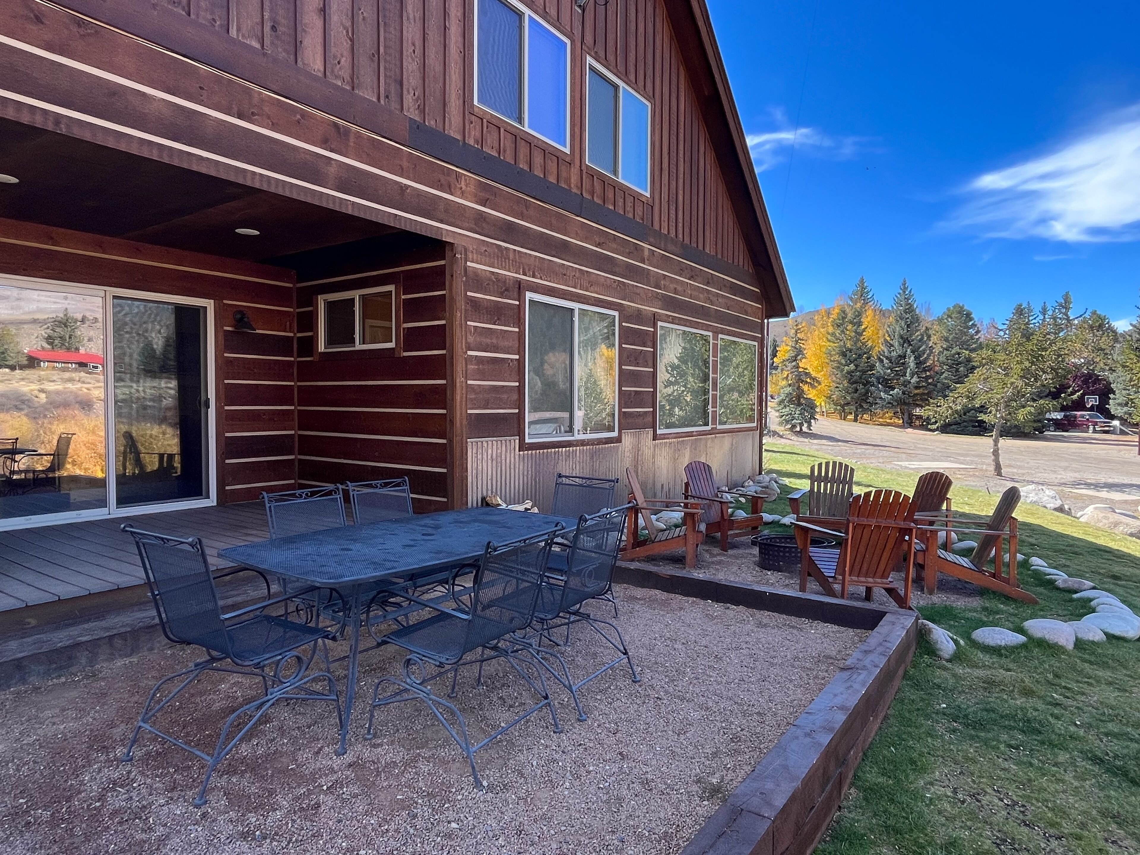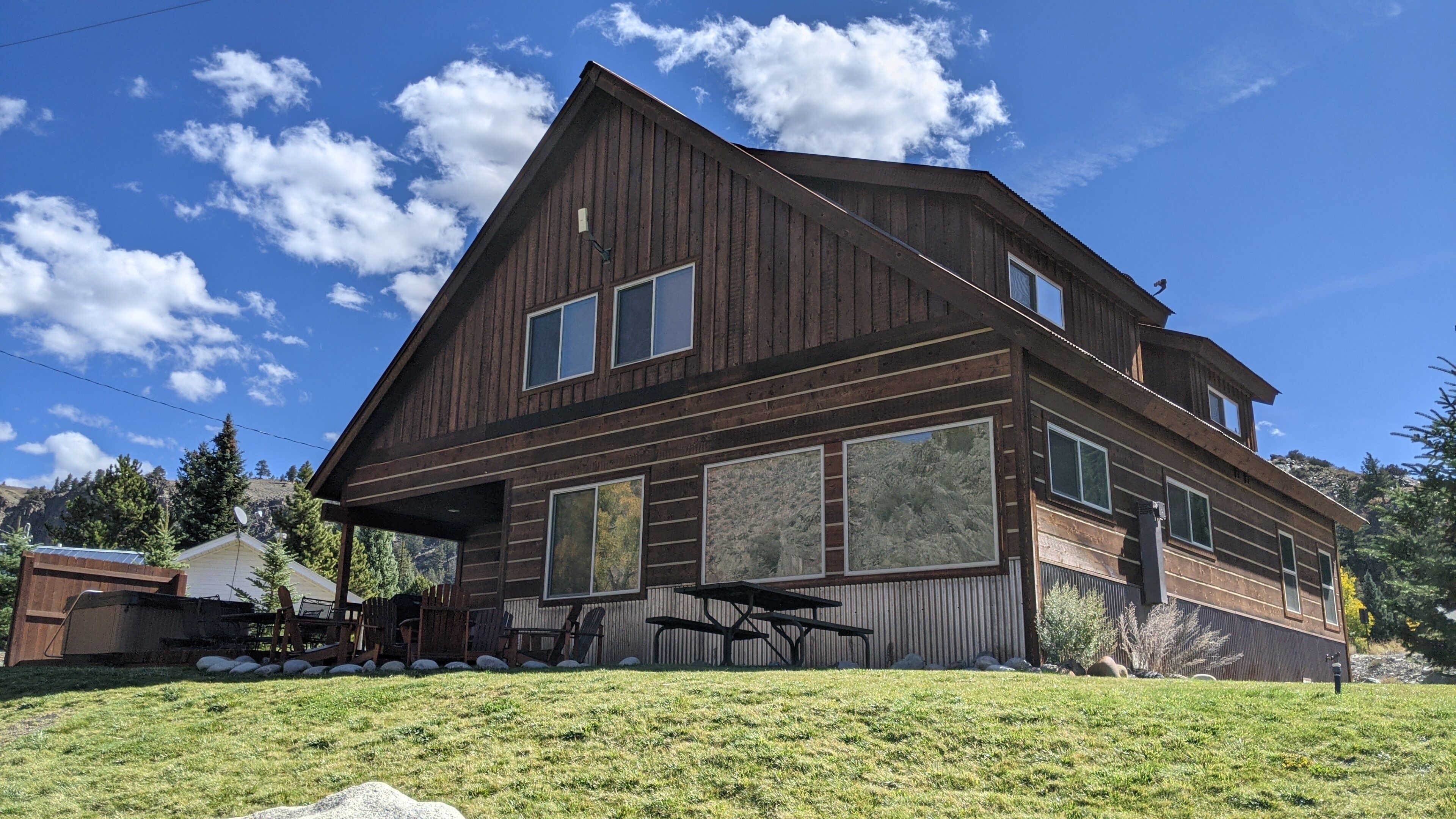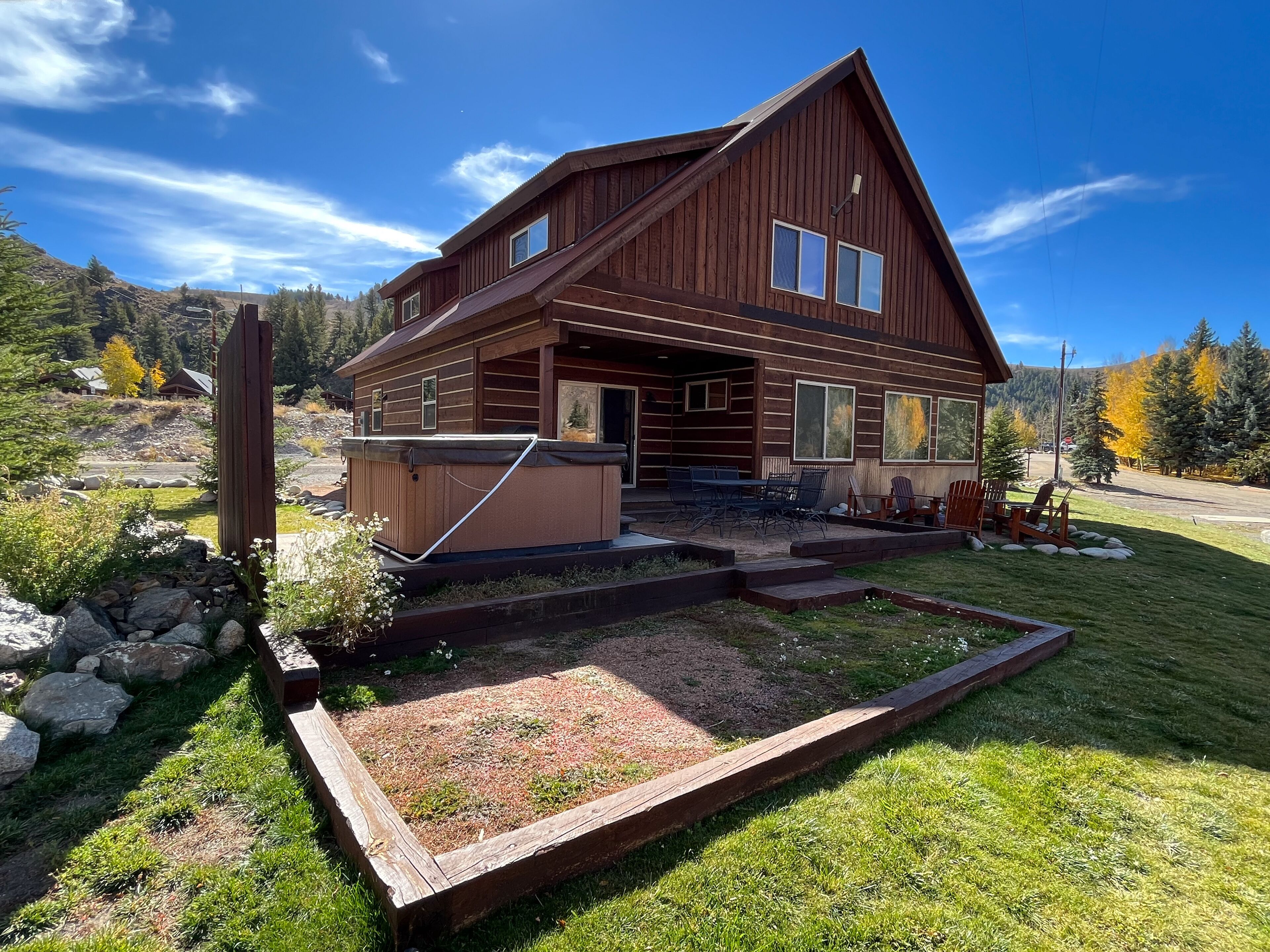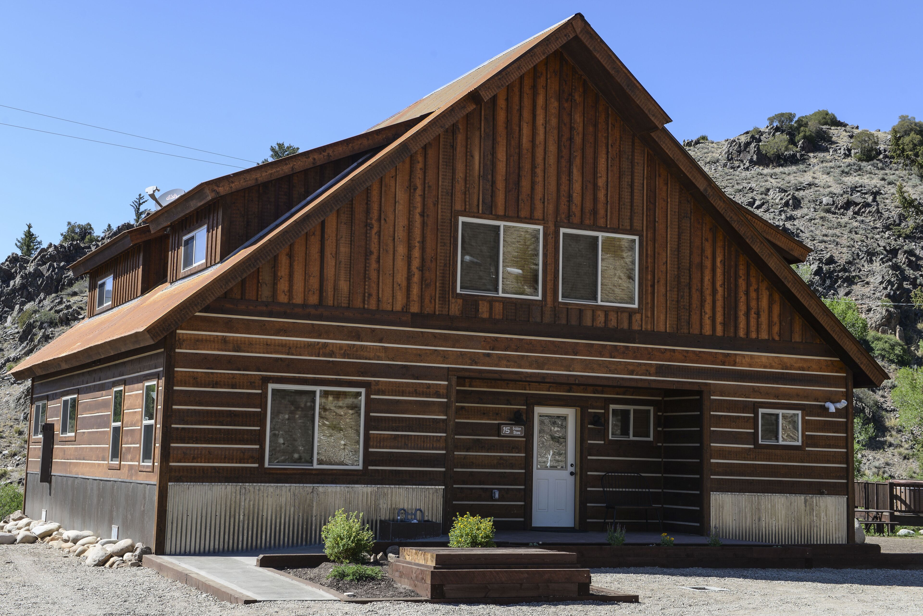 Fabulous 5 BR Vacation Home on the Taylor River “Golden Stone” (Every cabin is named after a fly pattern.) This new, gorgeous, riverfront home is ideal for large groups and families or multiple families to share. The first floor has a master bedroom and full bath, laundry, large living room, half bath and kitchen. The master bedroom/bath will be handicap accessible. From the kitchen, a sliding door opens onto a deck overlooking the Taylor River. There is a natural gas grill and private hot tub outside. Upstairs, 4 additional bedrooms and 3 full bathrooms offer plenty of space for everyone. • Approximately 2000+ square feet• Ground floor Master Bedroom with king bed, full bathroom, shower, handicap accessible • Upstairs, two bedrooms each have a queen and twin bed with full bathroom, tub/shower• Upstairs, two bedrooms each have a king bed and share a bathroom with tub/shower• Supplies included: paper towels, toilet paper, facial tissues, trash bags, dish soap, shampoo, conditioner, body wash, hairdryer• Not included: Anything edible (including coffee, condiments, spices), laundry detergent• Plenty of parking here for 2+ vehicles and toy trailers• All Three Rivers Resort guests have access to private fishing on the Taylor River bordering the resort property.**For VRBO guests, please refer to your reservation confirmation sent to your email after booking for check-in and unit details. We operate like a hotel with a front desk.** All units are designated as non-smoking (including marijuana). Dogs allowed for an additional nightly fee, maximum of 2 dogs. No cats or other animals. Dogs may not be left alone in cabins at any time. Nightly rate is based on 10 people. There is an additional fee of $10/person/night for extra persons (ages 7 and over). Maximum occupancy is 12. Rates are typically higher during the peak season from May – September/early October and during holiday periods. Rates are adjusted based on occupancy and can change at any time. For exact rates, enter your trip dates in the availability search.**If online search results produce a limited listing of available units for your dates, please call us as availability can change quickly. For stays less than 3 nights or arrival within the next 2 days, you must contact the office directly.**