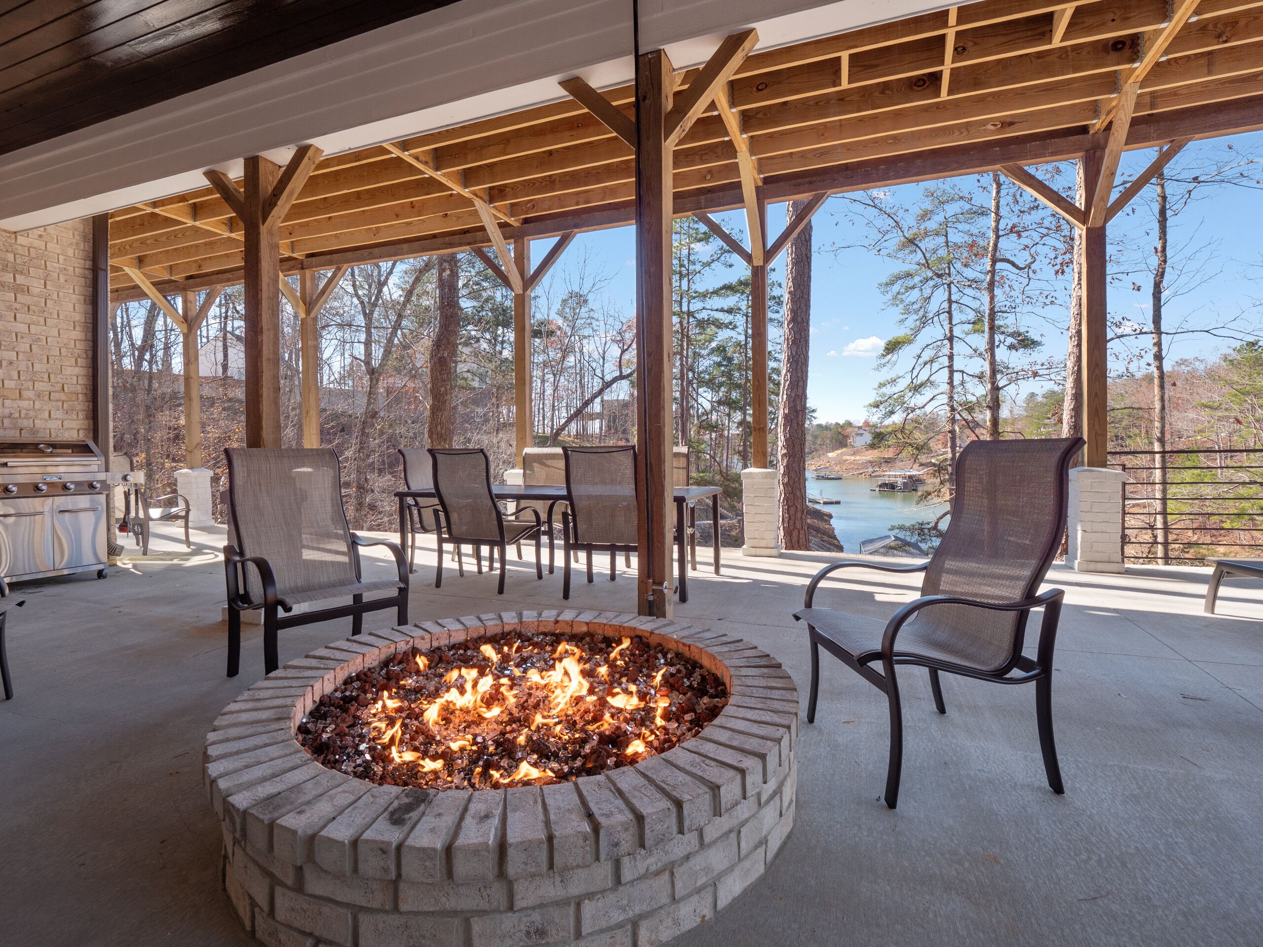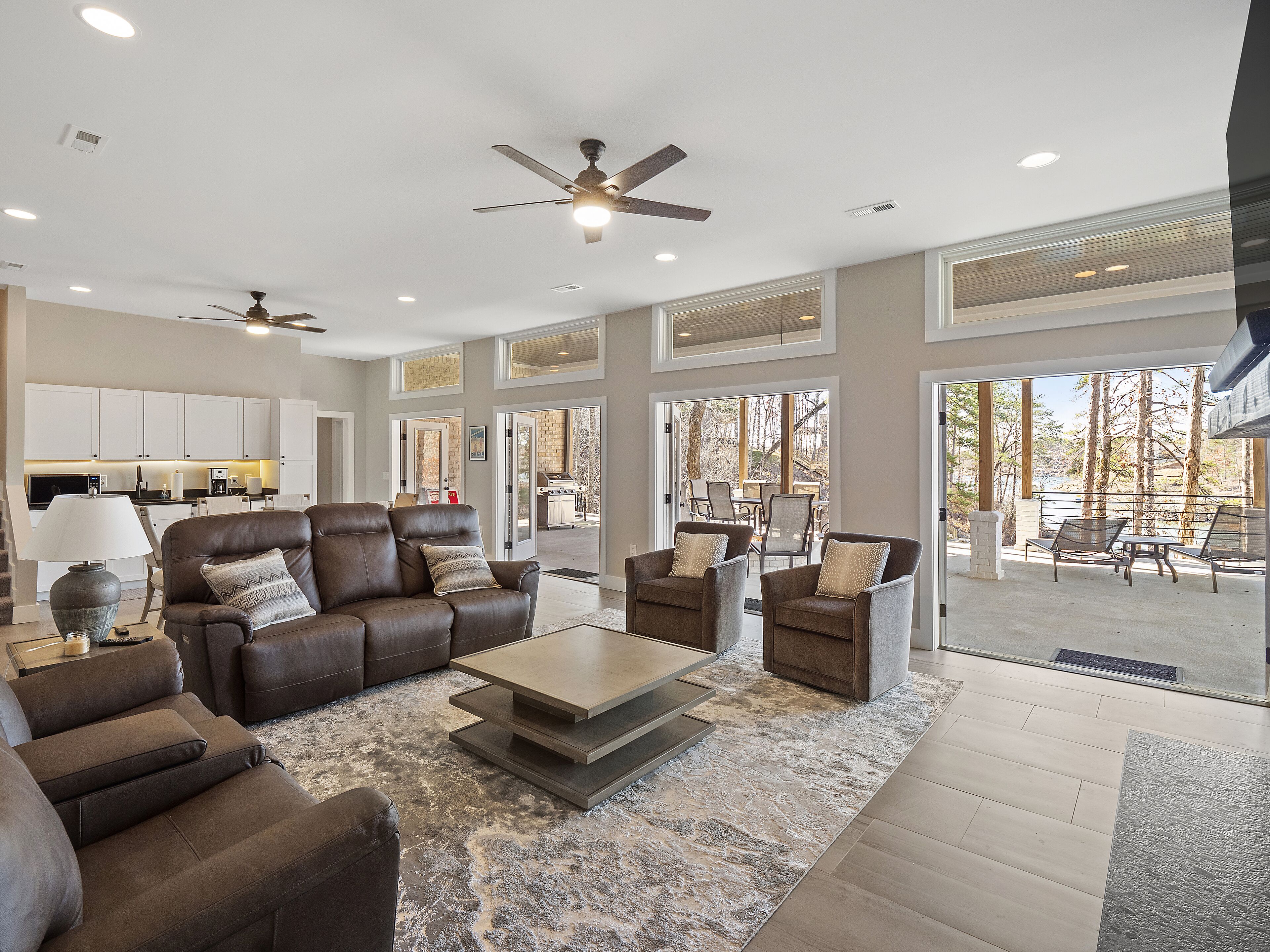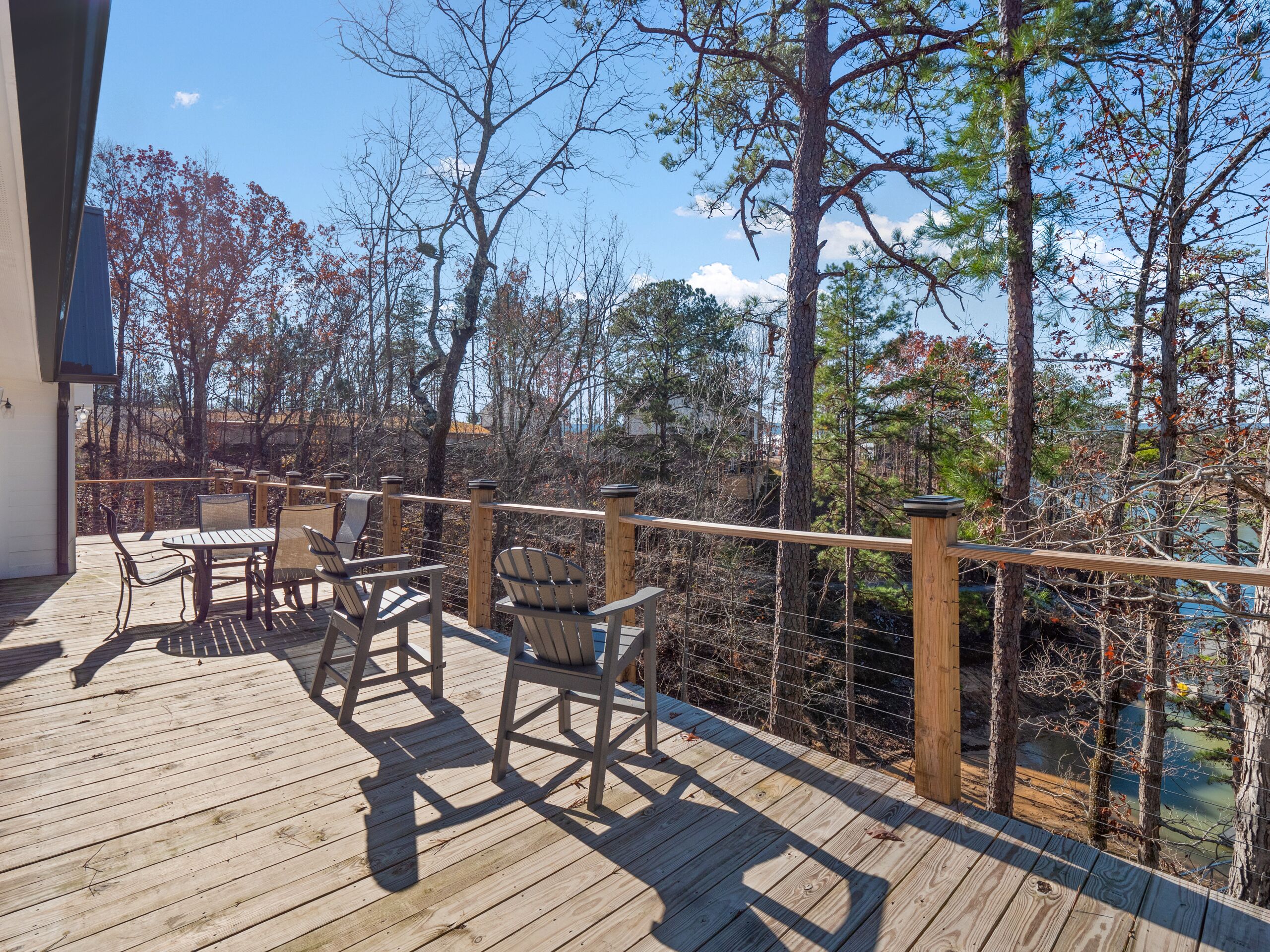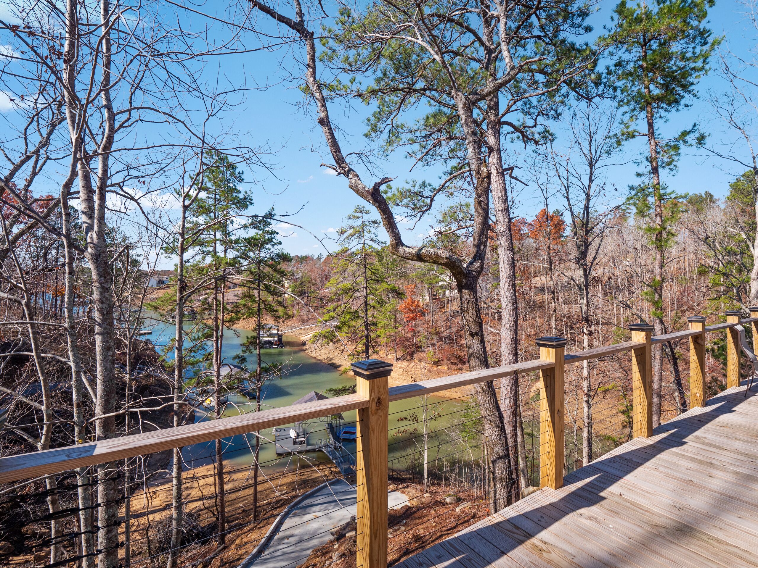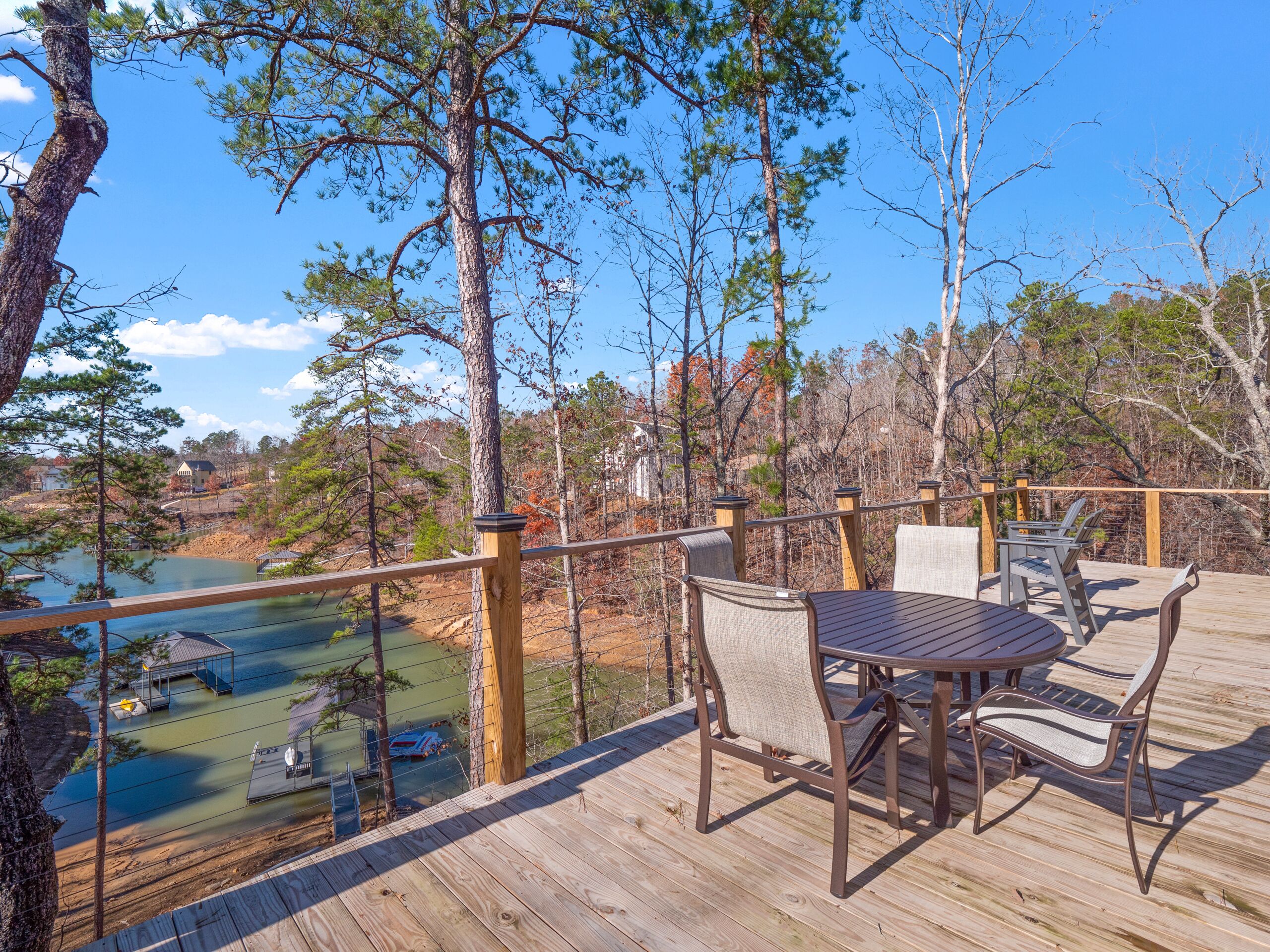 "Happy House"-Luxury, large firepit, 2 living areas "Happy House" - Luxury Home Built in 2022. No cost was spared in this custom built home which is setup for multiple families. House has 4 bedrooms / 4 bathrooms. Master BR on each floor, bunkroom in the basement, all bedrooms have Televisions. Two separate living areas, on main floor and downstairs, as well a Loft area for more relaxing and spending time with each other.Chef's Kitchen! Fully stocked with all of the EXTRAS! Hot air Popcorn maker, plenty of glassware, dishes (even children's unbreakable plate set), silverware, serving pieces - and anything you need for cooking and entertaining your friends and family. Dining area seats 8, with an additional 3 at the bar, and 3 at the island. There is a second smaller kitchen located downstairs, with a clear icemaker and a condensed size dishwasher in the lower level on the back bar.This home is powered by a Generac generator which powers the entire house in the event the electricity goes out. No danger of being without power!Peaceful, awesome views from multiple outdoor decks. Lower deck has lots of seating with a large gas firepit for those chilly evenings. Cornhole game. Upper deck has a brand new table and chairs as well as comfortable adirondack style seating for viewing the beauty of the lake. See pictures.You have an EASY WALK to the water down the concrete golf cart path.Nice private cove with Double Decker boat dock. Boat Slip available for guests' use. Great area for kayaking on the 2 kayaks. Also has a lilypad floatation mat for kids to enjoy!Convenient to Cullman or Jasper for restaurants and shopping. This property is great overflow from "The Barn" wedding venue which is 14 minutes away.Large Gas grill. Extra refrigerator located on lower patio, outside next to grill.Bedroom 1: Queen size bed with bath outside BR door - main levelBedroom 2: King size bed with private bath - main levelBedroom 3: King size bed with private bath - daylight basementBedroom 4: Two sets of bunk beds (sleeps 4) - daylight basementAdditional sleeping on the second floor loft: Pull-out couchWIFI Sprout Internet with streaming available on tv's, Hulu TV, Netflix and Amazon Prime.Security camera installed at the front door.PEAK SEASON: no Sat to Sat rentals. OFF-SEASON: 3 Night Minimum.Thanksgiving and Christmas - (3 nights required and Peak Season rates) Week of 4th of July is a 5 night minimum.PLEASE BE AWARE THAT THE PRIMARY RENTER MUST MEET THE AGE REQUIREMENT OF 25 YEARS OF AGE.NO after-prom, graduation, frat, wedding, etc parties. Any gathering larger than the Max occupancy has to be preapproved. Violation will result in eviction.