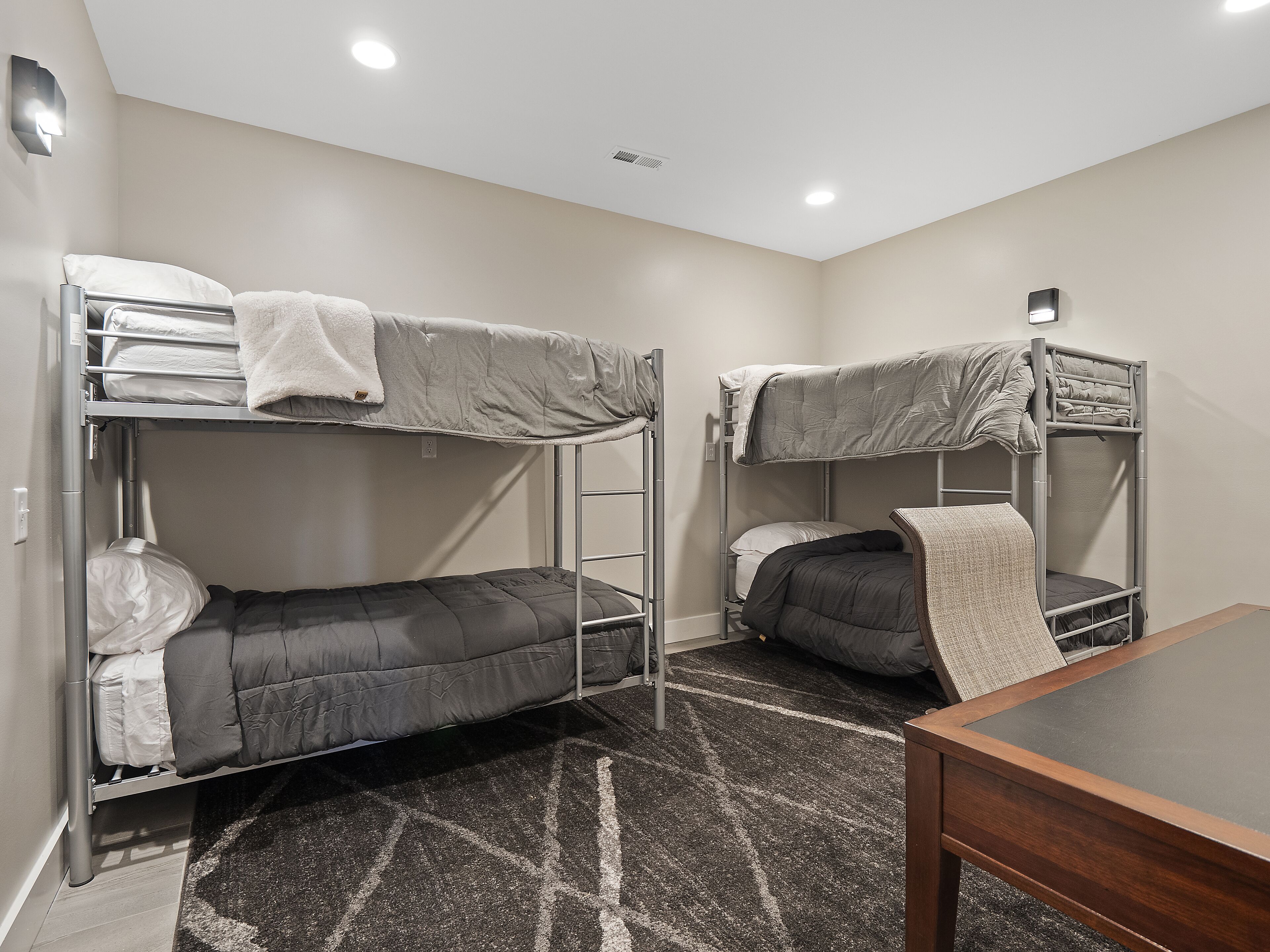 "Happy House"-Luxury, large firepit, 2 living areas "Happy House" - Luxury Home Built in 2022. No cost was spared in this custom built home which is setup for multiple families. House has 4 bedrooms / 4 bathrooms. Master BR on each floor, bunkroom in the basement, all bedrooms have Televisions. Two separate living areas, on main floor and downstairs, as well a Loft area for more relaxing and spe...