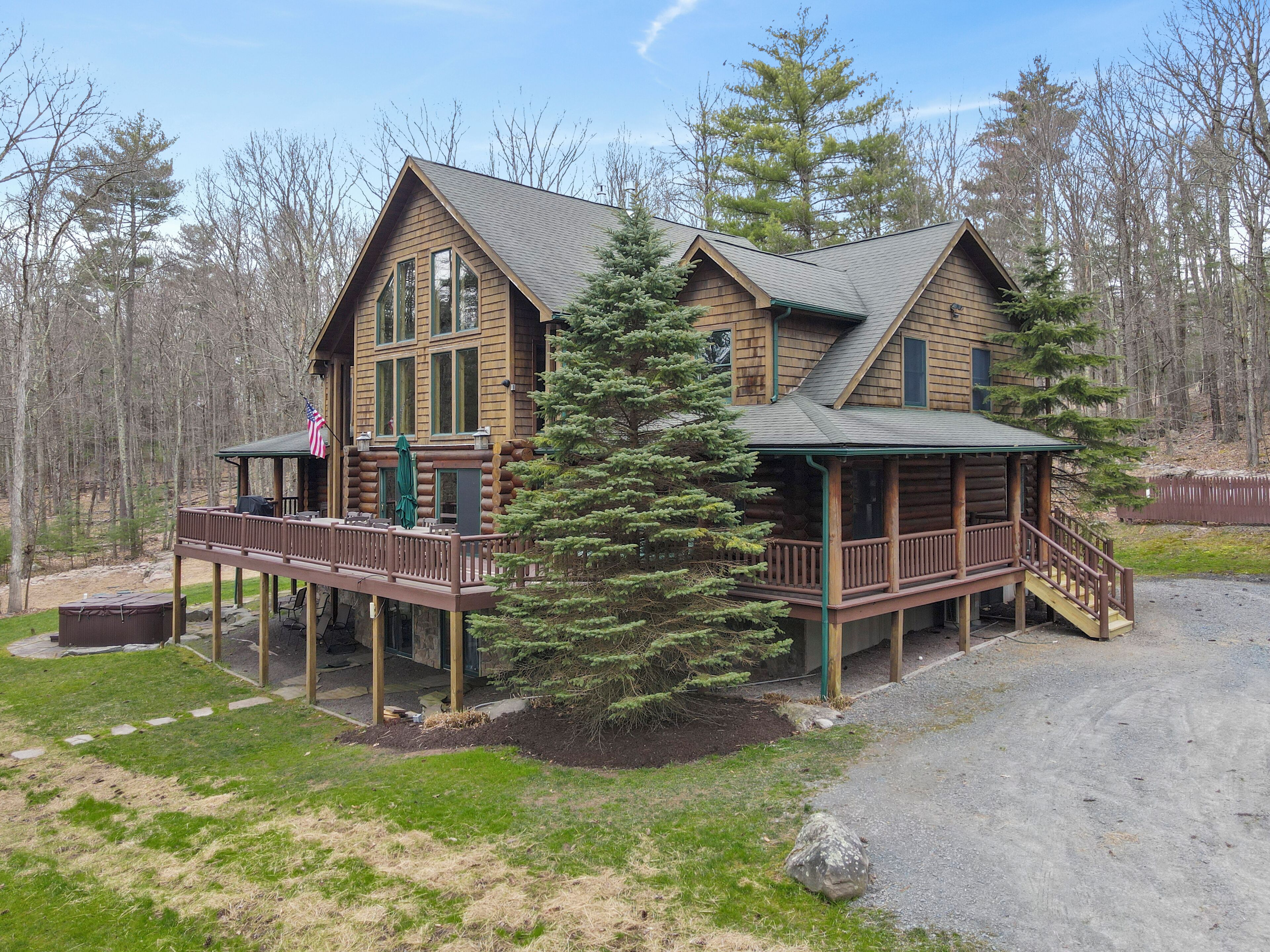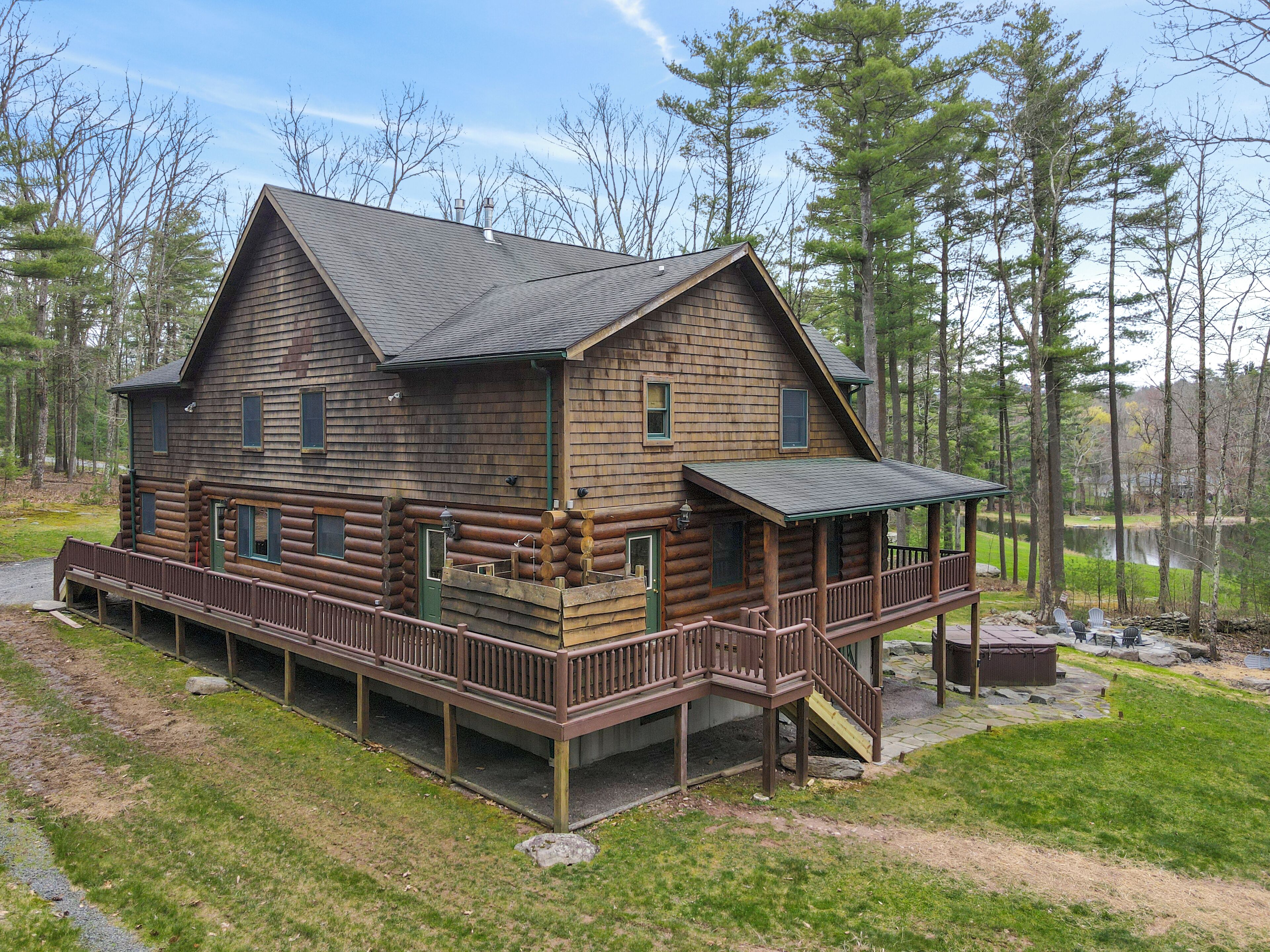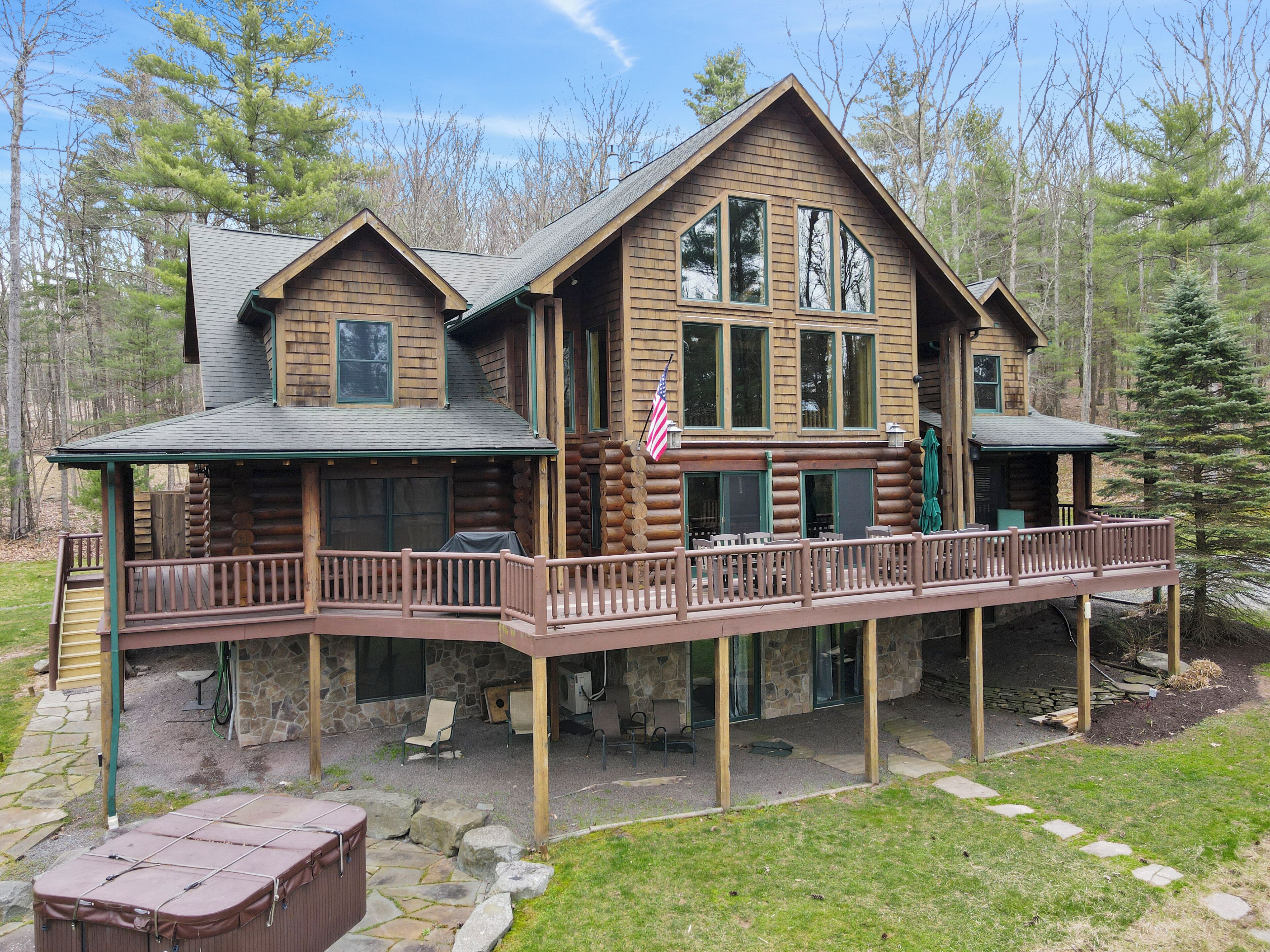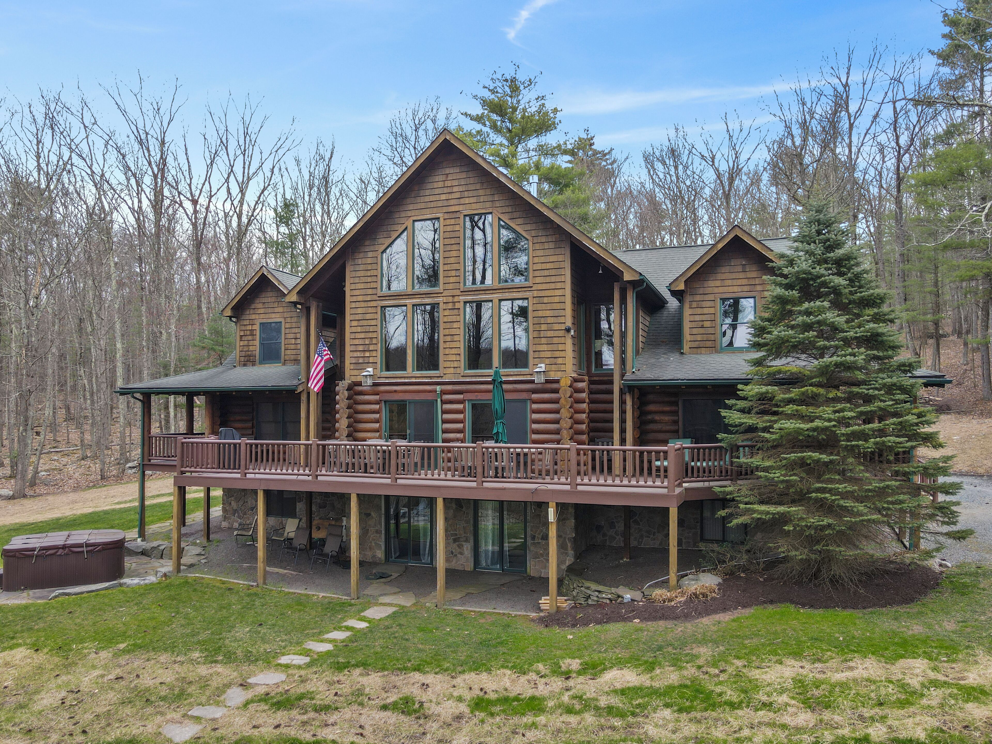 Luxury Lakefront Custom Log Home. Perfect for Ski Trips & Getaways! Swim off the dock or fish for bass and perch in the private 2 acre stocked lake, hike around the 17+ acres of privacy, enjoy camp fires out doors, play billards and video games in the family room, entertain at the wet bar, and take in the private mountain views from the livingroom from this beautiful custom log home. Home features a Master Suite on the first floor (king bed, overflow tub, massage shower), plus 5 additional bedrooms, 4 bathrooms, a massive 2 story stone fireplace. Gameroom, pool table, and large screen TVs provide for endless indoor entertainment, and the 17 acre playground makes this a top family vacation destination in the Lake Region/Lake Wallenpaupack! The property is just minutes from the free public boat launch on Lake Wallenpaupack. Put the boat in for the day and have fun on the 5,700 acre Lake Wallenpaupack, and still be home in time for dinner!