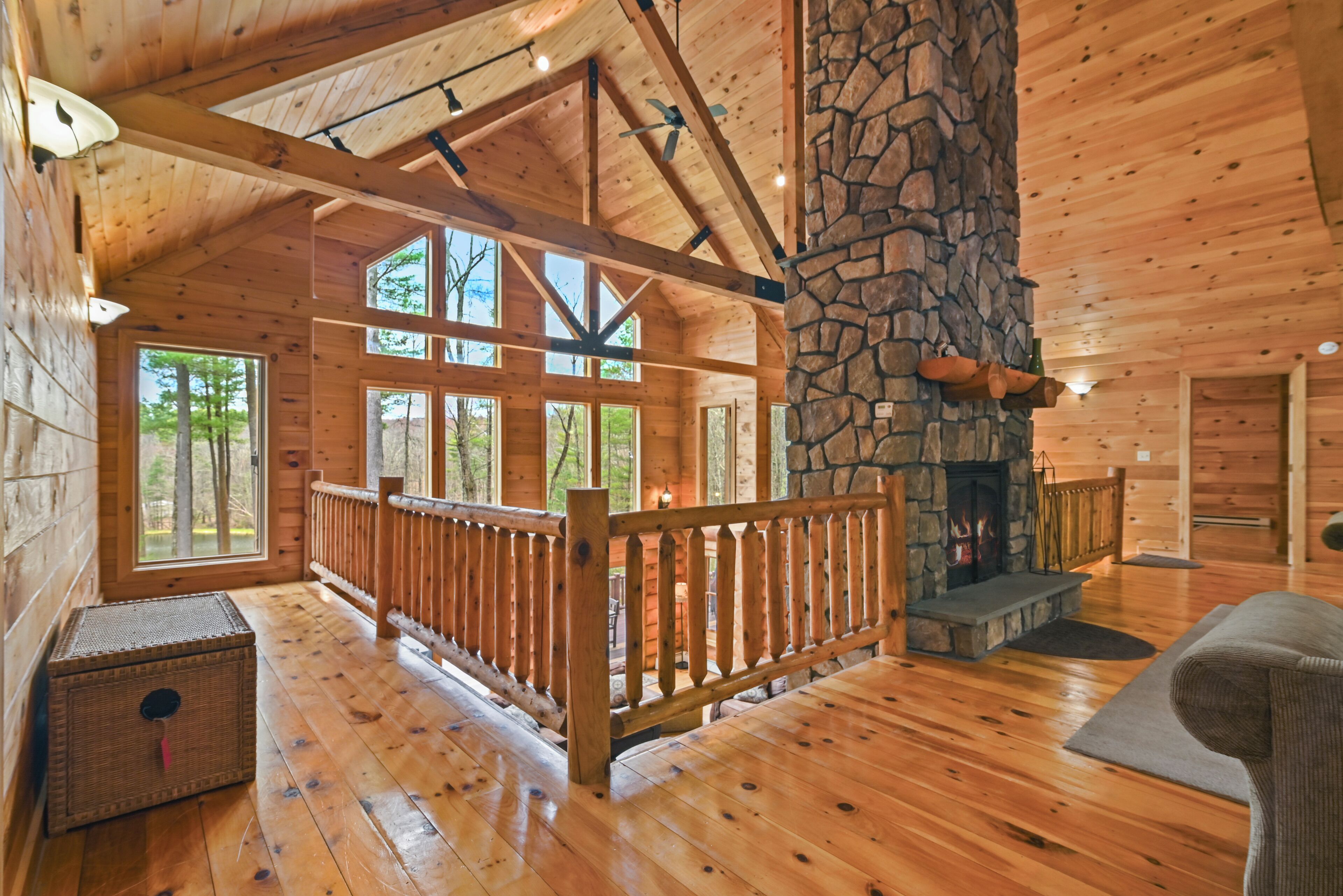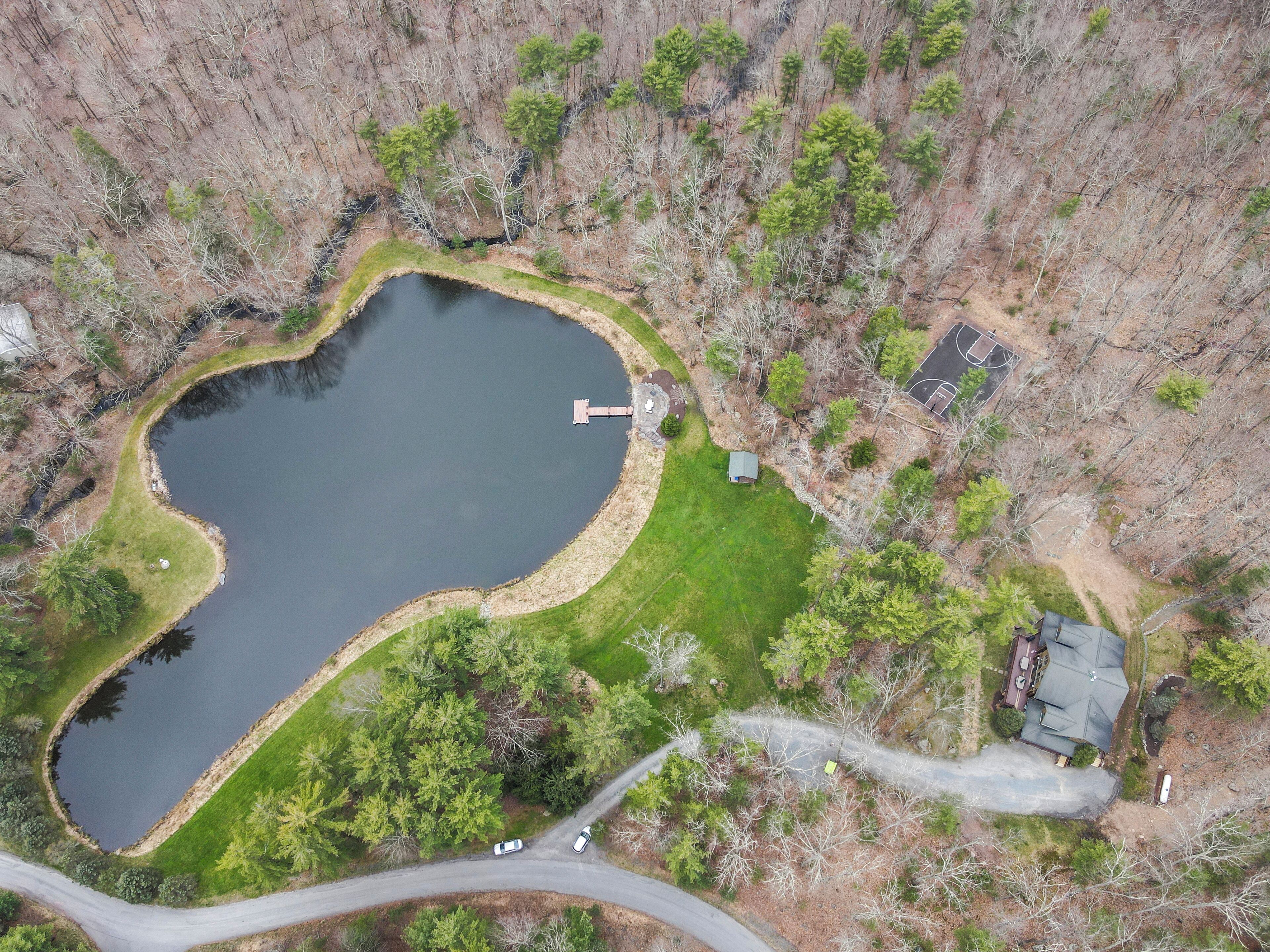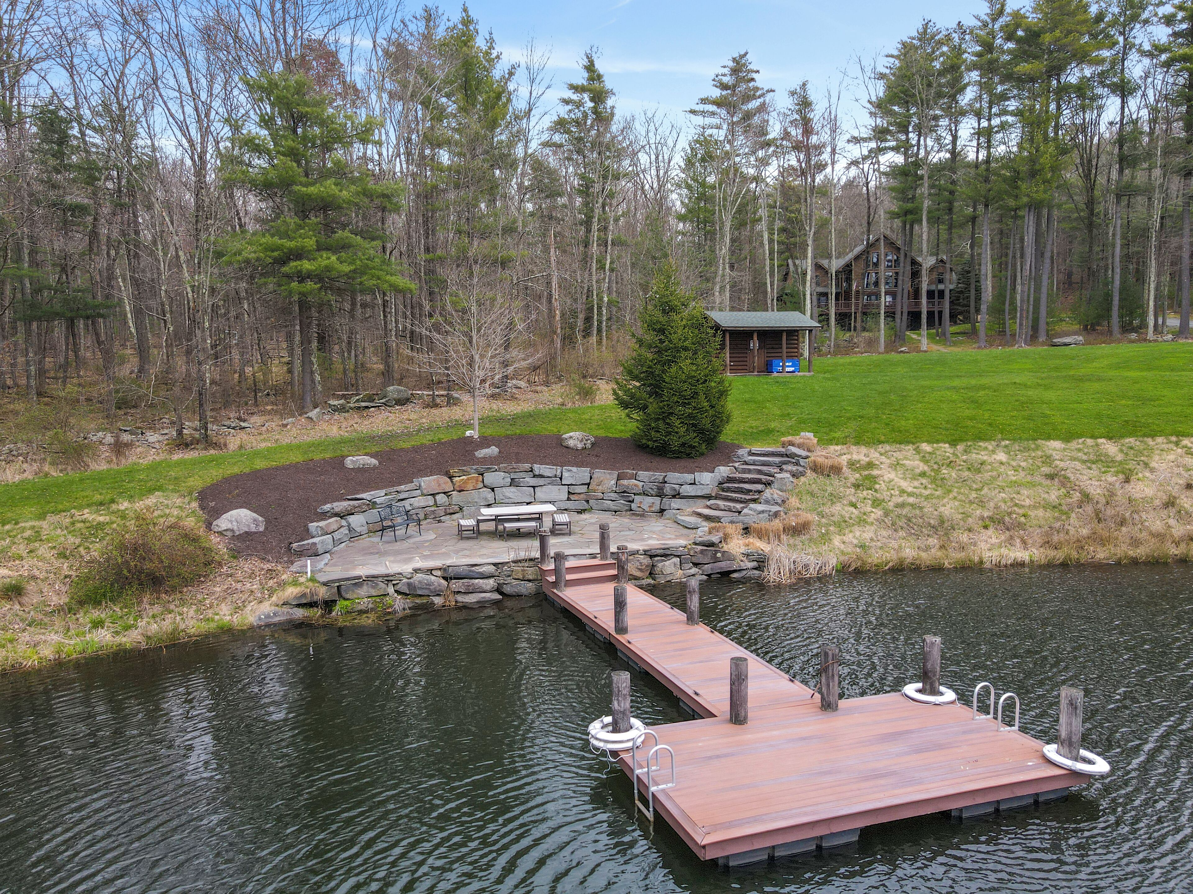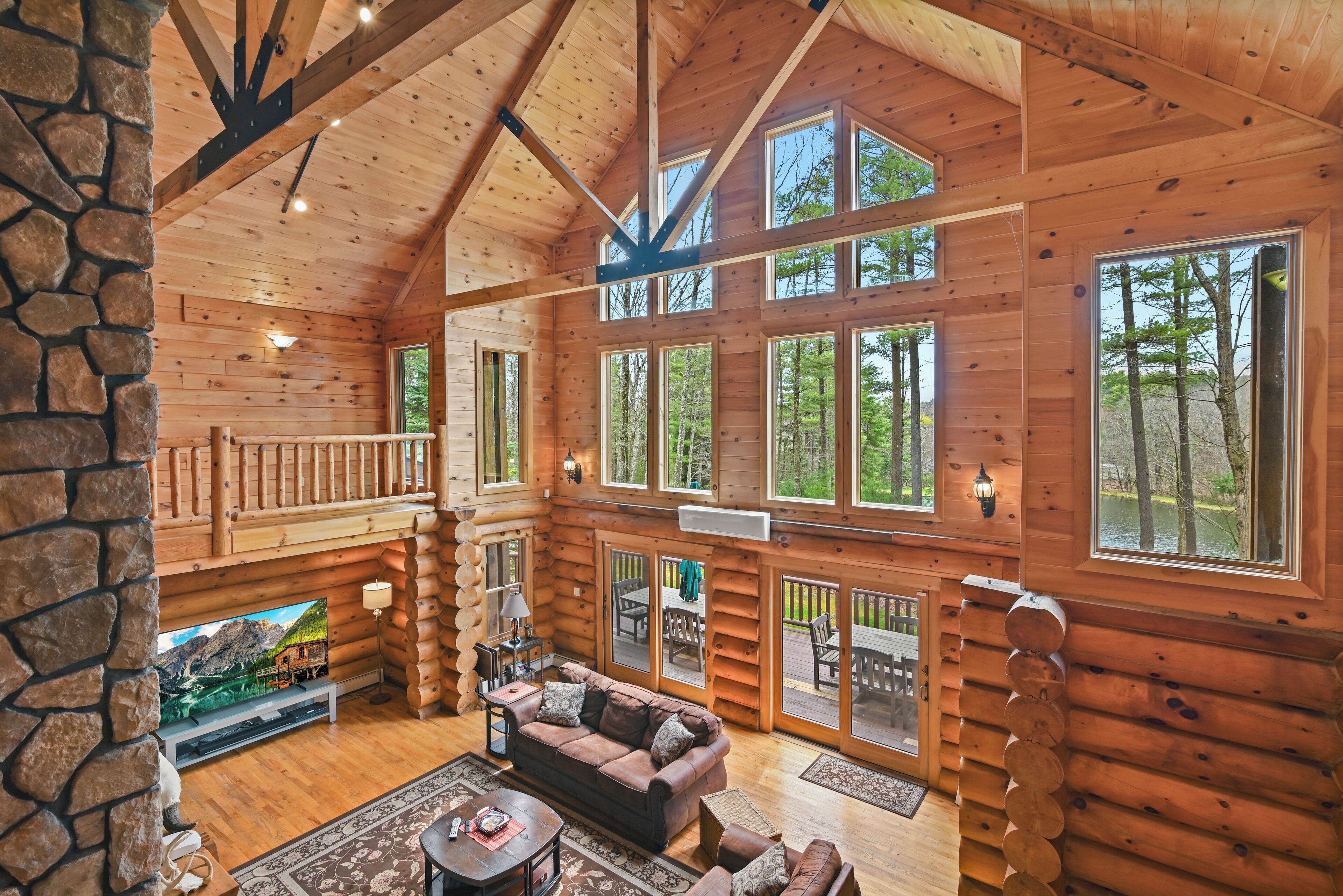 Luxury Lakefront Custom Log Home. Perfect for Ski Trips & Getaways! Swim off the dock or fish for bass and perch in the private 2 acre stocked lake, hike around the 17+ acres of privacy, enjoy camp fires out doors, play billards and video games in the family room, entertain at the wet bar, and take in the private mountain views from the livingroom from this beautiful custom log home. Home features a Master Suite on the first floor (king bed, overflow tub, massage shower), plus 5 additional bedrooms, 4 bathrooms, a massive 2 story stone fireplace. Gameroom, pool table, and large screen TVs provide for endless indoor entertainment, and the 17 acre playground makes this a top family vacation destination in the Lake Region/Lake Wallenpaupack! The property is just minutes from the free public boat launch on Lake Wallenpaupack. Put the boat in for the day and have fun on the 5,700 acre Lake Wallenpaupack, and still be home in time for dinner!