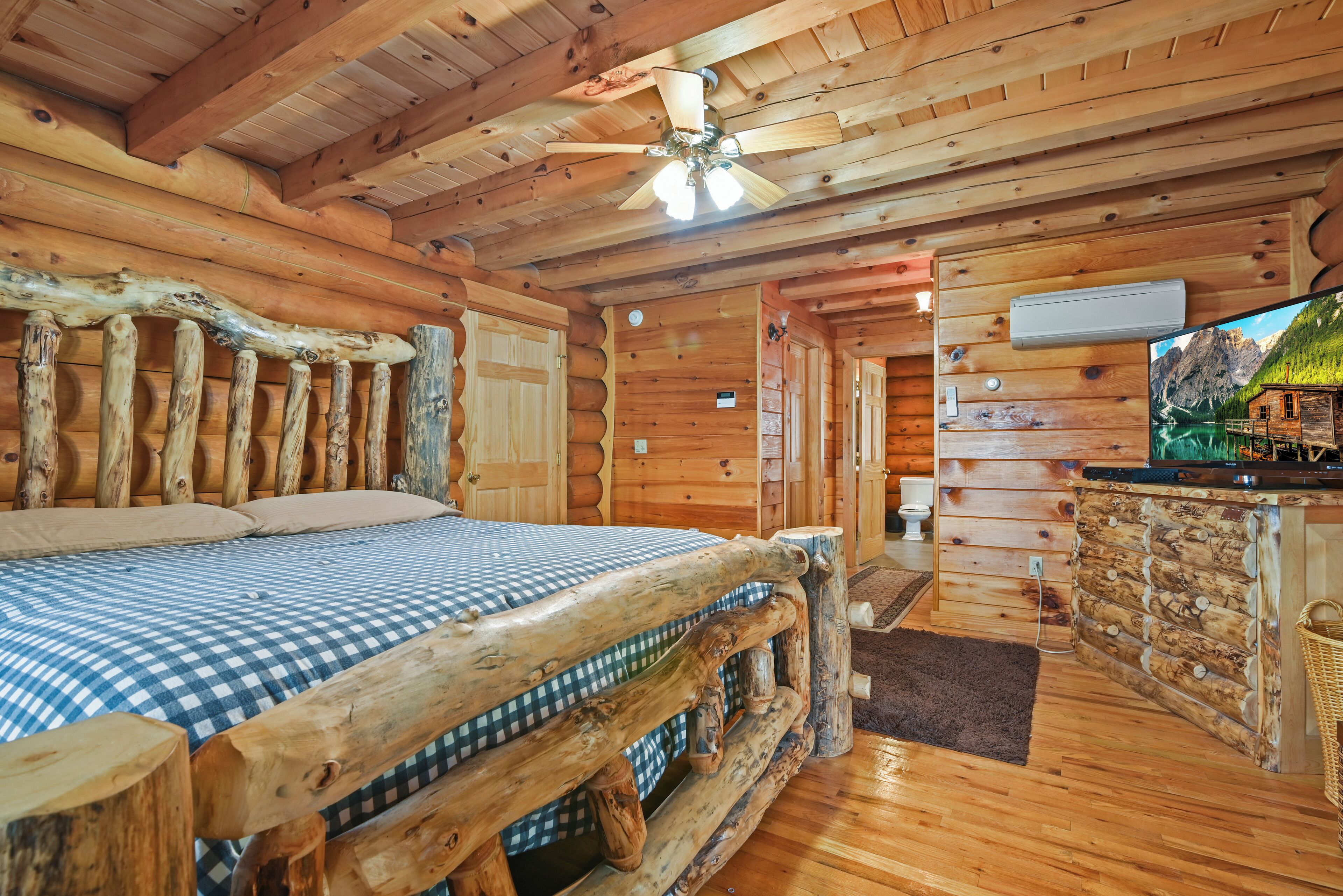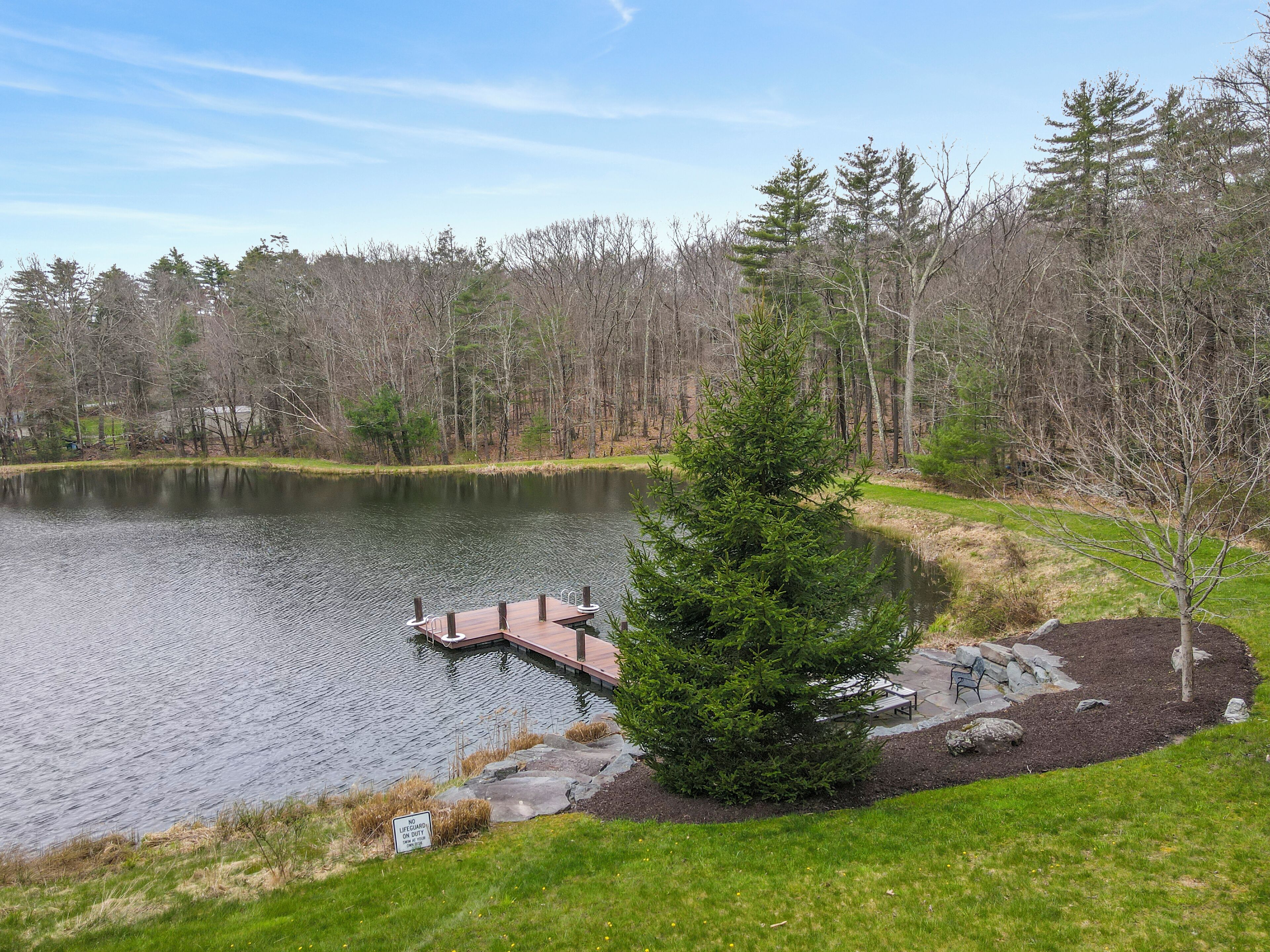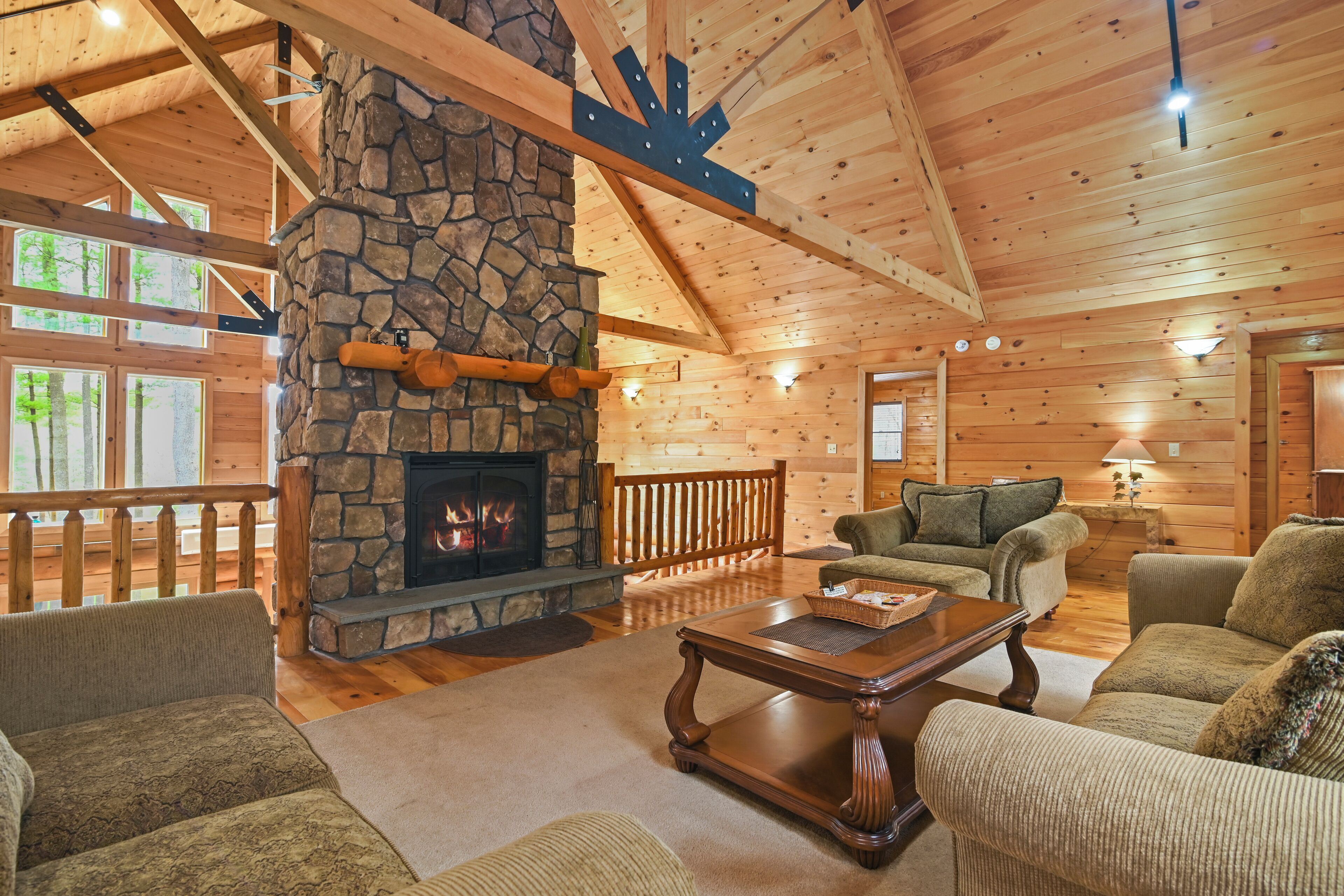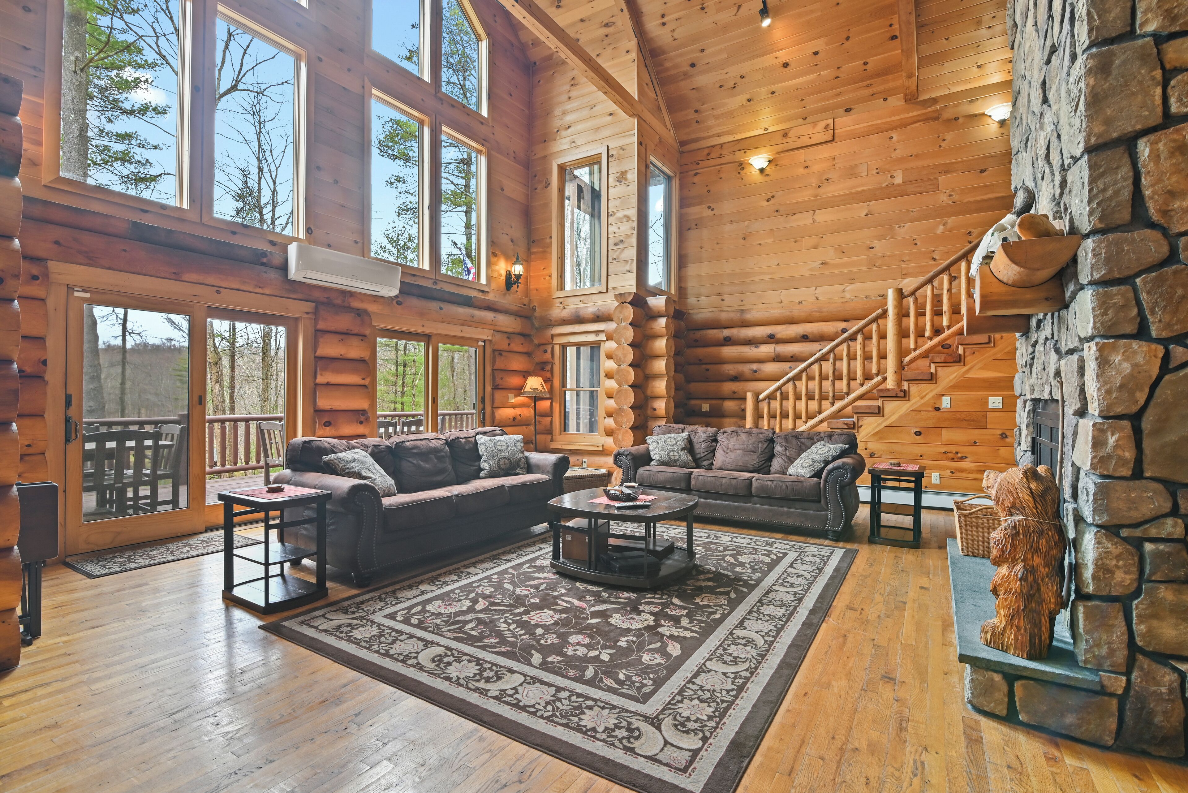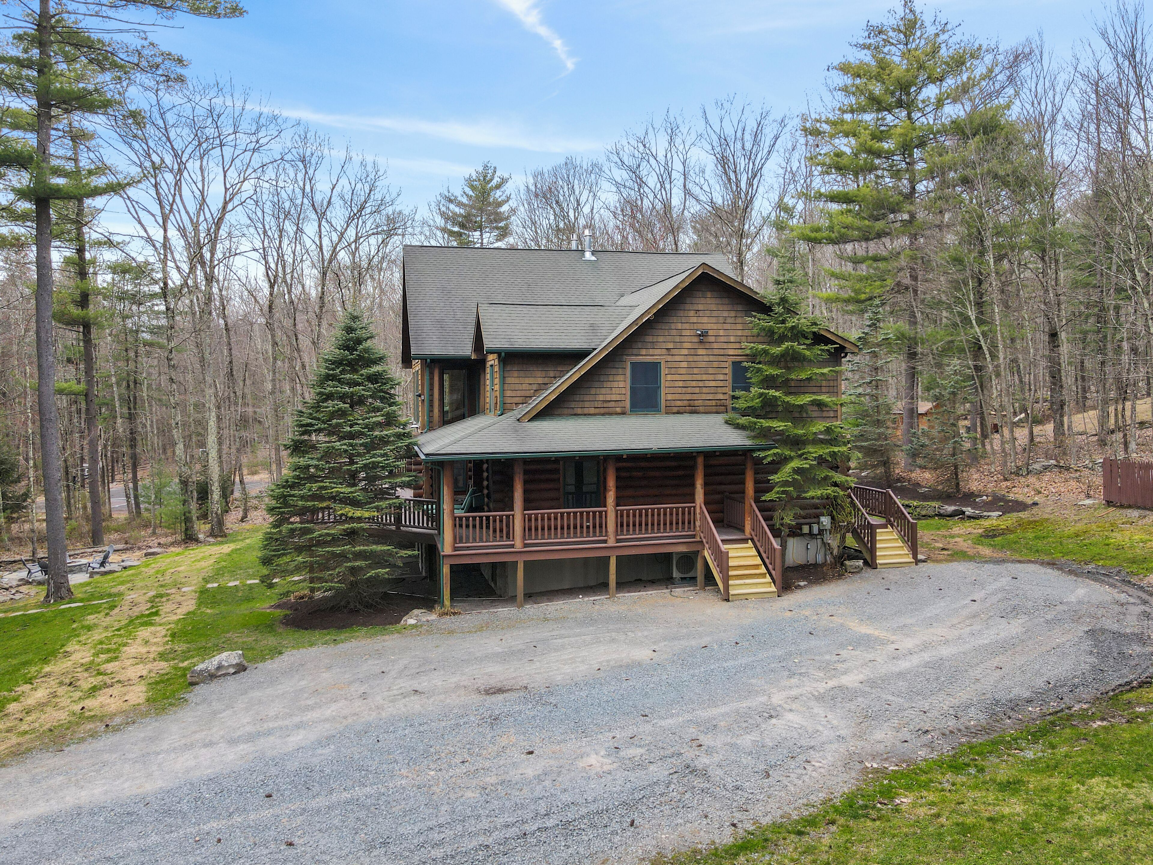Luxury Lakefront Custom Log Home. Perfect for Ski Trips & Getaways! Swim off the dock or fish for bass and perch in the private 2 acre stocked lake, hike around the 17+ acres of privacy, enjoy camp fires out doors, play billards and video games in the family room, entertain at the wet bar, and take in the private mountain views from the livingroom from this beautiful custom log home. Home features a Master Suite on the first floor (king bed, overflow tub, massage shower), plus 5 additional bedrooms, 4 bathrooms, a massive 2 story stone fireplace. Gameroom, pool table, and large screen TVs provide for endless indoor entertainment, and the 17 acre playground makes this a top family vacation destination in the Lake Region/Lake Wallenpaupack! The property is just minutes from the free public boat launch on Lake Wallenpaupack. Put the boat in for the day and have fun on the 5,700 acre Lake Wallenpaupack, and still be home in time for dinner!