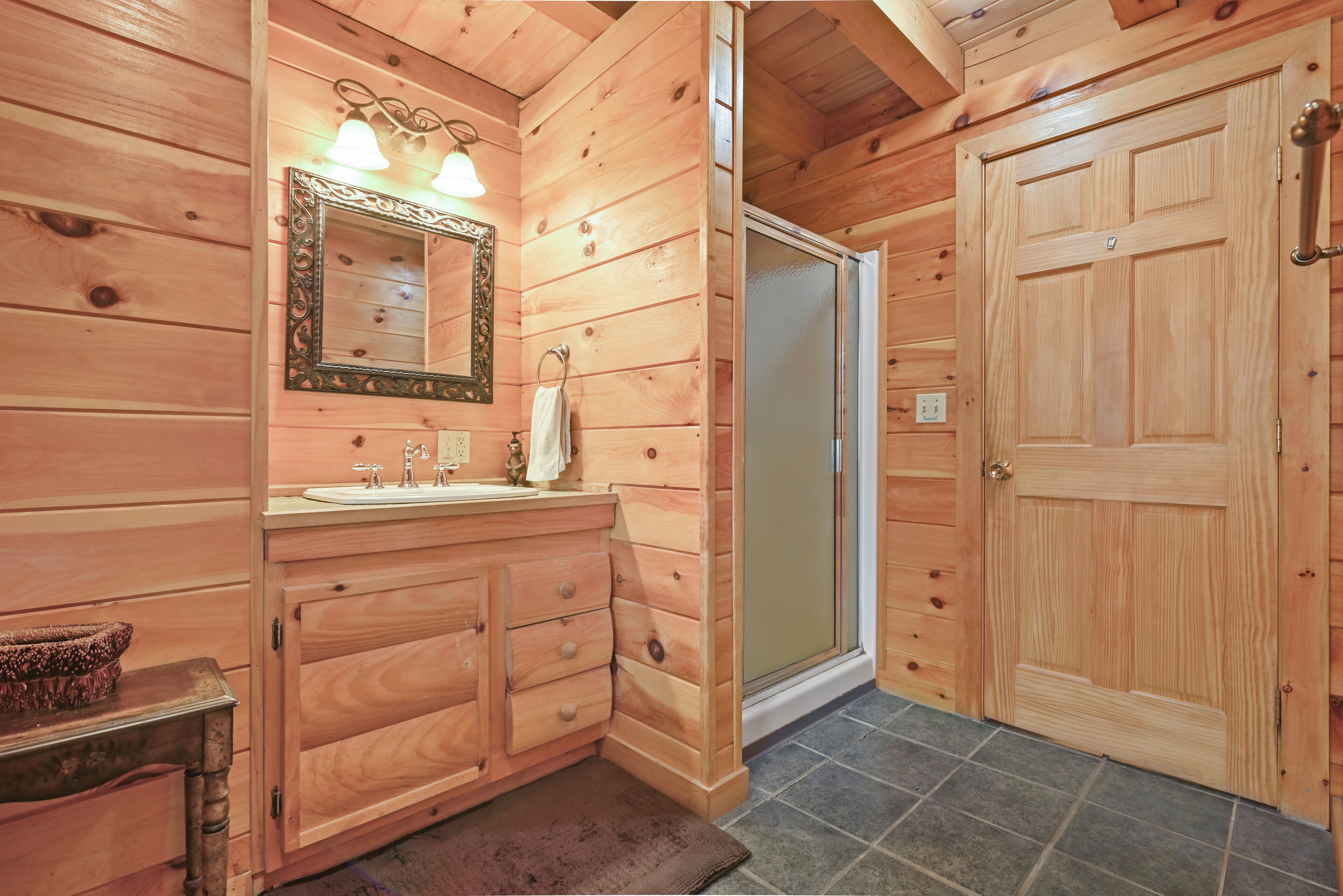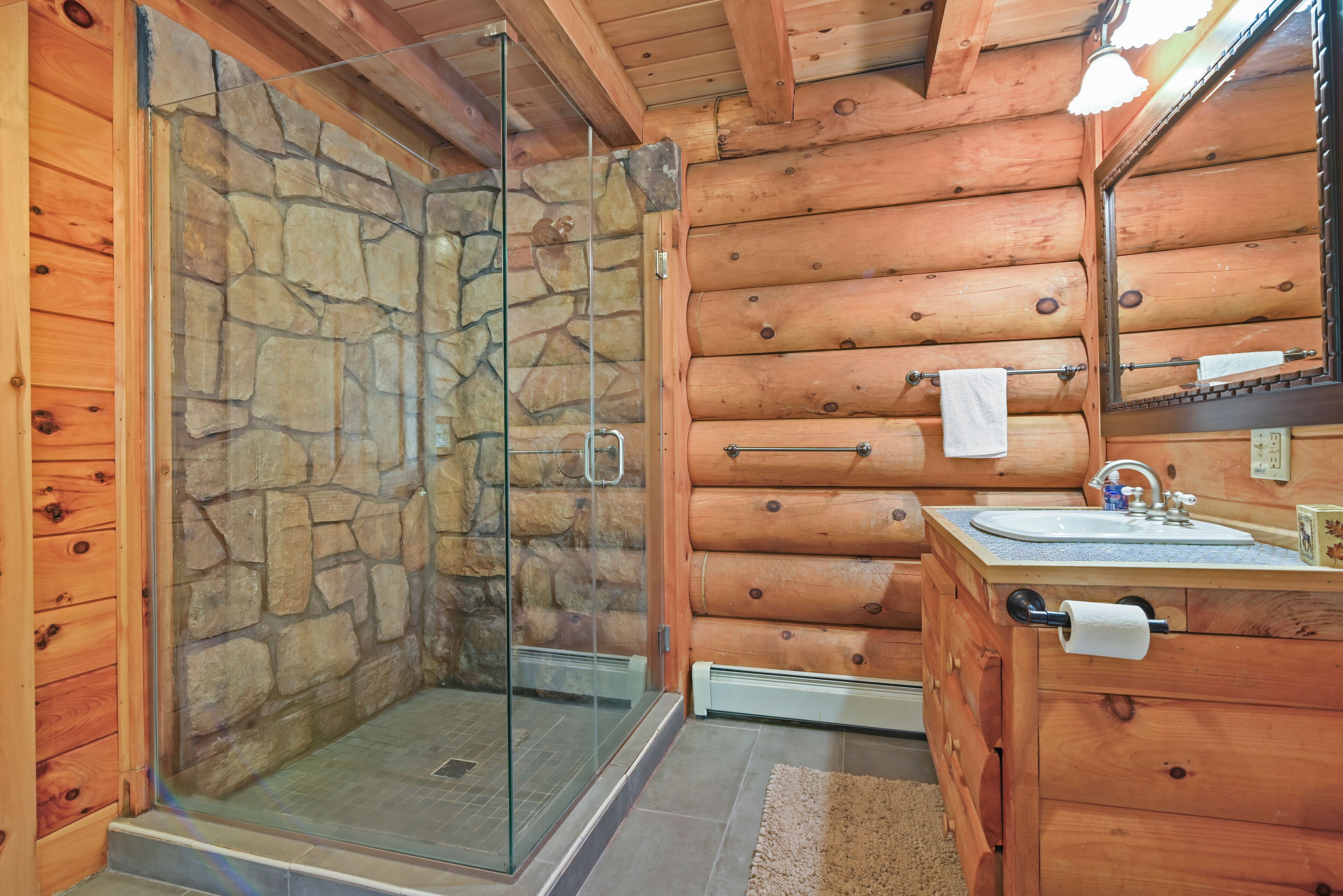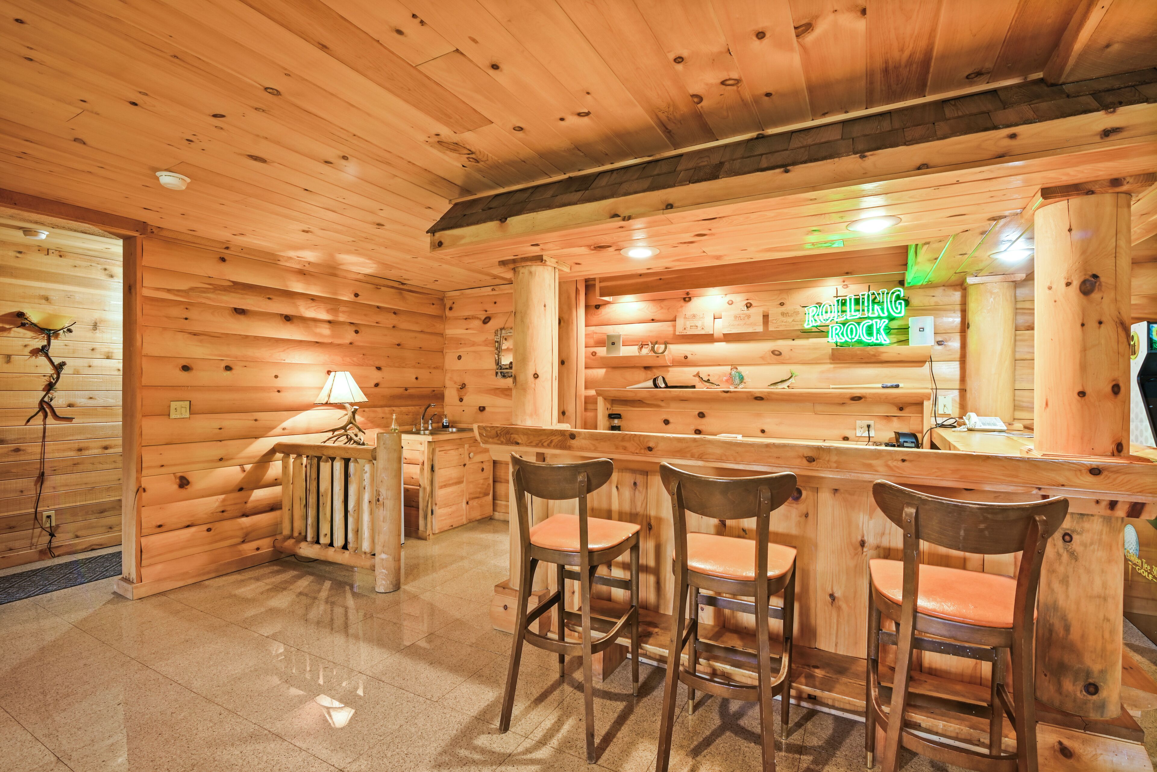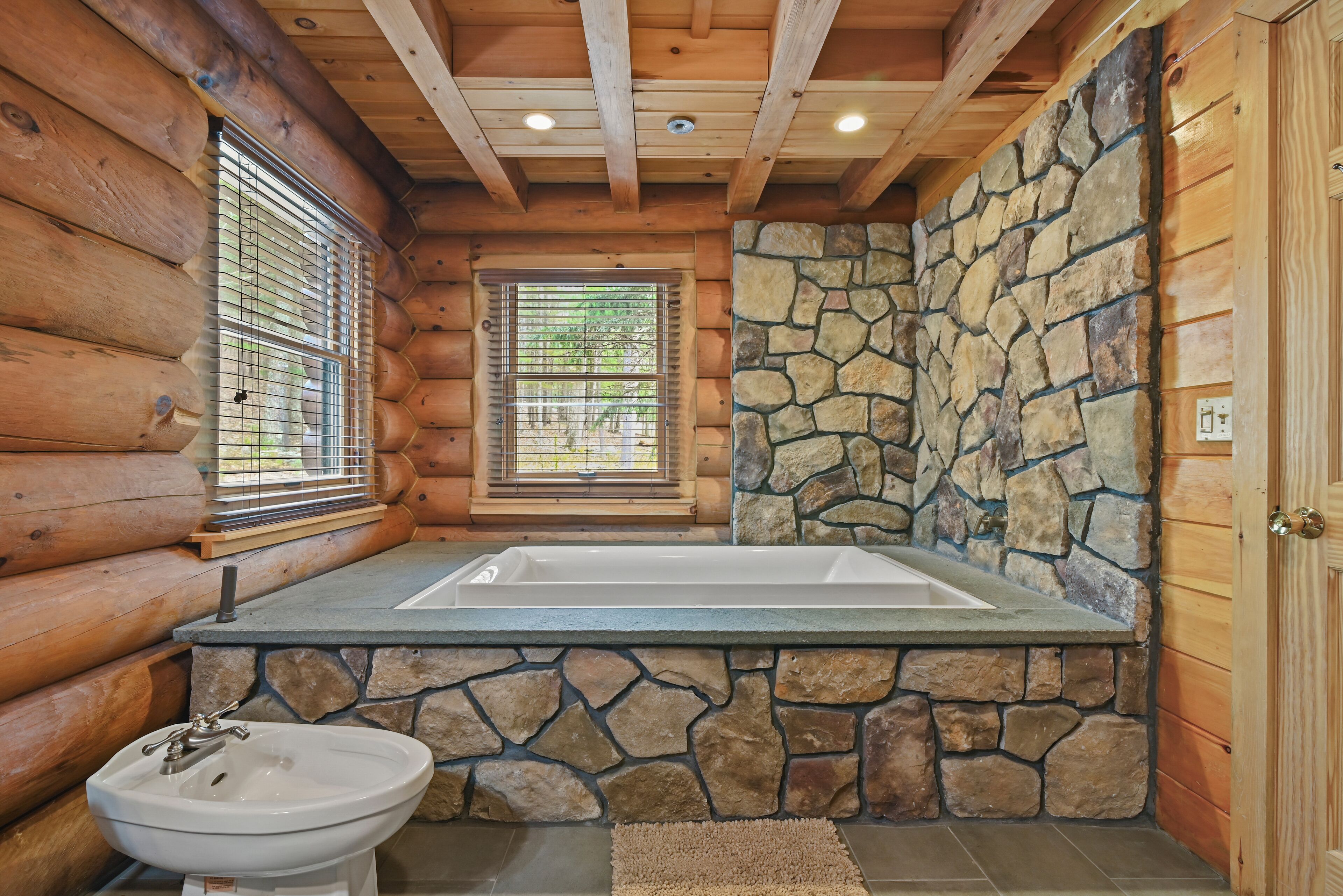 Luxury Lakefront Custom Log Home. Perfect for Ski Trips & Getaways! Swim off the dock or fish for bass and perch in the private 2 acre stocked lake, hike around the 17+ acres of privacy, enjoy camp fires out doors, play billards and video games in the family room, entertain at the wet bar, and take in the private mountain views from the livingroom from this beautiful custom log home. Home features a Master Suite on the first floor (king bed, overflow tub, massage shower), plus 5 additional bedrooms, 4 bathrooms, a massive 2 story stone fireplace. Gameroom, pool table, and large screen TVs provide for endless indoor entertainment, and the 17 acre playground makes this a top family vacation destination in the Lake Region/Lake Wallenpaupack! The property is just minutes from the free public boat launch on Lake Wallenpaupack. Put the boat in for the day and have fun on the 5,700 acre Lake Wallenpaupack, and still be home in time for dinner!