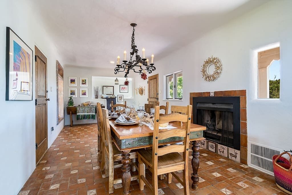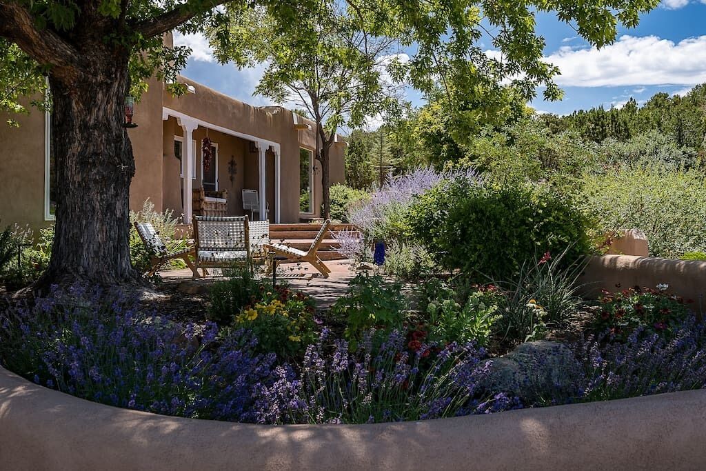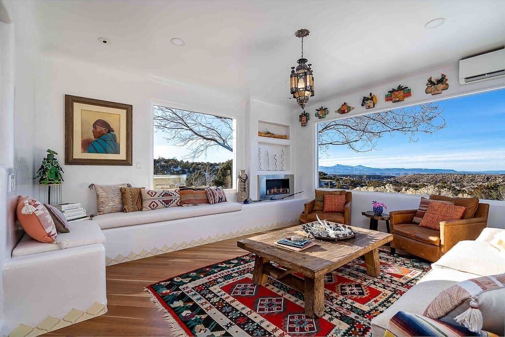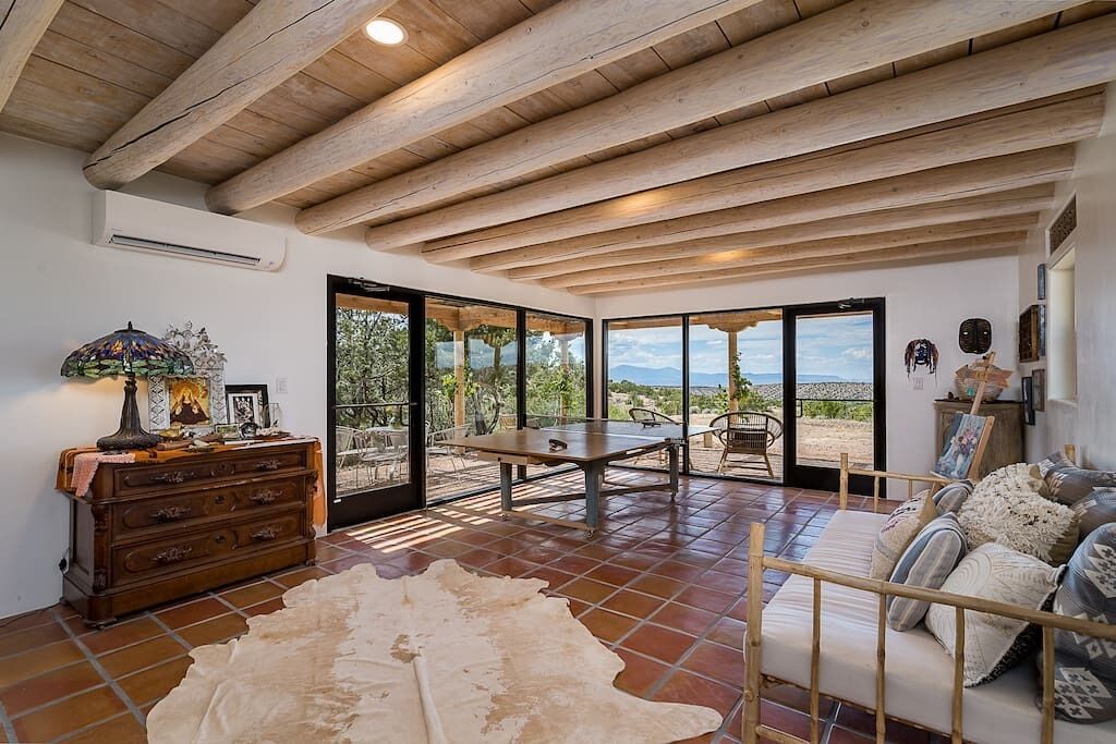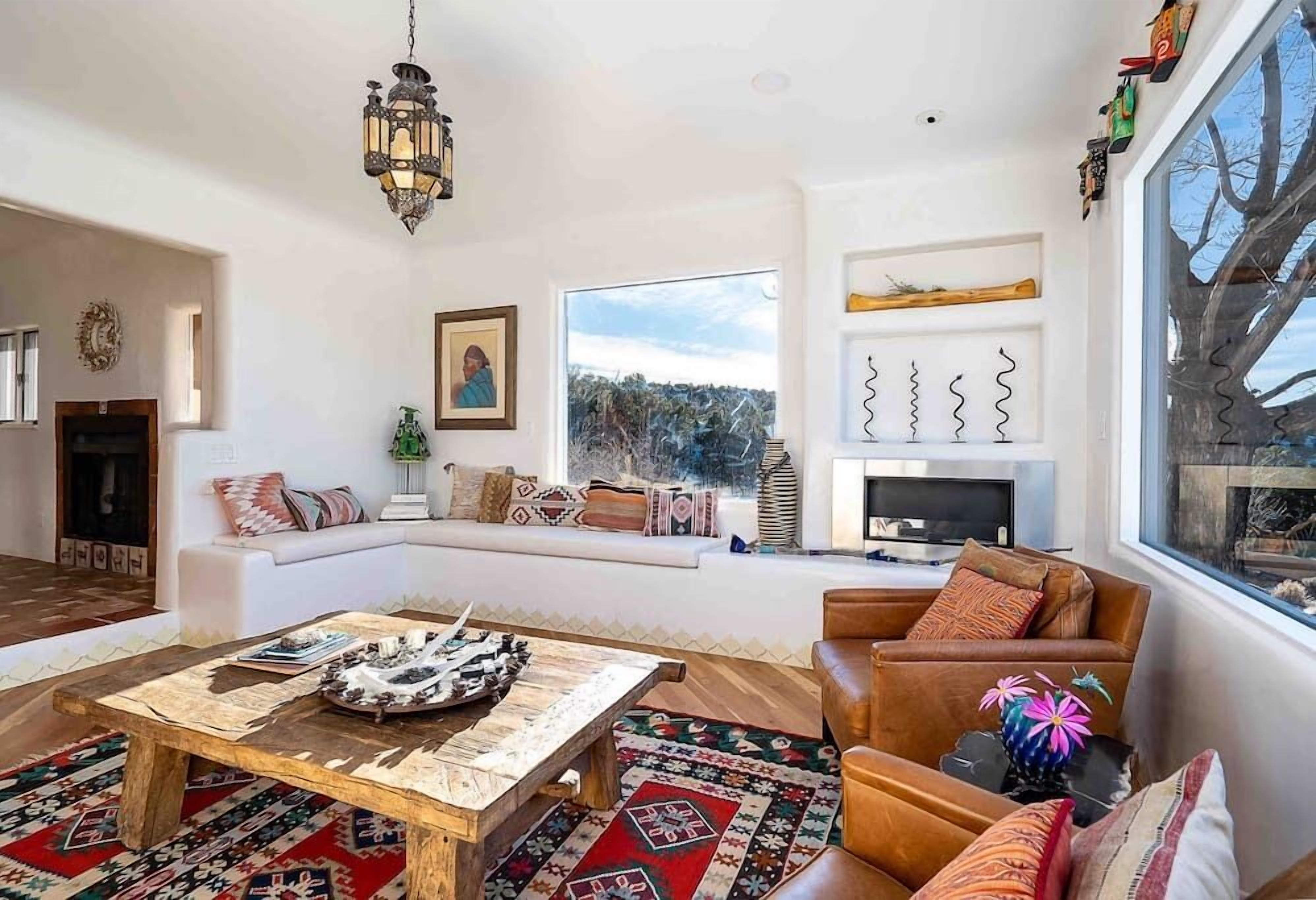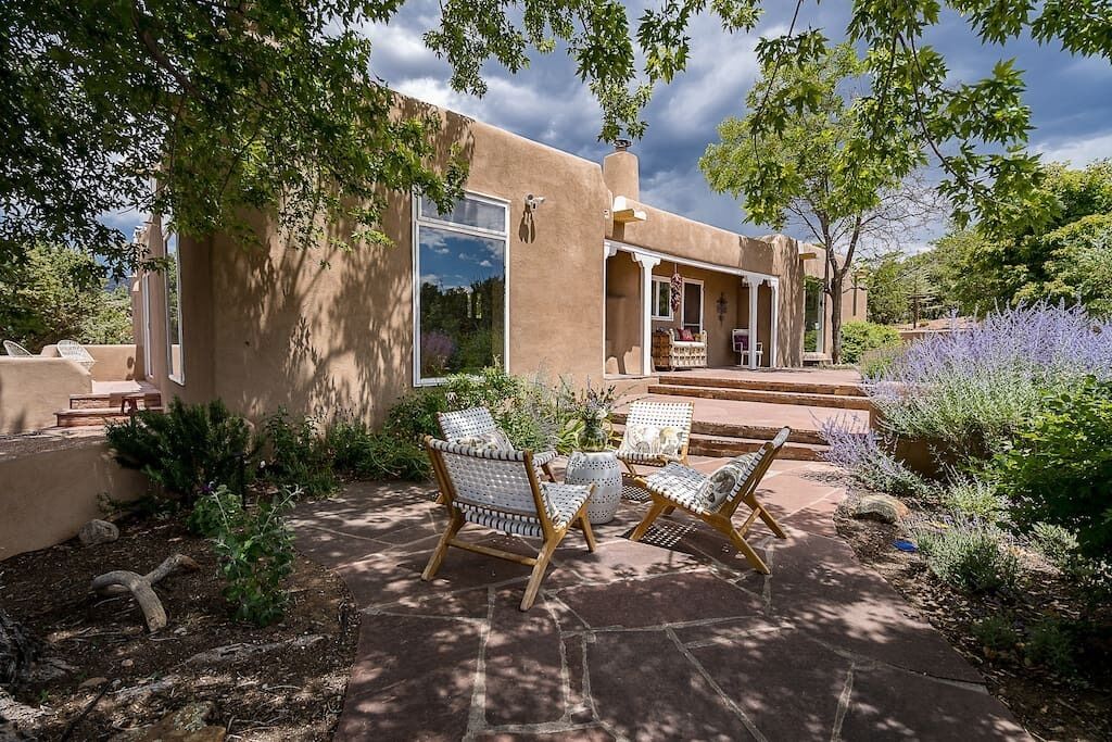 Authentic Luxury Villa with Mountains & Mesa Views (Ideal for long term bookings Summary:Our spacious pueblo home is a beautiful and unique 5-acre property in Santa Fe, New Mexico. It features amazing 300-degree views of the mesas and canyons of the Sangre de Christo and Jemez Mountains. Our home offers an irresistible invitation to adventure.Whether you’re looking for an adventure, a relaxing getaway, or simply to unwind amidst nature, our home, Luna Vista, offers a peaceful and serene experience.The Space:Located approx 18 minutes to the Santa Fe Plaza, Luna Vista sits in a charming and picturesque area surrounded by breathtaking mountains and endless desert views. Our traditionally designed Pueblo home has modern amenities and all the comforts you might need. You are sure to enjoy the charm and warmth Santa Fe has to offer. The main house showcases outstanding artistic design, A/C and heat in every room, an easy and open flow throughout the adobe. It also features Smart/Apple TV, numerous panoramic windows with lots of natural light, and all the ambiance northern New Mexico provides. The layout of the main house: 3 bedrooms, 2 bathrooms, an open kitchen, dining room with seating for 8, living room, sitting room, sunroom, outdoor dining area, and expansive front and back patio areas with a hot tub. The master bedroom is spacious, bright, and relaxing. It features its own a luxurious king-size bed, attached bathroom, Nespresso machine, and private terrace with picturesque views of the desert and mountains. The guest bedrooms feature one full-size bed, and two twin beds (very convenient for families with kids). Another full bathroom is shared between the two bedrooms. The living room is a very special spot in our house offering huge panoramic windows with breathtaking views. Like our entire home, the living room is decorated with lovely artwork and details specific to Santa Fe and the unique cultures it represents. There is plenty of space to relax with a comfortable couch, banco, leather armchairs, and a fireplace. The room comfortably holds 10 and is perfect for evenings spent with family and friends.If you enjoy cooking, our award-winning kitchen is fully stocked and has plenty of counter space for several people to be cooking together. Our kitchen features state of the art appliances and our lighted patio has a propane grill, place settings for up to 12 persons, and all-season entertaining. Santa Fe’s amazing weather allows for dining inside or outdoors most of the year. Our indoor dining room features a fireplace for warm and cozy evenings, while our outdoor dining area is the perfect spot to enjoy your breakfast and morning coffee. Our private oasis is set on 5 scenic acres, offering numerous terraced patio areas, flower gardens, and outdoor games and activities. Our firepit with seating for 10 is the perfect place for s’mores, while the gas-firepit on the back patio is a great place to unwind and stargaze at the end of your day. Our hot tub and hammock each provide their own opportunity to relax while taking in the mountain views and clean air. The property offers various places to walk and take in the many different and breathtaking views that surround us. For a more Zen and contemplative experience, enjoy our labyrinth. Another unique feature at our home is the art studio, which is included in your rental. The studio has a ping-pong table, panoramic views of the mountains, with plenty of covered outdoor seating, including two sun loungers, another outdoor table with seating for four, and additional seating for taking in your favorite bottle of wine, margarita, and a magnificent sunset.Luna Vista invites you to experience all of northern New Mexico’s natural beauty in the most unique and memorable way!Off our main house is our guest Casita. Our two homes are 20 yards apart, connected by an enchanting courtyard and gardens. Our casita sleeps an additional 4 people in two bedrooms. Both the main home and the guest casita are included in your rental. The casita features two traditional kiva fireplaces, large picture windows, hardwood and Saltillo floors, stunning exposed beam ceilings, a full bathroom, and a kitchenette. Our Casita will remind you of a luxurious hotel villa embracing the area's raw aesthetic of mountains, deserts, vegetation, and all that is known as the Santa Fe desert vibe. The layout of the casita: 2 bedrooms, 1-bathroom, open living room, eating area, and kitchenette. The living room is spacious and offers amazing views. It features artistic and unique decor, a comfortable couch with Smart/Apple TV, an eating area for two, and unforgettable mountain views. The kitchenette is stocked with coffee, including a Nespresso machine, microwave, small refrigerator. The master bedroom offers a queen-size Tempur-Pedic adjustable bed, with views of the surrounding forest, while the second bedroom features two twin beds. Both bedrooms and the living room/kitchen area have A/C and heat. The bathroom has a full-size shower and tub with colorful Talavera tile. Come and join us for the ultimate vacation, staycation, reunion...and unforgettable experience!Remote work:In case remote work is in your daily schedule, we have you covered! At our villa, enjoy a ”laptop-friendly environment” with high-speed internet and numerous working areas to chose from whether indoors or outdoors.Guest Access:Guests have access to all 5 acres of our property. The grounds include:- Two fire pits- Gas grill- Colorful flower gardens and fruit trees- Lighted courtyard with seating- Outdoor dining area for 8 people - Front patio with seating- Hot tub- Art studio - Hiking areas and scenic trails within our immediate neighborhood- Labyrinth Other accommodations:-Unlimited wi-fi with boosters-Free parking with space for up to 6 cars-Washer and dryerThe Neighborhood:Located just 20 minutes from the Santa Fe Plaza and downtown, yet surrounded by desert and mountains, our uniquely located home capt