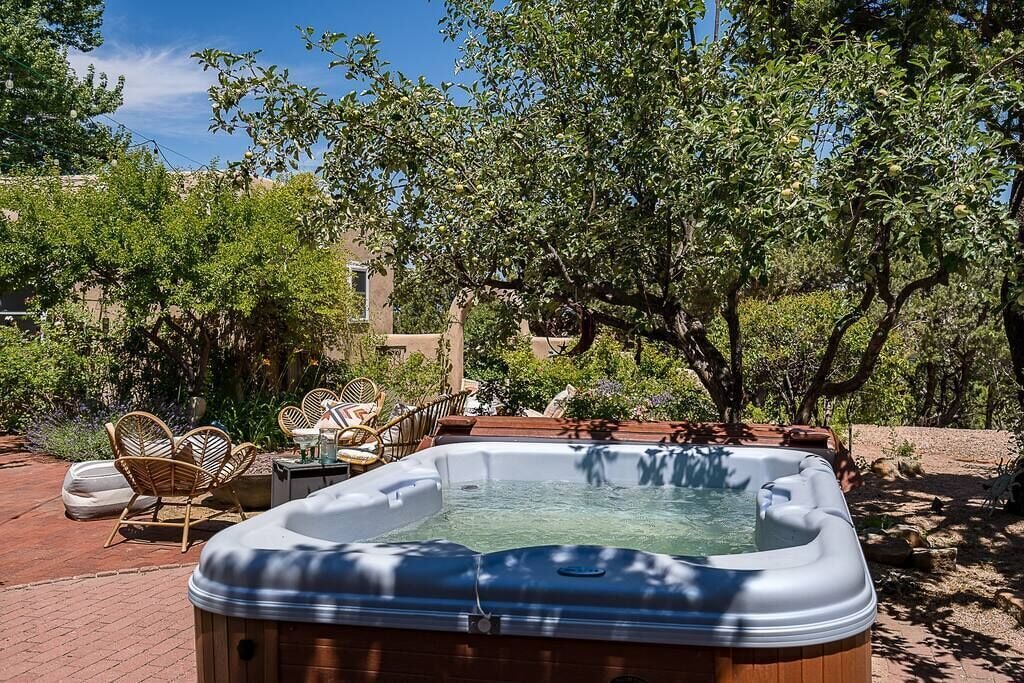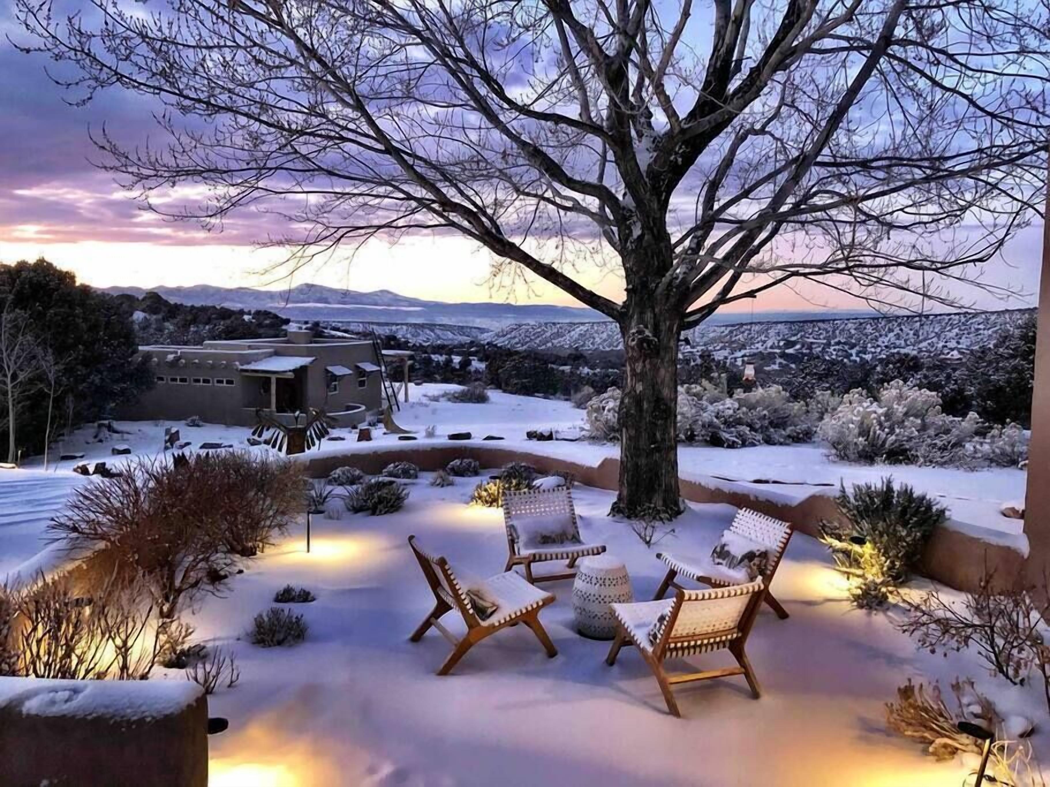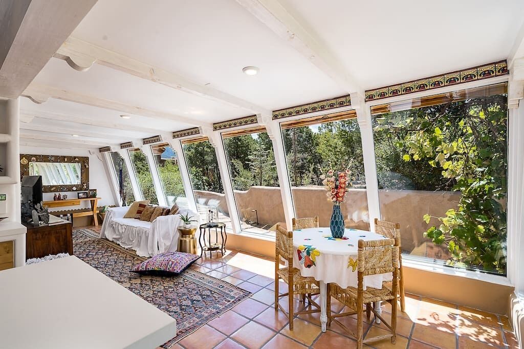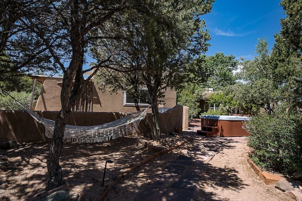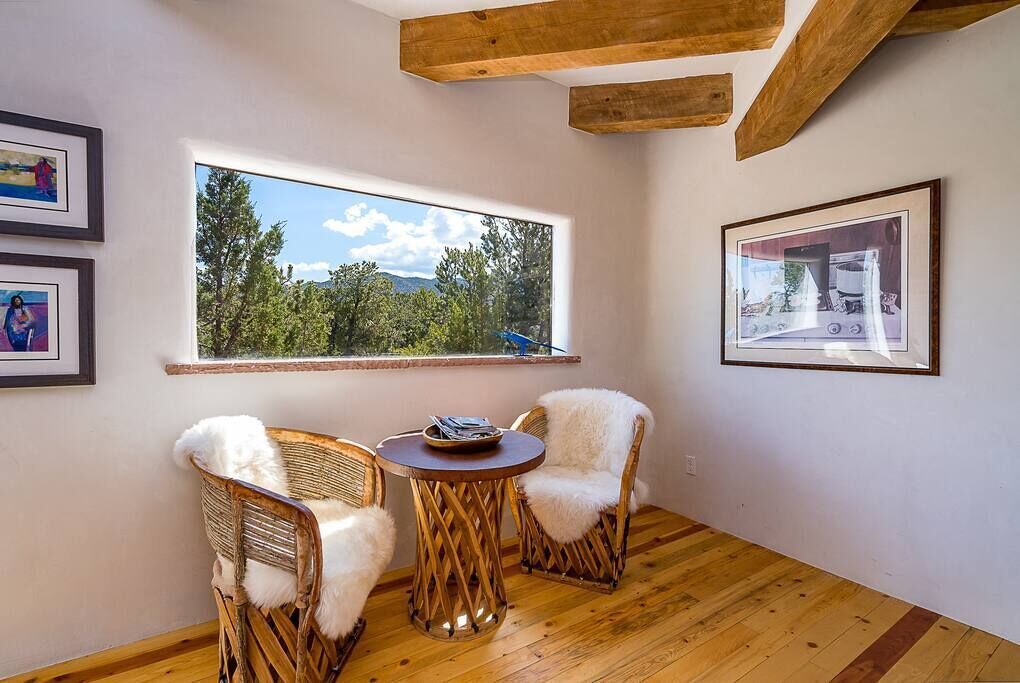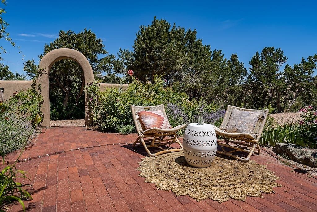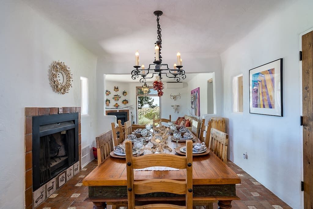 Authentic Luxury Villa with Mountains & Mesa Views (Ideal for long term bookings Summary:Our spacious pueblo home is a beautiful and unique 5-acre property in Santa Fe, New Mexico. It features amazing 300-degree views of the mesas and canyons of the Sangre de Christo and Jemez Mountains. Our home offers an irresistible invitation to adventure.Whether you’re looking for an adventure, a relaxing getaway, or simply to unwind amidst nature, our home, Luna Vista, offers a peaceful and serene experience.The Space:Located approx 18 minutes to the Santa Fe Plaza, Luna Vista sits in a charming and picturesque area surrounded by breathtaking mountains and endless desert views. Our traditionally designed Pueblo home has modern amenities and all the comforts you might need. You are sure to enjoy the charm and warmth Santa Fe has to offer. The main house showcases outstanding artistic design, A/C and heat in every room, an easy and open flow throughout the adobe. It also features Smart/Apple TV, numerous panoramic windows with lots of natural light, and all the ambiance northern New Mexico provides. The layout of the main house: 3 bedrooms, 2 bathrooms, an open kitchen, dining room with seating for 8, living room, sitting room, sunroom, outdoor dining area, and expansive front and back patio areas with a hot tub. The master bedroom is spacious, bright, and relaxing. It features its own a luxurious king-size bed, attached bathroom, Nespresso machine, and private terrace with picturesque views of the desert and mountains. The guest bedrooms feature one full-size bed, and two twin beds (very convenient for families with kids). Another full bathroom is shared between the two bedrooms. The living room is a very special spot in our house offering huge panoramic windows with breathtaking views. Like our entire home, the living room is decorated with lovely artwork and details specific to Santa Fe and the unique cultures it represents. There is plenty of space to relax with a comfortable couch, banco, leather armchairs, and a fireplace. The room comfortably holds 10 and is perfect for evenings spent with family and friends.If you enjoy cooking, our award-winning kitchen is fully stocked and has plenty of counter space for several people to be cooking together. Our kitchen features state of the art appliances and our lighted patio has a propane grill, place settings for up to 12 persons, and all-season entertaining. Santa Fe’s amazing weather allows for dining inside or outdoors most of the year. Our indoor dining room features a fireplace for warm and cozy evenings, while our outdoor dining area is the perfect spot to enjoy your breakfast and morning coffee. Our private oasis is set on 5 scenic acres, offering numerous terraced patio areas, flower gardens, and outdoor games and activities. Our firepit with seating for 10 is the perfect place for s’mores, while the gas-firepit on the back patio is a great place to unwind and stargaze at the end of your day. Our hot tub and hammock each provide their own opportunity to relax while taking in the mountain views and clean air. The property offers various places to walk and take in the many different and breathtaking views that surround us. For a more Zen and contemplative experience, enjoy our labyrinth. Another unique feature at our home is the art studio, which is included in your rental. The studio has a ping-pong table, panoramic views of the mountains, with plenty of covered outdoor seating, including two sun loungers, another outdoor table with seating for four, and additional seating for taking in your favorite bottle of wine, margarita, and a magnificent sunset.Luna Vista invites you to experience all of northern New Mexico’s natural beauty in the most unique and memorable way!Off our main house is our guest Casita. Our two homes are 20 yards apart, connected by an enchanting courtyard and gardens. Our casita sleeps an additional 4 people in two bedrooms. Both the main home and the guest casita are included in your rental. The casita features two traditional kiva fireplaces, large picture windows, hardwood and Saltillo floors, stunning exposed beam ceilings, a full bathroom, and a kitchenette. Our Casita will remind you of a luxurious hotel villa embracing the area's raw aesthetic of mountains, deserts, vegetation, and all that is known as the Santa Fe desert vibe. The layout of the casita: 2 bedrooms, 1-bathroom, open living room, eating area, and kitchenette. The living room is spacious and offers amazing views. It features artistic and unique decor, a comfortable couch with Smart/Apple TV, an eating area for two, and unforgettable mountain views. The kitchenette is stocked with coffee, including a Nespresso machine, microwave, small refrigerator. The master bedroom offers a queen-size Tempur-Pedic adjustable bed, with views of the surrounding forest, while the second bedroom features two twin beds. Both bedrooms and the living room/kitchen area have A/C and heat. The bathroom has a full-size shower and tub with colorful Talavera tile. Come and join us for the ultimate vacation, staycation, reunion...and unforgettable experience!Remote work:In case remote work is in your daily schedule, we have you covered! At our villa, enjoy a ”laptop-friendly environment” with high-speed internet and numerous working areas to chose from whether indoors or outdoors.Guest Access:Guests have access to all 5 acres of our property. The grounds include:- Two fire pits- Gas grill- Colorful flower gardens and fruit trees- Lighted courtyard with seating- Outdoor dining area for 8 people - Front patio with seating- Hot tub- Art studio - Hiking areas and scenic trails within our immediate neighborhood- Labyrinth Other accommodations:-Unlimited wi-fi with boosters-Free parking with space for up to 6 cars-Washer and dryerThe Neighborhood:Located just 20 minutes from the Santa Fe Plaza and downtown, yet surrounded by desert and mountains, our uniquely located home capt