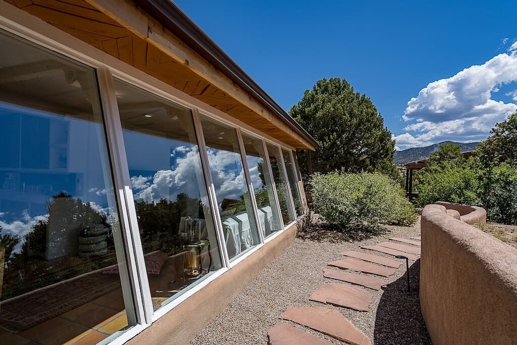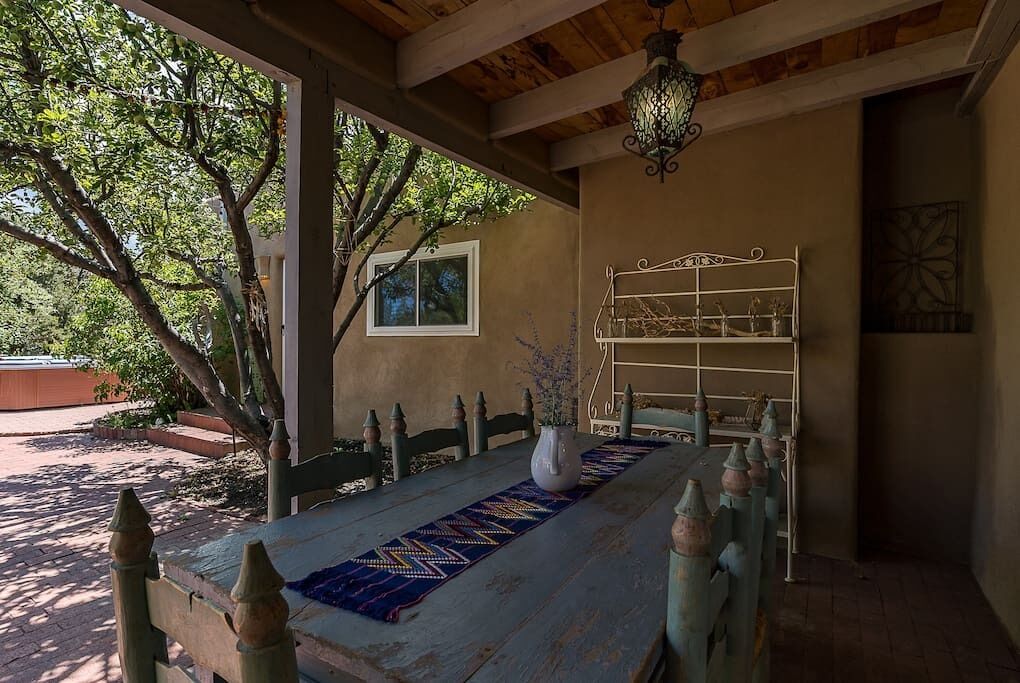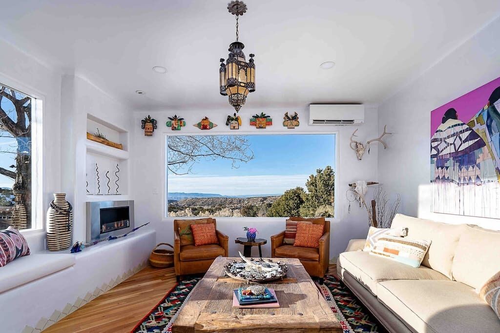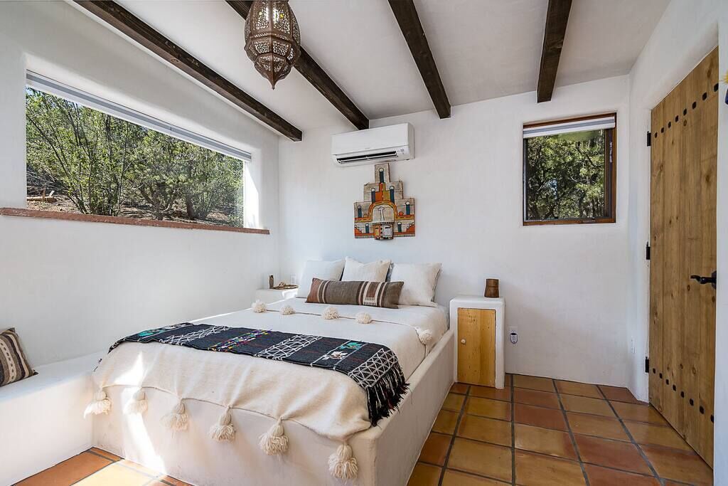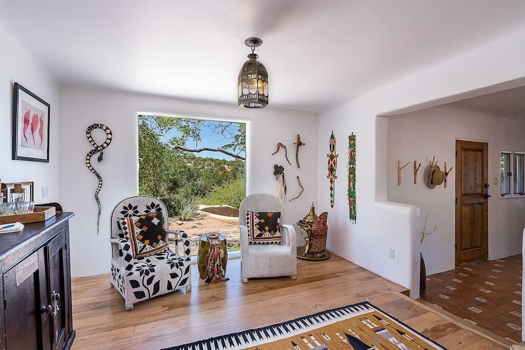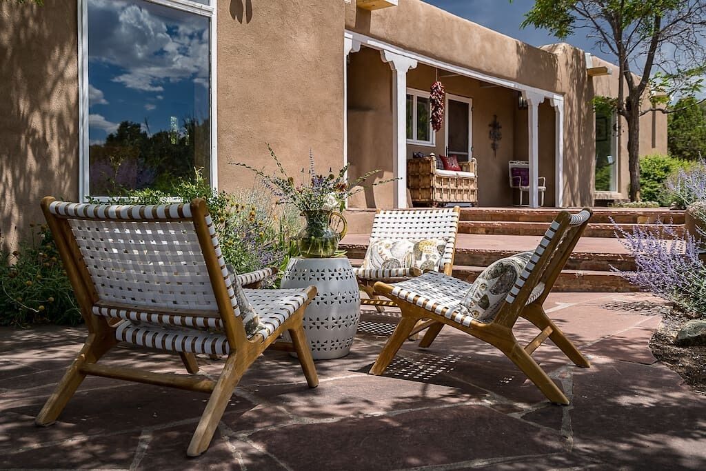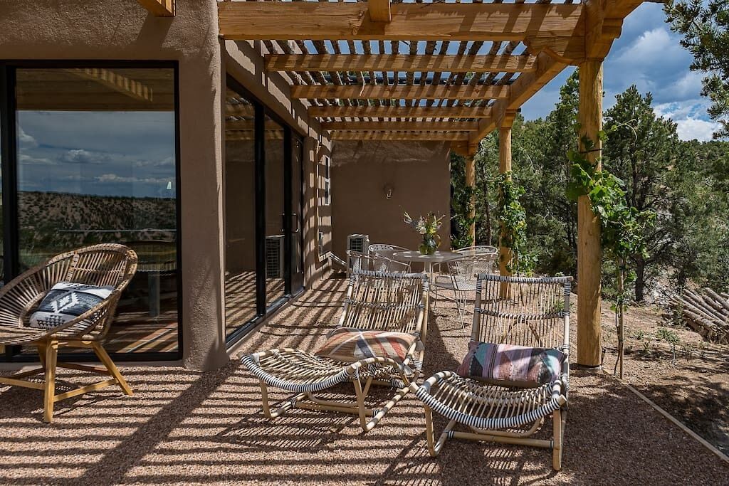 Authentic Luxury Villa with Mountains & Mesa Views (Ideal for long term bookings Summary:Our spacious pueblo home is a beautiful and unique 5-acre property in Santa Fe, New Mexico. It features amazing 300-degree views of the mesas and canyons of the Sangre de Christo and Jemez Mountains. Our home offers an irresistible invitation to adventure.Whether you’re looking for an adventure, a relaxing getaway, or simply to unwind amidst nature, our home, Luna Vista, offers a peaceful and serene experience.The Space:Located approx 18 minutes to the Santa Fe Plaza, Luna Vista sits in a charming and picturesque area surrounded by breathtaking mountains and endless desert views. Our traditionally designed Pueblo home has modern amenities and all the comforts you might need. You are sure to enjoy the charm and warmth Santa Fe has to offer. The main house showcases outstanding artistic design, A/C and heat in every room, an easy and open flow throughout the adobe. It also features Smart/Apple TV, numerous panoramic windows with lots of natural light, and all the ambiance northern New Mexico provides. The layout of the main house: 3 bedrooms, 2 bathrooms, an open kitchen, dining room with seating for 8, living room, sitting room, sunroom, outdoor dining area, and expansive front and back patio areas with a hot tub. The master bedroom is spacious, bright, and relaxing. It features its own a luxurious king-size bed, attached bathroom, Nespresso machine, and private terrace with picturesque views of the desert and mountains. The guest bedrooms feature one full-size bed, and two twin beds (very convenient for families with kids). Another full bathroom is shared between the two bedrooms. The living room is a very special spot in our house offering huge panoramic windows with breathtaking views. Like our entire home, the living room is decorated with lovely artwork and details specific to Santa Fe and the unique cultures it represents. There is plenty of space to relax with a comfortable couch, banco, leather armchairs, and a fireplace. The room comfortably holds 10 and is perfect for evenings spent with family and friends.If you enjoy cooking, our award-winning kitchen is fully stocked and has plenty of counter space for several people to be cooking together. Our kitchen features state of the art appliances and our lighted patio has a propane grill, place settings for up to 12 persons, and all-season entertaining. Santa Fe’s amazing weather allows for dining inside or outdoors most of the year. Our indoor dining room features a fireplace for warm and cozy evenings, while our outdoor dining area is the perfect spot to enjoy your breakfast and morning coffee. Our private oasis is set on 5 scenic acres, offering numerous terraced patio areas, flower gardens, and outdoor games and activities. Our firepit with seating for 10 is the perfect place for s’mores, while the gas-firepit on the back patio is a great place to unwind and stargaze at the end of your day. Our hot tub and hammock each provide their own opportunity to relax while taking in the mountain views and clean air. The property offers various places to walk and take in the many different and breathtaking views that surround us. For a more Zen and contemplative experience, enjoy our labyrinth. Another unique feature at our home is the art studio, which is included in your rental. The studio has a ping-pong table, panoramic views of the mountains, with plenty of covered outdoor seating, including two sun loungers, another outdoor table with seating for four, and additional seating for taking in your favorite bottle of wine, margarita, and a magnificent sunset.Luna Vista invites you to experience all of northern New Mexico’s natural beauty in the most unique and memorable way!Off our main house is our guest Casita. Our two homes are 20 yards apart, connected by an enchanting courtyard and gardens. Our casita sleeps an additional 4 people in two bedrooms. Both the main home and the guest casita are included in your rental. The casita features two traditional kiva fireplaces, large picture windows, hardwood and Saltillo floors, stunning exposed beam ceilings, a full bathroom, and a kitchenette. Our Casita will remind you of a luxurious hotel villa embracing the area's raw aesthetic of mountains, deserts, vegetation, and all that is known as the Santa Fe desert vibe. The layout of the casita: 2 bedrooms, 1-bathroom, open living room, eating area, and kitchenette. The living room is spacious and offers amazing views. It features artistic and unique decor, a comfortable couch with Smart/Apple TV, an eating area for two, and unforgettable mountain views. The kitchenette is stocked with coffee, including a Nespresso machine, microwave, small refrigerator. The master bedroom offers a queen-size Tempur-Pedic adjustable bed, with views of the surrounding forest, while the second bedroom features two twin beds. Both bedrooms and the living room/kitchen area have A/C and heat. The bathroom has a full-size shower and tub with colorful Talavera tile. Come and join us for the ultimate vacation, staycation, reunion...and unforgettable experience!Remote work:In case remote work is in your daily schedule, we have you covered! At our villa, enjoy a ”laptop-friendly environment” with high-speed internet and numerous working areas to chose from whether indoors or outdoors.Guest Access:Guests have access to all 5 acres of our property. The grounds include:- Two fire pits- Gas grill- Colorful flower gardens and fruit trees- Lighted courtyard with seating- Outdoor dining area for 8 people - Front patio with seating- Hot tub- Art studio - Hiking areas and scenic trails within our immediate neighborhood- Labyrinth Other accommodations:-Unlimited wi-fi with boosters-Free parking with space for up to 6 cars-Washer and dryerThe Neighborhood:Located just 20 minutes from the Santa Fe Plaza and downtown, yet surrounded by desert and mountains, our uniquely located home capt