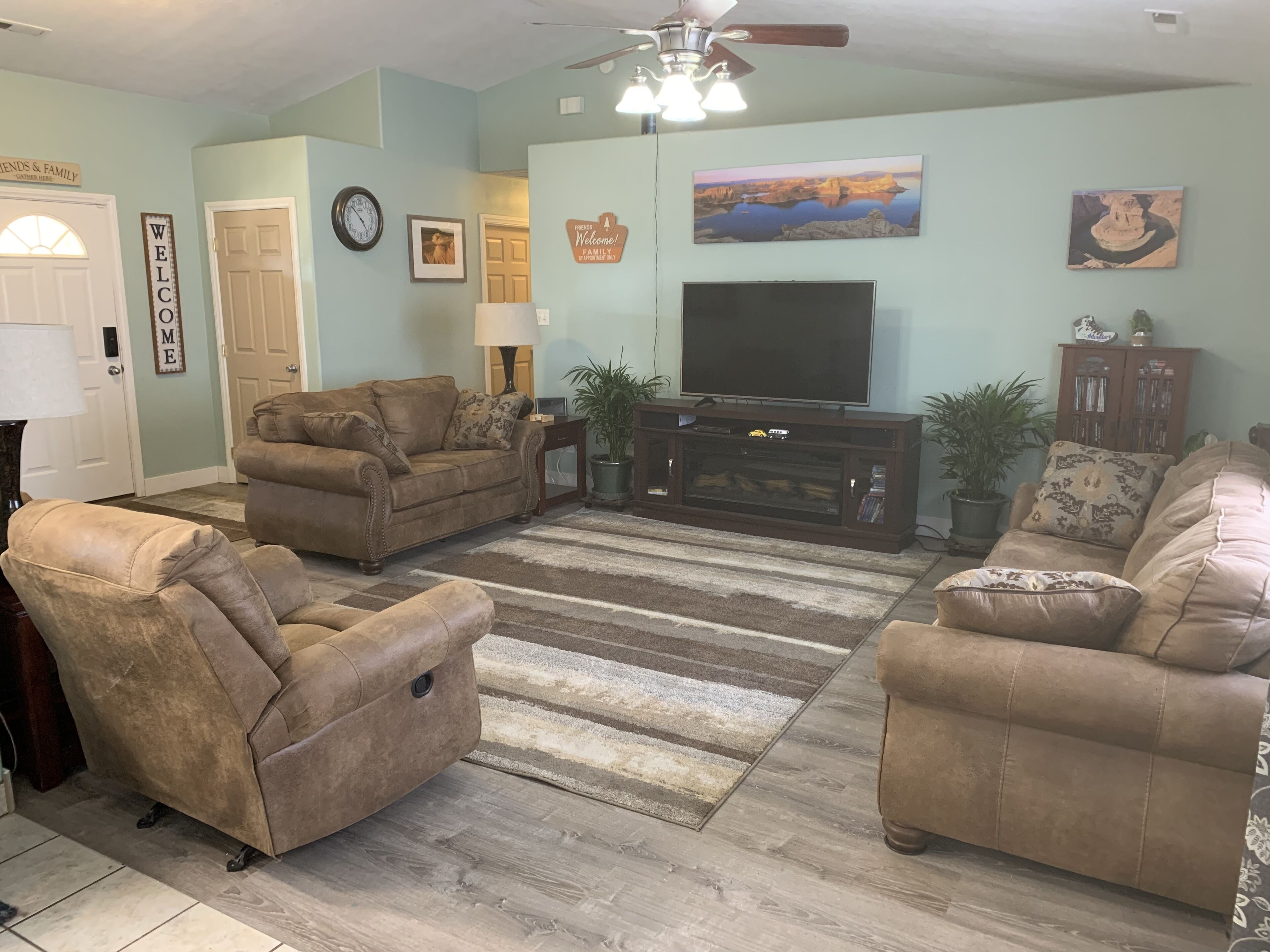 Large home, close to National parks, hiking & sightseeing. sleeps up to 10. Great home base as you travel Southern Utah/Northern AZ or a hidden getaway to relax and unwind. Quiet neighborhood, large home, comfortable beds, plenty of room for large families, sleeps up to 10 people. Five minutes from Kanab. Large front parking area. Backyard Oasis with kids play area, outdoor kitchen, 12 x 16 Pergola and fire pit area. Blackout curtains in all bedrooms. All new luxurious linens and towels. Smart TV in each bedroom with streaming and local channels. Free high speed internet. Electric fireplace in living room. Dining room table opens up to seat 10. Updated kitchen with modern appliances. New floors throughout home. DVR with large video library. Full stocked kitchen, Keurig coffee machine, coffee, hot chocolate and tea is provided, counter soft nugget Ice machine. Portable playpen/bed and child highchair available. Large enough parking area to park an RV for additional family/ friends There is an RV dump on the property.. Host Bailey is friendly, helpful and was raised in Southern Utah/Northern AZ , she can answer any questions and help make your vacation one to remember.