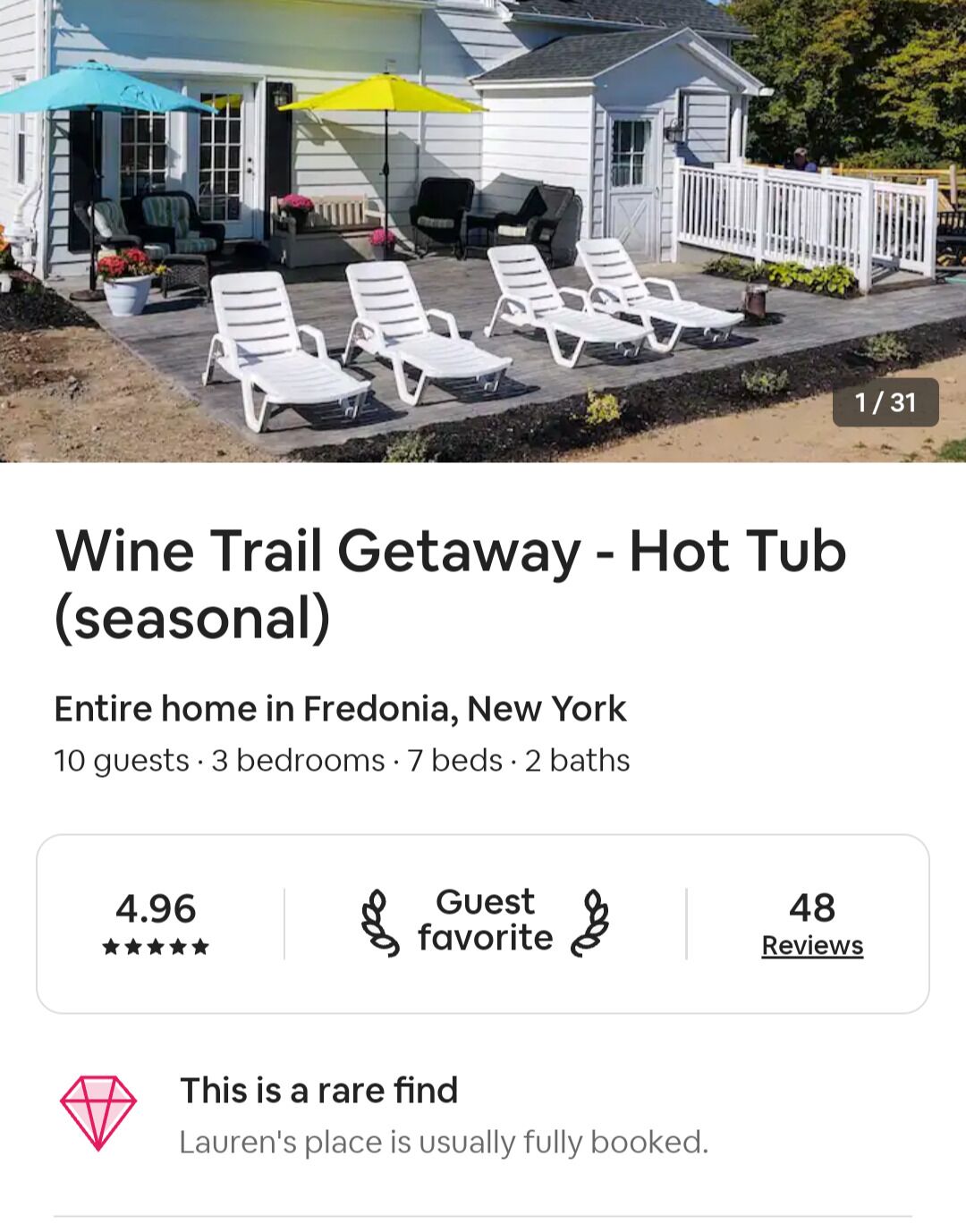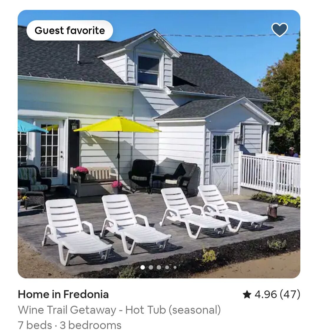 BitterSweet Vineyard Views along Chatauqua Wine Trail w/hot tub and pet friendly Take it easy at this charming cottage, featuring modern amenities, a rural setting, and a patio and fire pit area ready for entertaining -including a hot tub (Open April through October). Guests will feel comfortable and totally pampered as they enjoy this completely renovated getaway. Guests won't find it hard to relax in this fully updated cottage that blends shabby chic and industrial farmhouse for a modern and cozy feel. Each season offers fresh opportunities to enjoy the property and surrounding areas. In the warmer months, lounge on the patio to catch some rays or shooting stars, stroll through large outdoor property, or explore one of the many quaint towns nearby. Water lovers and fishermen are in luck with both Lake Erie and Lake Chautauqua so close by. The drive can even accommodate limited boat parking if needed.There's still plenty to enjoy both inside and outside when the days get colder. There's plenty of room to build snow forts, cross-country ski or snowshoe. When it's time to get warm, build a cozy fire, enjoy a movie on the Smart TV, challenge someone to a round of darts or any other game available in the downstairs family room. Many winter sporting opportunities are available nearby, but guess should check online for dates and details while planning their stay.There's a small garden near the home where guests will find an asortment of seasonal vegetables and herbs. As a special treat in October, the region will be buzzing for grape harvest season and then again in March for maple syrup harvest. Guests with dogs are more than welcome, too. We have dog bowls, a 24x36 kennel and pooper scoopers ready. We just asked the dogs be treated for fleas and ticks prior to arrival and the guest pick up after their pets. Guests have full access to the home and surrounding outdoor property including a working vineyard.Please note.... The hot tub is open seasonally from April through October.