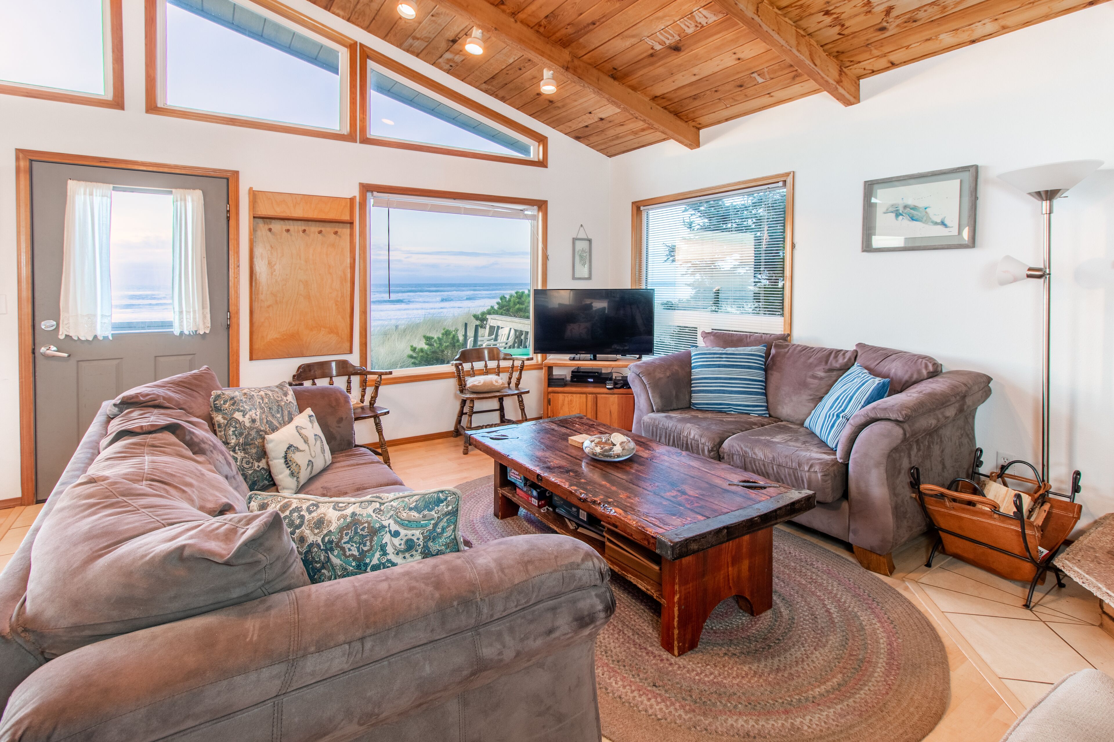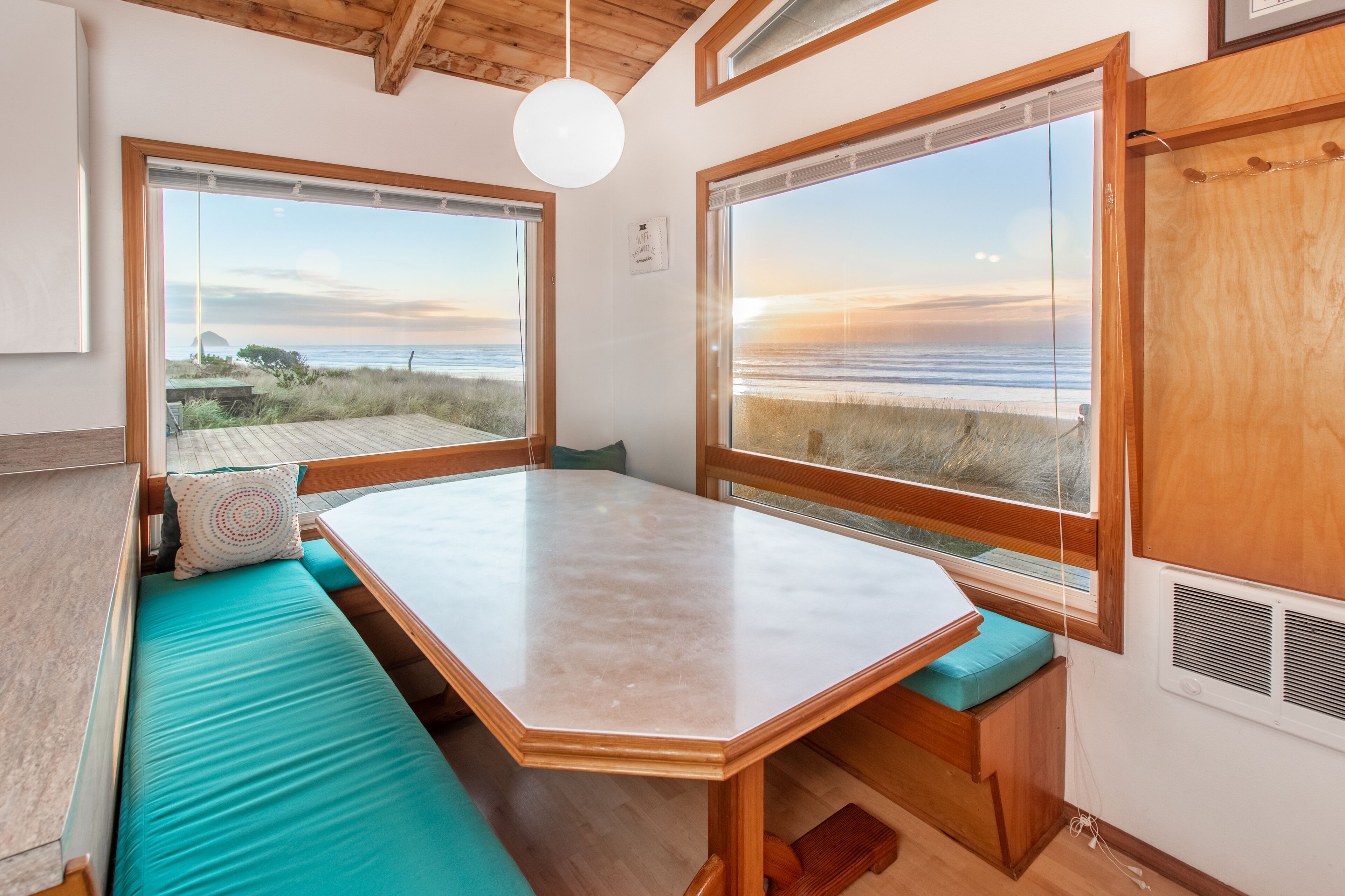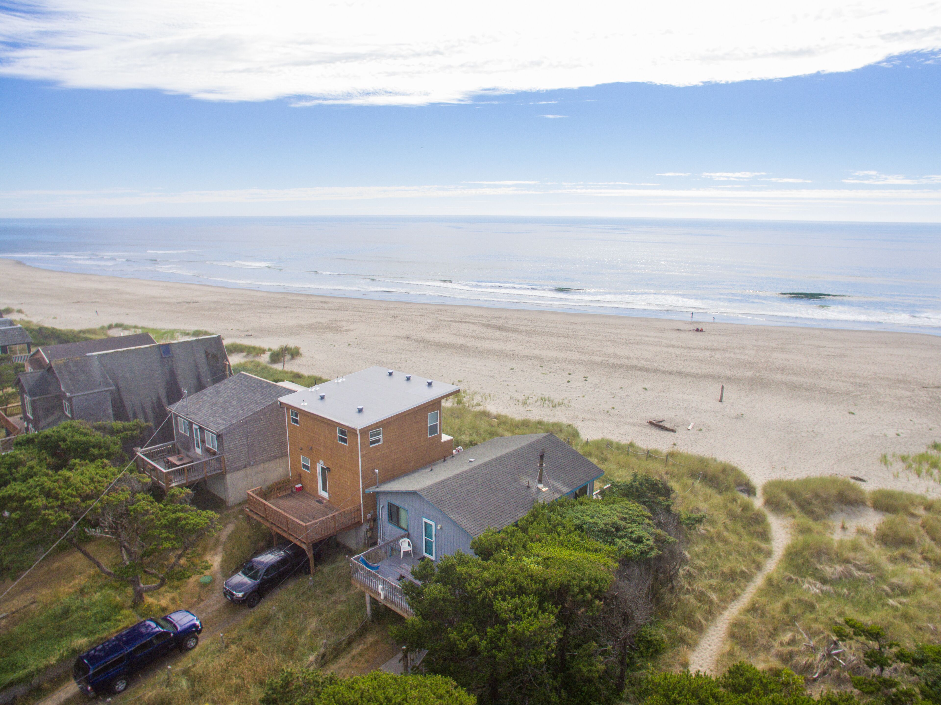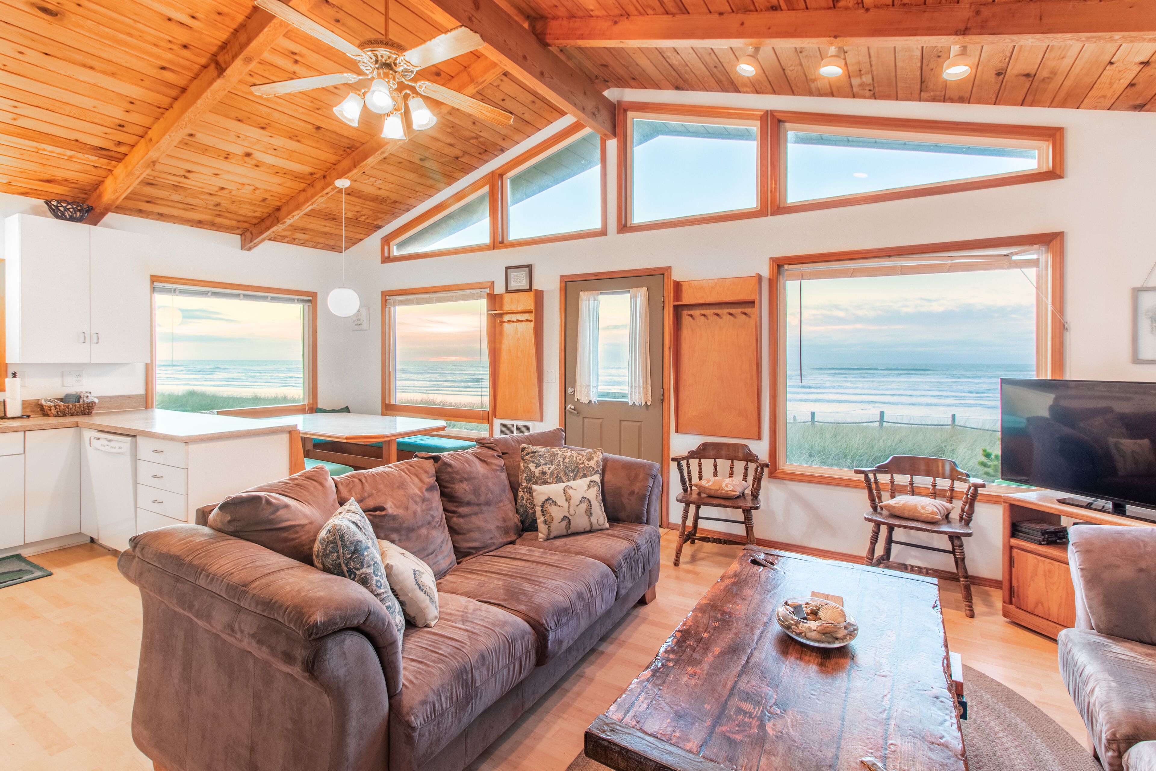 Ocean Annie #128 - oceanfront cabin, great views and direct beach access in Tierra Del Mar With beachfront access and views, Ocean Annie is hard to improve upon. But the new owners have made some great updates to the home to make your stay even more memorable. Ocean Annie has been updated throughout the interior with new art and carpet and has been stocked with new games, puzzles and a DVD library of ocean- and beach-themed DVDs. New, colorful cushions on the wrap around dining benches bring additional color to the home and more comfort for sharing a meal with friends and family or putting together a puzzle while watching the waves roll in. It's also been updated with a new wood stove for cozy evenings at the Oregon coast.Features:Oceanfront deckGas BBQExtended Cable TV with HBOlaundry roomWIFIMax cars 2 (Contact us if additional parking space is needed)Pet friendlyLayout:2nd level entry. Living room, dining area and kitchen. Back & front deck space. Master bedroom with queen bed and full bath. 2nd bedroom has queen bed 3rd bedroom has double bed. Full hall bath. Laundry area downstairs.Neighborhood:The village of Tierra Del Mar is a small community of traditional beach homes 3 miles north of Pacific City along the Three Capes Scenic Route. There are several quiet lanes lined with both historic cabins and larger beach homes that all lead to direct beach access. All homes in Tierra Del Mar are a quick, easy walk to the beach. The beach here is quiet and long—beachcombers can walk for hours down this lengthy stretch that is relatively undiscovered. It is a good spot for beachcombers who often find agates and Japanese glass floats. Sandlake Dunes recreation area is 4 miles to the north.Tillamook STVR#851-10-0281Access:Kiwanda Coastal Properties is a local, professional Oregon Coast vacation rental management company that offers over 50 homes in the Pacific City area. We have been offering beach rental homes for more than 30 years. Reliable management means responsive service, insider guides to the area and a better vacation experience. Our nearby office is staffed 7 days a week ensuring that homes and guests are taken care of if any needs arise. We look forward to accommodating your next beach trip. Please contact us anytime for more information. Most homes require guests be at least 24 years old. This home is on a small slow street. Please respect speed limits.This home is pet friendly for one or two dogs. Please let us know if you will be bringing a pet so that we can add the non-refundable pet fee of $10/night. Only well-behaved dogs are allowed. Pets are not allowed on the furniture, or left in the house unattended.Occupancy rules are strictly enforced and apply to the entire property during the stay. Additional day-use guests may be allowed with management pre-approval. After your booking is confirmed, you will be sent the full rental contract and terms.The safety of our staff, guests and local community is our top priority. This home is professionally managed and cleaned to strict standards in line with CDC guidelines, including supervised housekeeping and post-clean sanitation.Cancellation policy: 1/2 the total cost of the booking is subject to forfeiture if reservation is canceled or changed within 30 days of arrival. 100% of rental rate is charged if cancelled (or no-show) within 7 days of arrival. If the house is fully rebooked by another renter, cancellation charges (less $35) will be refunded. Reservation cancellation fee is $35. (If you book with a 3rd party, different charges may apply).