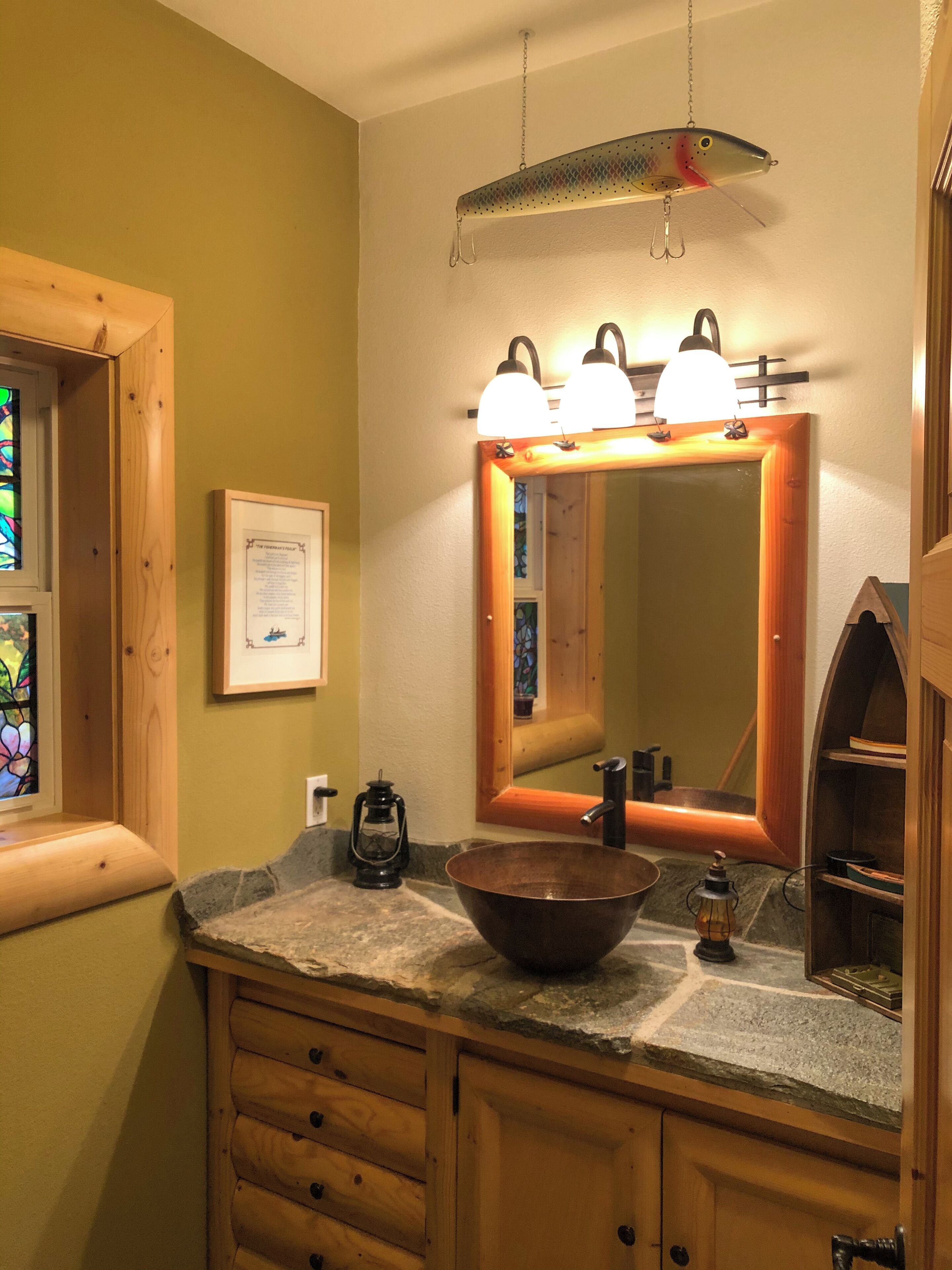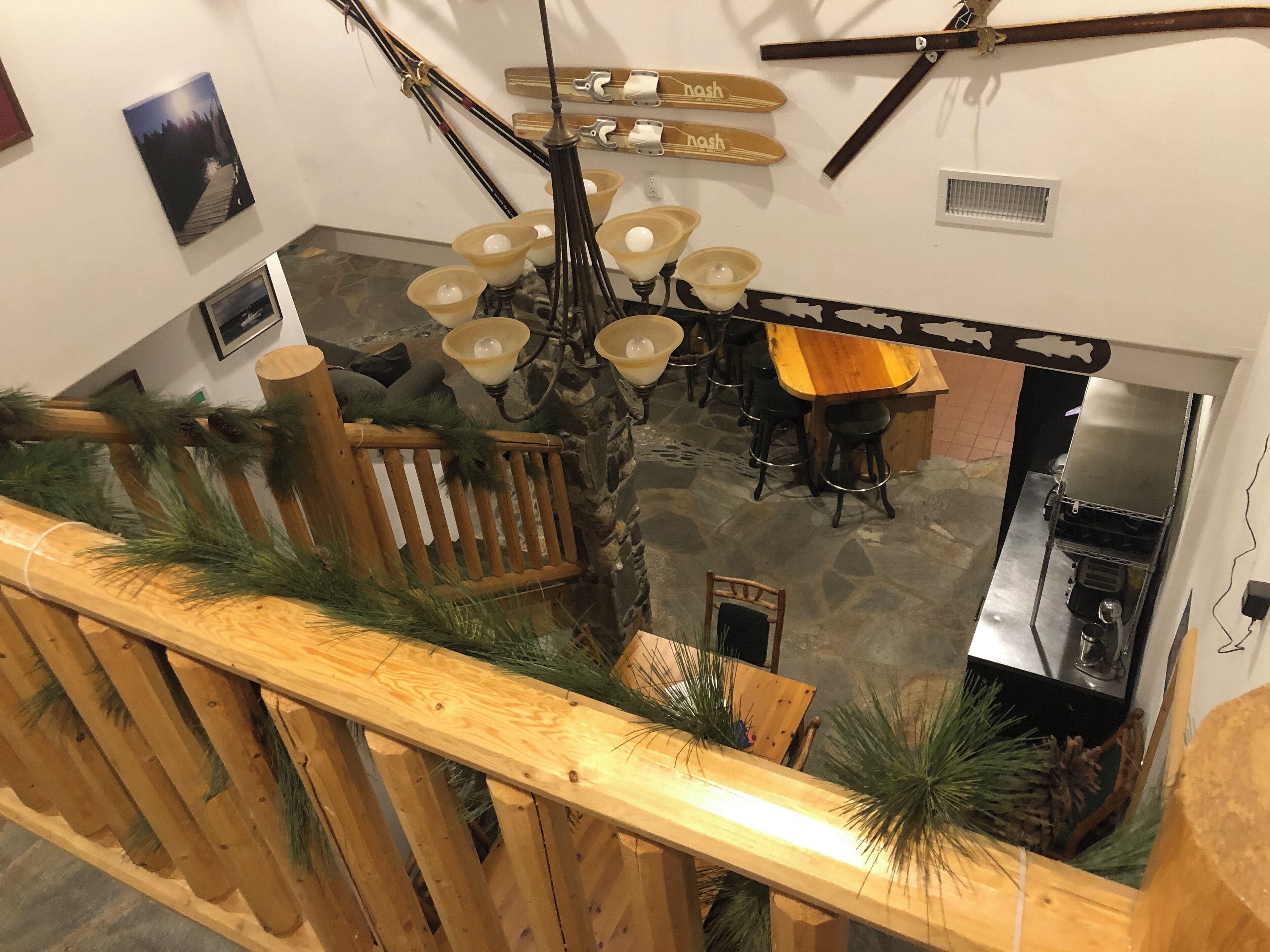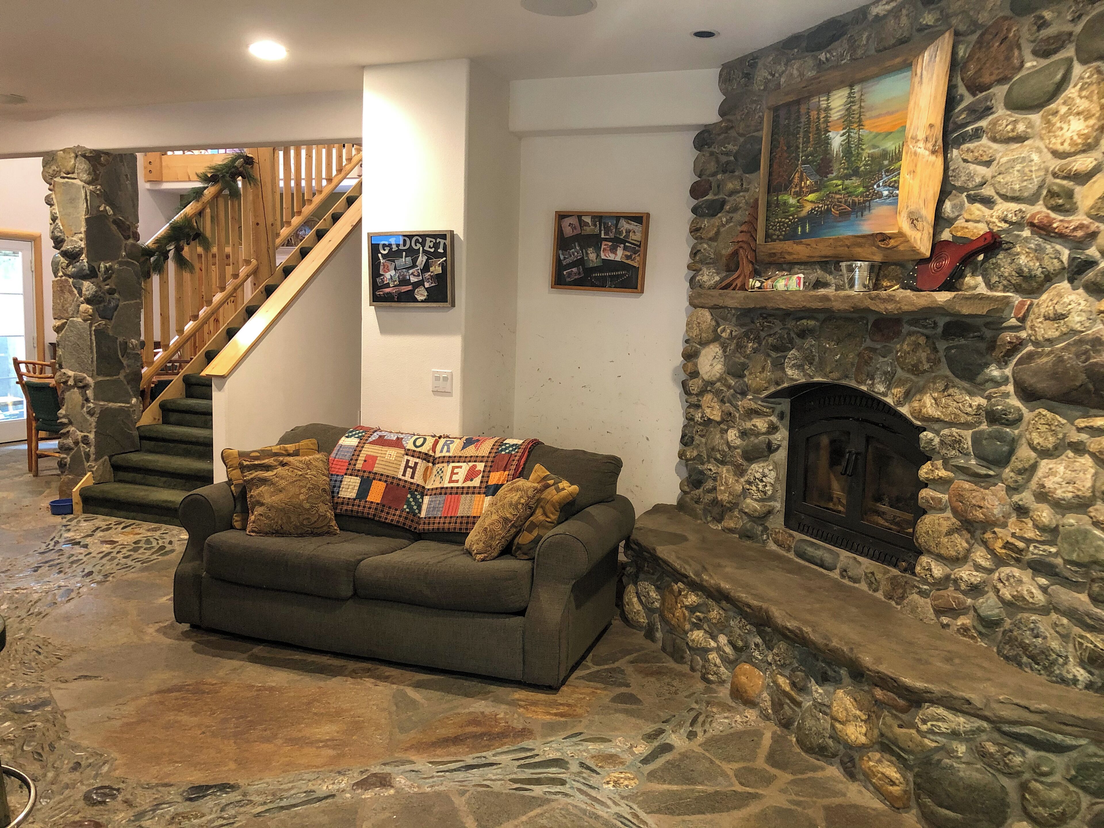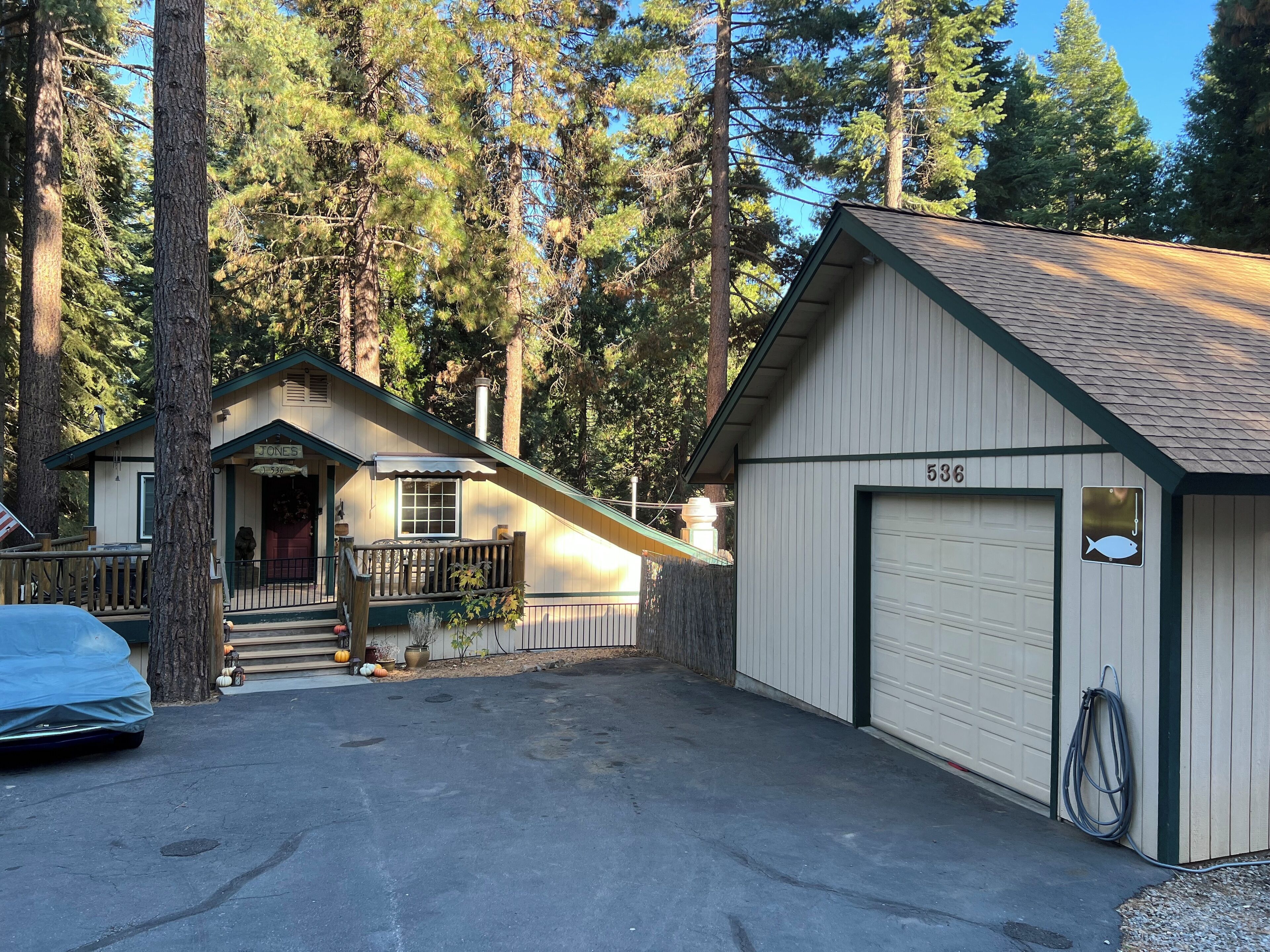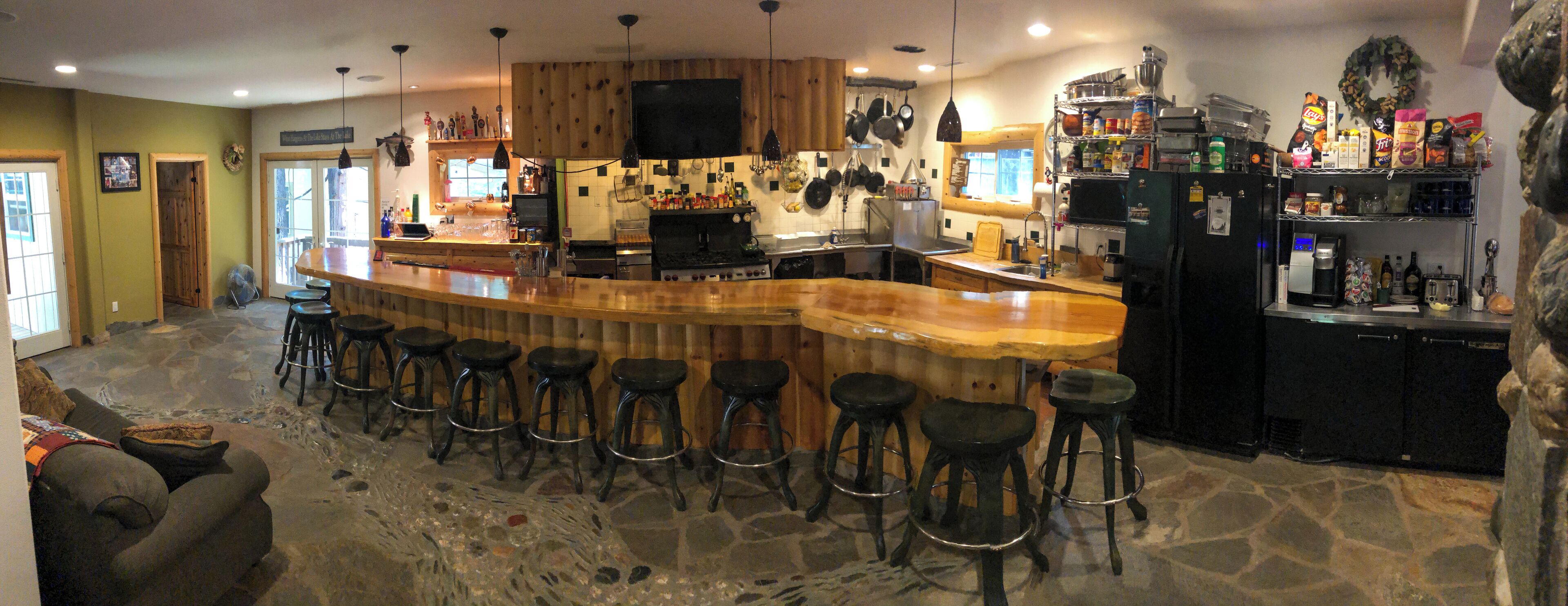 Custom Home in Almanor Pines WEEKLY RENTALS ONLY PLEASEPaved driveway to front door. Front entry takes you to office/guest bedroom, master bedroom and stairs leading to downstairs main area. Great room is open with beautiful stone fireplace, commercial kitchen and 20 foot bar. one small sofa sleeper.Note: No Traditional Living RoomSpace is designed bar & grill style with a commercial style kitchen behind a large eating bar that runs diagonally through the entire great room. The home is setup with family, friends and the outdoors in mind. lots of small sleeping spaces and a large "great room" for gathering all together after a day of hiking, boating, fishing or just playing in the yard.