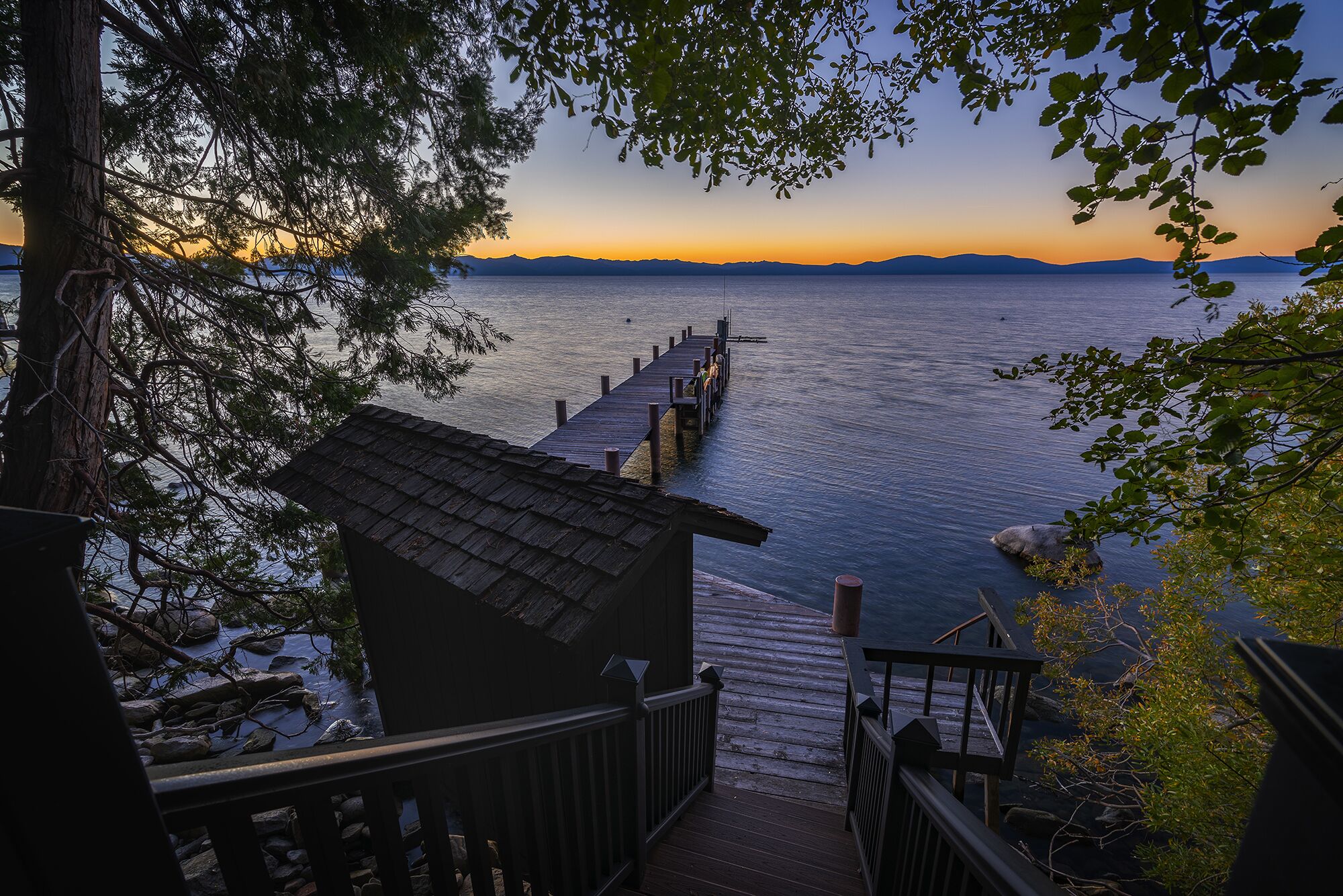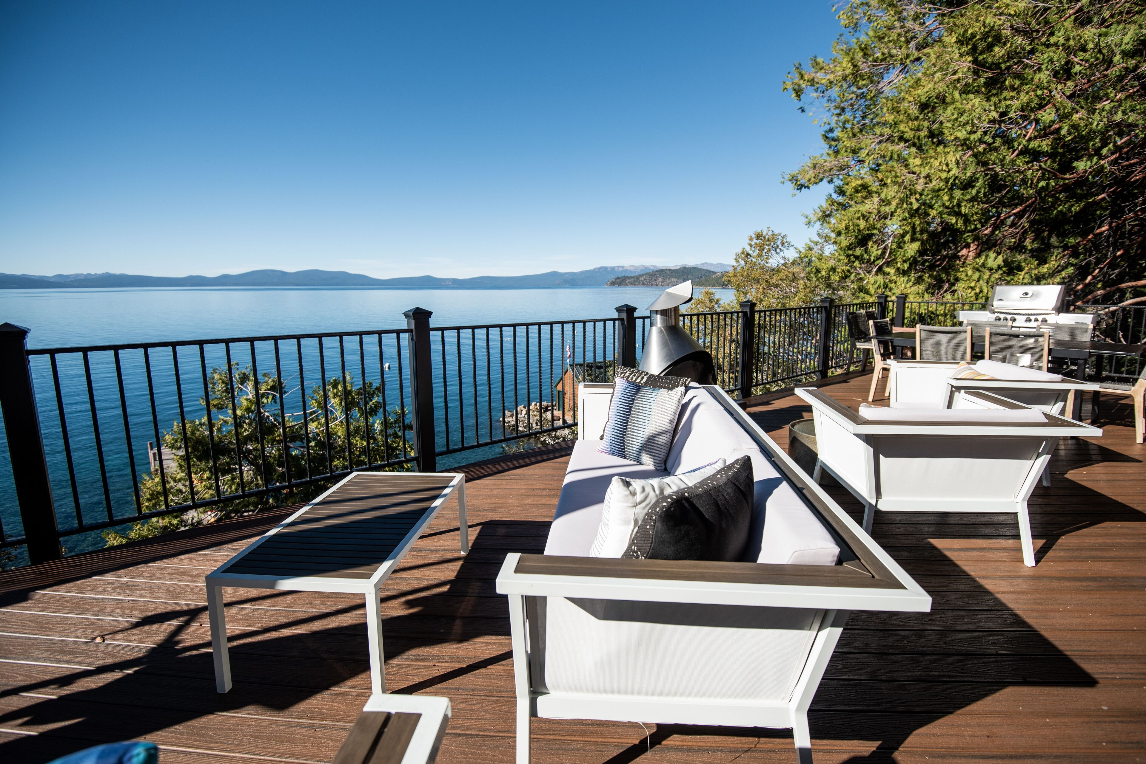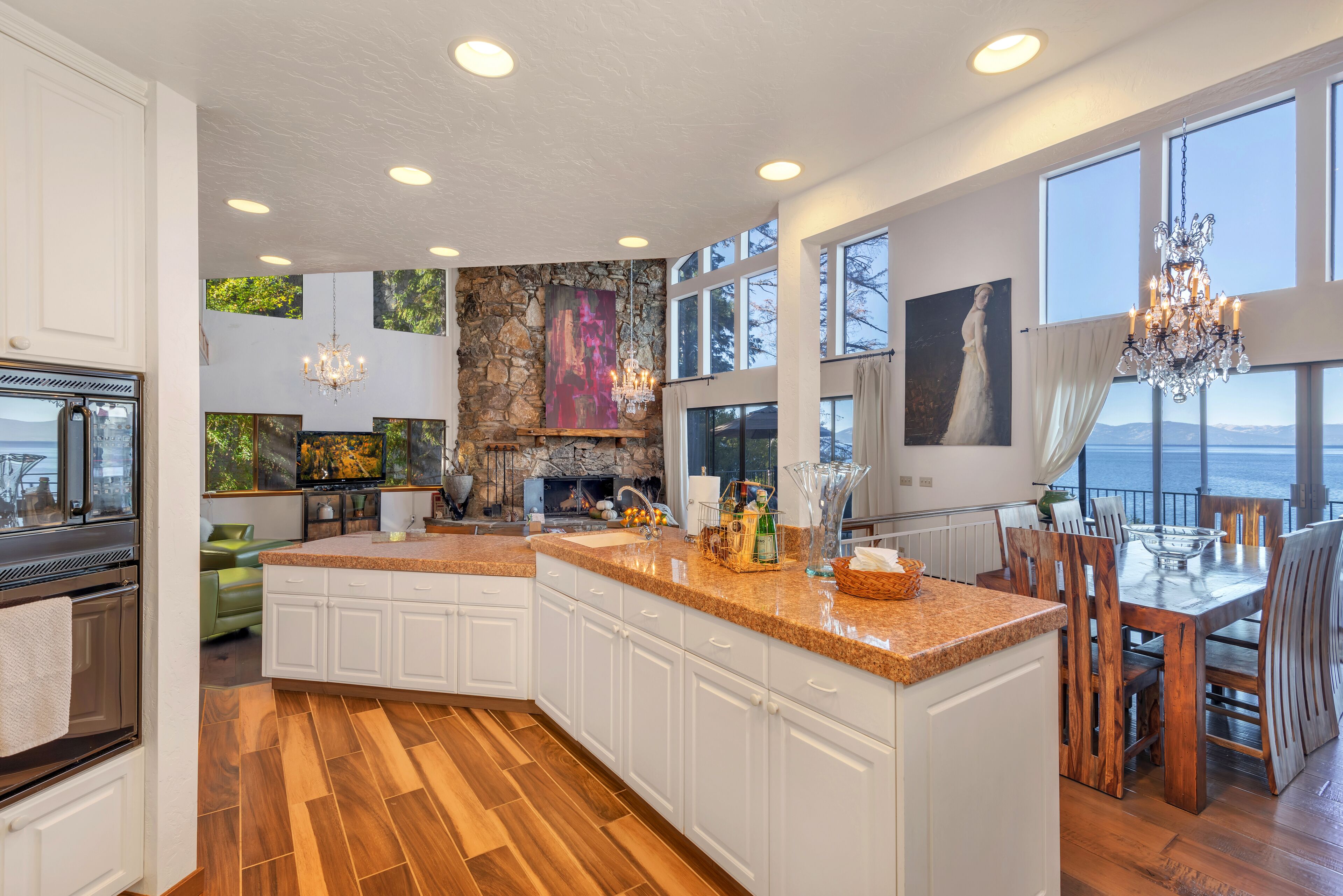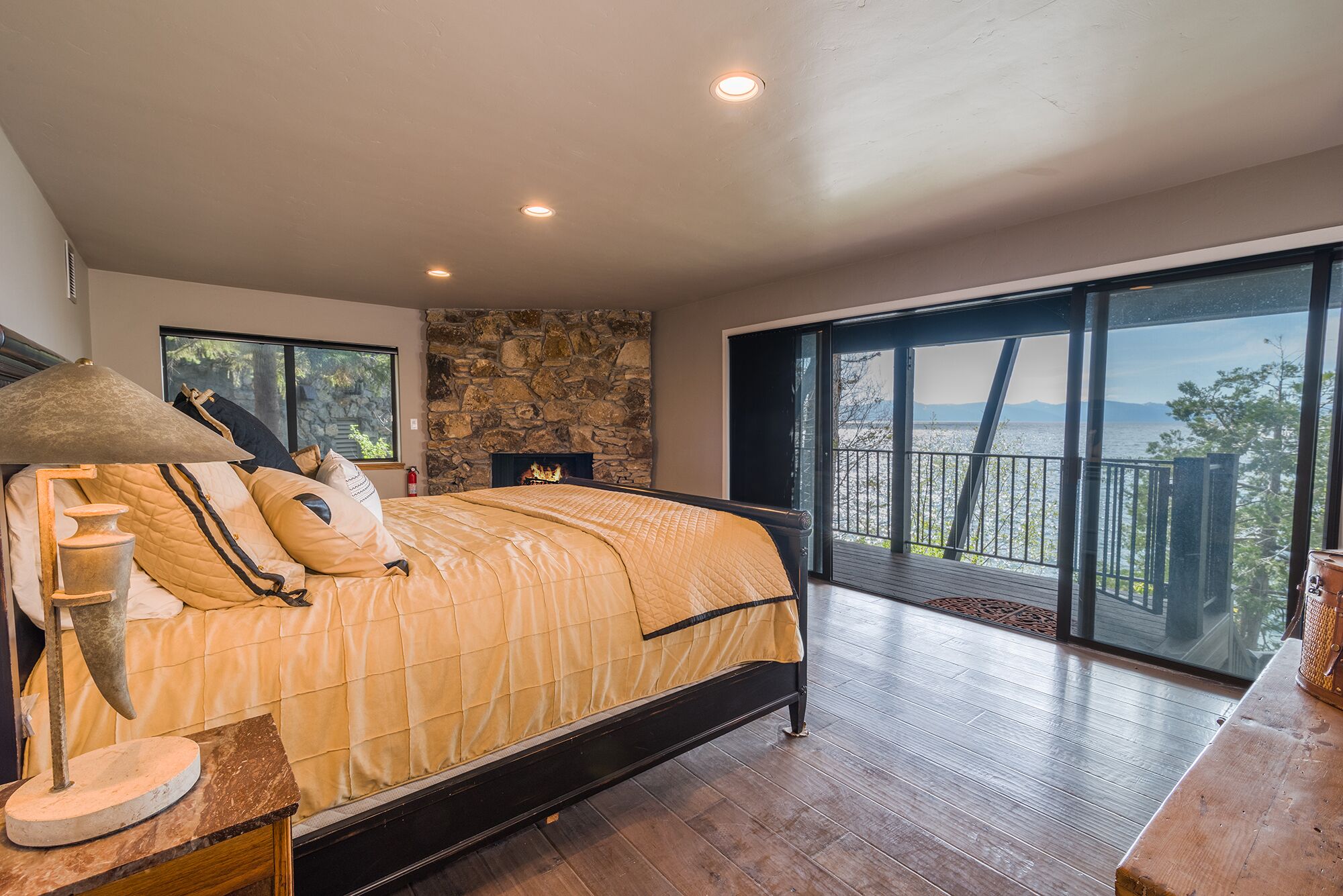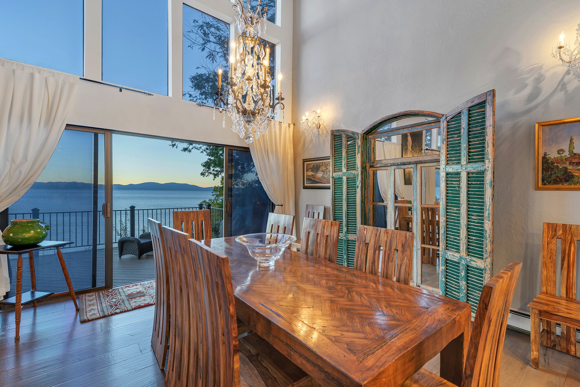 Beautiful Lakefront Home with Pier and Buoy. Max. Night occupancy 8 VIlla de Lago, The Lake House, is located in a secluded enclave north of historic Cave Rock Nevada. Nestled in pines that sweep down through the riparian shrubbery from the home to the properties private pier and buoy. Whether by day or night the lighted staircase will carry you to the magic of the bouldered shoreline where you can spend your time relaxing to the sound of the waves and Tahoe’s ever changing panorama or take a dip from off the pier and swim in waters as clear and brilliant as our skys.De Lago, brings the outside in with expansive windows that reach from floor to ceiling and doors that sweep open to bring the lakes vistas in uninterrupted to our second living and dining area on the deck above the always playful waters of Lake Tahoe.De Lago’s décor is rich in eclecticism with antiques, comfortable furnishings and beds; appointments and original art that show cased by stunning vintage chandeliers. , We like to think it’s fun, cozy, comfortable and smart with a deference to the traditions of lake nostalgia that will give you memories and stories to last a lifetime.FireplacesThe predominant feature of the main hall is the floor to ceiling fireplace in the living room. With an oversized wood burning firebox capable of keeping you in the mood during your escape with logs up to 30 inch. All the irons are hand wrought and oversized to accommodate large logs. A plentiful supply of firewood for your stay is complimentary. The master suite fireplace is gas log and can be operated by remote allowing for the convenience of instantaneous warmth and glow.Great Hall The main hall is an open split level floor plan allowing guests to share in all the homes main entertaining activities; cooking, dining, sitting and reading area, television and a powder room on top of beautiful hardwood floors, and carpets and unique and comfortable furnishings. The main deck is accessed off both the living and dining areas through large 6 foot glass doors in between wall to wall and floor to ceiling windows. Dining accommodates 8 plus 3 at the counter, Living room accommodates 6 on the sofas plus 2 on the leather ottomans and many more on the large stone hearth. The reading area accommodates 2 with leather chaise lounges.Main deckThe main deck is accessed off the living and dining areas through sweeping doors. Lounging area seats 8 on sofas and ottomans and the dining area seats 8 at one table and of course there are panoramic lake views and a bbq. Access to the dock is off a stair case from the main deck down through trees and shrubs with subtle stair lighting. Outdoor gas fireplace on deck.Master Suite and BathThe lake view master suite is one floor lower than the main hall and is secluded from the rest of the home. King size sleigh bed, chaise lounge next to the fireplace, hardwood floors and carpets, large wall to wall windows that access the lower deck, and stairs that pass to the dock and upper deck. The master bath is generous and airy with double vanities and a dry sauna, lake views from the double sized double zone shower and tub. Upstairs BedroomsBoth upstairs bedrooms have queen beds with luxury linens and bedding and you will enjoy Lakeview’s from either choice. Both bedrooms are furnished with antiques and modern appointments. The bathroom is shared. The game room loft is accessible on the same level as the bedrooms.Loft The loft is directly above and behind the main hall and has lake views on par with the main hall. Pool table and bar stools seating for fun & relaxing. Unique decorations and art. Bonus fourth bedroom.A private bedroom accessed off the garage thru an entrance and stairway. Bedroom with King bed, French doors with view of Tahoe, leading to the outdoors. Work space, oversized cozy chair and ottoman, and Large Screen TV. Bathroom is shared and located upstairs in loft.The Dock and Boating FacilitiesThe wood dock is approximately 100 feet long above a beautiful bouldered bottom. The boat lift is not accessible to guests but the 15,000 pound boat capacity buoy is as well as tie up to the dock. The boating closet houses a refrigerator and ice chests for your convenience and leisure on the lake. kayak's & paddle boards available for guest use. Some life preservers available. Best practice for life preserver bring your own for proper fit or rent.At a Glance:Lakefront Home with private dock and buoy.Inside:4 Bedrooms (sleeps 8) all lake view. 2 ½ Baths.Dining for 8 plus 3 at counter.Hardwood, tile and carpet floors.2 Large screen Televisions, 1 in the living room and 1 in the 4th bedroom. Roku accessible and WI-FiFully equipped kitchen.3 Fireplaces, 1 wood Main Hall and 2 gas log in master bedroom and Outside deck, complimentary fire wood for your stay.Loft with pool table views to the Lake . Dry sauna.Linens and towels provided. washer/dryer.Outside:Boating facilities, 15,000 lb boat capacity, kayaks, 2 paddle board . Boating closet with refrigerator.Dramatic Exterior lighting.2 Decks, lounging for 8 dining for 8, tea table off lower deck and BBQ on main deck.Bear box for garbage.Swimming, fishing off dock.Parking for 4 vehicles, 2 car heated garage. Restrictions:No occupancy greater than 8 people is allowed. The home is equipped with one video camera on the driveway without sound. The home also has an inside and outside noise aware system that does not record conversations but monitors decibel levels to keep the property in compliance with Douglas County noise ordinances.Quiet time after 9 PM till 8 AM, including no Jacuzzi use.Extreme caution when pulling off of or onto highway 50.No smoking on propertyMinimum age required for reservation booking (25)Parking for 4 vehicles 2 in garage and 2 in driveway.No parking on street at any time. Strictly enforced.Shoes must be worn on dock at all times.Children must be supervised at all times.Swim at your own risk. Use water sports equipment at your own risk. No lifeg