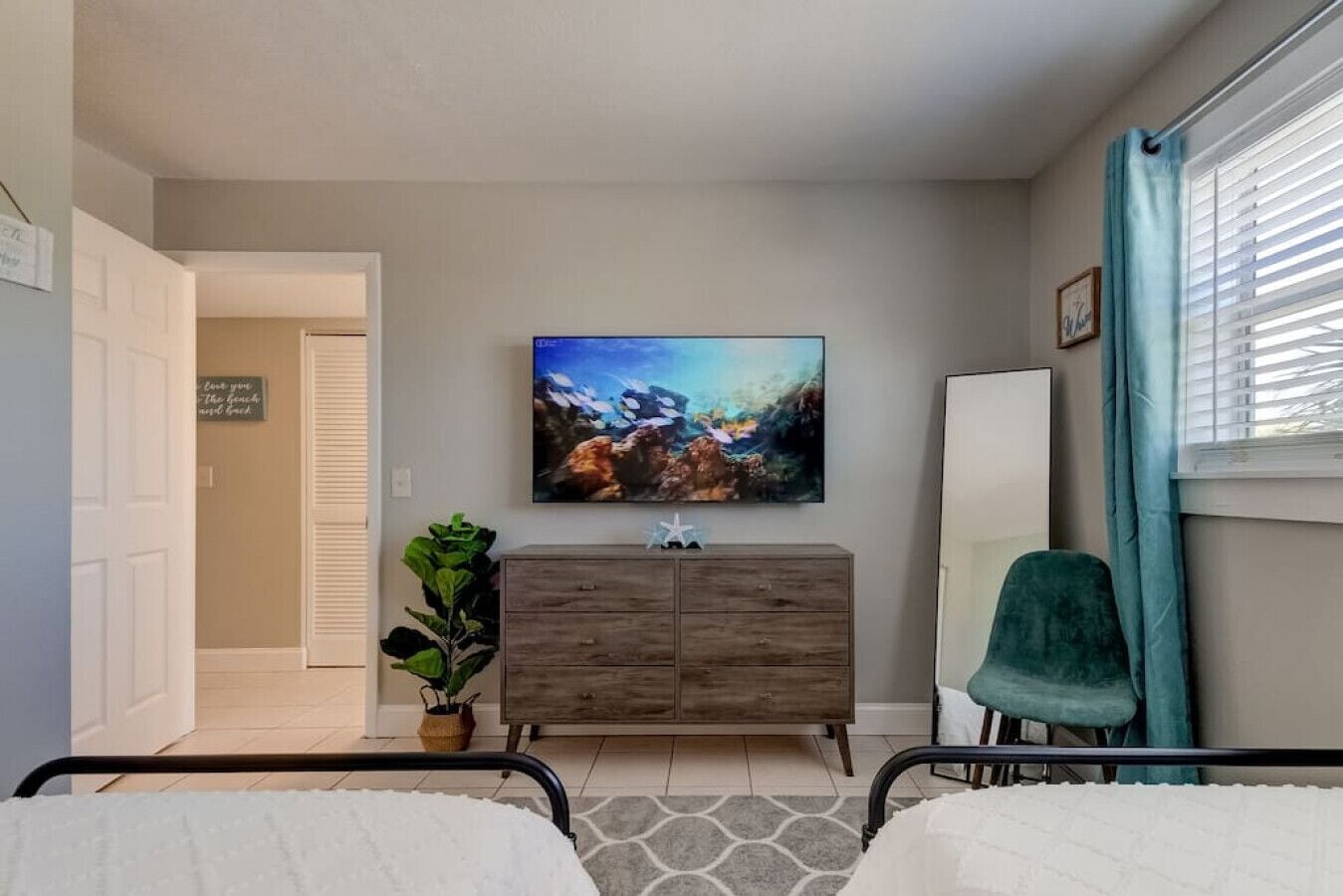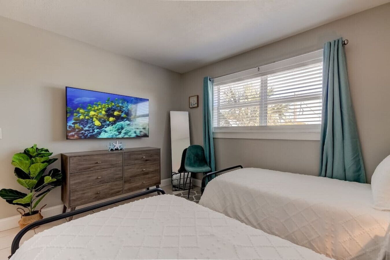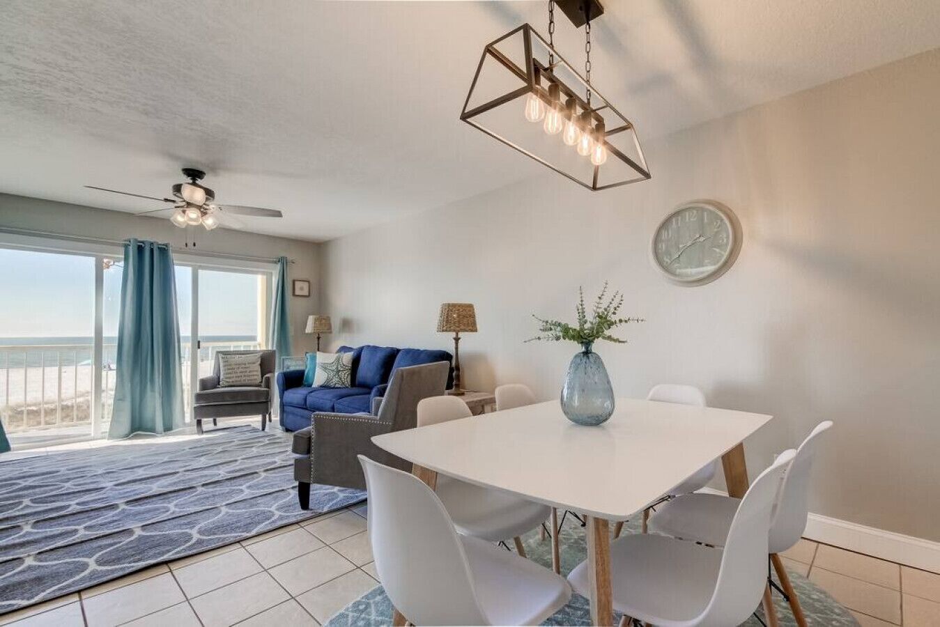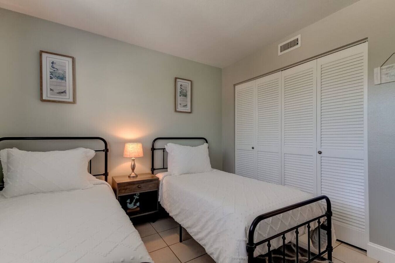 #5- KING BED! Remodeled 2 BR-Directly on the sand! Beautifully Renovated beachfront condo, located directly on beautiful North Clearwater Beach! Unit is located on the 2nd level with gorgeous views of the Gulf of Mexico. 2 Bedrooms, 2 bathrooms with a private balcony overlooking the beach. Sleeps 7 with the trundle & Pull-out couch. WiFi included, Smart TV's, beach chairs, towels, toys, etc. Just bring yourselves and you are ready to go! Fully equipped full-sized kitchen with enough supplies to get you started.Washer & Dryer included in unit. Check-out is 10am. Front bedroom has 2 twin beds with 1 twin trundle bed. The Master Bedroom has a King sized bed. The couch has a Queen Size pull-out bed. One Free parking spot included per unit. Guest parking available upon request. There is a pack n' play & a highchair for little ones. Being able to climb stairs is a must. There is NO elevator there.Full access to entire condo other than one locked supply closet.Residential area on the North end of World Famous Clearwater Beach! Short walk to restaurants & bars but far enough away from the busy part of the beach to enjoy the peace & quiet!Golf Cart Rentals available, Jolley Trolley, Uber, Lyft, Taxi, etc.This condo is located on the Second level (2nd floor, because ground floor is parking) and being able to climb stairs is a must. There is no elevator. Please note, Florida has a lot of different types of possible annoyances (or features!) that are out of our control- Like excessive seaweed, red-tide, Lovebug season, mosquitoes, bugs, etc. Please have patience & understanding for any possible issues we have to work through. I will always do my best to make your trip the best it can be! If there is anything that I'm aware of before your stay, I will certainly let you know ahead of time.