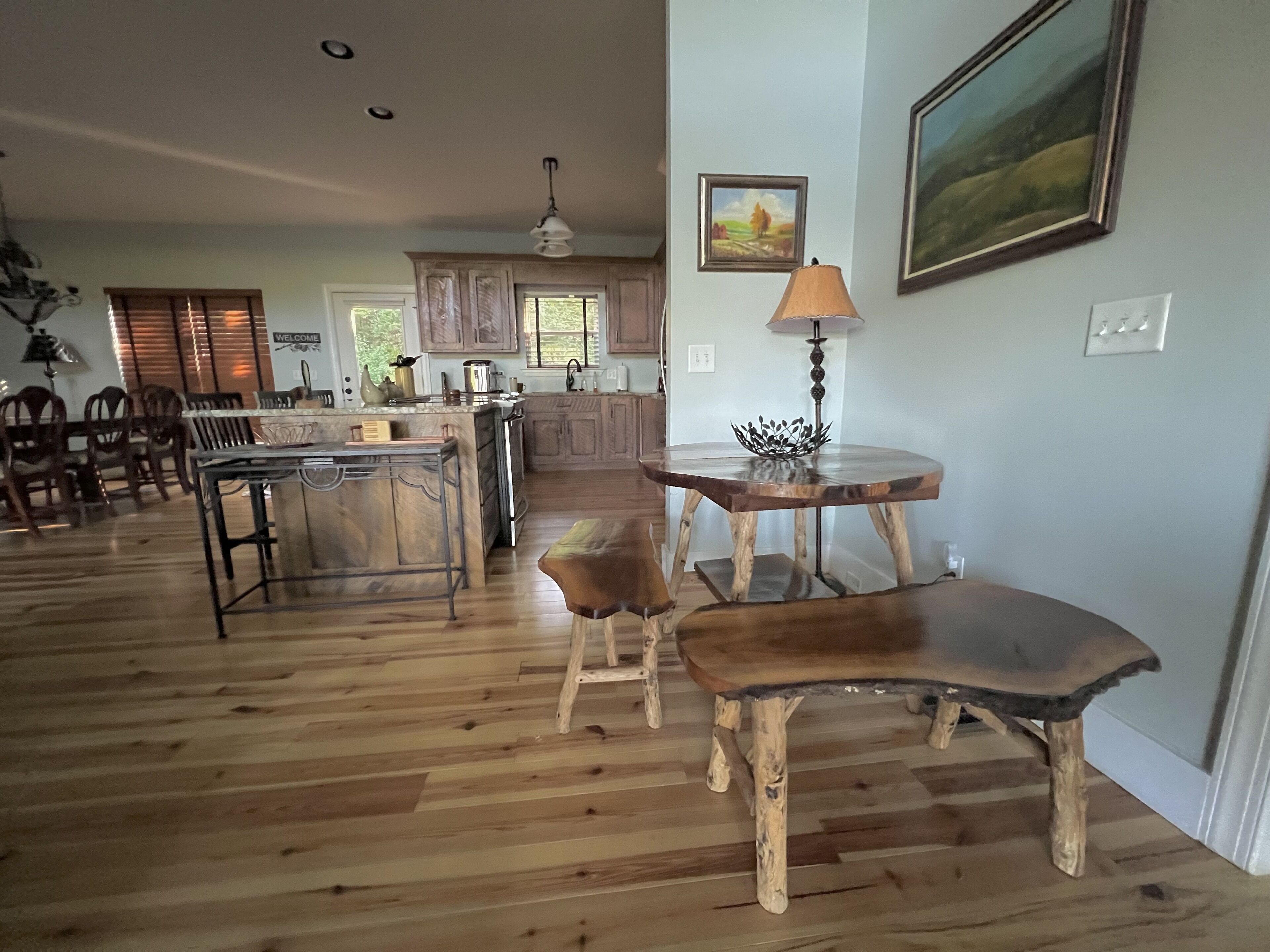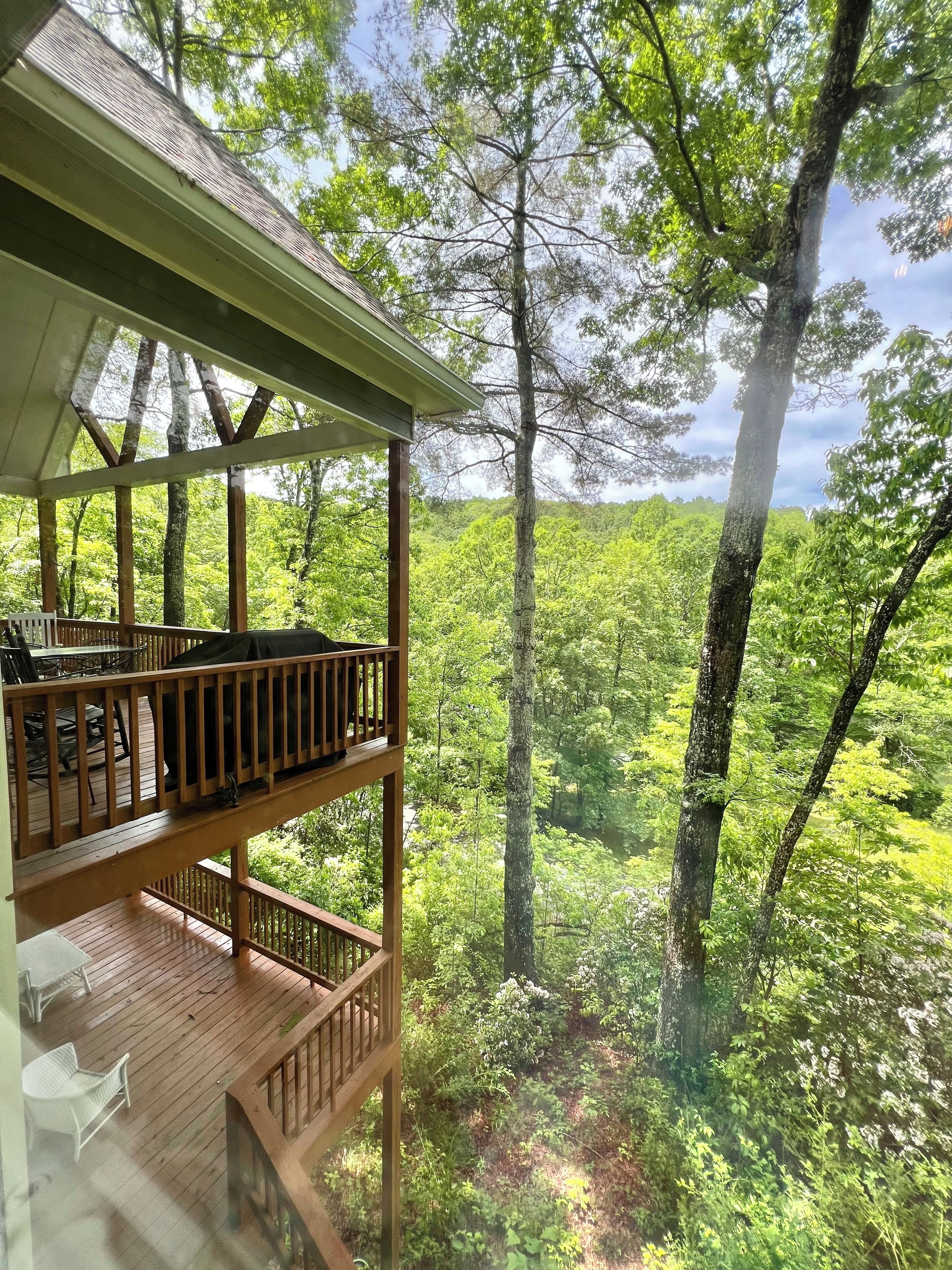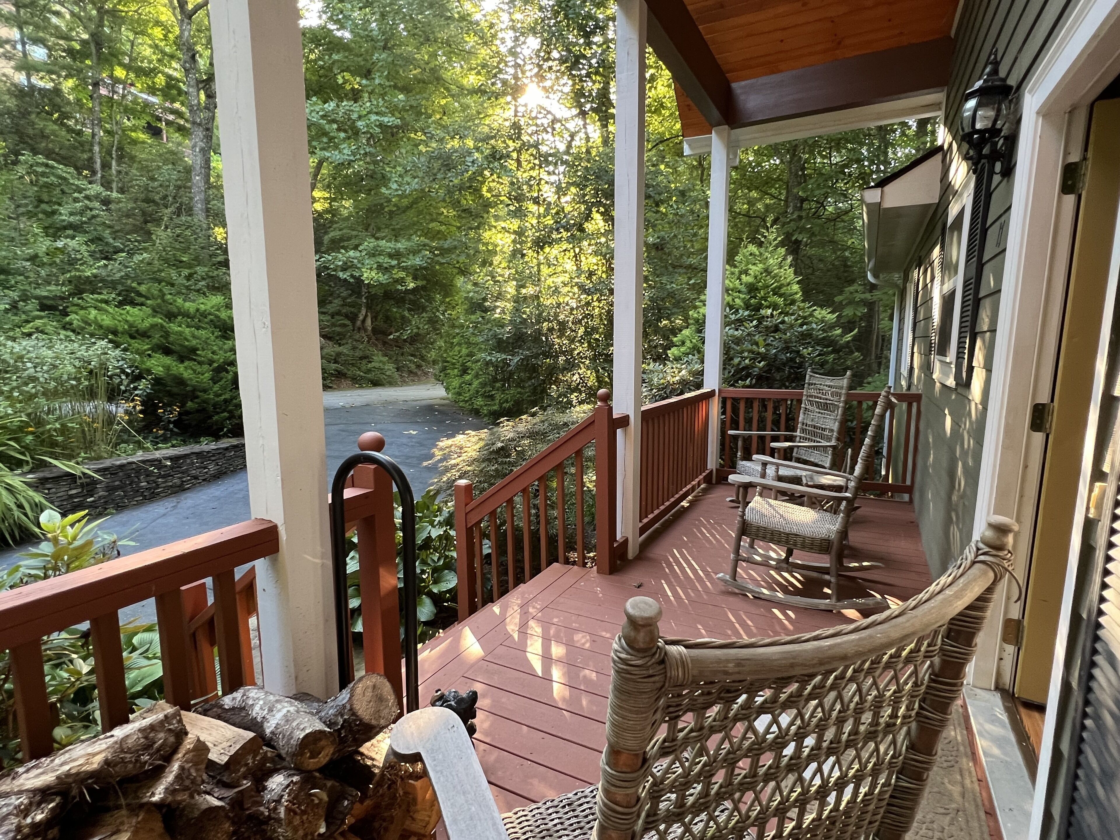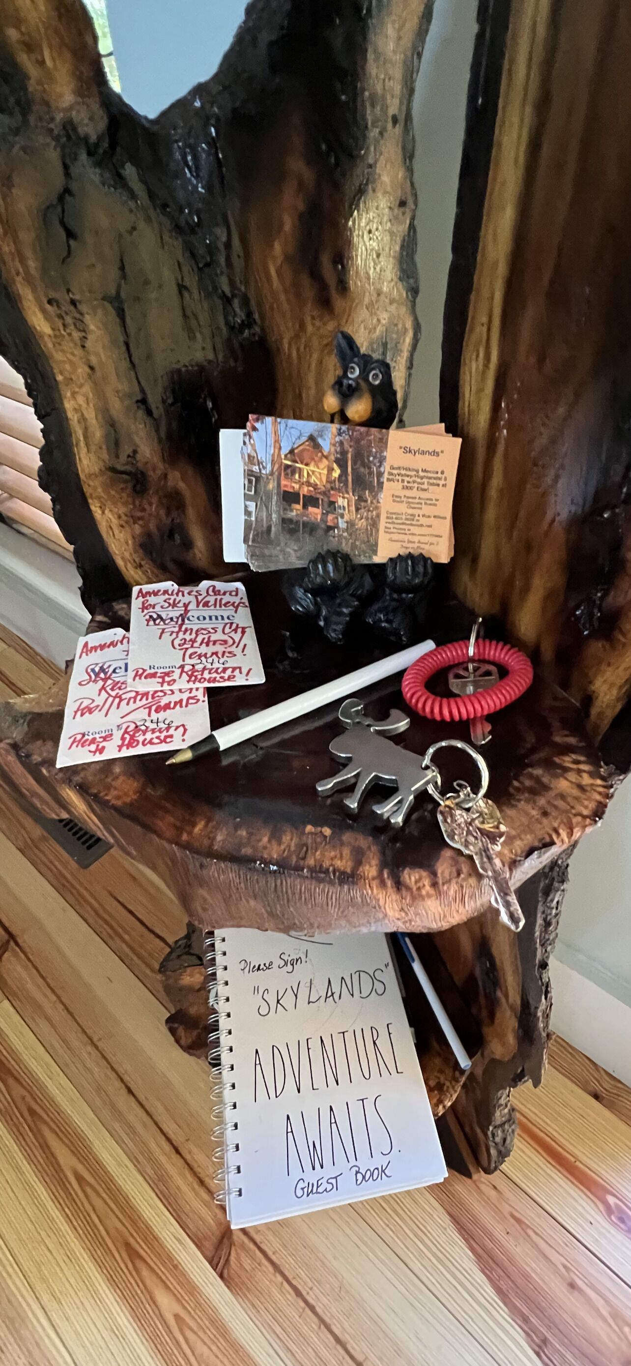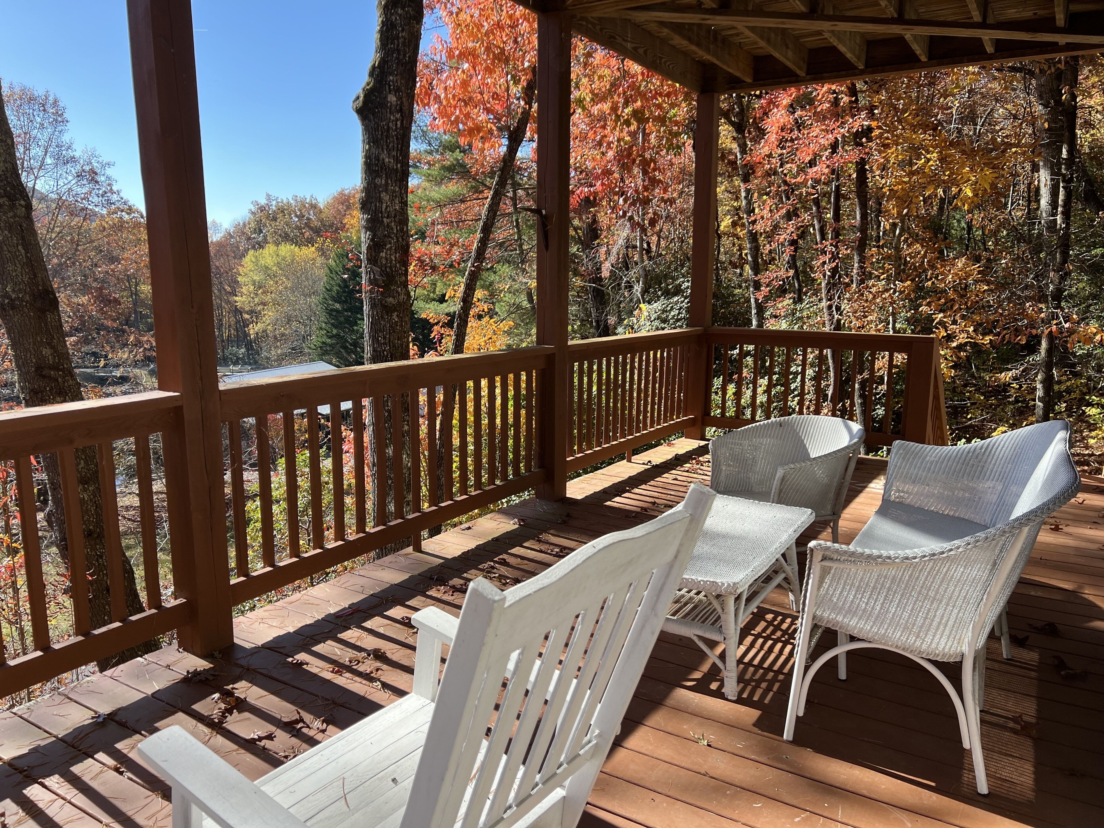 Cozy Fall/Holiday Gathering @ Sky Valley>Highlands Hub! 5BR/4Bs+Pool Table/More! “Skylands" is the perfect place on the Georgia/North Carolina line high up on the Highlands Plateau at 3300' elevation to gather your flock of family or friends for a retreat or to enjoy while you work remotely! Room for 12 max occupancy per county rules, but cozy for just two of you, too. Our high-speed wifi will cover all your needs! We offer 8% off for 7 or more nights and 16% off for 28 or more! There's plenty of space with 5 bedrooms (including 2 masters) and 4 baths over two levels, with covered porches main and lower levels. Pool table and ping pong tables in 2 separate game rooms! Extra den lower level as well. Laundry on main level! Easy access from road to driveway to front door! Skylands is totally non-smoking, and the neighborhood environment is quiet and peaceful. We do not allow pets, and we expect all guests to respect our neighbors insofar as noise/music any time, and rear floodlights after 9 pm. This is truly a paradise where you will hear birds singing and occasional chapel bells chiming! People make multi-generational memories coming year after year due to its location, amenities, and 3300-foot elevation on the "Highlands Plateau" near multiple national and state parks and countless things to do! Skylands' upscale rustic charm exudes as you approach the front door with extension of the house's 20+ foot gable over the front porch, with tongue-in-groove pine ceiling. Once inside the door, you're treated to the grand sight of the huge vaulted great room with massive stone wood-burning fireplace, our well-appointed kitchen with granite-topped custom island and cabinetry created from circle-milled pine, a convenient pantry, stainless steel appliances, heart-of-pine flooring main level, updated bathroom vanities with granite and vessel sinks, local-craftsman-made Appalachian mountain log beds of cedar, pine, hickory and laurel, PEX plumbing, new HVAC, and so much more! The focal point of the lower level game room is an 8-foot oak pool table surrounded by a sassafras and sourwood pub table and hickory stools as well as two large comfy chairs with bear/trout motif and carved bear/trout arms! Nearby is the "ping pong room" with new professional-grade table! The adjoining lower den offers more rustic comfy seating with a drop-leaf table for cards, a board game, or puzzle. There are Roku-smart TV's both levels to connect all your streaming services...next to the fireplace main level and lower level on top of an antique wagon wheel table with old barn wood top. Skylands is within walking distance to the beautiful Sky Valley Resort, including its excellent and beautiful golf course (or an easy 5-minute drive). Our guests enjoy free access to its amenities: exterior heated pool and hot tub, tennis/pickleball courts, and a fitness center open 8 am to 9 pm with sauna and an interior hot tub and locker rooms! There is also a playground for your little ones! Going northeast, Skylands is literally blocks from the trail head to Georgia's 2nd highest peak, Rabun Bald. Jump the GA/NC line, and drive less than 20 minutes to Main Street in Highlands for all its charm, incredible restaurants, shops, and more! Head southwest 10 minutes for Dillard, 20 to Clayton's shops and restaurants and Lakes Burton and Rabun! Skylands is central to so many choices for a long weekend or week or more - any time of year!As for the house itself, both the main and lower levels open to covered porches with the vaulted main level porch offering a gas grill and outdoor dining area. The porches have a south/southwestern view, overlooking a beautiful small lake and the surrounding mountains. No matter the season, the porches are perfect for perching, breathing the fresh air, enjoying the year-round views, and listening to the sounds of birds and distant church chimes! All five Skylands' bedrooms feature rustic log or solid-wood beds, all with heart pine or luxury vinyl plank flooring - no yucky carpet! "Cedar," Skylands' master bedroom (king-sized cedar log bed) is on the main level with a view of the massive great room fireplace from bed! Its windows overlook the lake and mountains. It has an adjoining large private bath with garden tub and shower, double vanity, separate toilet room and walk-in closet. Two other main level bedrooms are on other side of great room with a hall bath. "Pinecones" has a queen-sized forged-iron and wood bed with pinecones & pine branches motif. Its windows overlook the lake and mountains. The main level 3rd bedroom now boasts a hickory log queen bed! "Pinecones" and "Hickory" share a full hall bath. Also nearby is the laundry room with a washer and dryer for your use if you need them. The central great room on the main level includes an ample formal dining area with tiger-mahogany table and 8 chairs, the updated kitchen and new circle-milled pine island with stools, and generous seating options. The fireplace and porch view provide great ambiance whether inside or out. A black walnut game table with live-edge benches provides more dining or game table options. Best of all, relax and visit..."perch"! Interior pine stairs lead down to the lower level with its central game room as described above, with an 8-foot oak pool table, and a den between 2 bedrooms and 2 baths. The lower level porch has an exterior egress to the ground level. Essentially, the lower level has a 2nd king-size master we call "Laurel" (pine logs with laurel accents) with adjoining bath and on the opposite side of the lower level is the "Pine Bunks" bedroom, with now 2 sets of whimsical pine log bunk beds! One is twin over full and other is twin over twin! "Pine Bunks" shares Skylands' 4th full bath with the den and game room.Skylands is situated on 4 wooded lots - very private! Listen for the multitude of birds and other sounds of nature. It's why we have used the word "perch" as a verb...it's a restful, peaceful setting yet so close to s