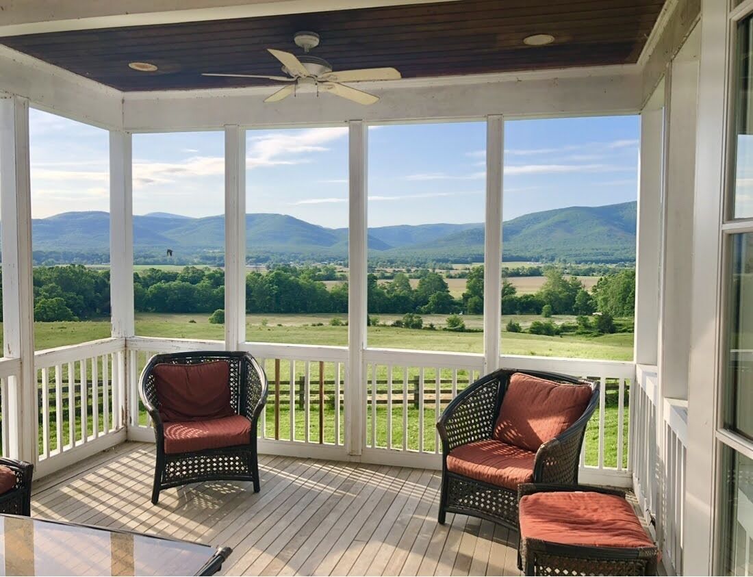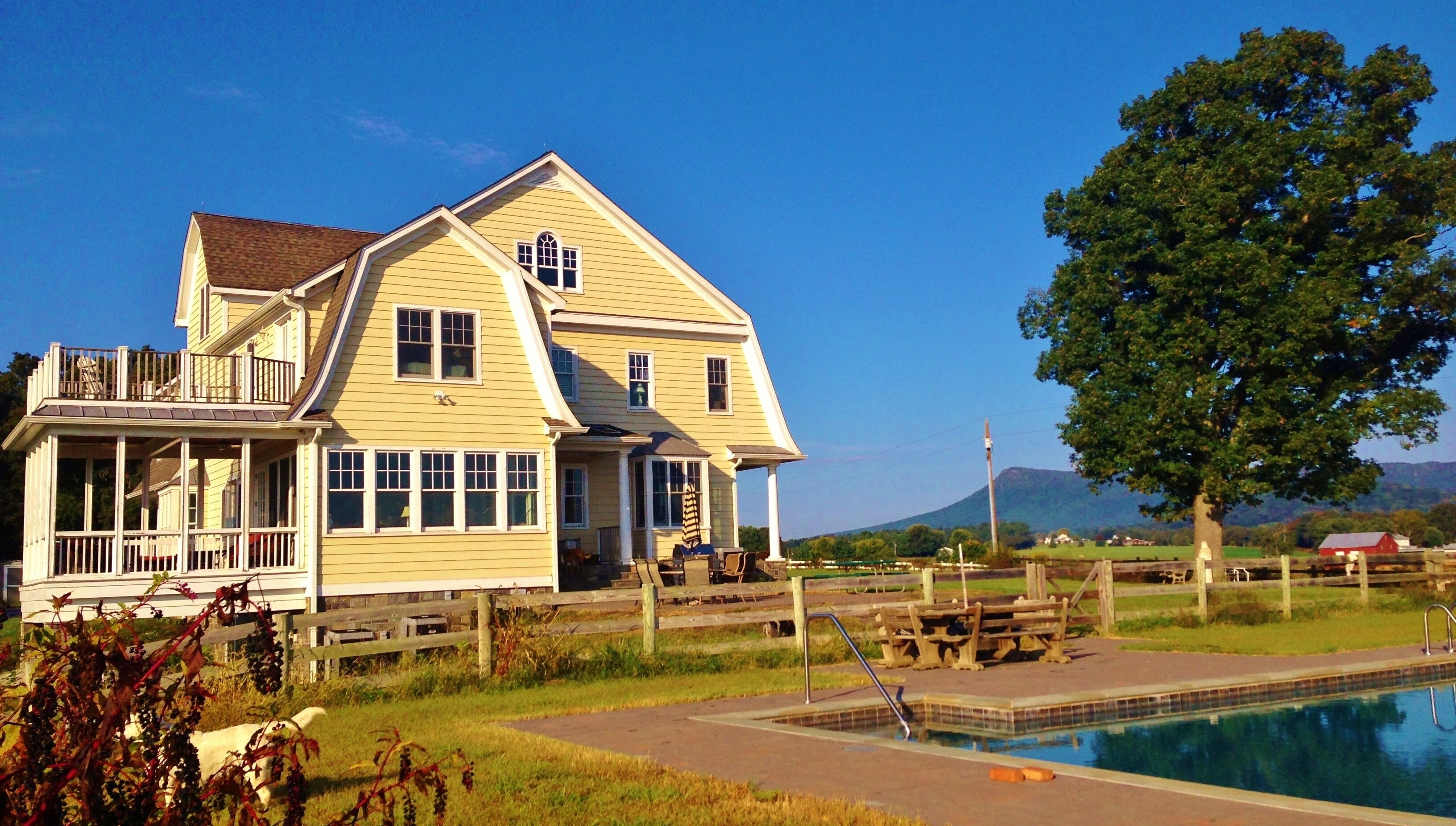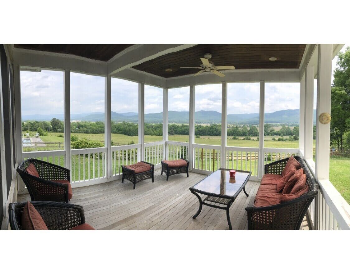 Expansive View Of The Blue Ridge Mountains, The Valley And The Shenandoah River Our home sits on 43 acres and has 77 windows for you to witness the breathtaking views of the Shenandoah Valley, enjoy the expansive view of Massanutten, the Shenandoah River and the Blue Ridge Mountains! The yard is equipped with a gunite pool and hot tub* plus horses and cows grazing in the pasture. There are four levels of living space - the main floor, 2nd floor, walk out finished basement and a beautiful open staircase that leads to the huge attic that can sleep extra! Our home has 5 Bedrooms, 3.5 bath, Large Kitchen with 48” Viking stove, Dining area, Large Den w/ Gorgeous Stone Fire Place, Parlor with a Piano & 5 porches! The first floor and basement have 10' ceilings and the 2nd floor has 9' ceilings.We moved to the beautiful Shenandoah Valley and built this home to raise our children. We designed it so that all of our family and friends could come and visit any time and stay with us. It's such a peaceful, private place to take in the beautiful scenery and spend time with your family & friends. The spacious living areas give you space to gather all together or find a quiet room to read a book and relax. The outdoors come to life here while walking down the country road behind our home along the Shenandoah River or the country road in front of our home viewing the mountains and pastures. You can relax by the pool and hot tub or sit out on one of our 5 porches/decks. Wherever you sit or look there is an abundance of beauty. We love to watch the moon come over the mountains or the sun set behind them. Every day is a different picture to see - the foliage in the fall, the clouds against the mountains, the stars like you've never seen them before but best of all the laughter and joy when family and friends are gathered! Anyone who visits or stays can't wait to come back. We have been told it's like a slice of heaven, a retreat, a place you never want to leave.It is conveniently located to everything! We are 1 mile from Massanutten Resort (water park, golfing, horseback riding, miniature golf, skiing, tubing, snowboarding, ice skating), 10 minutes from James Madison University, 10 minutes from Harrisonburg, 15 minutes from The Shenandoah National Park (great hiking trails) , 40 minutes from Charlottesville (UVA), 25 minutes from Luray caverns & 35 minutes from Stuanton (Black Friar Theater). Along with all those wonderful options there is canoeing, river tubing, winery's, antiquing, Fishing, hunting (depending on the season), biking, etc... *The hot tub and pool are seasonal. It is opened April thru September and weather permitted we try to extend that period of time.