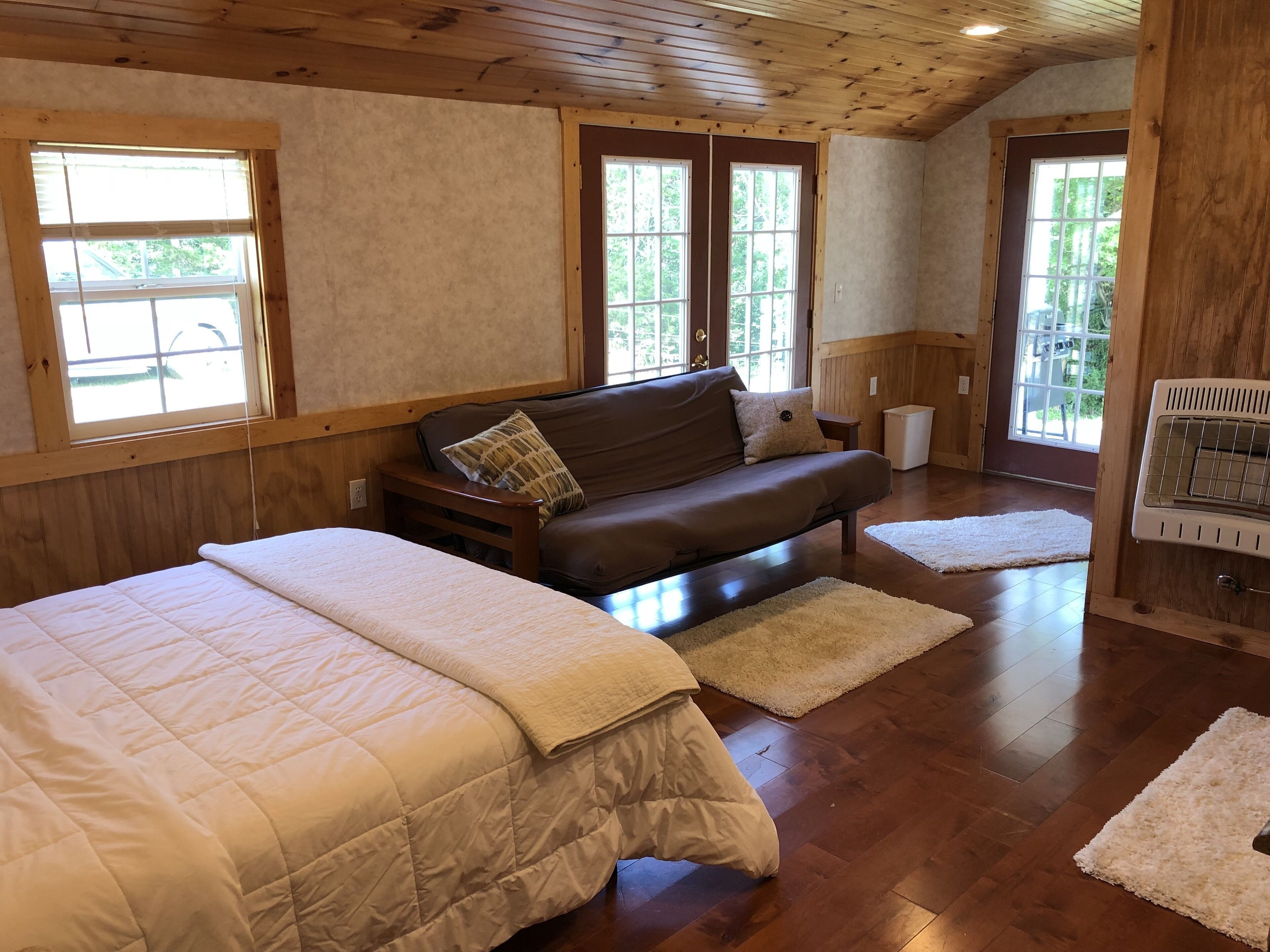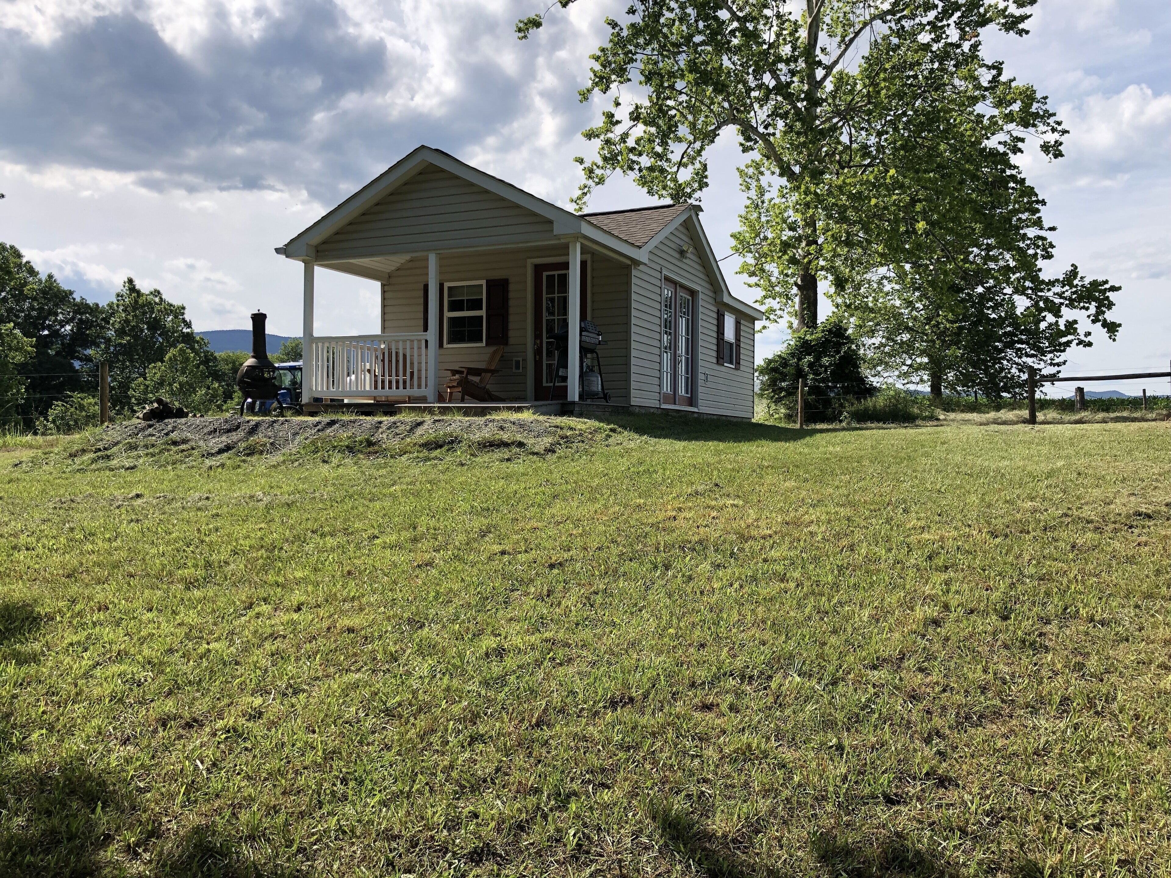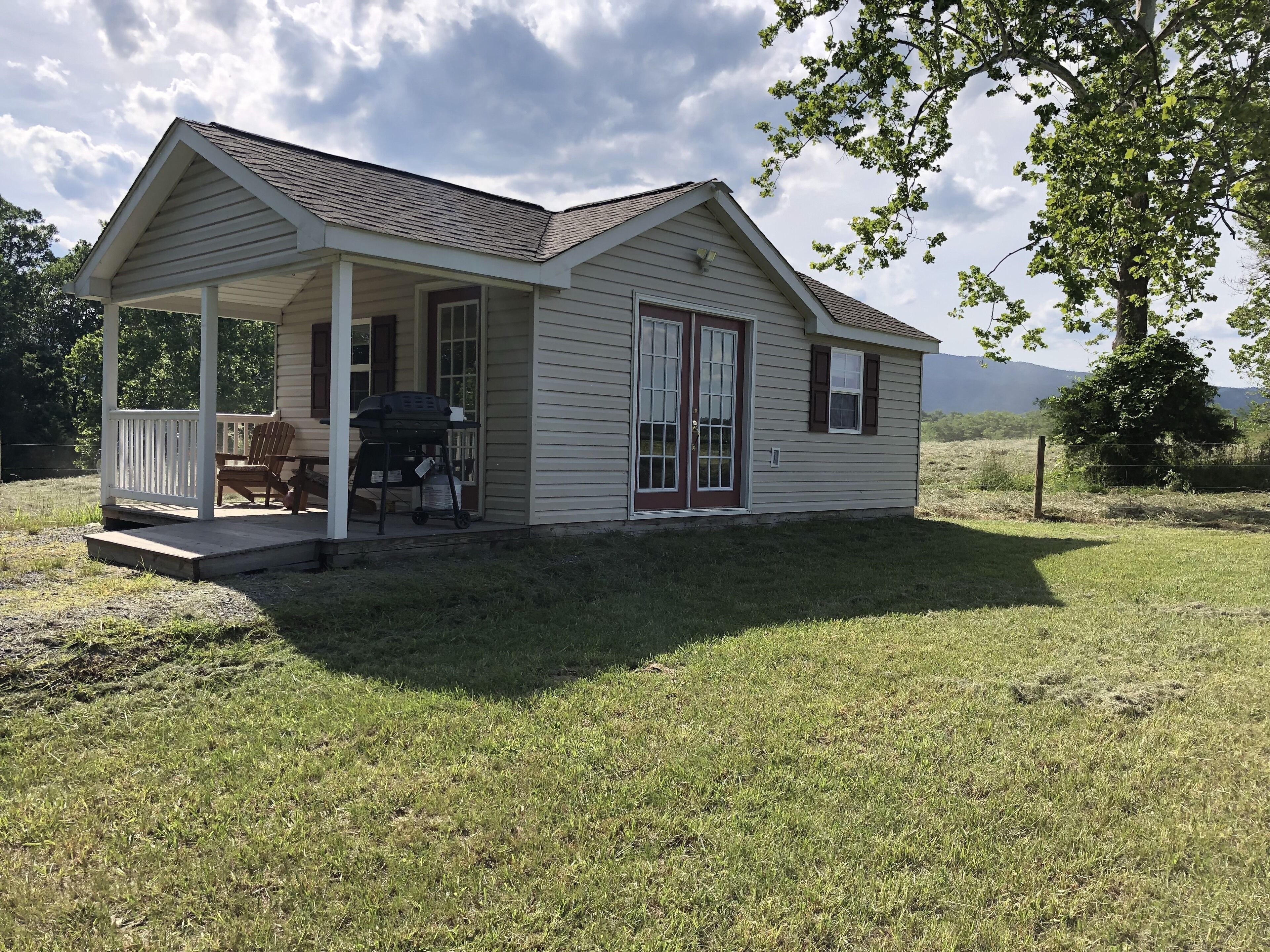 Rivergreen Cottage-"Off The Grid"-WALK TO RIVER!! Solar Powered! Leave the complexities of modern life at home and enjoy the simplicity that our off the grid Rivergreen Cottage has to offer. Rivergreen is the perfect getaway for those who like camping, but wish for a more luxurious, comfortable place to stay. This cabin is now solar powered with a touch free standby generator! Water is provided from the new onsite well, and hot water is heated using propane. There is wi-fi and a TV with local channels. (Please note that this TV antenna only provides 6-8 local channels. There is no cable TV in this cabin.) The river is just a short walk away! Perfect space for 2 people. If you don't mind tight quarters, the cabin could accommodate a maximum of 4 people. Kitchen: Rivergreen has a small cooktop, mini-fridge, sink, coffee pot, cookware, dishware, soap and kitchen linens. Living/Sleeping Space: Queen bed, and a full futon. Pillows are provided.Bathroom: The bathroom has a stand up shower , sink and composting toilet. This toilet is a water-less system. Please pay close attention to the instructions. Additional Amenities: Gas grill, AC , wall heater, covered porch and private fire pit.This cottage sits away from it all on a hill top in the middle of a field on a working farm. If you plan on bringing your pets (2 pet maximum) please make sure that you select pets when making your reservation. Note that pets other than dogs will need approval before booking.