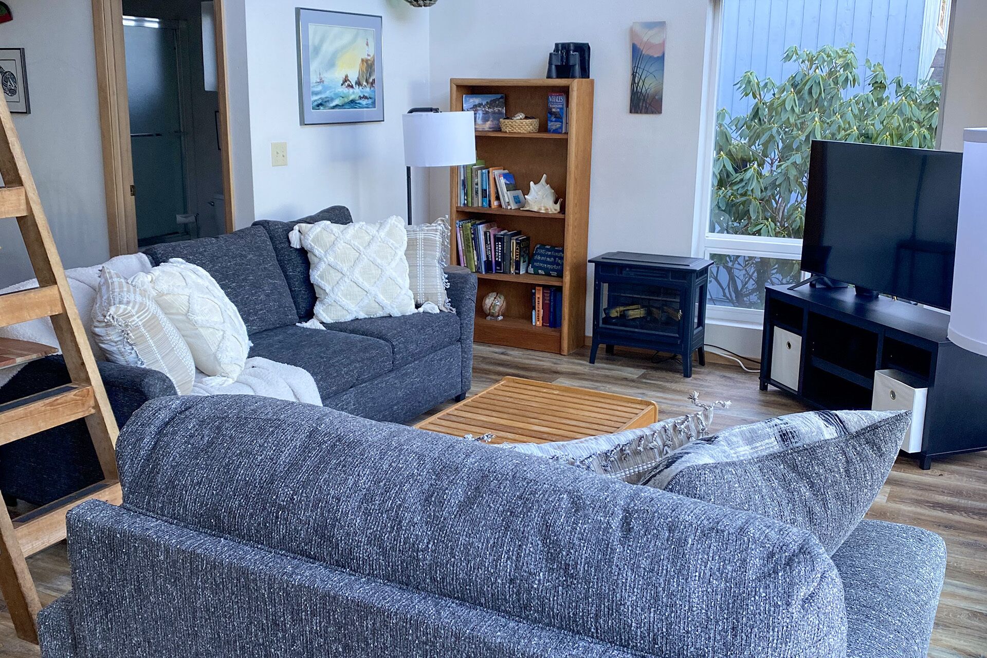 Ocean View in Yachats! 30+ Night Stays! Dog Friendly! Ya-Hut is your hut away from home! Nestled in the trees on a hill in Yachats, this house is surrounded by the quiet serenity of the forest, while still being close enough to the ocean to hear and see the sea! This cute home has an open concept with vaulted ceiling reaching up to a lofted bedroom. Each area flows into the other, while still being cozy and close, so the whole family can enjoy vacation together even if they are enjoying different activities. One family member can cook in the kitchen, another can watch their favorite TV show or movie while another looks for whales from the ocean view living room, loft or deck. This home is perfect to enjoy an extended vacation of 30 plus nights. The living area has a comfy couch and several chairs; plenty of room for your group to gather around. It's your choice whether to watch TV, curl up with one of the many books provided, or just stare out at the amazing ocean view from the expansive westward facing windows. Enjoy the electric fireplace when the sun goes down and the night gets chilly! The kitchen has plenty to get the chef in the family started on making a delicious meal. With plenty of counter space and all the cookware you could need, you can enjoy a simple meal or get the group together to collaborate on cooking! The dining area is central to the home; the perfect spot to get everyone in the same place to enjoy dinner together after a day of adventuring around town and soaking up the salty air. On the main floor you will find a large, roomy bedroom with a queen bed, a TV and fun ocean decor. To the left of this bedroom is a small, cozy bedroom with a full bed and fantastic local art. Ya-Hut has one bathroom centrally located on the main floor. The loft above the main floor highlights the unique vaulted ceilings. Climb the ladder to get a bird's eye view of the town of Yachats and the ocean in the distance before you settle in to sleep in the queen bed. Need to accomplish some work? Sit down at the loft's large desk and dedicated workspace. The front deck is a great place to take in the view, as well as the sounds and sights of the dense Oregon forest land. Take a walk from the deck through lush pines, ferns and flowers, and end up on the street that will lead you to the cute, artsy village of Yachats. Take time to explore the shops, restaurants, galleries and ocean beaches. Ya-Hut is your hub for your next extended beach town adventure. **Guests are required to make a Security Deposit (included in the total of your reservation) to protect against any damages to and/or loss of items from the Property. The deposit will be held in Sweet Homes Vacation Getaways Client Trust Account and will be returned, minus deductions, not later than 14 calendar days after the termination of the agreement. We will provide a written statement at that time explaining any deductions. Sleeps up to 6 - 2 Bedrooms + Loft, 2 Queen beds, 1 Full, 1 Queen sofa sleeper; 1 Bath.Vehicles: Licensed for 3 (Strictly enforced)*Each home is individually owned. Amenities and furnishings are subject to change at any time. Please contact our office with any questions.This home does not allow cat guests or other non-human, non-canine visitors. Dogs are welcome at this home but must be registered in advance and paid prior to arrival. This home has a 2-dog maximum occupancy! Pet Guests: One time $35+tax fee per dog. Pet fees are not included in the original reservation. Age Requirement: The primary registered guest must be at least 26 years of age. The majority of guests must be over 25, or children under adult supervision.