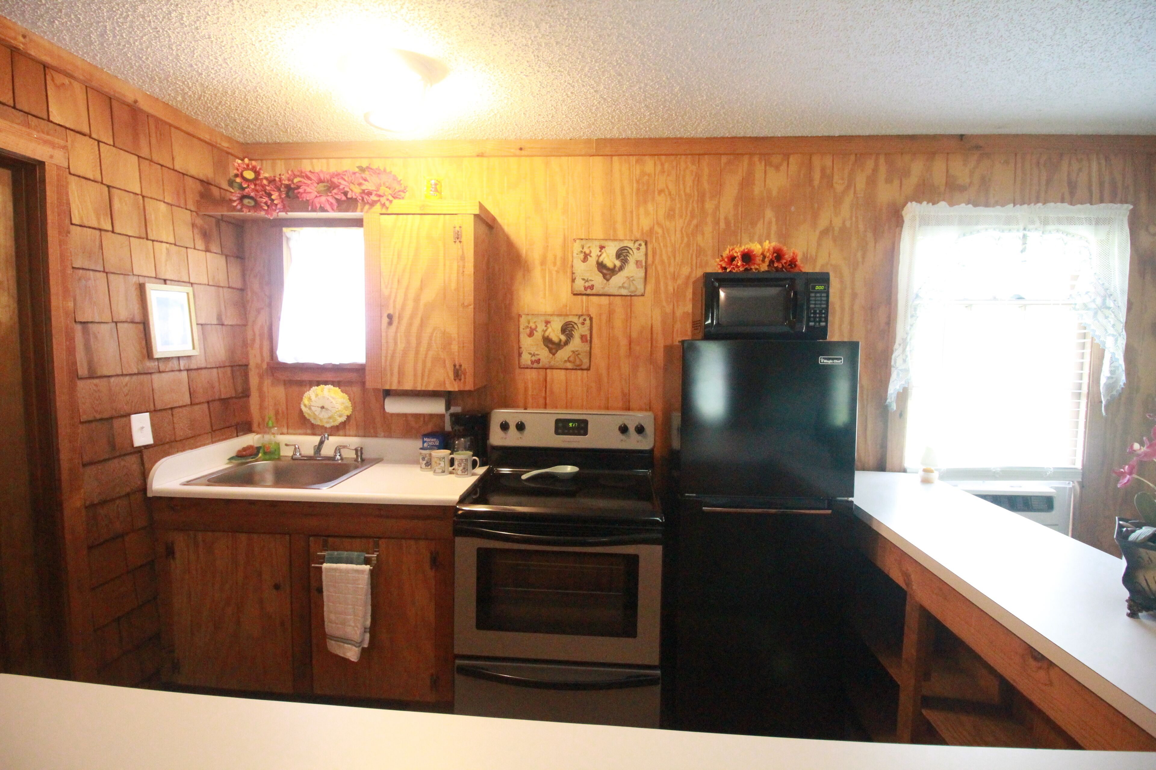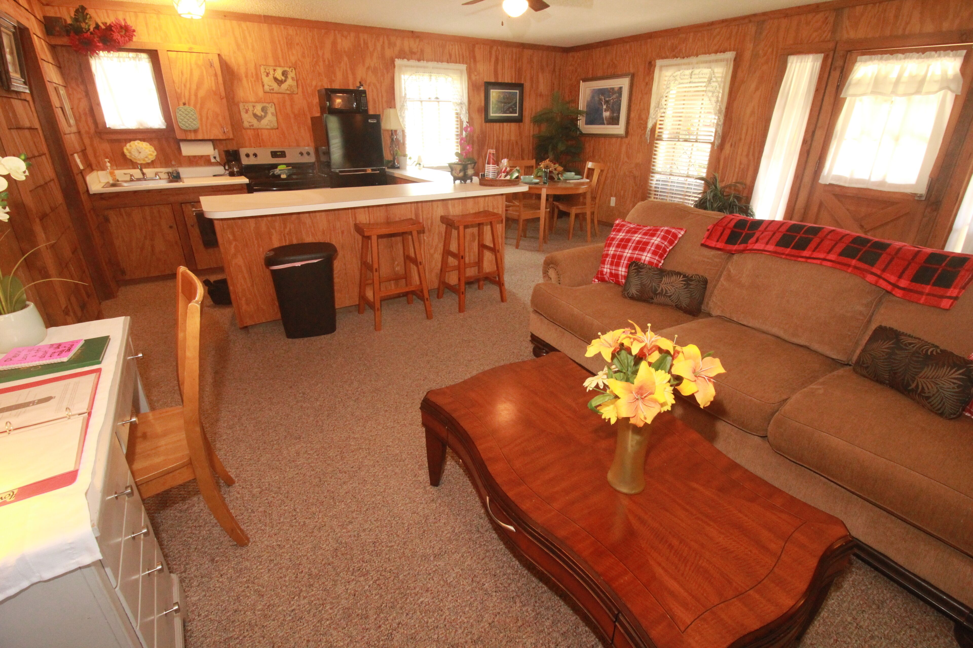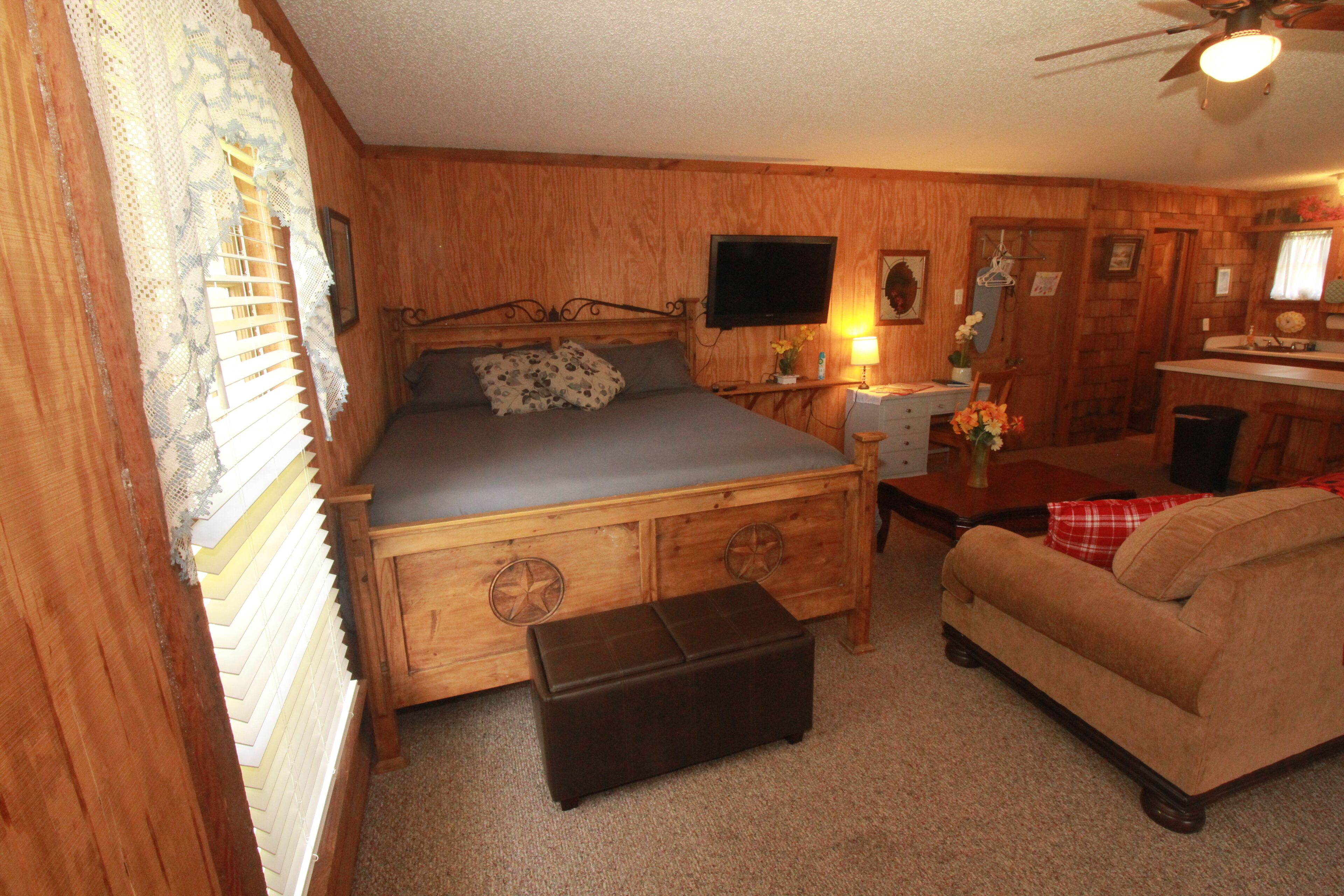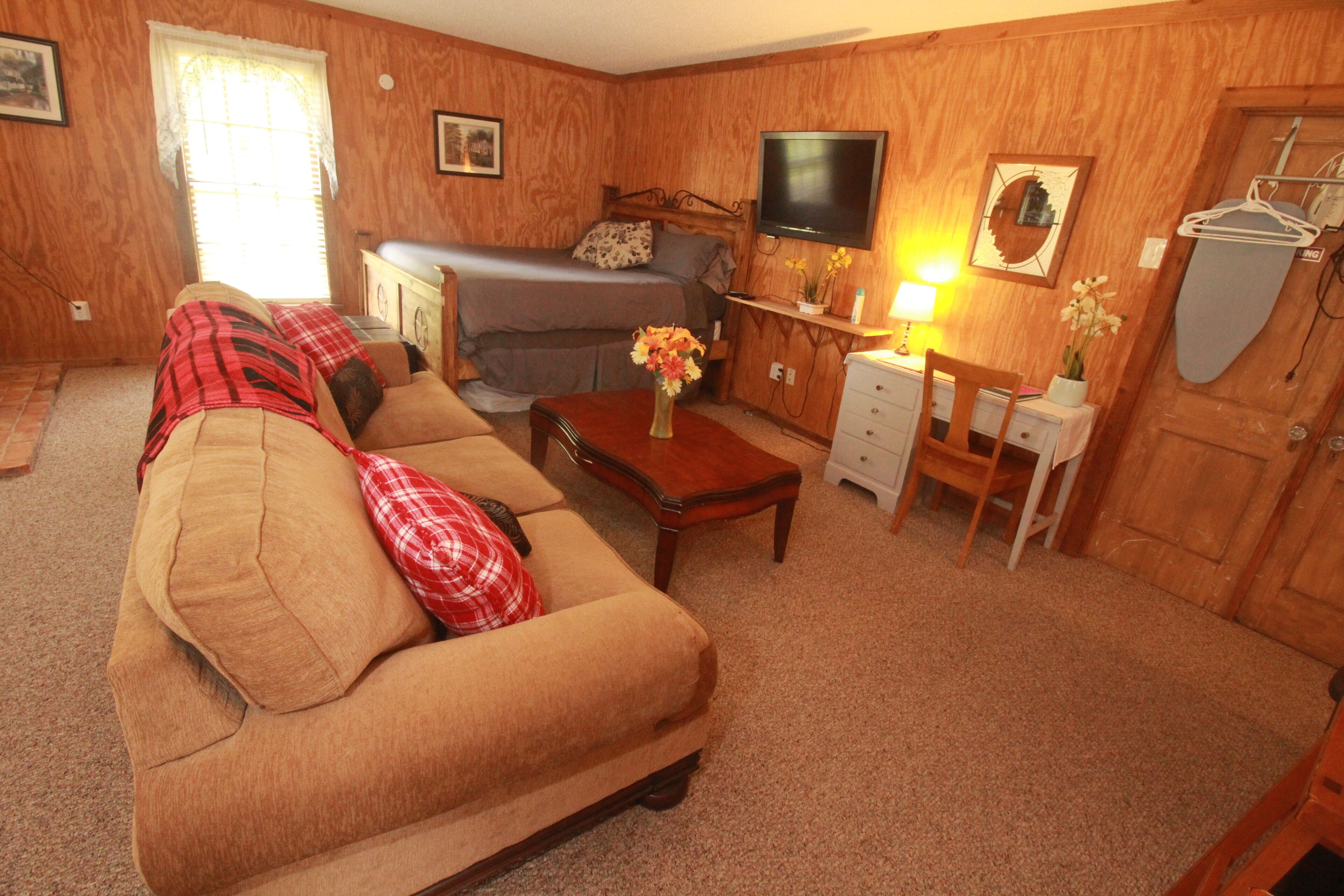 Eclectic Country Studio Guest House Quick Escape Cute open concept with charmingly rustic vibe. A desk with drawers give a nice spot to get some work done, if needed. Has standup shower in the bathroom and towels provided. Kitchen has coffee maker, flat top stove with oven, microwave and plenty of counter space. The kitchen also has a decent sized fridge and freezer with ice trays. Brand new...