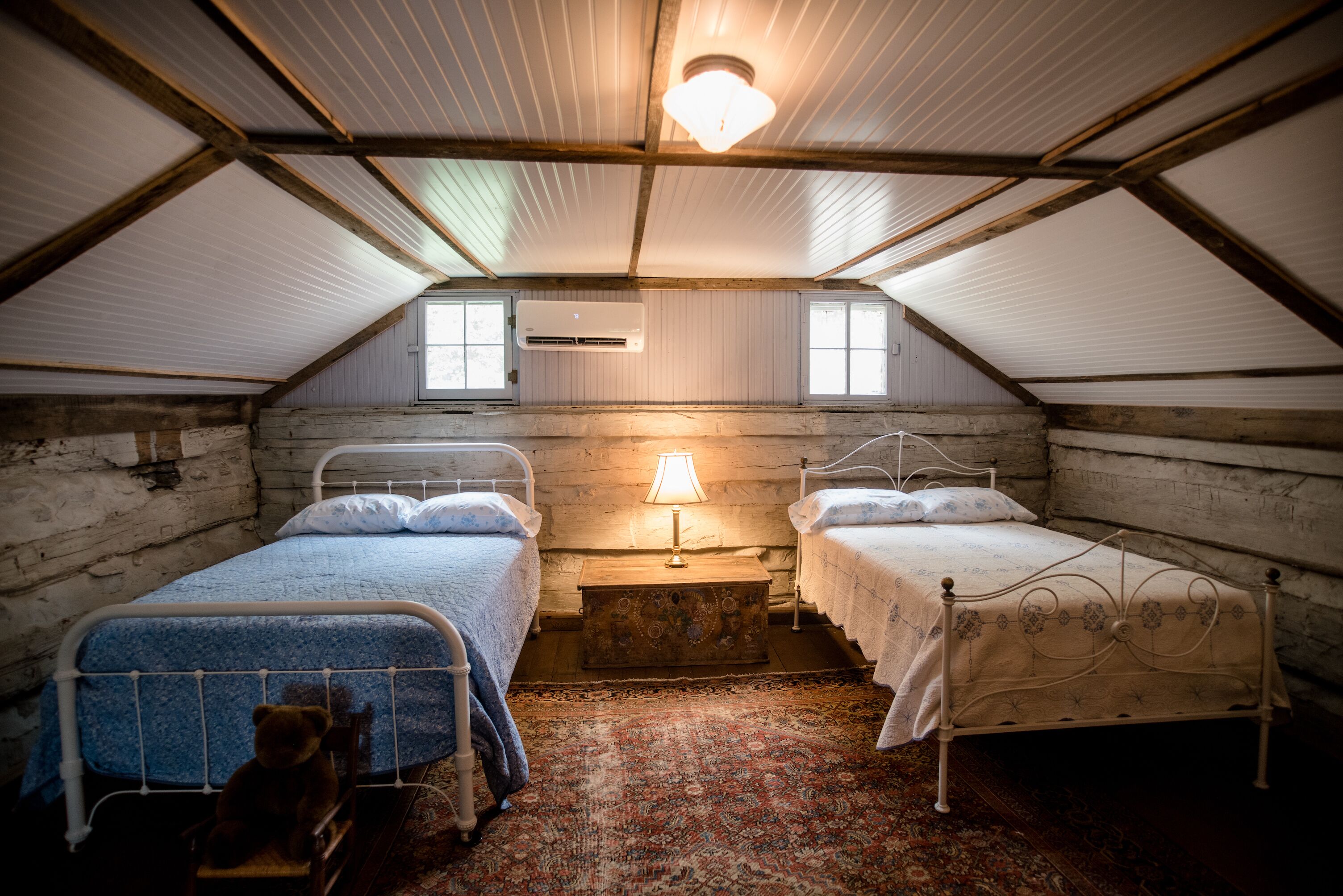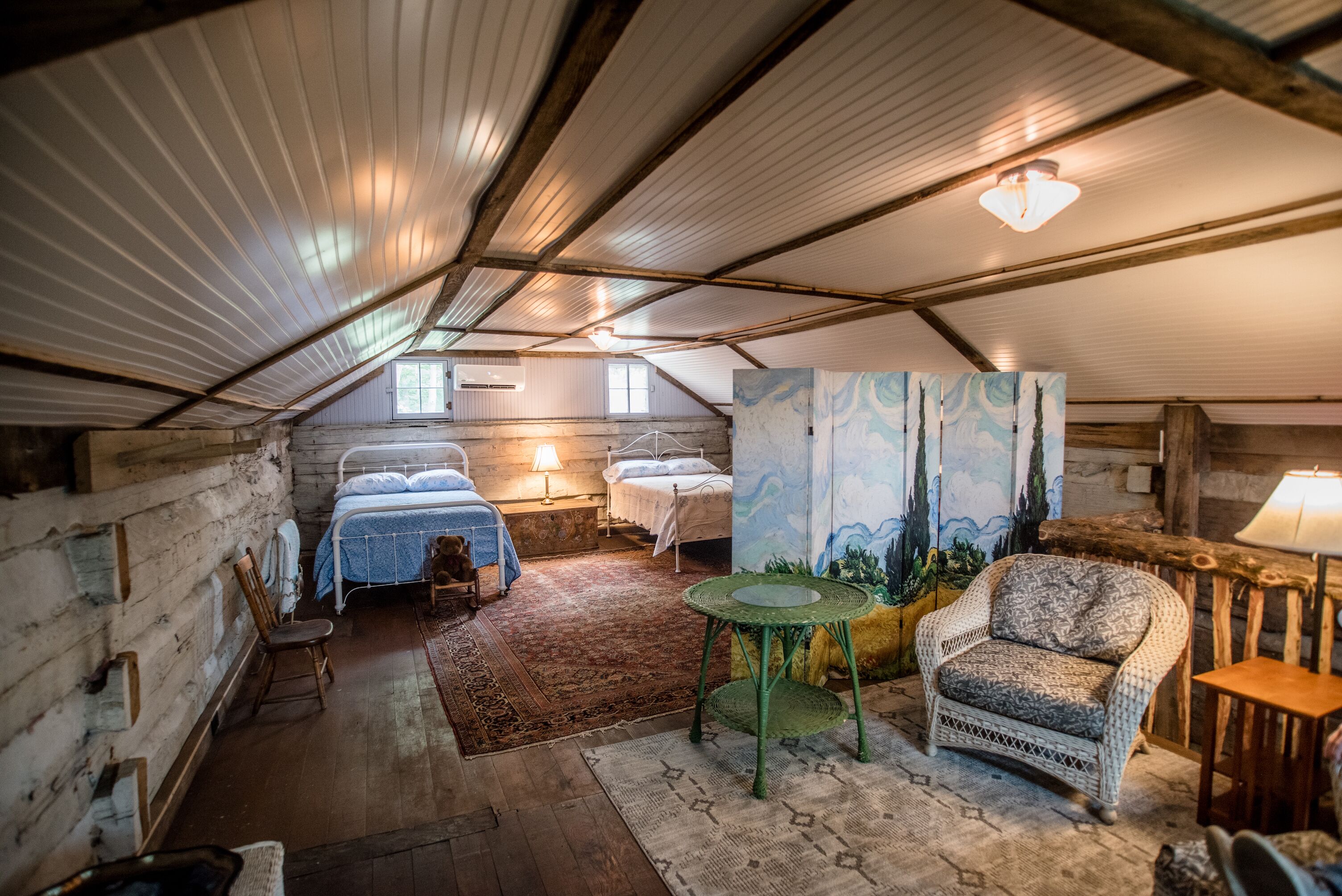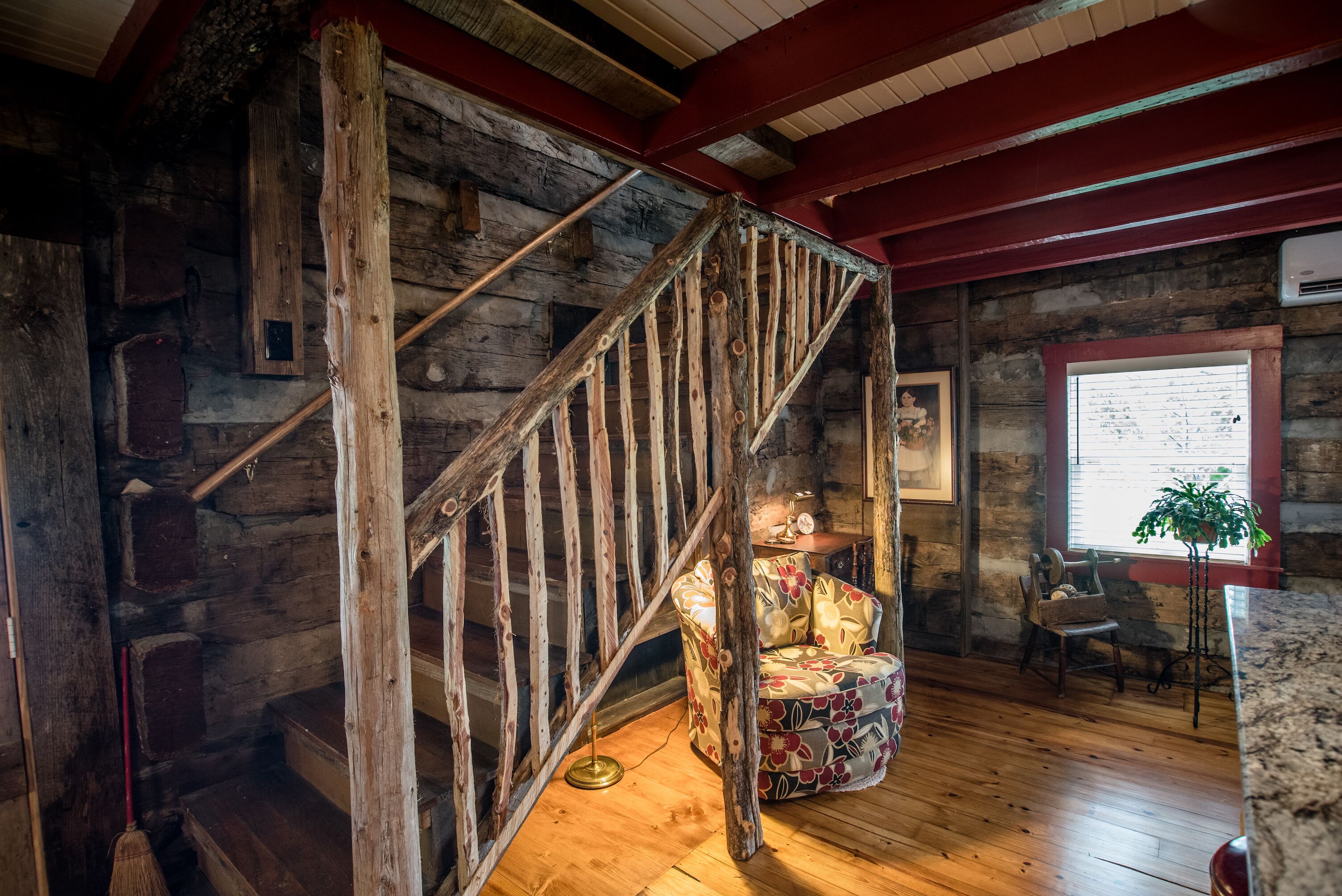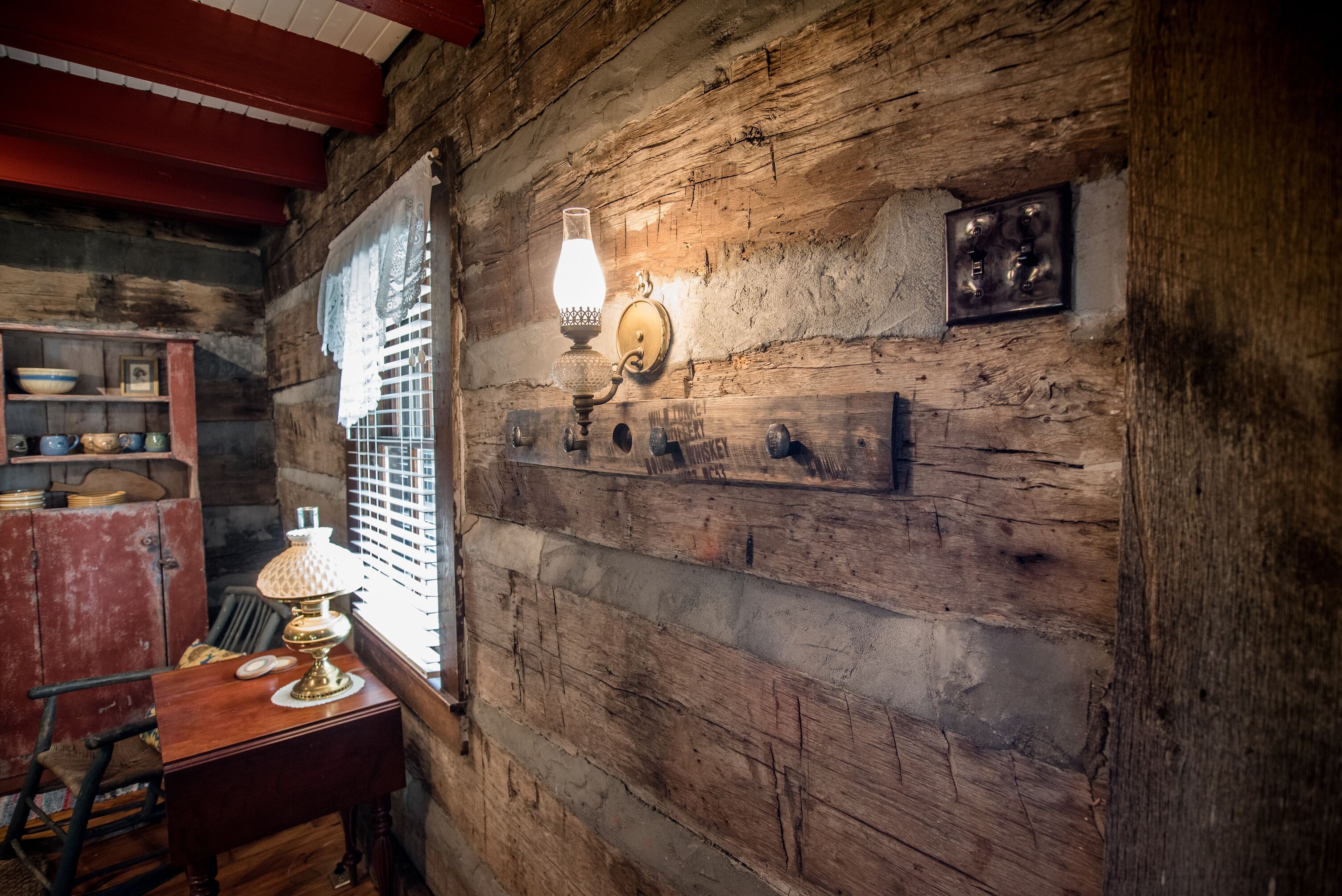 Original Circa 1818 Oak Lodge Totally restored 1818 cabin, with original oak logs and pine plank floors. Once inside the cabin, it has all the comforts you have come to expect, granite island, gas logs, modern bath, and new comfy double beds and much more. The comfy double beds are upstairs in the open private loft area, the second sleeping area is downstairs on a fold out sofa bed. There are no bedroom doors on either sleeping area.
