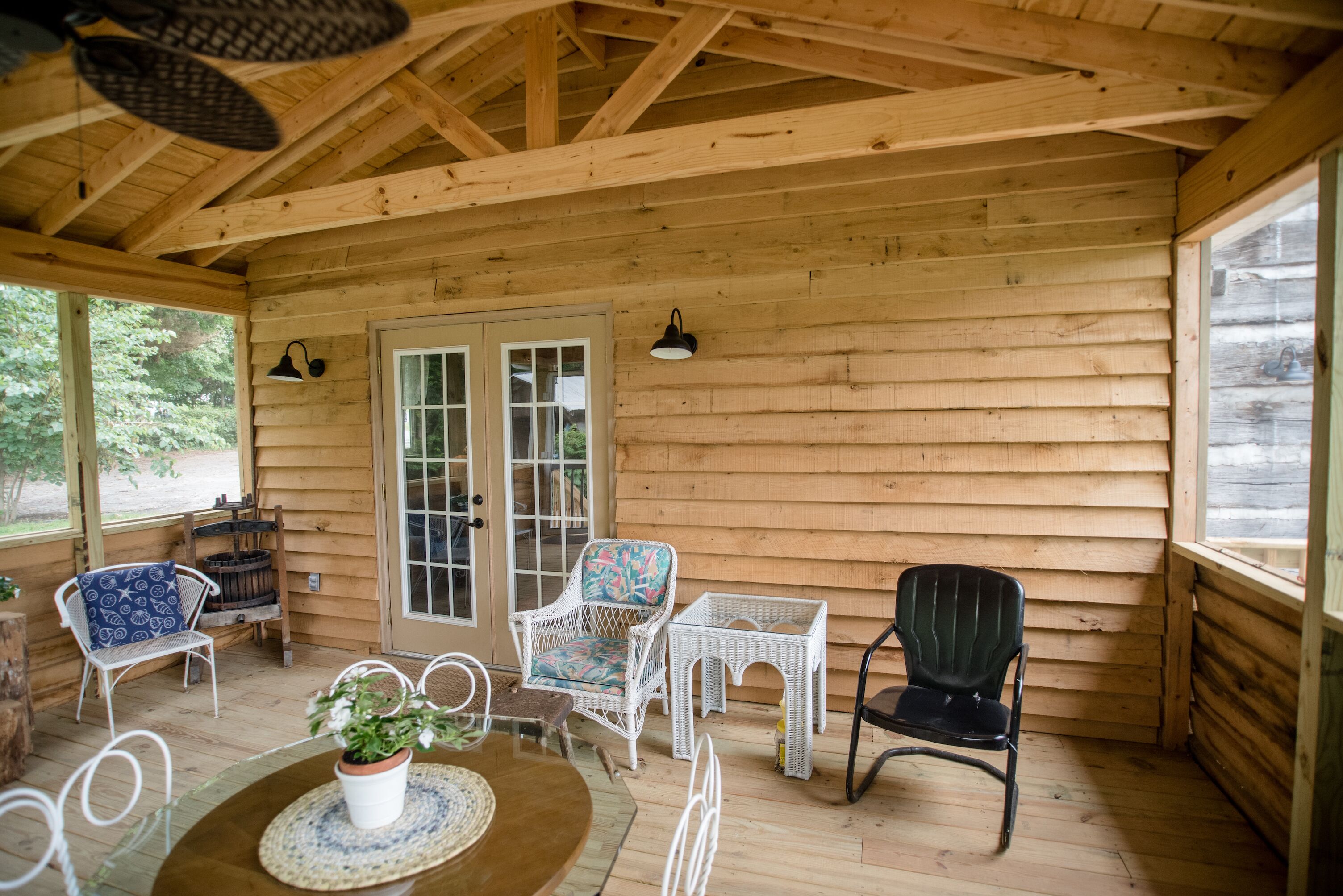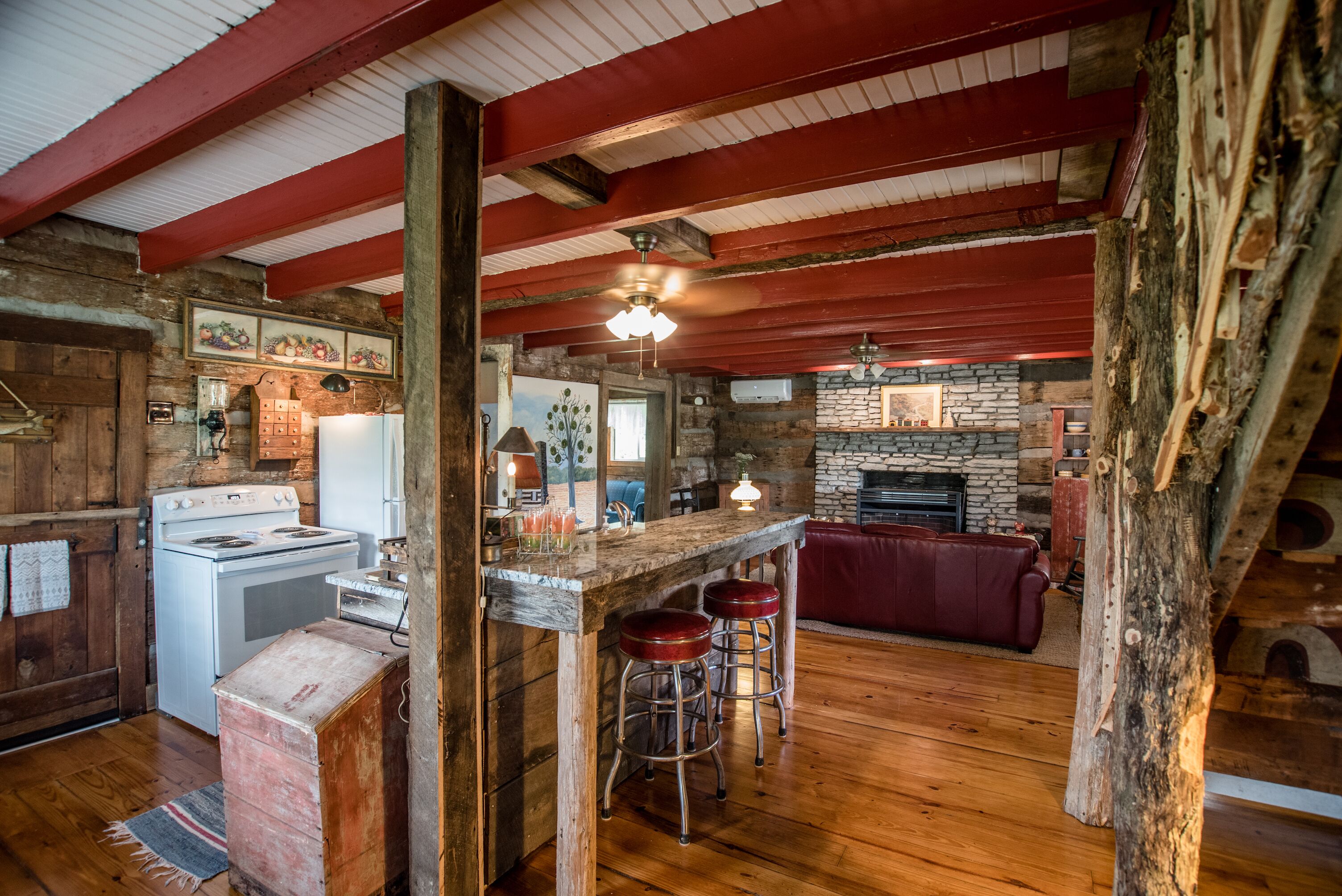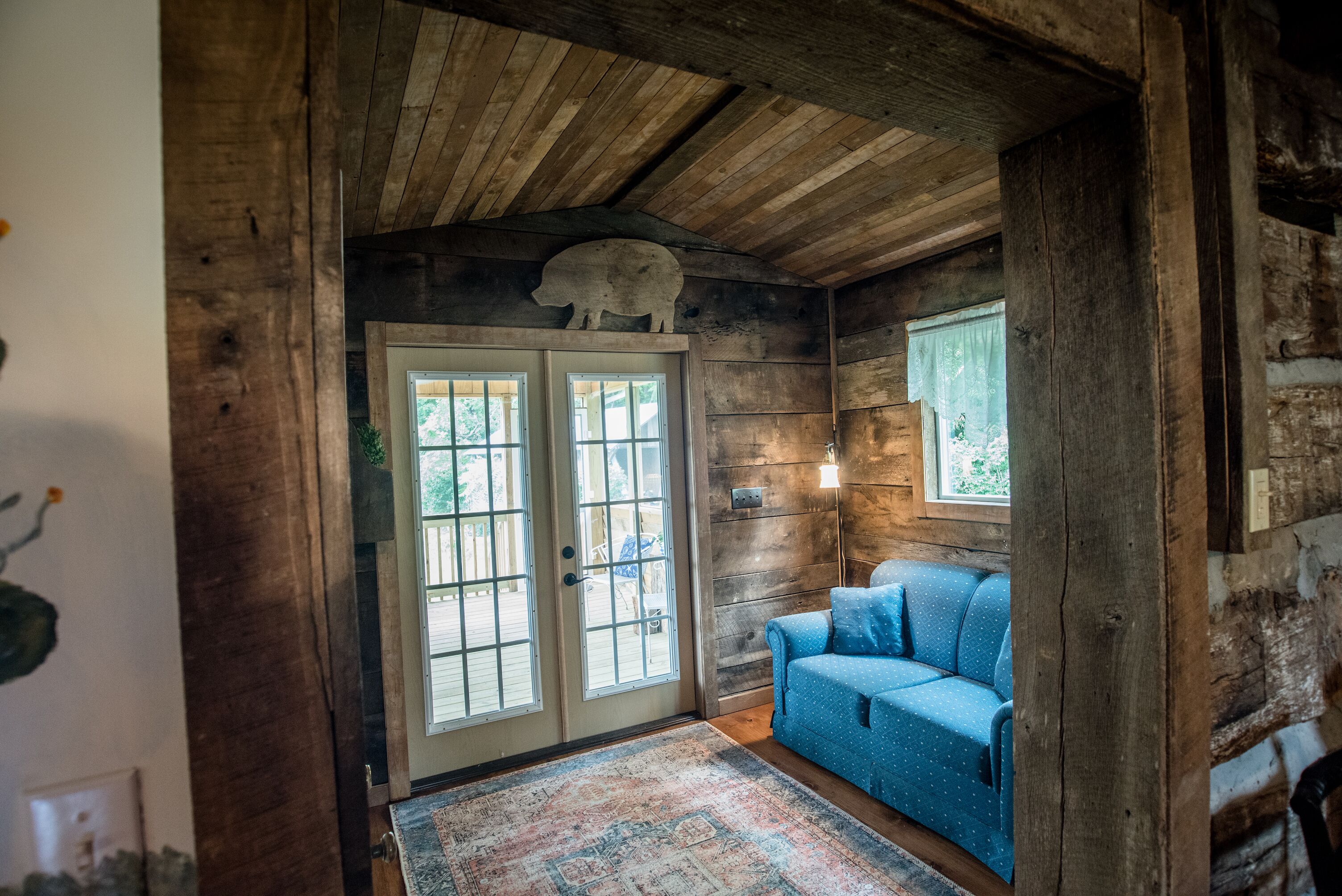 Original Circa 1818 Oak Lodge Totally restored 1818 cabin, with original oak logs and pine plank floors. Once inside the cabin, it has all the comforts you have come to expect, granite island, gas logs, modern bath, and new comfy double beds and much more. The comfy double beds are upstairs in the open private loft area, the second sleeping area is downstairs on a fold out sofa bed. There are no bedroom doors on either sleeping area.
