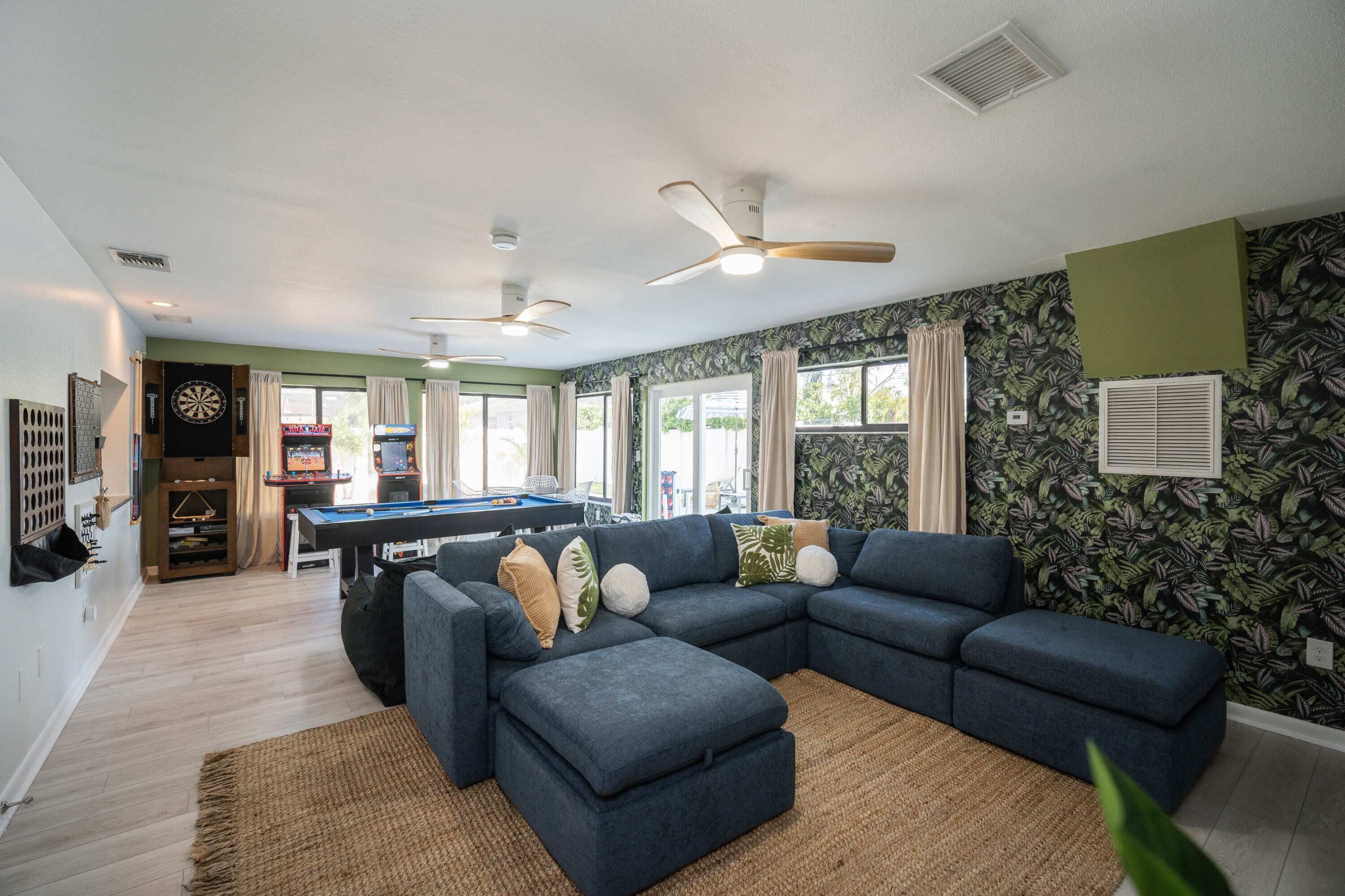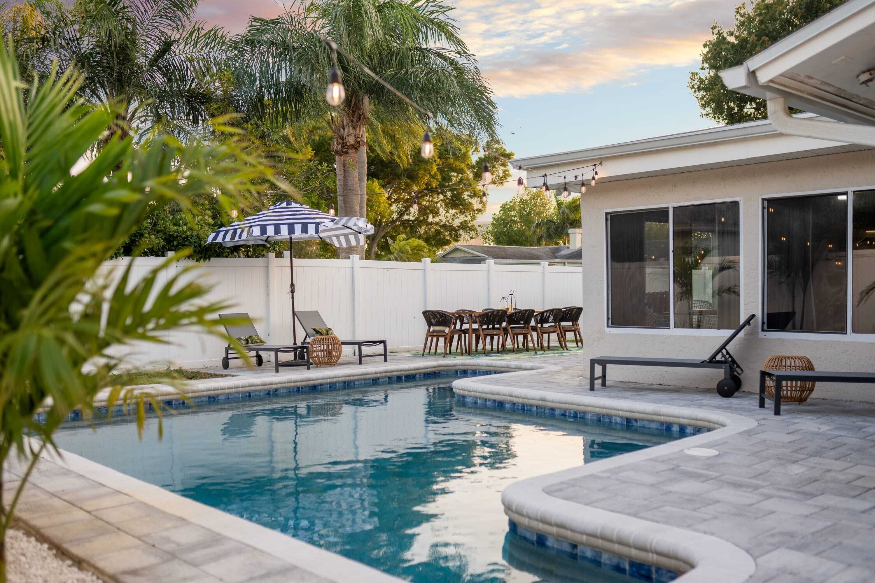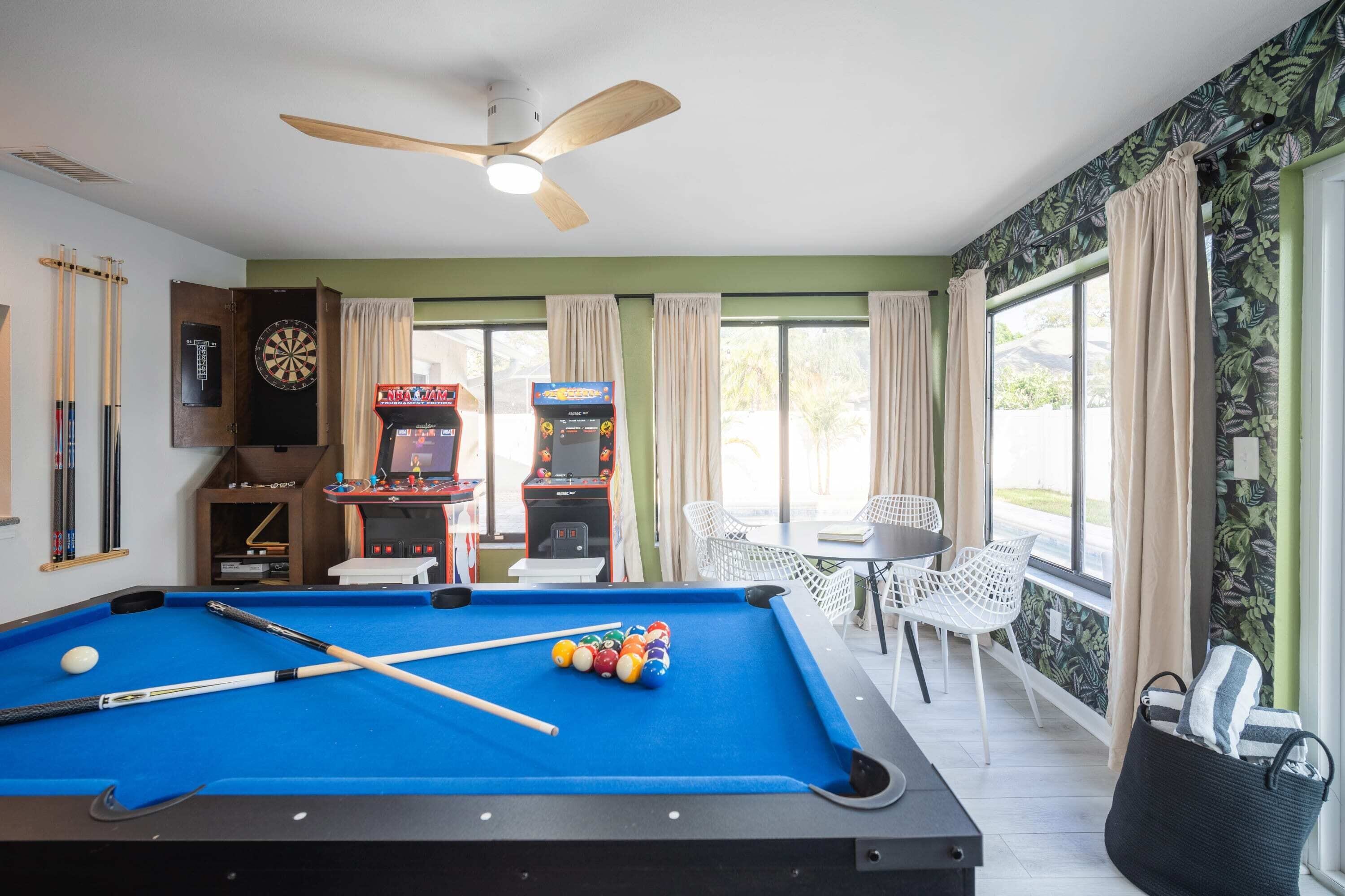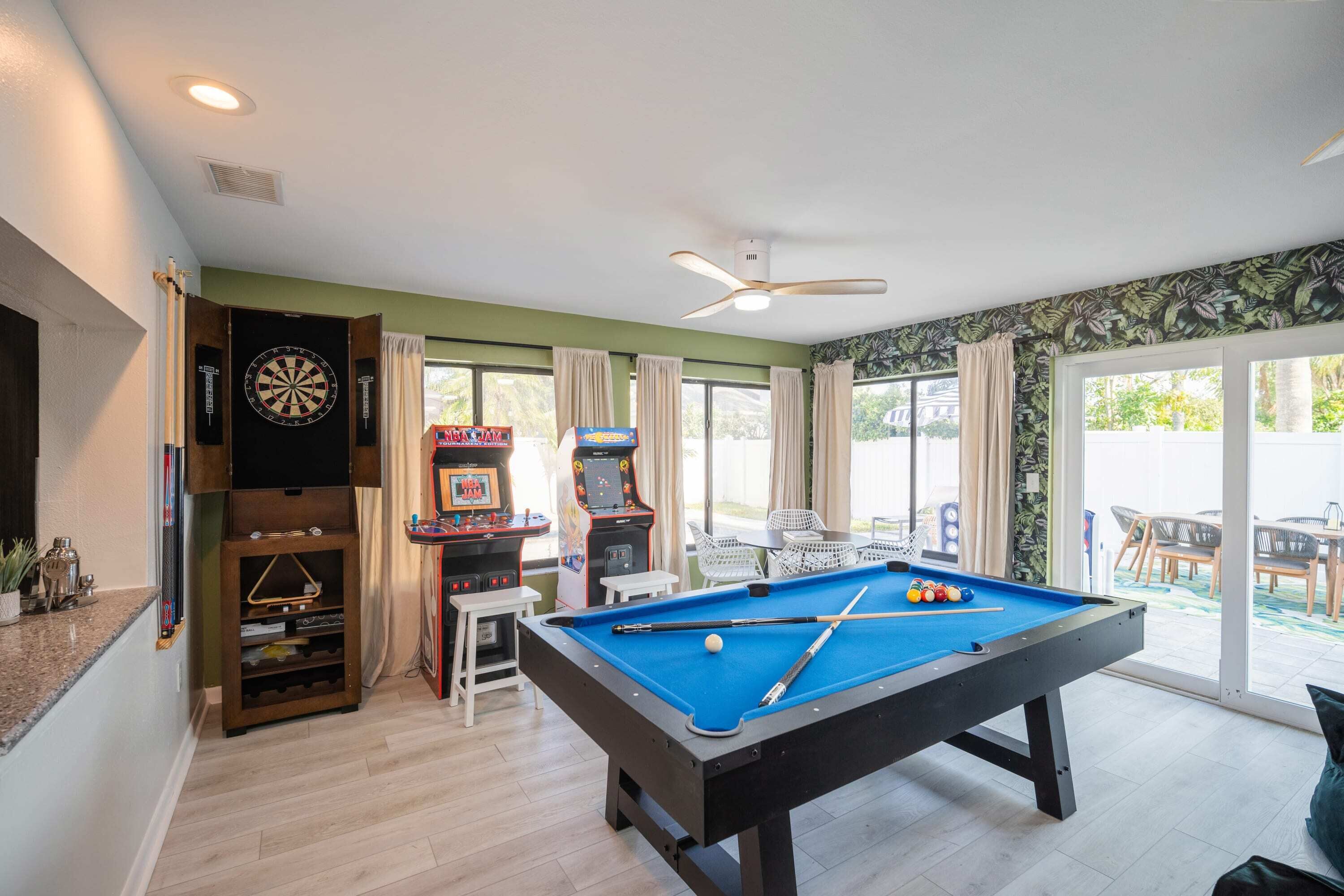 Epic Yard~ Pool ~Movie Theater~ Arcade Games Summary:This house is located just 3 miles from the beach (Indian Shores) & has EVERYTHING you need for a fun filled stay! Newly renovated in April 2024!*Game room- Pool Table, NBA Jam, PacMan, Darts*Movie Theater w/ plush couch & screen*Fire Pit + BBQ*Private Pool*Outdoor Dining*Cornhole *Pet Friendly*Family Friendly- Pack n Play & High Chair Included*Fully Stocked Kitchen *Smart TV's in every bedroom *High Speed Wifi *Desk- Perfect for Remote Workers*Close to Restaurants & Grocery StoresThe Space:MAIN SPACES OF THE HOME:– 6 BEDROOMS & 4 FULL BATHROOMS (SINGLE LEVEL HOME) –BEDROOM 1 (Primary):* Plush King-sized bed* Roku TV* Full ensuite bathroom with a dual-sink vanity* Spacious stand-in shower*Overhead fan *Full body mirrorBEDROOM 2:* Plush King-sized bed*Ensuite bathroom with walk in shower*Roku TV*Full body mirror *Desk*Overhead fan BEDROOM 3:*Queen bed*Roku TV*Overhead FanBEDROOM 4:*2 twin over full bunk beds*Roku TV*Overhead fan FULL BATHROOM 3:* Located in the hallway with shower/tub comboBEDROOM 5:* Two Queen beds*Roku TV*Full body mirror *Overhead fan BEDROOM 6:*Queen bed*Roku TV *Overhead fan FULL BATHROOM 4:* Located in the hallway with shower/tub combo– CHEF’S KITCHEN –* Electric range & plenty of cooking space* Fully-equipped* Counter seating* A Keurig & a filtered coffee maker– 2 LIVING ROOMS –* Lots of natural lighting* Large Sofa* Roku TV*Board games*Pool Table*Arcade Games*Darts– MOVIE THEATER –*Huge, plush couch *Popcorn machine *Movie Screen with Roku Stick- Netflix, Hulu, etc.*Connect 4 Game– SPECTACULAR RESORT-STYLE BACKYARD & POOL –* Private pool * Poolside loungers* BBQ Grill*Outdoor dining *String lights for added ambiance*Cornhole *Jenga*Connect 4– ADDITIONAL ITEMS –*Dogs are allowed for $125 per stay, up to 2 dogs allowed. No cats please. Your dog must be crate trained and please pick up after your petGuest Access:Guests have access to the entire house (minus the locked owner's closet) via keypad entryGetting Around:Uber and Lyft are reliable modes of transportation in the area.Other Things to Note:First, we must inform you there are NO parties or events allowed at this property. There are state and city laws that must be respected, as well as our neighbors. Any parties or gatherings of any kind will result in a minimum fine of $2,000, and will be asked to check out with no refund. The home is outfitted with a Minut device (measures volume decibels; does not record) that notifies us when noise levels at the property exceed the set limit. This is a tranquil neighborhood that's best suited for guests looking for a relaxing getaway. We appreciate your understanding. Dogs are allowed for $125 per stay, up to 2 dogs included. Dog must be crate trained and please clean up after your dog.There is one exterior camera are solely to keep track of our cleaning team.We use SUPERHOG as part of our guest screening process. Your SUPERHOG application must match the primary guest name on the reservation, and your background check must be completed within 48 hours of receiving your booking confirmation as per State and City law. Your booking is NOT confirmed until these requirements have been fulfilled. Once the reservation is confirmed, and prior to check-in, guests must sign a Rental Agreement outlining the terms of the stay, stating that they agree with and acknowledge:- to abide by our rental terms and conditions.- to provide a copy of a valid government-issued ID and matching credit card prior to check-in.- we collect a non-refundable damage waiver of $50, paid via SUPERHOG- the waiver will cover you for any accidental damage during your stayHOUSE RULES:Renters agree to cover any cost related to damages that occurred during their stay, including extra-cleaning charges if needed or any unauthorized pets if discovered during or within a reasonable amount of time after their stay. These amounts are charged to the credit card on file and followed by an email breaking down the fees and damages. No charges are ever processed without prior written notice. The minimum fine for damages is $500.