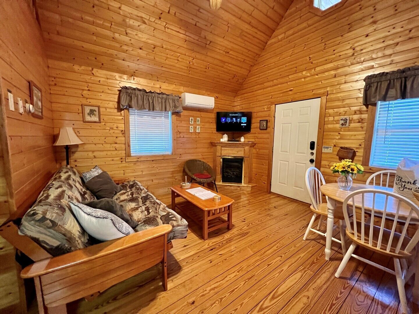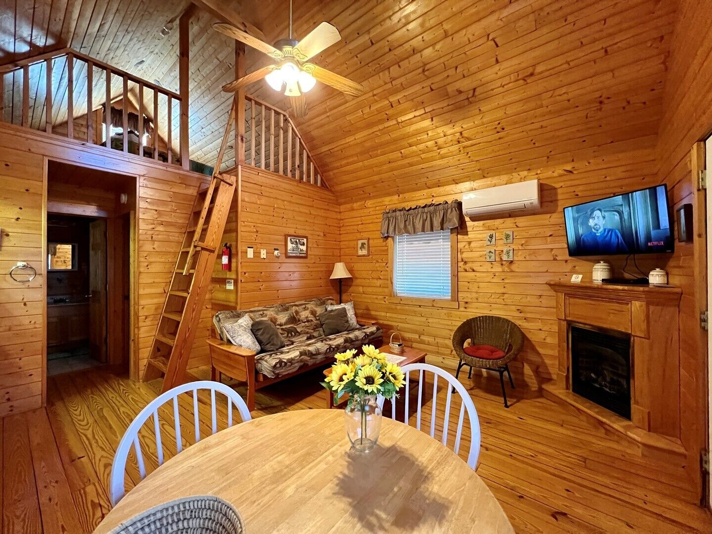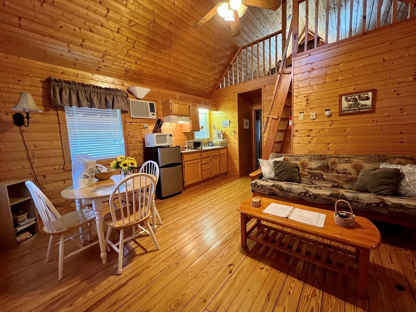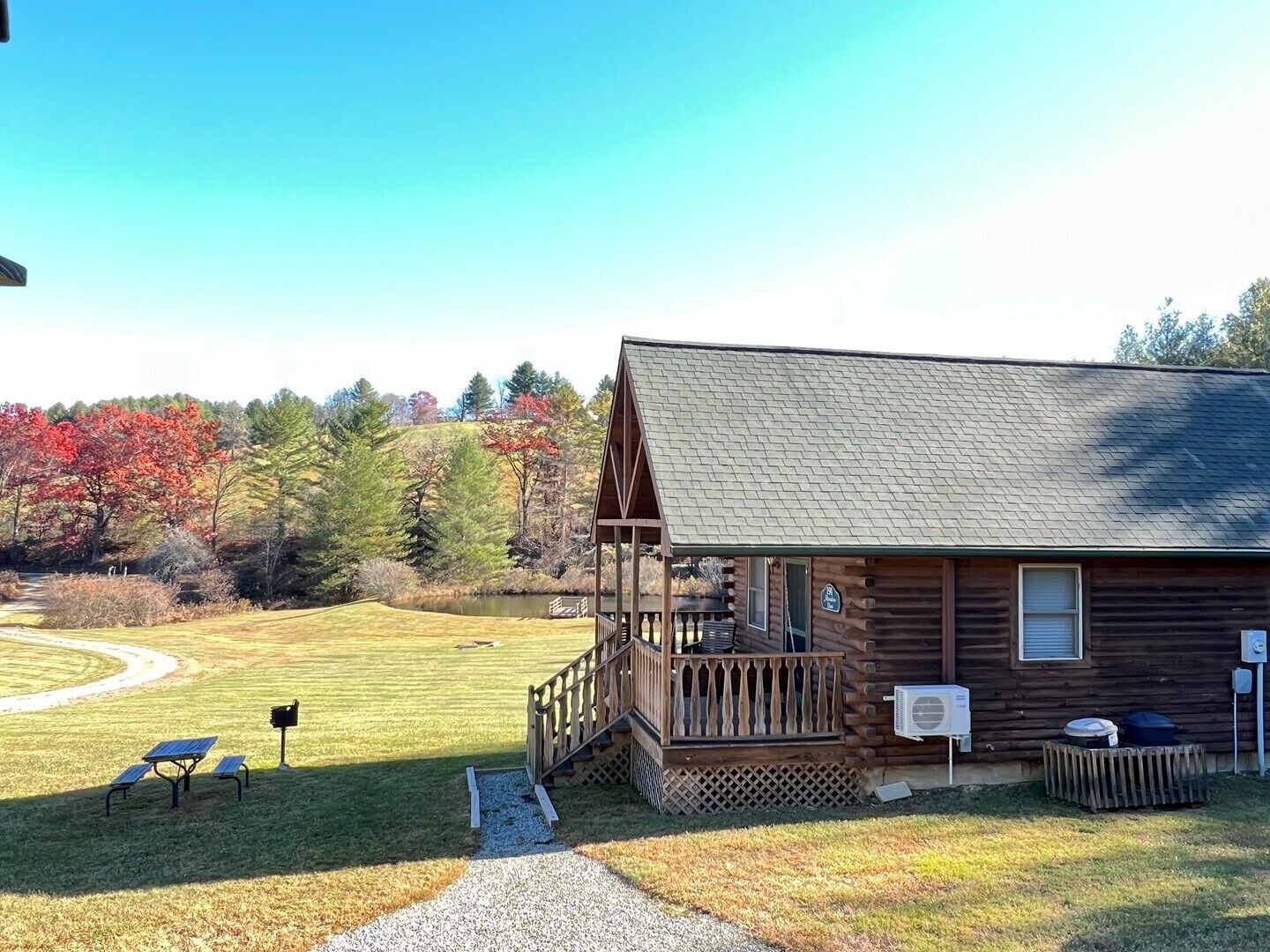 Pond, fireplace, WIFI, No Pets, near Blue Ridge Parkway MEADOWVIEW LOG CABIN in Laurel Springs, NC offers a relaxing meadow and pond view surrounded by mountain vistas. This pet friendly cabin will sleep up to four guests comfortably. There is a queen size bed in the bedroom and a sofa that faces the gas log fireplace. Picnic beside pond on the property. Quaintly situated on 10 acres with large pond and 2 similar log cabins. Located just off the Blue Ridge Parkway and convenient 25-30 minute drive to West Jefferson. Efficiency style kitchen includes full size refrigerator, build in cook top, microwave, toaster oven, coffee maker, cookware and dishes. The bathroom is fully stocked with fresh linens and a hairdryer.The cabin is air conditioned with ceiling fans and cathedral ceilings, heat, gas log fireplace keeps the cabin warm and cozy on chilly nights. The living room includes Smart TV, DVD player, Reliable WIFI added 3/2022.Max Guest 4 (including children).1 queen bed, 1 queen mattress in ladder loftPETS NOT ALLOWED.Group Retreat: Rent All 3 cabins on this 10 acre tract (Ravine, Meadow View and Whitetail Log Cabins) and receive a 10% discount.Our Vacation Rental Agreement is on this site and will be emailed to you and by reserving you are agreeing to these terms & policies. Upon booking we will email you a confirmation, followed by a check-in package, just prior to your arrival date.Closest towns are Jefferson, West Jefferson, and Sparta-about 25-30 minutes away.The beds are ready with fresh linens when you arrive. A guest book with all area information is included in each of our properties, some of which is highlighted below. We look forward to serving you! Enjoy BLUE RIDGE MOUNTAIN ATTRACTIONS near Boone NC and West Jefferson NC including: -Shopping: Local shops including Antiquing and Art Galleries in downtown West Jefferson and Boone, Tanger Outlet in Blowing Rock, Groceries Stores including Super Walmart -Dining: Casual and fine dining in West Jefferson and Boone, Local Brewery's (Boondock's Brewing, Appalachian Mountain Brewery), Winery Tours (Thistle Meadow Winery, New River Winery)-Canoe: Canoe, Tube and Kayak the New River with local outfitters including New River Outfitters, Zaloo's Canoes, Wahoo's Adventures, River Girl Fishing Company-Trails: Waterfalls, Scenic Overlooks and Hiking/ Running Trails on the Blue Ridge Parkway, Mount Jefferson State Natural Area, New River State Park, Elk Knob State Park, Grandfather Mountain, Rocky Knob, Kerr Scott Dam, and Grayson Highlands State Park. Mountain Biking at the Blue Ridge Parkway, Kerr Scott, Rocky Knob, Virginia Creeper Trail, and others. Sight-seeing, photography, scenic drives, and bird watching also at these locations.-Ski: Skiing, Snowboarding offered at Sugar Mountain, Beech Mountain, and Appalachian Ski Mountain (also offers Ice Skating and lessons). Snow tubing at Hawksnest. -Zip-lining: Hawsknest, Sky Valley Zip Tours, High Gravity Adventures, Virginia Creeper Trail-Fishing: State stocked trout stream, fly fishing, freshwater fishing -Horseback Riding: Burnt Hill Stables-Major Attractions: Gem Valley Gem Mine, Tweetsie Railroad, Grandfather Mountain, Mountain Air Golf Course, Jefferson Landing Golf Course, Church of the Frescos-Festivals, Music & Marathons: Christmas in July, Merle Fest, Faith Fest, Blue Ridge Brutal, West Jefferson Backstreet Concerts, Fiddler’s Convention, Local Concerts, New River Marathon, West Jefferson Gallery Crawls-Additional Sites: Ashe County History Museum, Local Parks, Fitness Centers, Public Library, Bank/ATM-Medical Services: Ashe County Memorial Hospital, Mountain Family Urgent Care