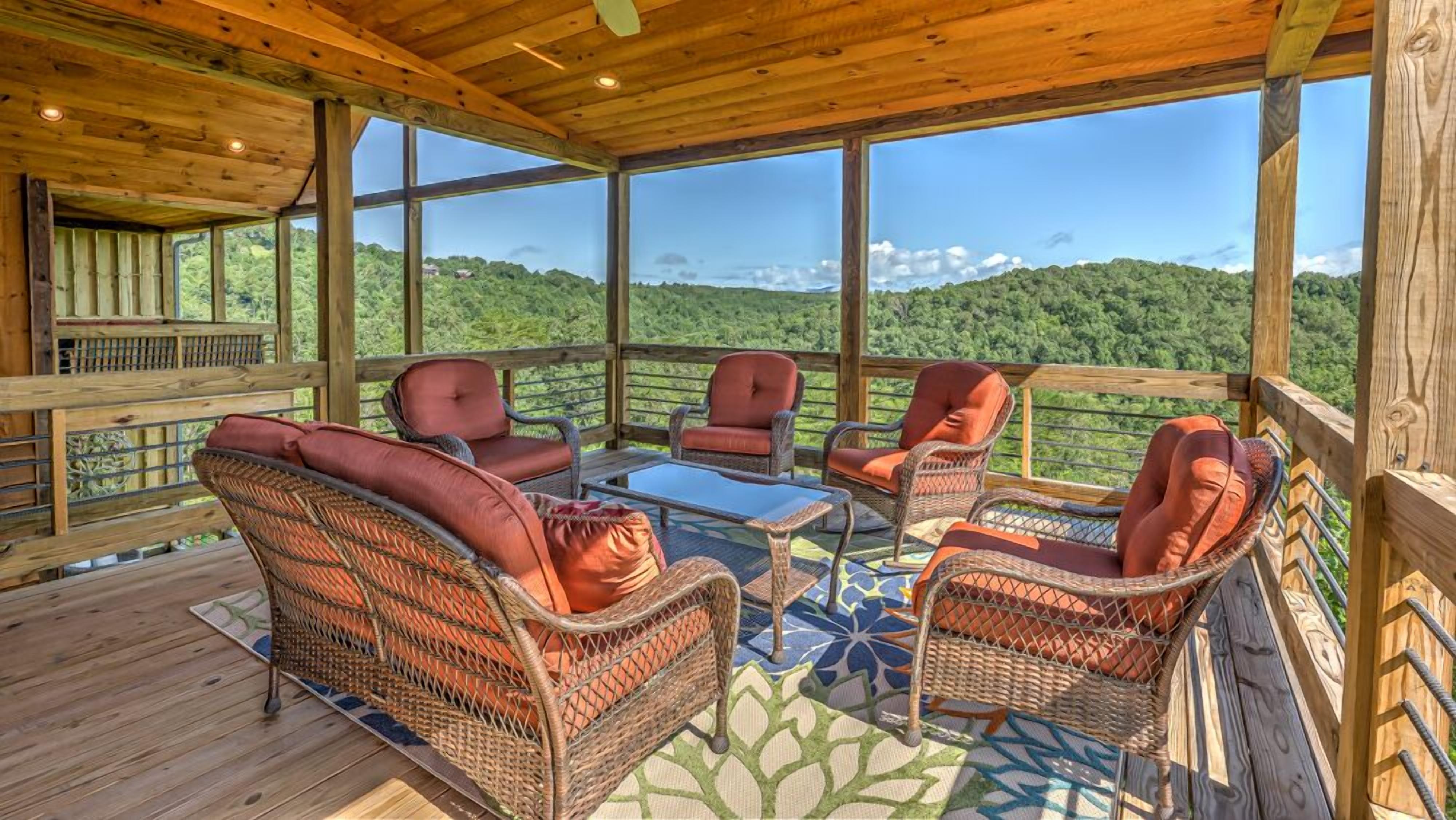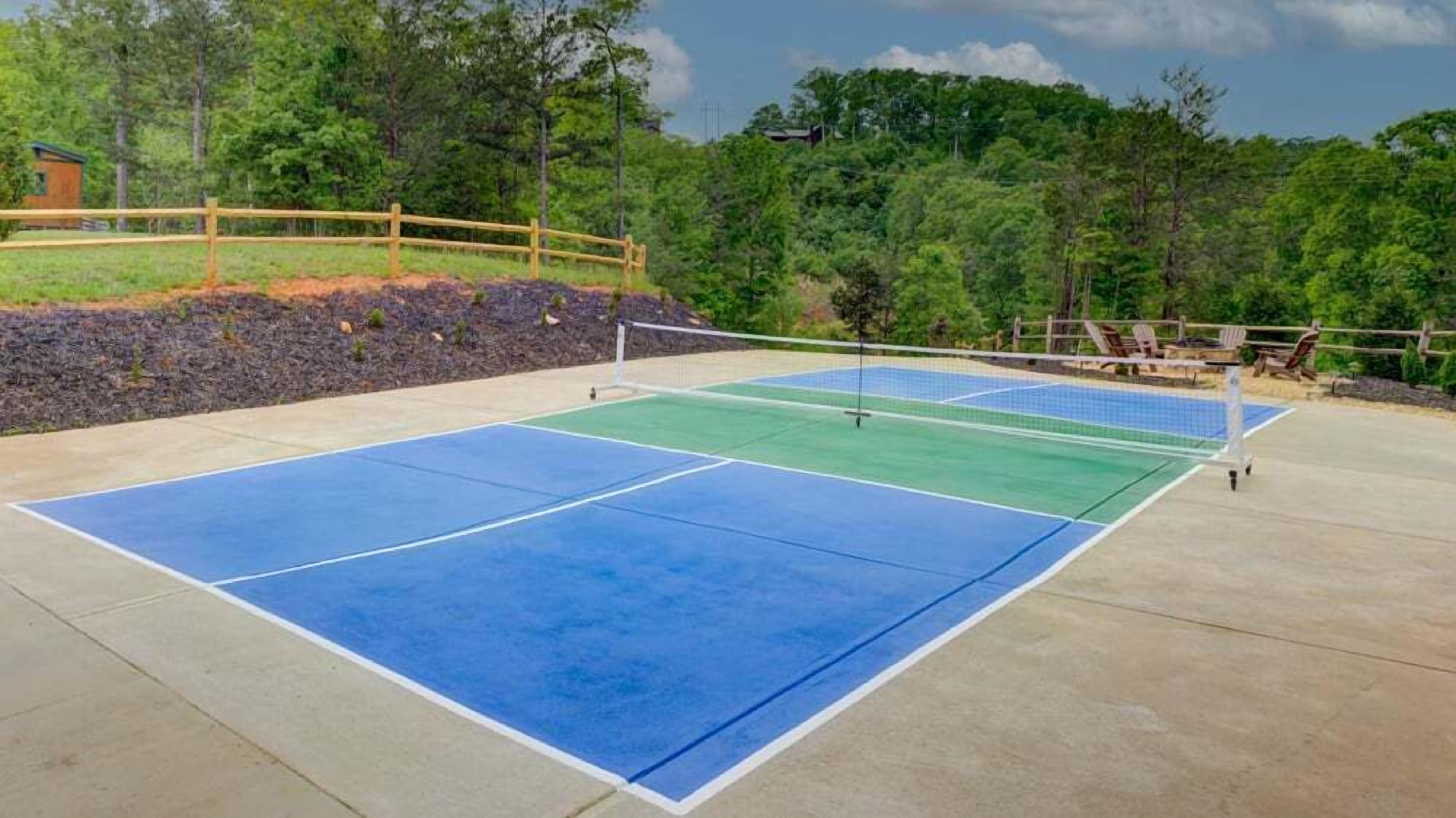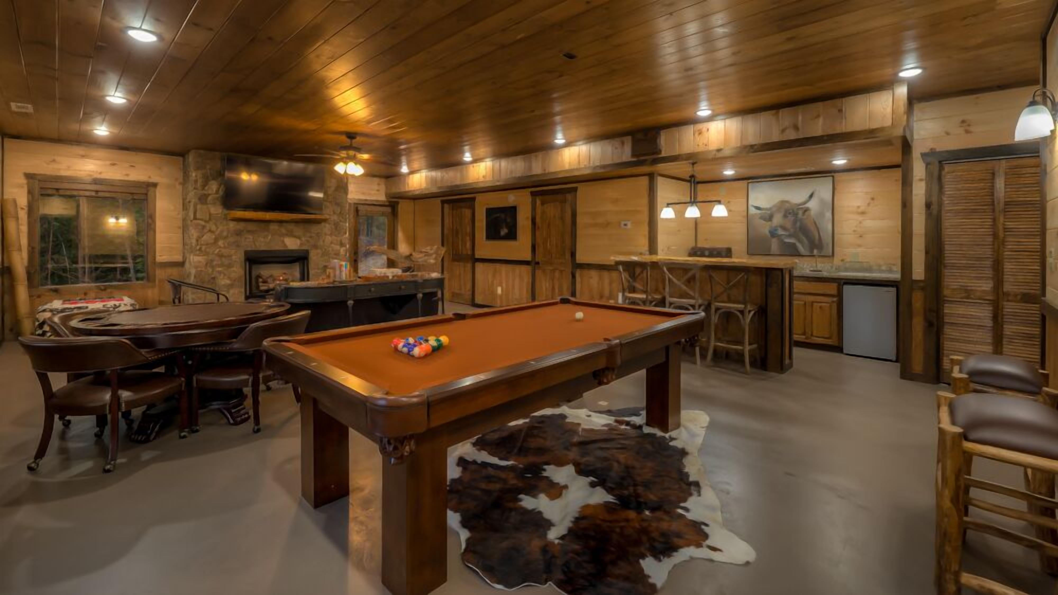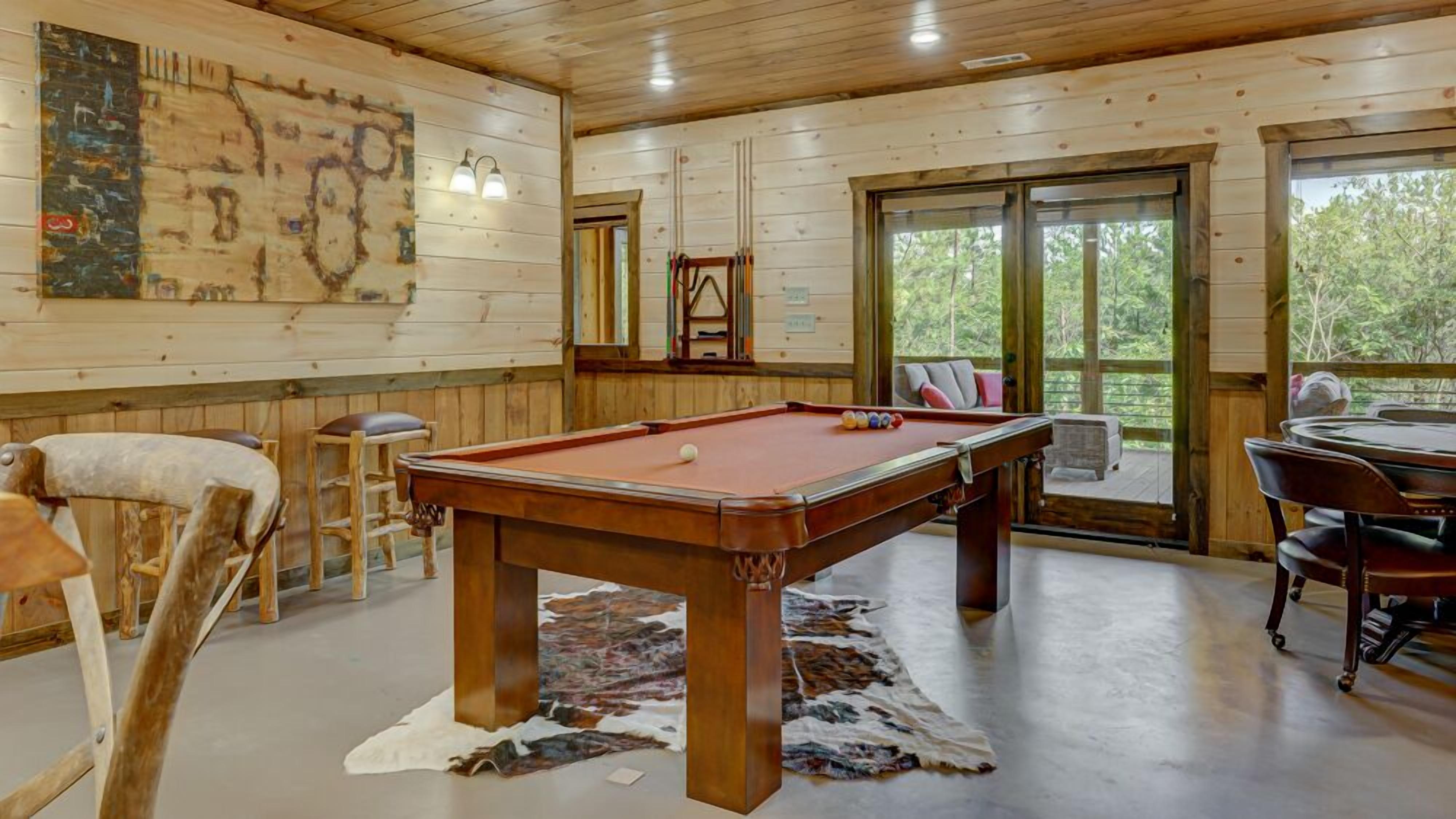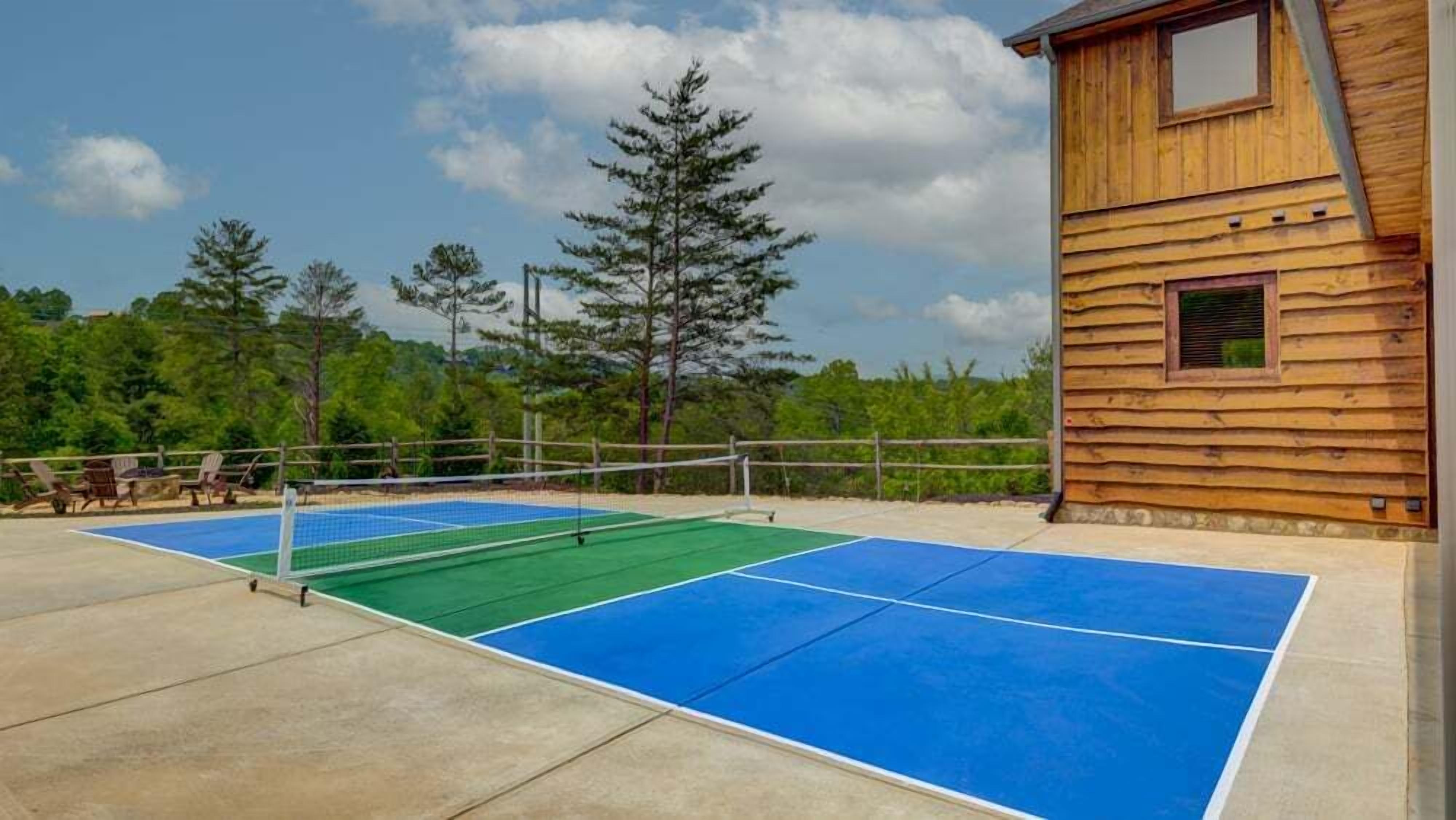 4 Leaf Clover - Pet Friendly | Mountain & River Views | Hot Tub | Pickleball Court | FirePit What if we told you that you could find a place in a gated community with a great view of the mountains, river, and railroad, and where you can see the train? Would you like to spend your stay there during your vacation? If you answer yes to that, then it's your lucky day. 4 Leaf Clover is perfect for you! Named after its owners, this is a true gem of a house. A specialty of this cabin that many others don't have? You can see the railroad track from the upstairs deck off the kid's bunk room (the Blue Ridge Train goes through on occasion) and the river from the upstairs bedroom. A wonderful surprise during your trip! As you walk inside, you'll notice the immaculate attention to detail taken in every piece of styling. From the multiple colors of luxurious wood to the massive chandelier with breathtaking 25' ceilings and large glass windows, no expense was spared to make this the perfect spot for unwinding and relaxing. You'll feel lucky to have found this beauty! The family room has lovely couches to sink into, along with a fireplace. So, curl up with a blanket, a good book, and a glass of wine, and enjoy! After you venture out of the living area, you'll be greeted by the immaculate kitchen. It is a chef's dream: the granite countertops, stainless steel appliances and the plethora of space will have you serving up some fantastic dishes. Carry your creations over to the dining area, complete with a fireplace, and share some stories while you share a meal. Get your game on with your loved ones - there's a pool table, poker table, shuffleboard, and plenty of board games inside. The basement has a wet bar with a mini refrigerator as well with stools - a great spot to post up and enjoy each other's company. If you're looking for some R&R in the great outdoors, you're in luck (again). 4 Leaf Clover has four separate balconies with plenty of seating for everyone. On the main level, you'll enjoy dining with a view, while grilling out at the gas grill. Looking for some friendly competition, 4 Leaf Clover has it's own pickleball court ready for its next match-up. When it gets chilly out, light up the outdoor fireplace. Or head down to the lower-level deck for a dip in the hot tub - such an excellent spot to spend late nights with family or friends. After a full day of fun in Blue Ridge, 4 Leaf Clover has the perfect places for you to rest your tired eyes. Retreat to the master bedroom on the main level and light up the gas fireplace. Each spacious bedroom has its own Smart TV, deck access and private bathroom. One of the most exciting parts about staying here is that 4 Leaf Clover is near some beautiful spots to do outdoor fun activities such as going to the river, fishing, kayaking, or watching trains. How wonderful is that? Such enjoyable things to do during your stay. Still deciding which place to stay? Consider 4 Leaf Clover! A beautiful place for your vacation. AmenitiesUnlimited WiFiCabin sleeps 12 (2 kings, 2 queens, 2 fulls, 2 twins)Game Room - pool table, pool table light, poker table, 4 chairs, 2 stools, board games, leather sofa, stone gas fireplace, 65” Smart TV, 2 chairs, coffee table, rug, ceiling fan, wet bar seats 3, granite countertops, mini refrigeratorOutdoor - covered front porch; main level covered deck, patio table seats 6, gas grill, rug, patio sofa, chairs, stone gas fireplace, coffee table, rug, patio swivel chairs, 2 ceiling fans; upstairs deck, 2 patio sofas, rug; second upstairs deck, patio sofa, 4 patio chairs, coffee table, rug, ceiling fan; downstairs deck, hot tub seats 6, 2 patio sofas, 2 patio love seats, 4 patio chairs, foot rests, coffee tables, rug, ceiling fans; fire pit with 6 king size Adirondack chairs; pickleball court Interior - natural wood, ceiling fansKitchen - fully equipped main level kitchen, stainless steel appliances, oven, custom cabinets, granite countertops, breakfast bar seats 2, kitchen utensils, microwave, crockpot, coffeemaker, KeurigDining Room - dining table seats 6, breakfast bar seats 2, fireplace, 42” Smart TVMedia - Cable TV, Smart TV streaming entertainment (sign-in to your subscription channels), local telephoneFamily Room - 2 leather sofas with built in electric recliners, stone gas fireplace, 65” Smart TV, 2 chairs, coffee table, side table, lamps, rugLoft - shuffleboard, sofa, rugBedrooms - master on main, king bed, 55” Smart TV, stone electric fireplace, dresser, night stands, lamps, bench, ceiling fan, rug, deck access; upstairs bedroom, king bed, 55” Smart TV, chair, dresser, night stands, lamps, rug, ceiling fan, deck access; second upstairs bedroom, 2 full beds, 2 twin beds, chaise, 65” Smart TV, dresser, night stand, lamp, rug, deck access; downstairs bedroom, 2 queen beds, 55” Smart TV, chair, dresser, night stand, lamp, rug, ceiling fanBathrooms - main level master bath, jetted tub, walk-in shower, granite top vanity; main level half bath, granite top vanity; upstairs bath, tub/shower combo, granite top vanity; second upstairs bath, walk-in shower, granite top double vanity; downstairs bath, tub/shower combo, granite top vanity; downstairs half bath, granite top vanityLaundry - washer and dryer downstairsPet Friendly - up to 2 well behaved dogs with prior management approvalCentral HVACDrive to Cabin - paved roads to cabin, gated community, concrete driveway, 2 car portico in front
