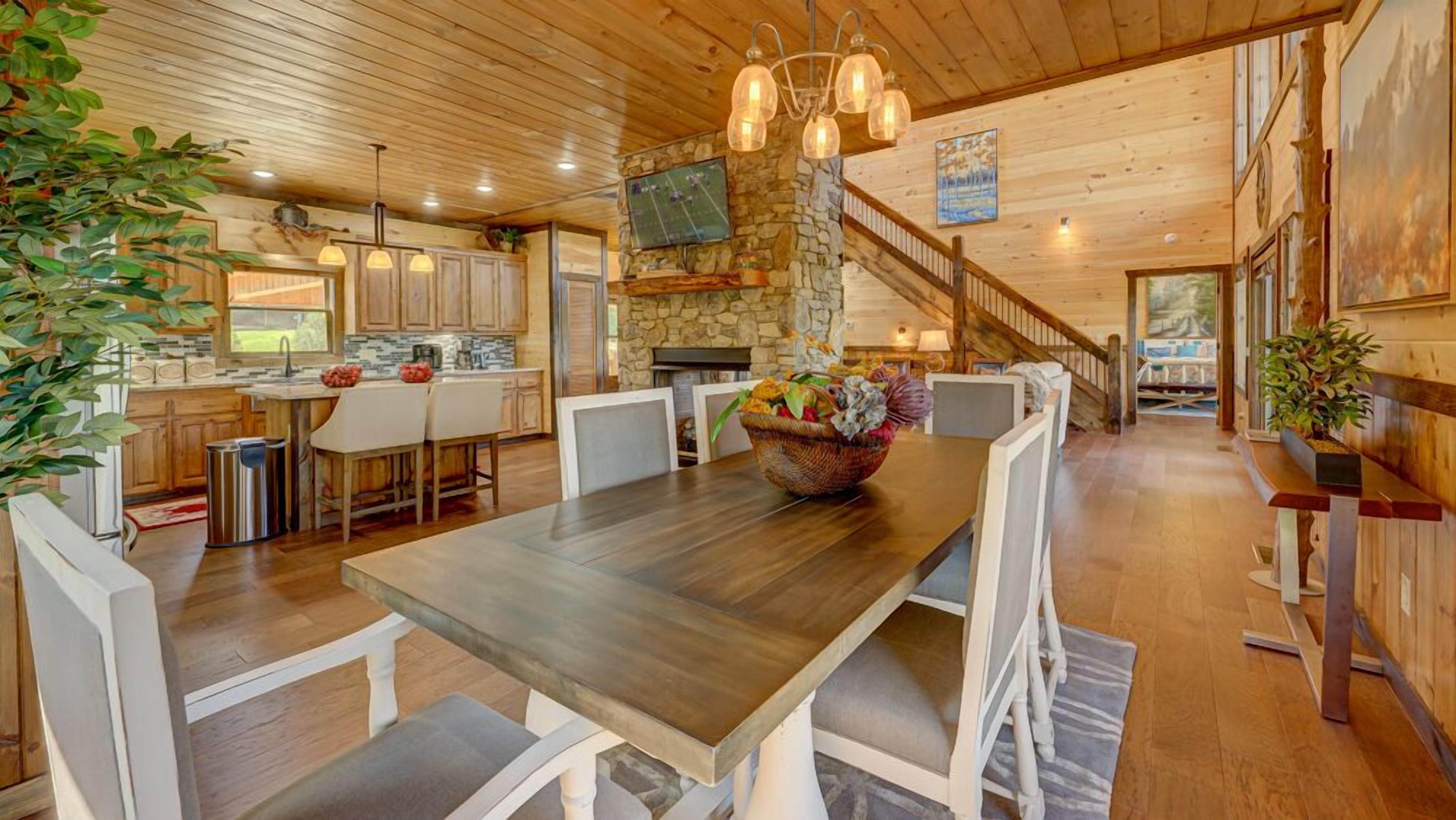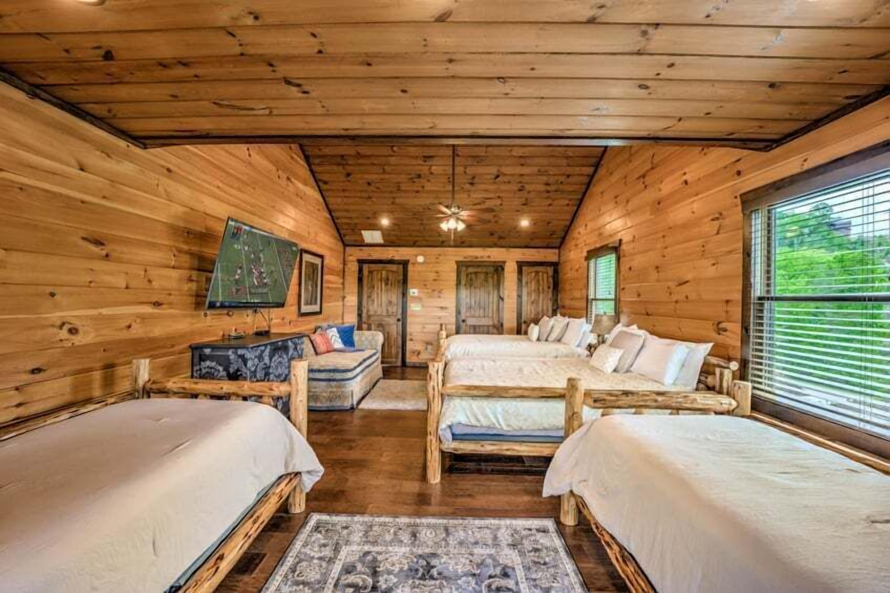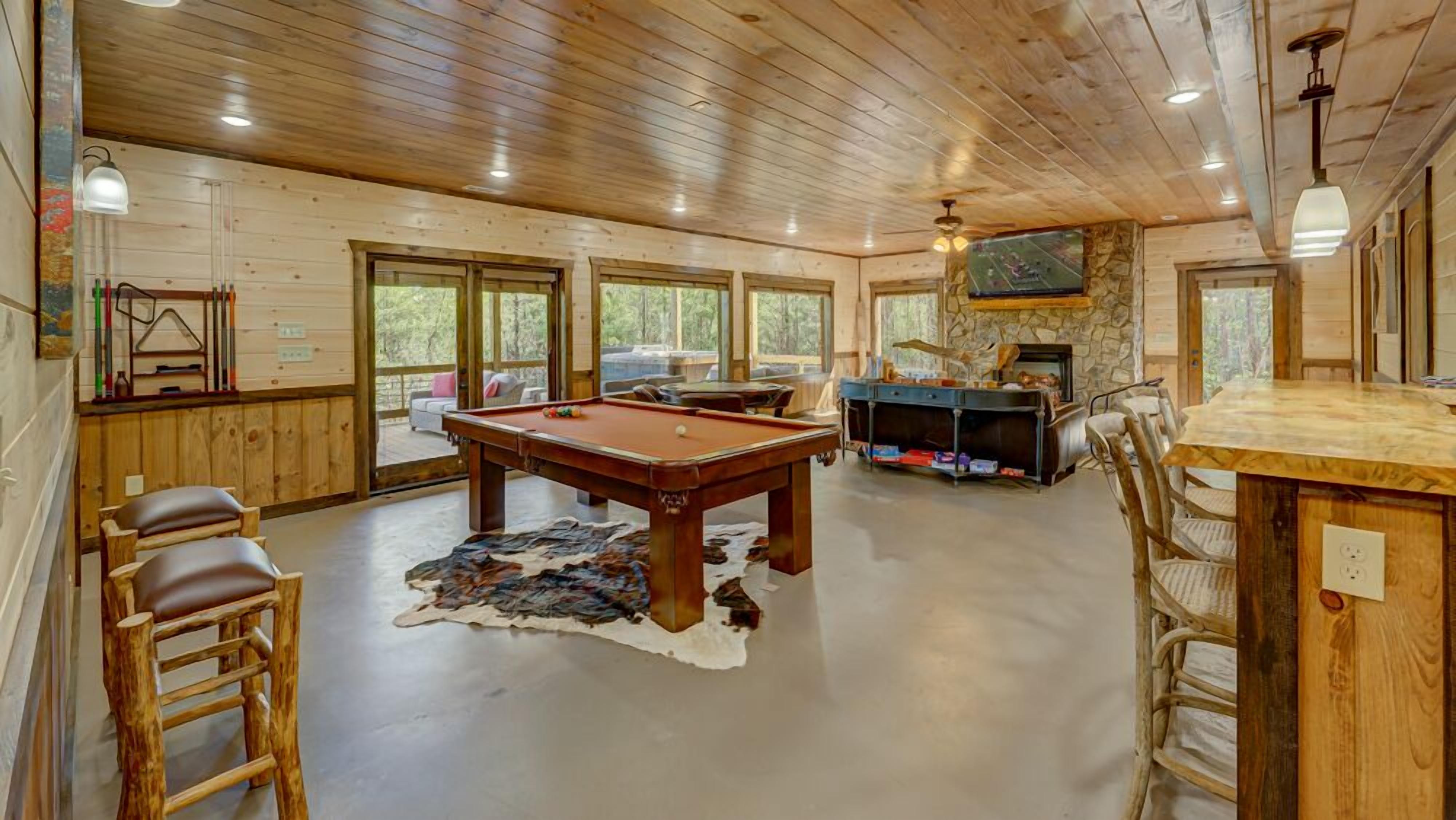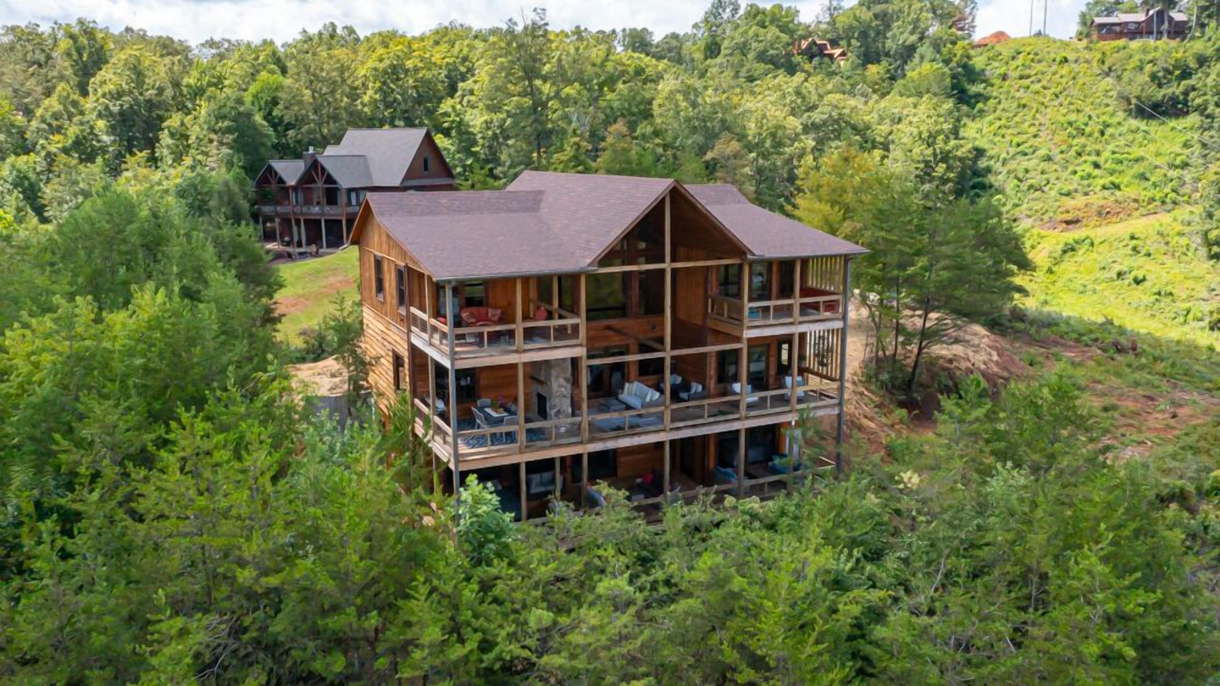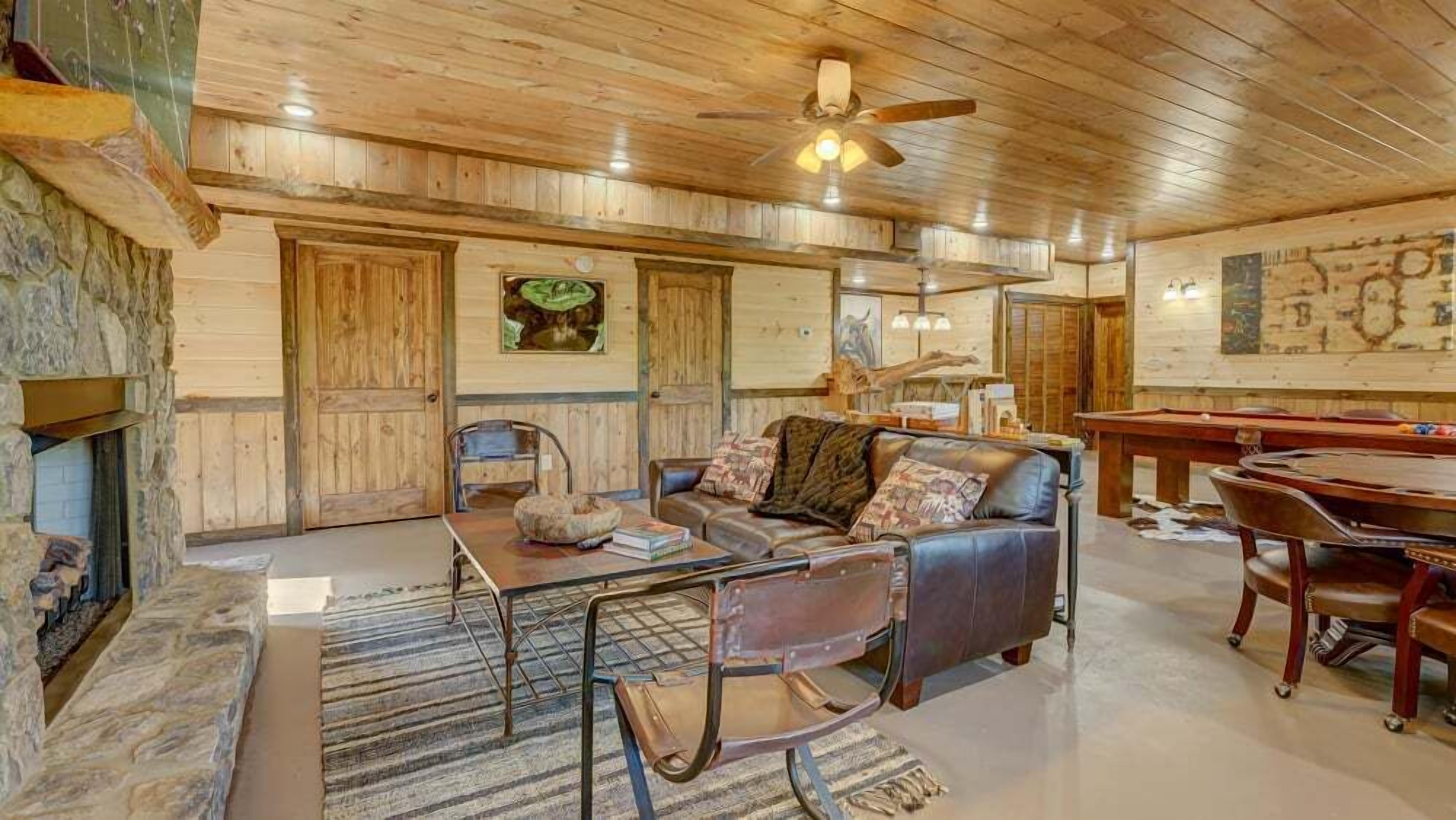 4 Leaf Clover - Pet Friendly | Mountain & River Views | Hot Tub | Pickleball Court | FirePit What if we told you that you could find a place in a gated community with a great view of the mountains, river, and railroad, and where you can see the train? Would you like to spend your stay there during your vacation? If you answer yes to that, then it's your lucky day. 4 Leaf Clover is perfect for you! Named after its owners, this is a true gem of a house. A specialty of this cabin that many others don't have? You can see the railroad track from the upstairs deck off the kid's bunk room (the Blue Ridge Train goes through on occasion) and the river from the upstairs bedroom. A wonderful surprise during your trip! As you walk inside, you'll notice the immaculate attention to detail taken in every piece of styling. From the multiple colors of luxurious wood to the massive chandelier with breathtaking 25' ceilings and large glass windows, no expense was spared to make this the perfect spot for unwinding and relaxing. You'll feel lucky to have found this beauty! The family room has lovely couches to sink into, along with a fireplace. So, curl up with a blanket, a good book, and a glass of wine, and enjoy! After you venture out of the living area, you'll be greeted by the immaculate kitchen. It is a chef's dream: the granite countertops, stainless steel appliances and the plethora of space will have you serving up some fantastic dishes. Carry your creations over to the dining area, complete with a fireplace, and share some stories while you share a meal. Get your game on with your loved ones - there's a pool table, poker table, shuffleboard, and plenty of board games inside. The basement has a wet bar with a mini refrigerator as well with stools - a great spot to post up and enjoy each other's company. If you're looking for some R&R in the great outdoors, you're in luck (again). 4 Leaf Clover has four separate balconies with plenty of seating for everyone. On the main level, you'll enjoy dining with a view, while grilling out at the gas grill. Looking for some friendly competition, 4 Leaf Clover has it's own pickleball court ready for its next match-up. When it gets chilly out, light up the outdoor fireplace. Or head down to the lower-level deck for a dip in the hot tub - such an excellent spot to spend late nights with family or friends. After a full day of fun in Blue Ridge, 4 Leaf Clover has the perfect places for you to rest your tired eyes. Retreat to the master bedroom on the main level and light up the gas fireplace. Each spacious bedroom has its own Smart TV, deck access and private bathroom. One of the most exciting parts about staying here is that 4 Leaf Clover is near some beautiful spots to do outdoor fun activities such as going to the river, fishing, kayaking, or watching trains. How wonderful is that? Such enjoyable things to do during your stay. Still deciding which place to stay? Consider 4 Leaf Clover! A beautiful place for your vacation. AmenitiesUnlimited WiFiCabin sleeps 12 (2 kings, 2 queens, 2 fulls, 2 twins)Game Room - pool table, pool table light, poker table, 4 chairs, 2 stools, board games, leather sofa, stone gas fireplace, 65” Smart TV, 2 chairs, coffee table, rug, ceiling fan, wet bar seats 3, granite countertops, mini refrigeratorOutdoor - covered front porch; main level covered deck, patio table seats 6, gas grill, rug, patio sofa, chairs, stone gas fireplace, coffee table, rug, patio swivel chairs, 2 ceiling fans; upstairs deck, 2 patio sofas, rug; second upstairs deck, patio sofa, 4 patio chairs, coffee table, rug, ceiling fan; downstairs deck, hot tub seats 6, 2 patio sofas, 2 patio love seats, 4 patio chairs, foot rests, coffee tables, rug, ceiling fans; fire pit with 6 king size Adirondack chairs; pickleball court Interior - natural wood, ceiling fansKitchen - fully equipped main level kitchen, stainless steel appliances, oven, custom cabinets, granite countertops, breakfast bar seats 2, kitchen utensils, microwave, crockpot, coffeemaker, KeurigDining Room - dining table seats 6, breakfast bar seats 2, fireplace, 42” Smart TVMedia - Cable TV, Smart TV streaming entertainment (sign-in to your subscription channels), local telephoneFamily Room - 2 leather sofas with built in electric recliners, stone gas fireplace, 65” Smart TV, 2 chairs, coffee table, side table, lamps, rugLoft - shuffleboard, sofa, rugBedrooms - master on main, king bed, 55” Smart TV, stone electric fireplace, dresser, night stands, lamps, bench, ceiling fan, rug, deck access; upstairs bedroom, king bed, 55” Smart TV, chair, dresser, night stands, lamps, rug, ceiling fan, deck access; second upstairs bedroom, 2 full beds, 2 twin beds, chaise, 65” Smart TV, dresser, night stand, lamp, rug, deck access; downstairs bedroom, 2 queen beds, 55” Smart TV, chair, dresser, night stand, lamp, rug, ceiling fanBathrooms - main level master bath, jetted tub, walk-in shower, granite top vanity; main level half bath, granite top vanity; upstairs bath, tub/shower combo, granite top vanity; second upstairs bath, walk-in shower, granite top double vanity; downstairs bath, tub/shower combo, granite top vanity; downstairs half bath, granite top vanityLaundry - washer and dryer downstairsPet Friendly - up to 2 well behaved dogs with prior management approvalCentral HVACDrive to Cabin - paved roads to cabin, gated community, concrete driveway, 2 car portico in front