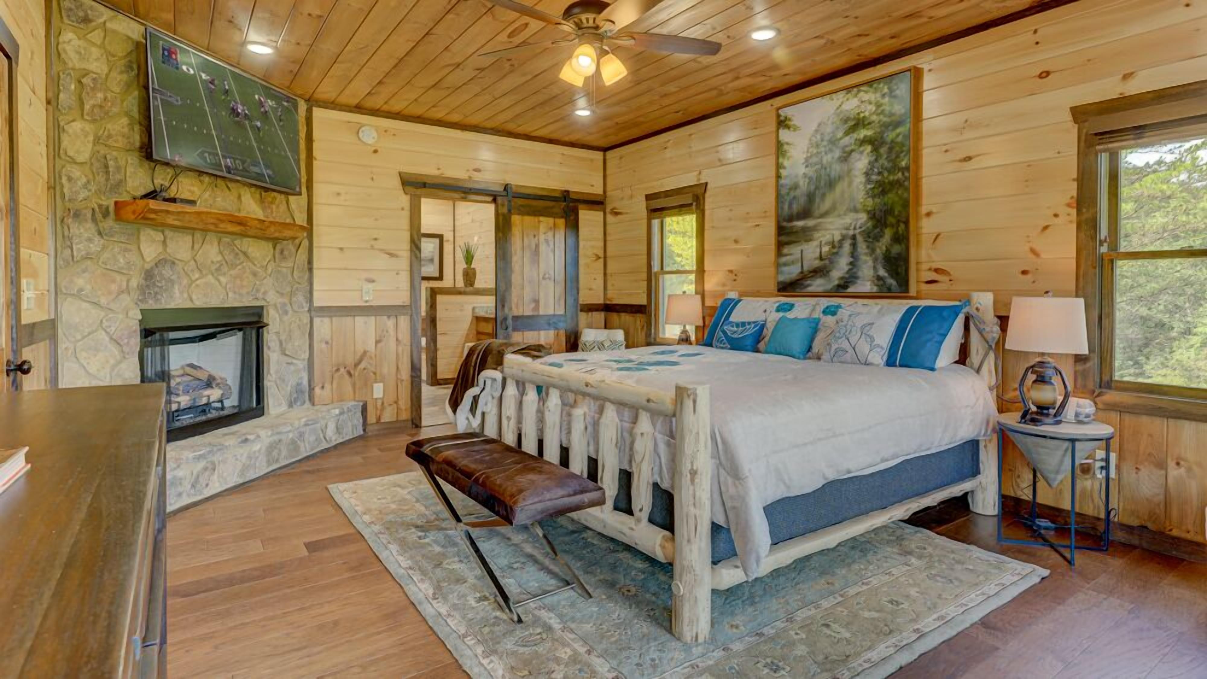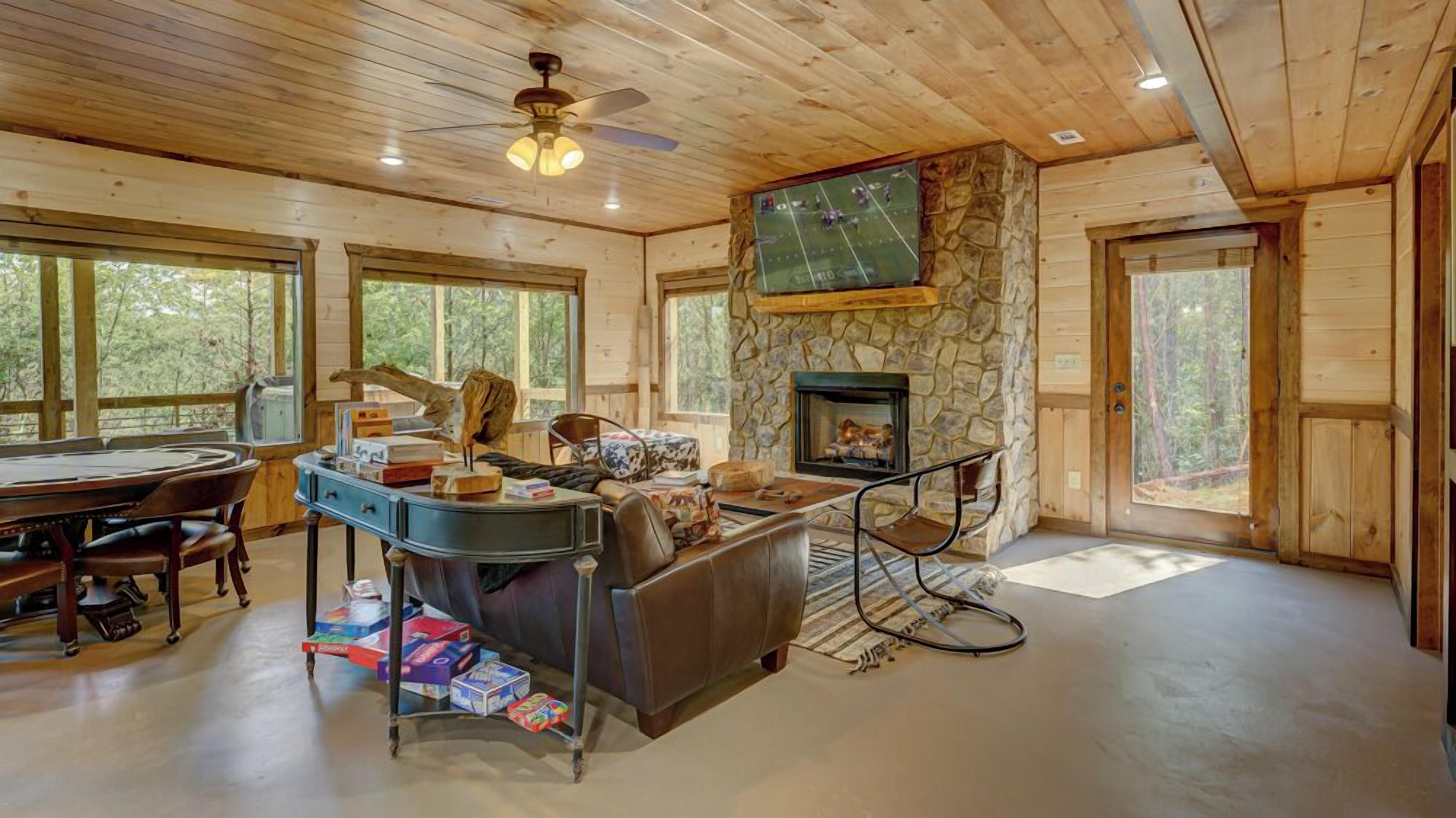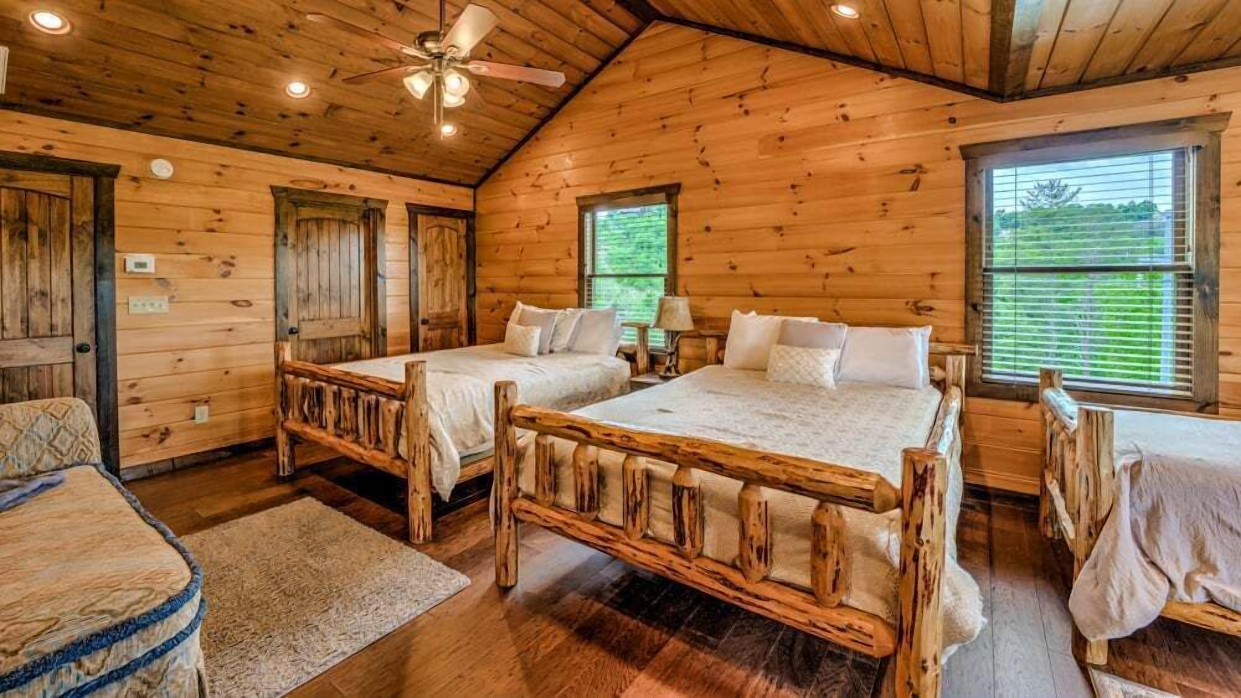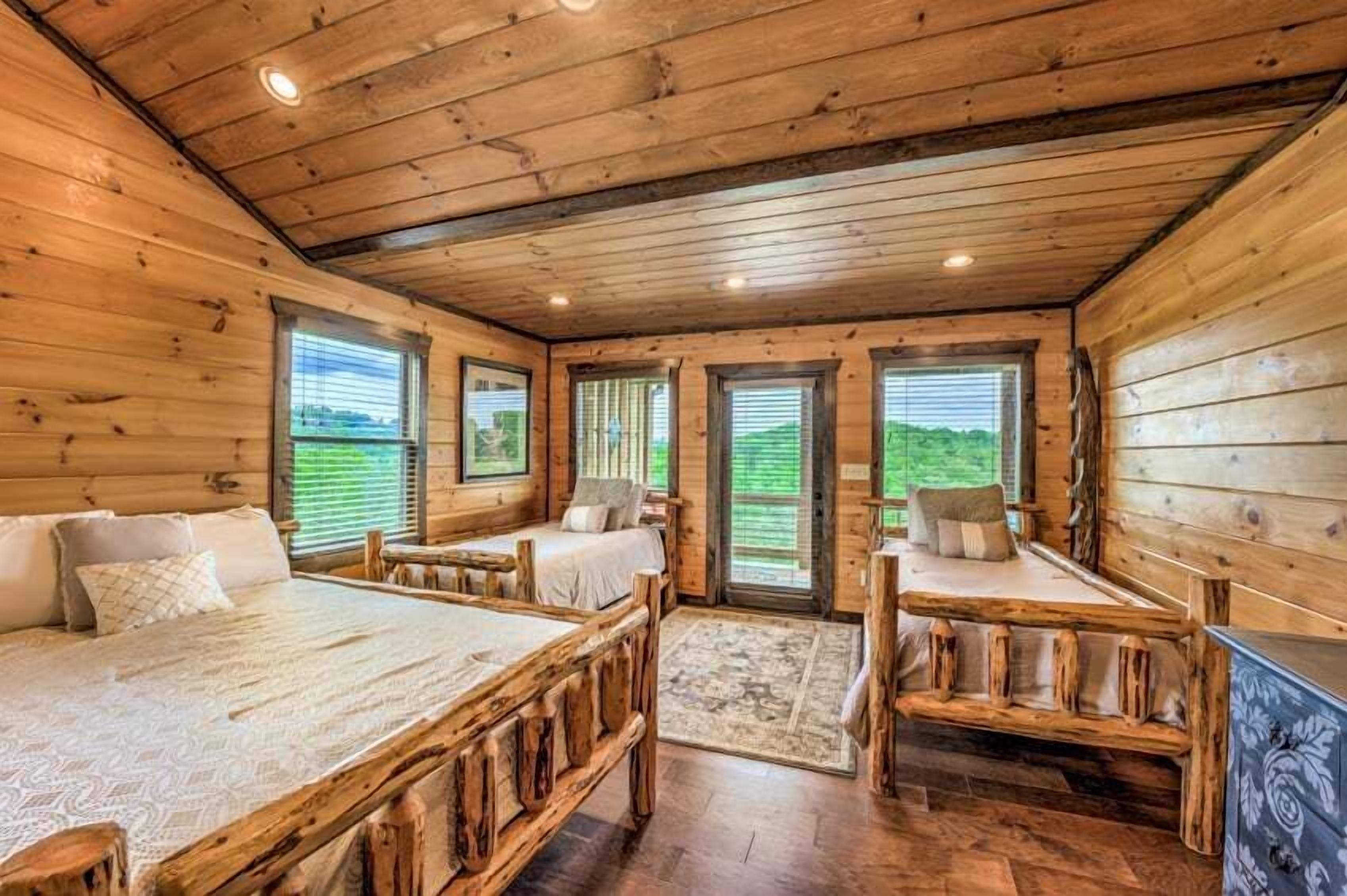 4 Leaf Clover - Pet Friendly | Mountain & River Views | Hot Tub | Pickleball Court | FirePit What if we told you that you could find a place in a gated community with a great view of the mountains, river, and railroad, and where you can see the train? Would you like to spend your stay there during your vacation? If you answer yes to that, then it's your lucky day. 4 Leaf Clover is perfect for you! Named after its owners, this is a true gem of a house. A specialty of this cabin that many others don't have? You can see the railroad track from the upstairs deck off the kid's bunk room (the Blue Ridge Train goes through on occasion) and the river from the upstairs bedroom. A wonderful surprise during your trip! As you walk inside, you'll notice the immaculate attention to detail taken in every piece of styling. From the multiple colors of luxurious wood to the massive chandelier with breathtaking 25' ceilings and large glass windows, no expense was spared to make this the perfect spot for unwinding and relaxing. You'll feel lucky to have found this beauty! The family room has lovely couches to sink into, along with a fireplace. So, curl up with a blanket, a good book, and a glass of wine, and enjoy! After you venture out of the living area, you'll be greeted by the immaculate kitchen. It is a chef's dream: the granite countertops, stainless steel appliances and the plethora of space will have you serving up some fantastic dishes. Carry your creations over to the dining area, complete with a fireplace, and share some stories while you share a meal. Get your game on with your loved ones - there's a pool table, poker table, shuffleboard, and plenty of board games inside. The basement has a wet bar with a mini refrigerator as well with stools - a great spot to post up and enjoy each other's company. If you're looking for some R&R in the great outdoors, you're in luck (again). 4 Leaf Clover has four separate balconies with plenty of seating for everyone. On the main level, you'll enjoy dining with a view, while grilling out at the gas grill. Looking for some friendly competition, 4 Leaf Clover has it's own pickleball court ready for its next match-up. When it gets chilly out, light up the outdoor fireplace. Or head down to the lower-level deck for a dip in the hot tub - such an excellent spot to spend late nights with family or friends. After a full day of fun in Blue Ridge, 4 Leaf Clover has the perfect places for you to rest your tired eyes. Retreat to the master bedroom on the main level and light up the gas fireplace. Each spacious bedroom has its own Smart TV, deck access and private bathroom. One of the most exciting parts about staying here is that 4 Leaf Clover is near some beautiful spots to do outdoor fun activities such as going to the river, fishing, kayaking, or watching trains. How wonderful is that? Such enjoyable things to do during your stay. Still deciding which place to stay? Consider 4 Leaf Clover! A beautiful place for your vacation. AmenitiesUnlimited WiFiCabin sleeps 12 (2 kings, 2 queens, 2 fulls, 2 twins)Game Room - pool table, pool table light, poker table, 4 chairs, 2 stools, board games, leather sofa, stone gas fireplace, 65” Smart TV, 2 chairs, coffee table, rug, ceiling fan, wet bar seats 3, granite countertops, mini refrigeratorOutdoor - covered front porch; main level covered deck, patio table seats 6, gas grill, rug, patio sofa, chairs, stone gas fireplace, coffee table, rug, patio swivel chairs, 2 ceiling fans; upstairs deck, 2 patio sofas, rug; second upstairs deck, patio sofa, 4 patio chairs, coffee table, rug, ceiling fan; downstairs deck, hot tub seats 6, 2 patio sofas, 2 patio love seats, 4 patio chairs, foot rests, coffee tables, rug, ceiling fans; fire pit with 6 king size Adirondack chairs; pickleball court Interior - natural wood, ceiling fansKitchen - fully equipped main level kitchen, stainless steel appliances, oven, custom cabinets, granite countertops, breakfast bar seats 2, kitchen utensils, microwave, crockpot, coffeemaker, KeurigDining Room - dining table seats 6, breakfast bar seats 2, fireplace, 42” Smart TVMedia - Cable TV, Smart TV streaming entertainment (sign-in to your subscription channels), local telephoneFamily Room - 2 leather sofas with built in electric recliners, stone gas fireplace, 65” Smart TV, 2 chairs, coffee table, side table, lamps, rugLoft - shuffleboard, sofa, rugBedrooms - master on main, king bed, 55” Smart TV, stone electric fireplace, dresser, night stands, lamps, bench, ceiling fan, rug, deck access; upstairs bedroom, king bed, 55” Smart TV, chair, dresser, night stands, lamps, rug, ceiling fan, deck access; second upstairs bedroom, 2 full beds, 2 twin beds, chaise, 65” Smart TV, dresser, night stand, lamp, rug, deck access; downstairs bedroom, 2 queen beds, 55” Smart TV, chair, dresser, night stand, lamp, rug, ceiling fanBathrooms - main level master bath, jetted tub, walk-in shower, granite top vanity; main level half bath, granite top vanity; upstairs bath, tub/shower combo, granite top vanity; second upstairs bath, walk-in shower, granite top double vanity; downstairs bath, tub/shower combo, granite top vanity; downstairs half bath, granite top vanityLaundry - washer and dryer downstairsPet Friendly - up to 2 well behaved dogs with prior management approvalCentral HVACDrive to Cabin - paved roads to cabin, gated community, concrete driveway, 2 car portico in front