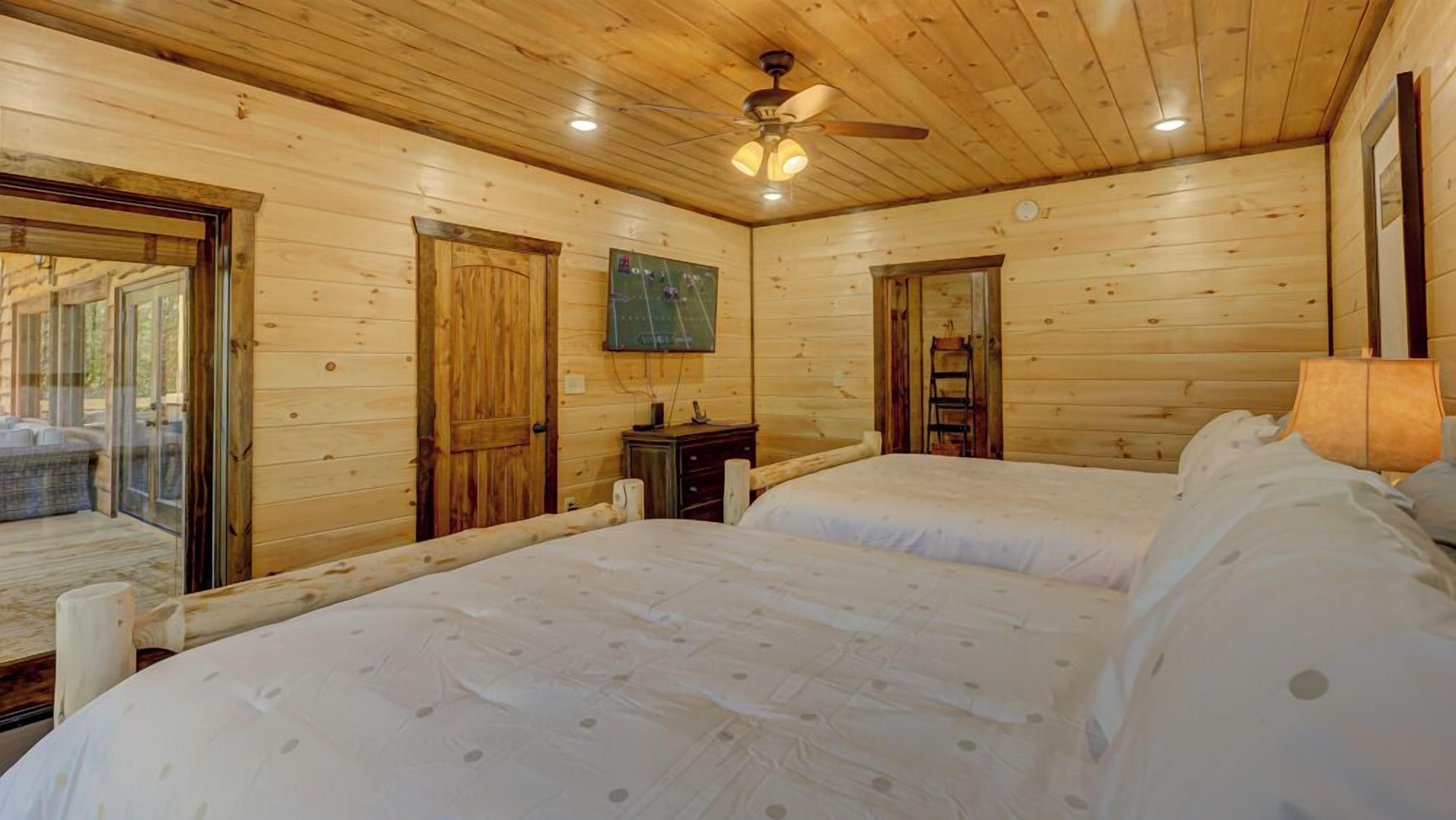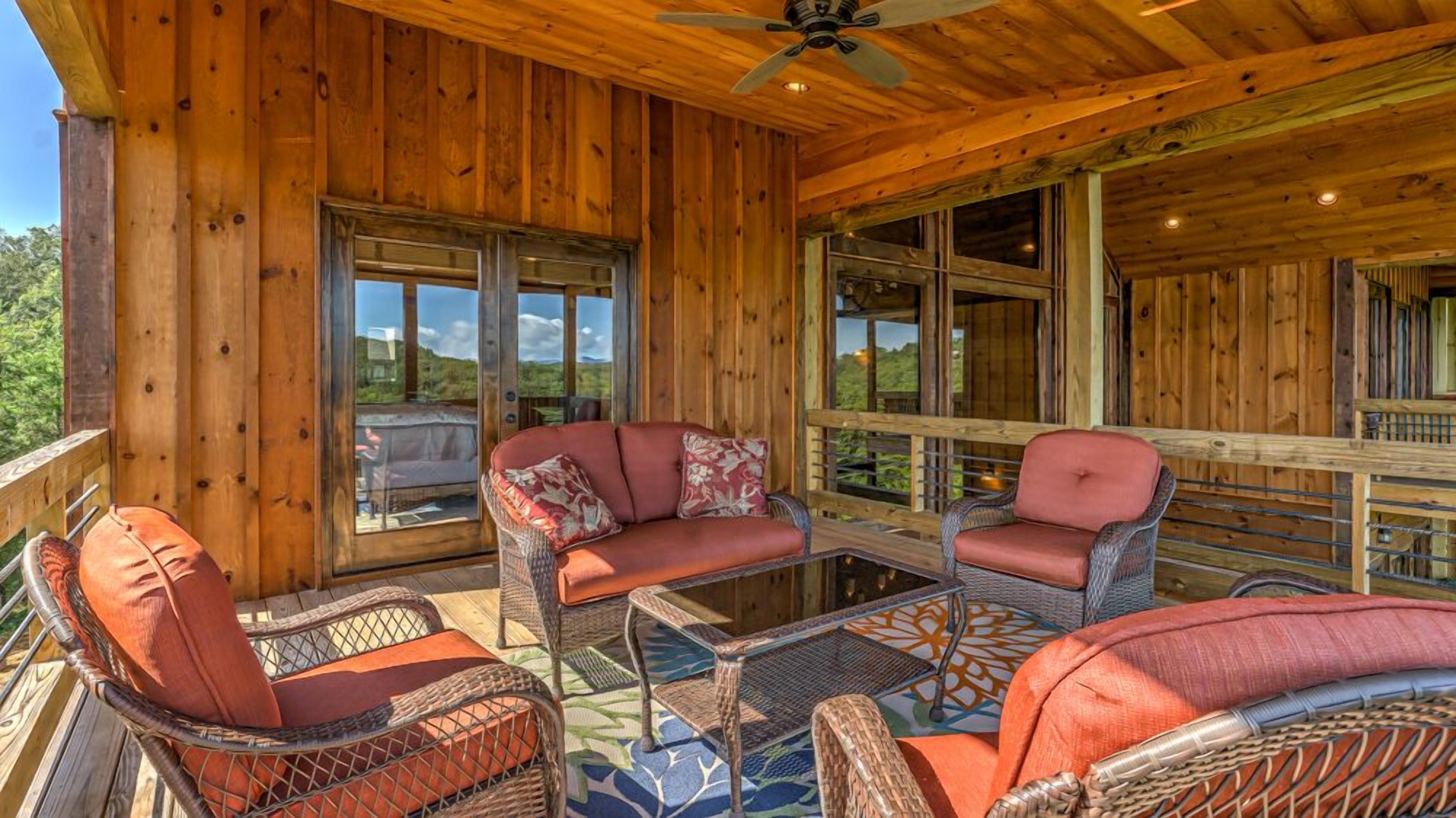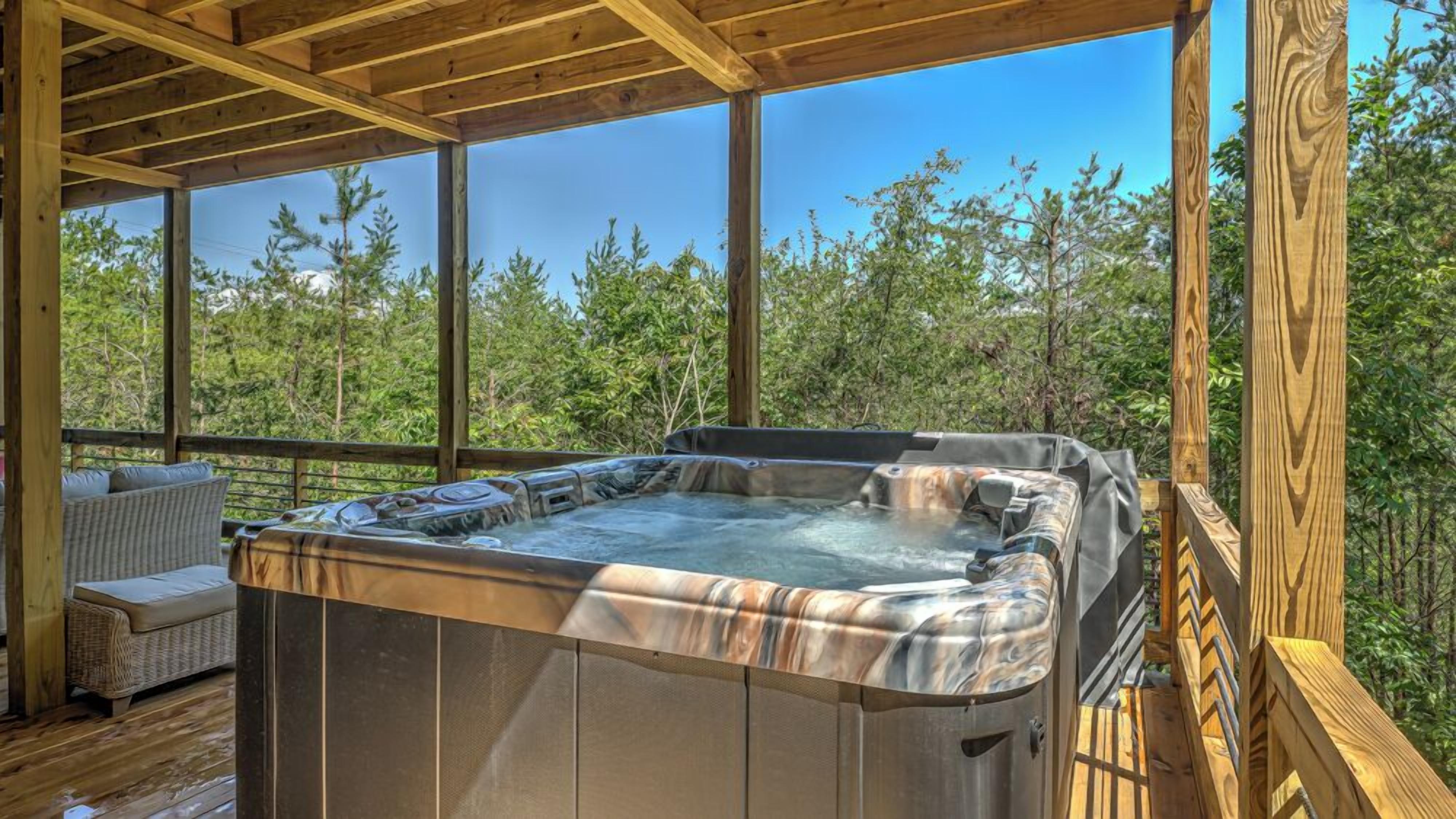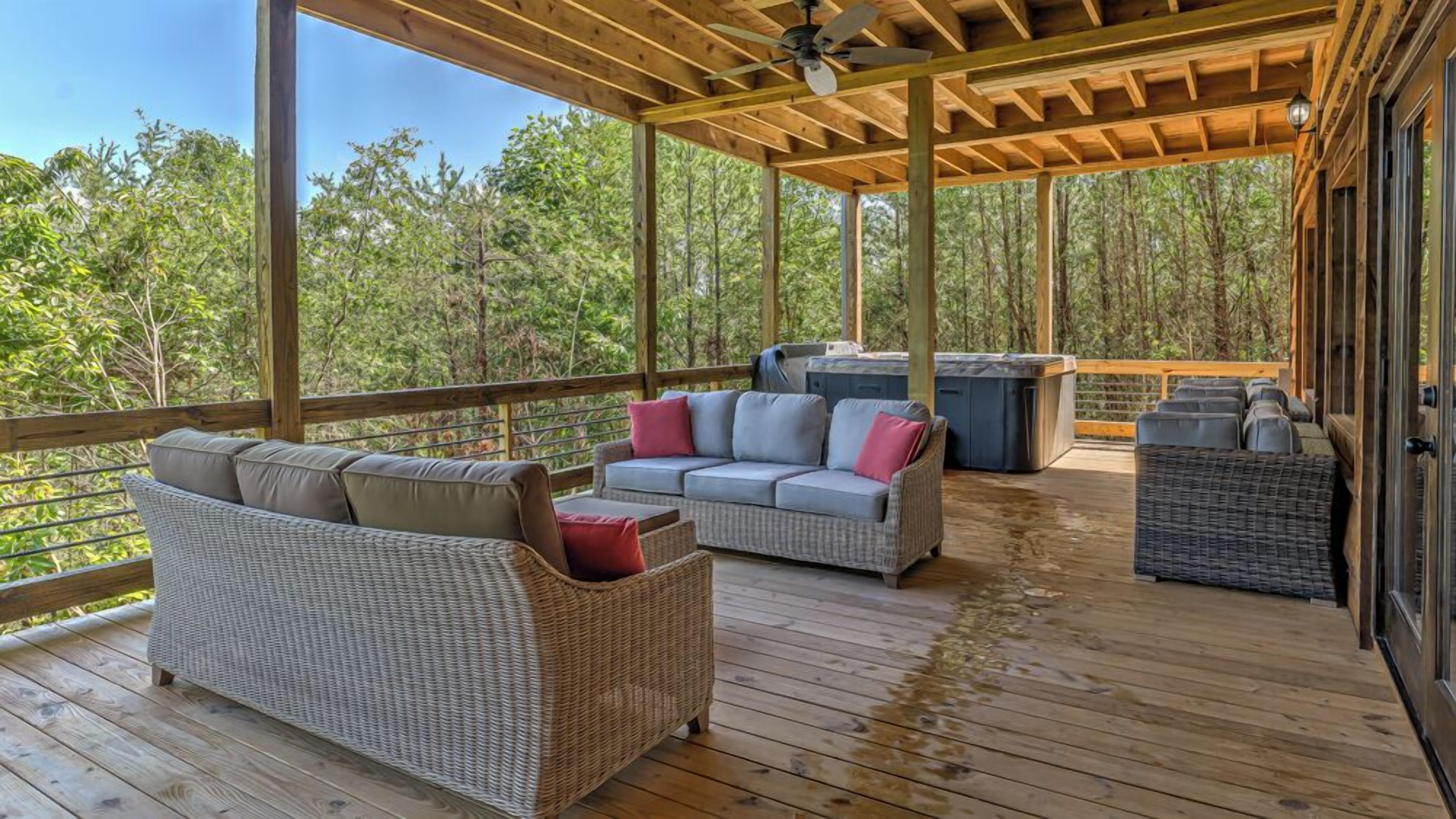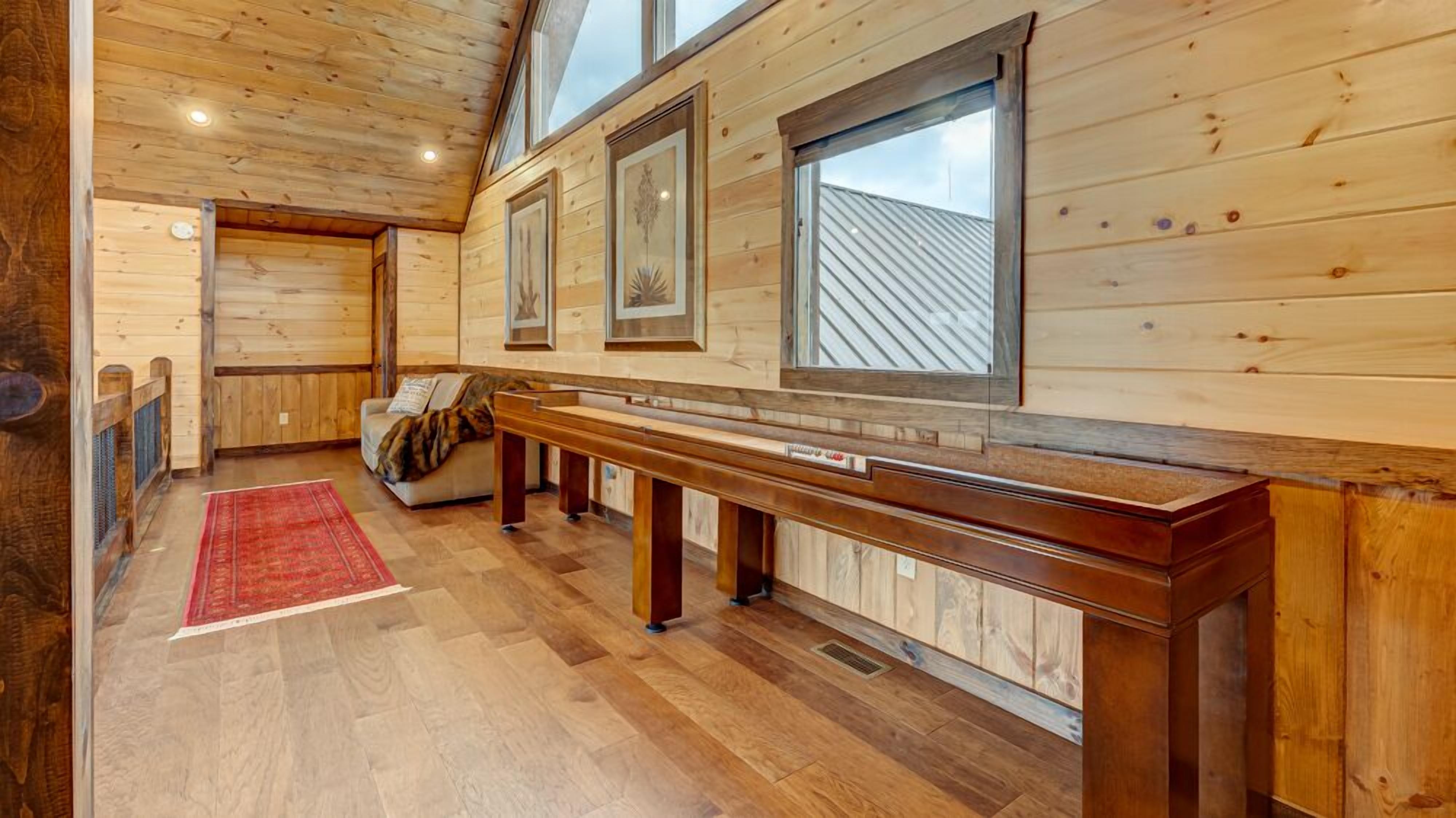 4 Leaf Clover - Pet Friendly | Mountain & River Views | Hot Tub | Pickleball Court | FirePit What if we told you that you could find a place in a gated community with a great view of the mountains, river, and railroad, and where you can see the train? Would you like to spend your stay there during your vacation? If you answer yes to that, then it's your lucky day. 4 Leaf Clover is perfect for you! Named after its owners, this is a true gem of a house. A specialty of this cabin that many others don't have? You can see the railroad track from the upstairs deck off the kid's bunk room (the Blue Ridge Train goes through on occasion) and the river from the upstairs bedroom. A wonderful surprise during your trip! As you walk inside, you'll notice the immaculate attention to detail taken in every piece of styling. From the multiple colors of luxurious wood to the massive chandelier with breathtaking 25' ceilings and large glass windows, no expense was spared to make this the perfect spot for unwinding and relaxing. You'll feel lucky to have found this beauty! The family room has lovely couches to sink into, along with a fireplace. So, curl up with a blanket, a good book, and a glass of wine, and enjoy! After you venture out of the living area, you'll be greeted by the immaculate kitchen. It is a chef's dream: the granite countertops, stainless steel appliances and the plethora of space will have you serving up some fantastic dishes. Carry your creations over to the dining area, complete with a fireplace, and share some stories while you share a meal. Get your game on with your loved ones - there's a pool table, poker table, shuffleboard, and plenty of board games inside. The basement has a wet bar with a mini refrigerator as well with stools - a great spot to post up and enjoy each other's company. If you're looking for some R&R in the great outdoors, you're in luck (again). 4 Leaf Clover has four separate balconies with plenty of seating for everyone. On the main level, you'll enjoy dining with a view, while grilling out at the gas grill. Looking for some friendly competition, 4 Leaf Clover has it's own pickleball court ready for its next match-up. When it gets chilly out, light up the outdoor fireplace. Or head down to the lower-level deck for a dip in the hot tub - such an excellent spot to spend late nights with family or friends. After a full day of fun in Blue Ridge, 4 Leaf Clover has the perfect places for you to rest your tired eyes. Retreat to the master bedroom on the main level and light up the gas fireplace. Each spacious bedroom has its own Smart TV, deck access and private bathroom. One of the most exciting parts about staying here is that 4 Leaf Clover is near some beautiful spots to do outdoor fun activities such as going to the river, fishing, kayaking, or watching trains. How wonderful is that? Such enjoyable things to do during your stay. Still deciding which place to stay? Consider 4 Leaf Clover! A beautiful place for your vacation. AmenitiesUnlimited WiFiCabin sleeps 12 (2 kings, 2 queens, 2 fulls, 2 twins)Game Room - pool table, pool table light, poker table, 4 chairs, 2 stools, board games, leather sofa, stone gas fireplace, 65” Smart TV, 2 chairs, coffee table, rug, ceiling fan, wet bar seats 3, granite countertops, mini refrigeratorOutdoor - covered front porch; main level covered deck, patio table seats 6, gas grill, rug, patio sofa, chairs, stone gas fireplace, coffee table, rug, patio swivel chairs, 2 ceiling fans; upstairs deck, 2 patio sofas, rug; second upstairs deck, patio sofa, 4 patio chairs, coffee table, rug, ceiling fan; downstairs deck, hot tub seats 6, 2 patio sofas, 2 patio love seats, 4 patio chairs, foot rests, coffee tables, rug, ceiling fans; fire pit with 6 king size Adirondack chairs; pickleball court Interior - natural wood, ceiling fansKitchen - fully equipped main level kitchen, stainless steel appliances, oven, custom cabinets, granite countertops, breakfast bar seats 2, kitchen utensils, microwave, crockpot, coffeemaker, KeurigDining Room - dining table seats 6, breakfast bar seats 2, fireplace, 42” Smart TVMedia - Cable TV, Smart TV streaming entertainment (sign-in to your subscription channels), local telephoneFamily Room - 2 leather sofas with built in electric recliners, stone gas fireplace, 65” Smart TV, 2 chairs, coffee table, side table, lamps, rugLoft - shuffleboard, sofa, rugBedrooms - master on main, king bed, 55” Smart TV, stone electric fireplace, dresser, night stands, lamps, bench, ceiling fan, rug, deck access; upstairs bedroom, king bed, 55” Smart TV, chair, dresser, night stands, lamps, rug, ceiling fan, deck access; second upstairs bedroom, 2 full beds, 2 twin beds, chaise, 65” Smart TV, dresser, night stand, lamp, rug, deck access; downstairs bedroom, 2 queen beds, 55” Smart TV, chair, dresser, night stand, lamp, rug, ceiling fanBathrooms - main level master bath, jetted tub, walk-in shower, granite top vanity; main level half bath, granite top vanity; upstairs bath, tub/shower combo, granite top vanity; second upstairs bath, walk-in shower, granite top double vanity; downstairs bath, tub/shower combo, granite top vanity; downstairs half bath, granite top vanityLaundry - washer and dryer downstairsPet Friendly - up to 2 well behaved dogs with prior management approvalCentral HVACDrive to Cabin - paved roads to cabin, gated community, concrete driveway, 2 car portico in front
