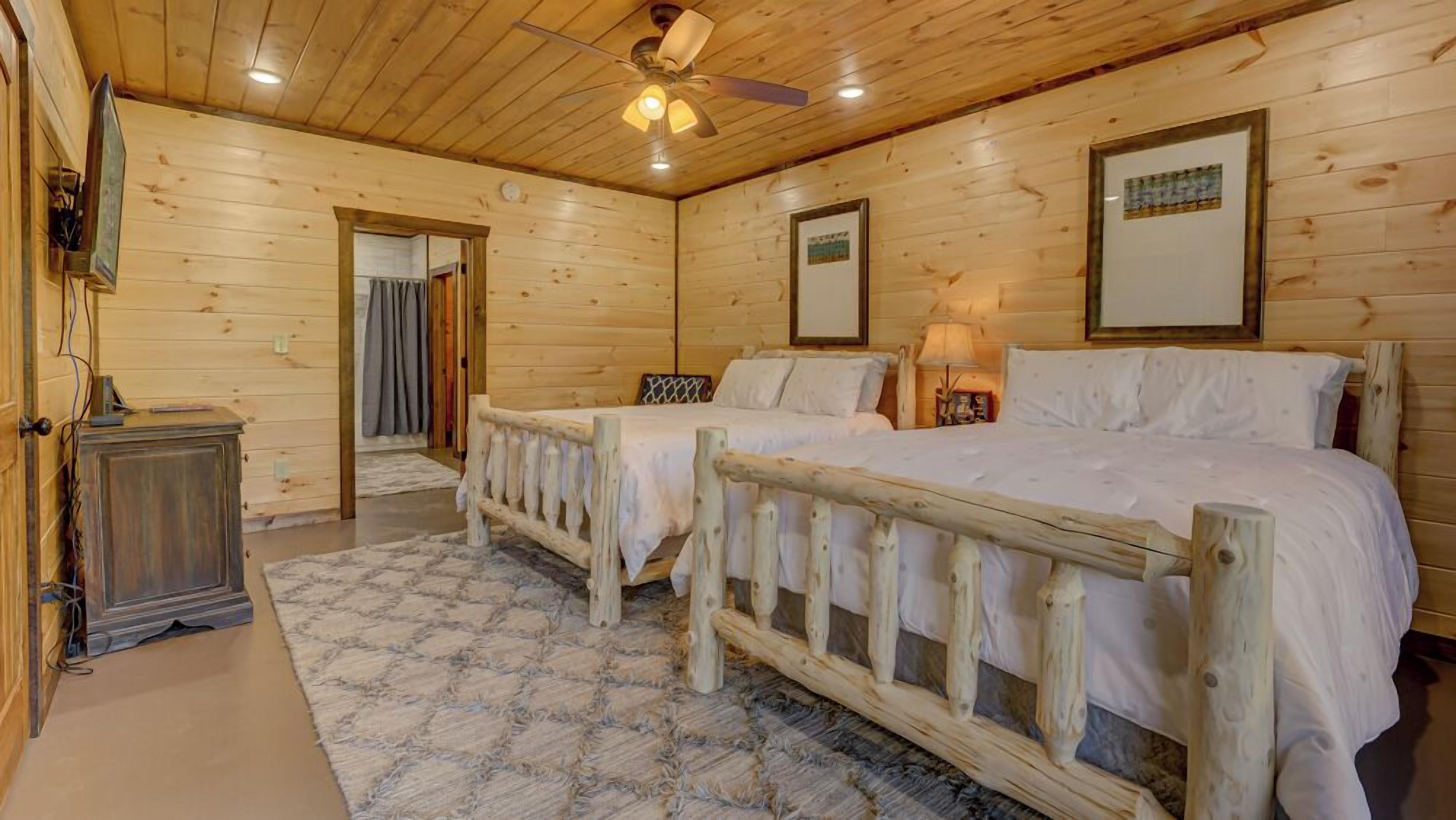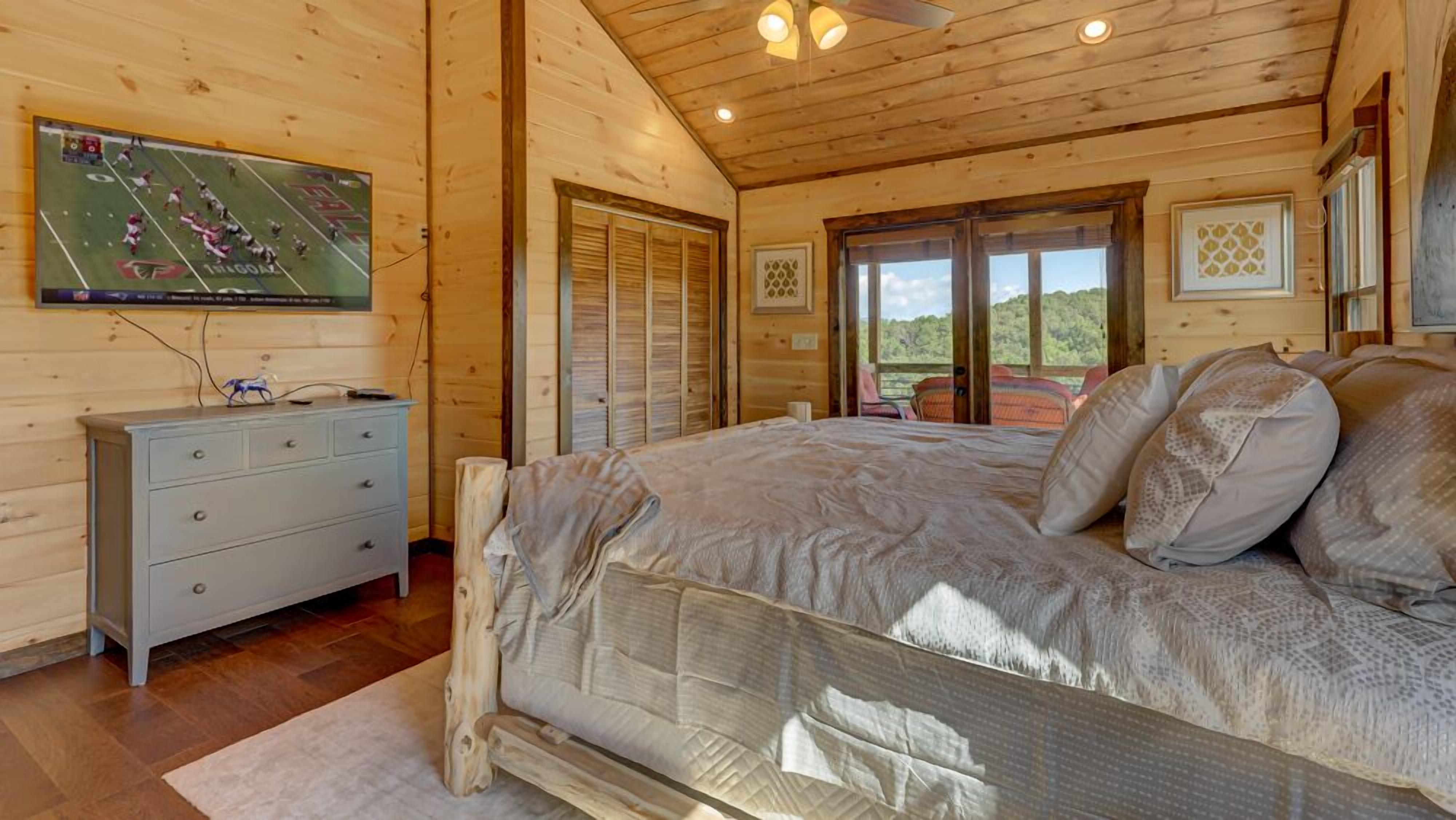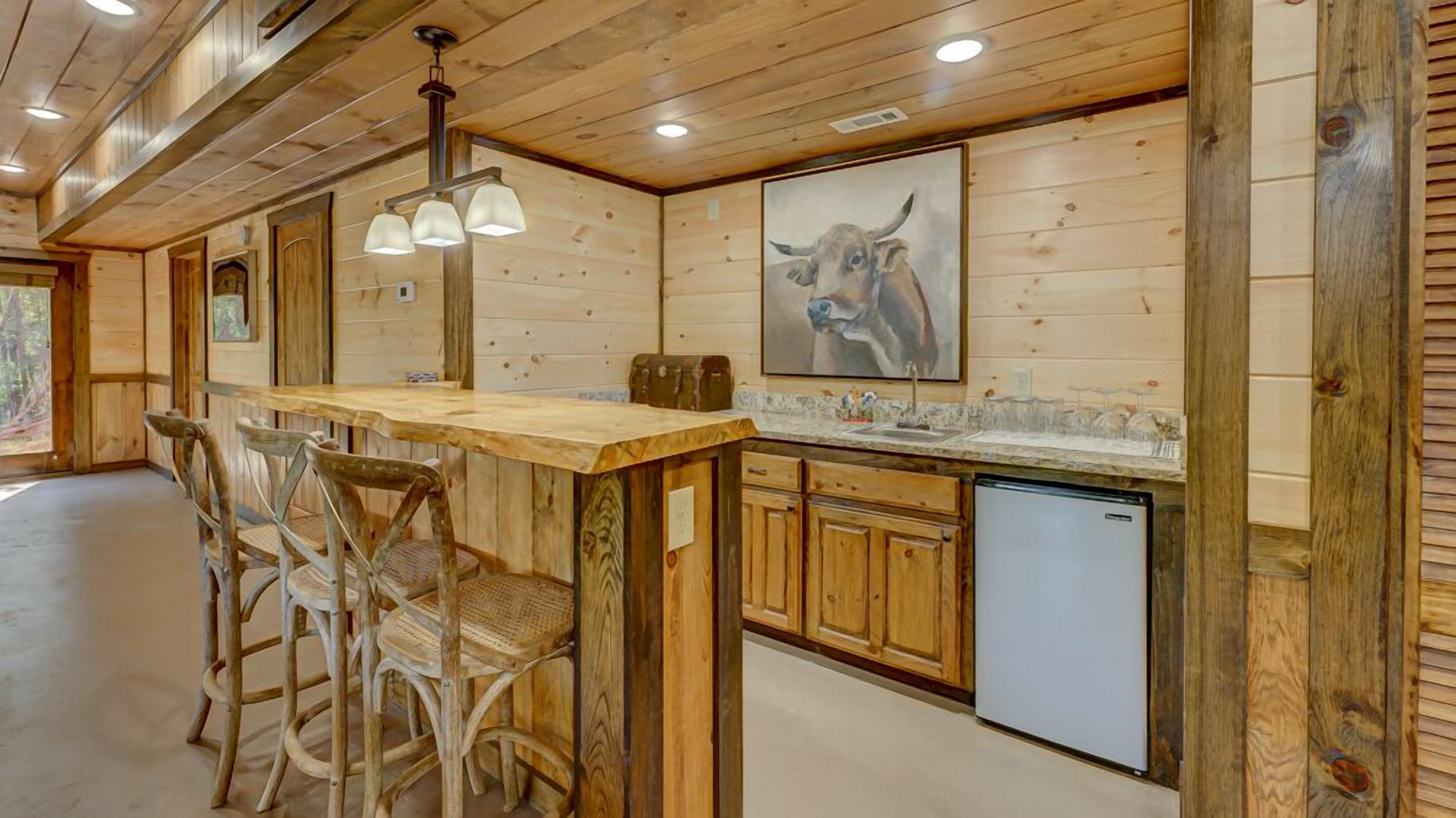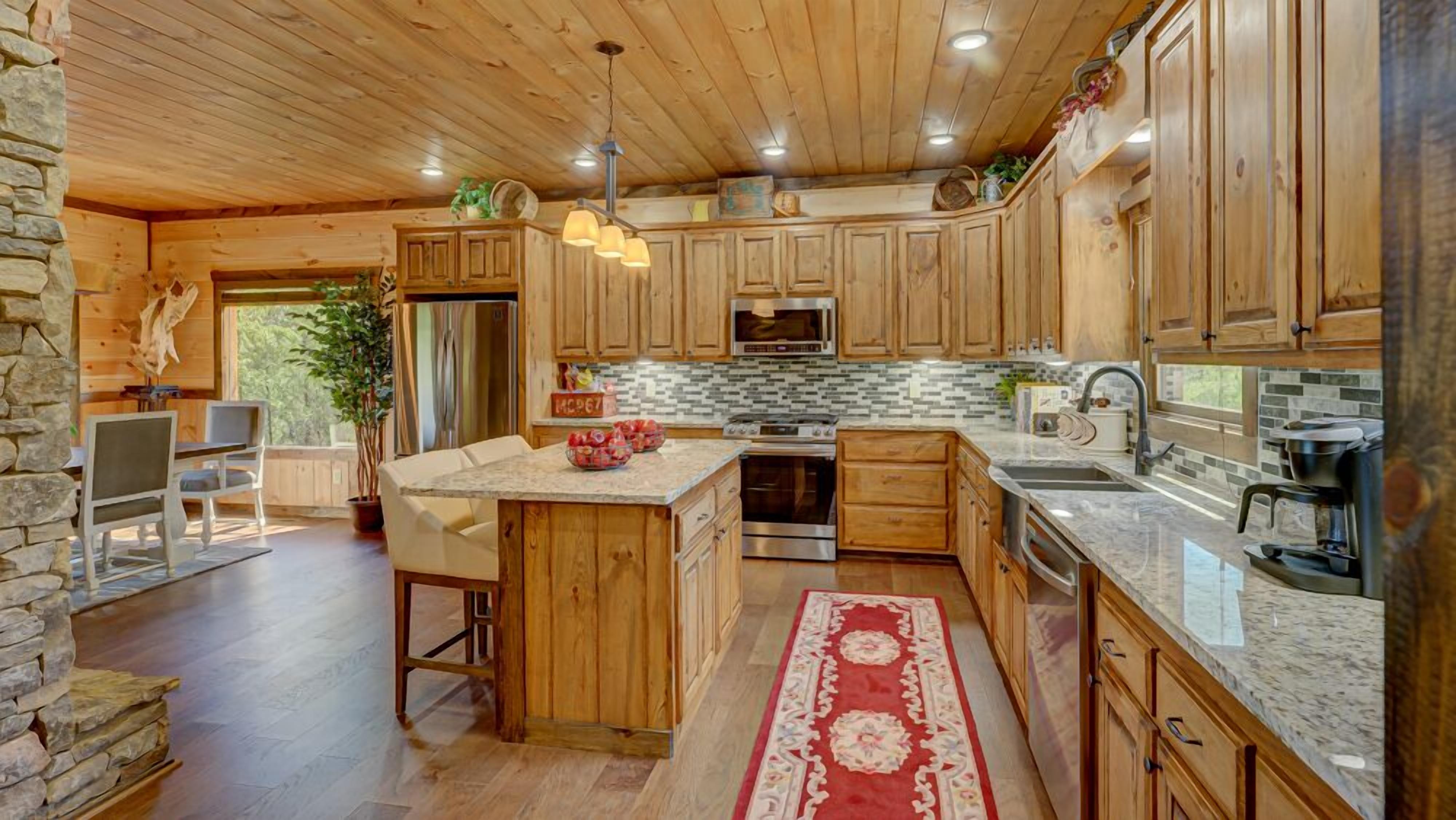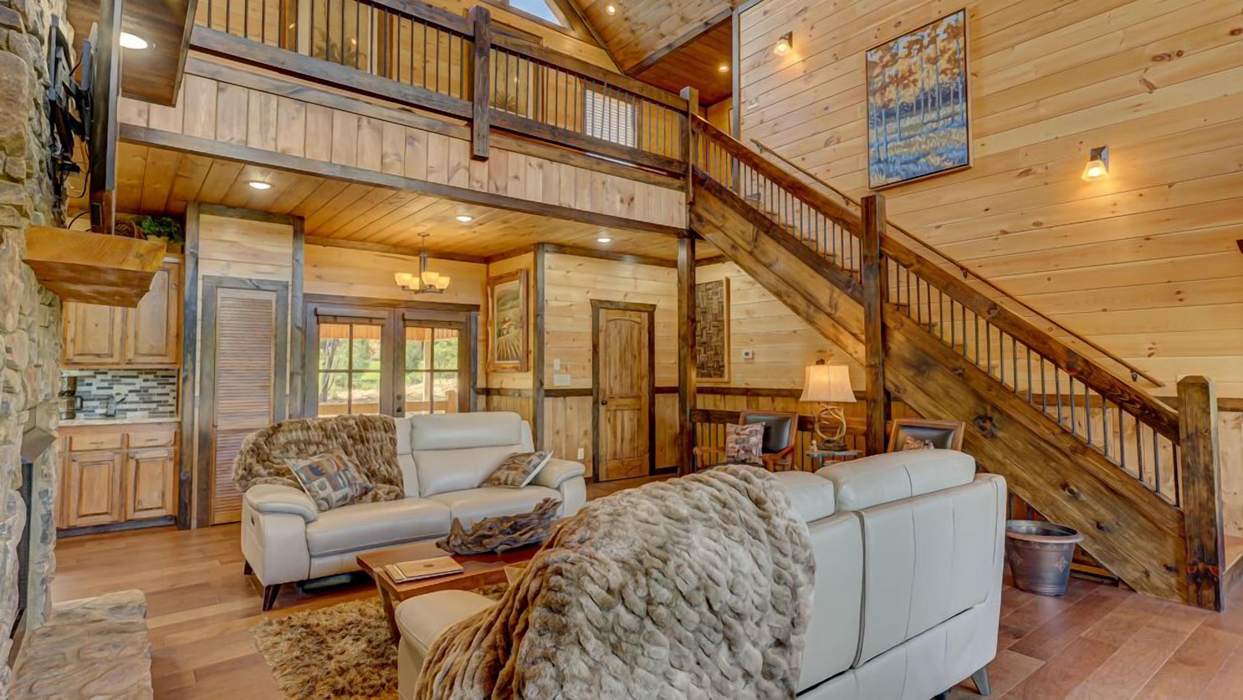 4 Leaf Clover - Pet Friendly | Mountain & River Views | Hot Tub | Pickleball Court | FirePit What if we told you that you could find a place in a gated community with a great view of the mountains, river, and railroad, and where you can see the train? Would you like to spend your stay there during your vacation? If you answer yes to that, then it's your lucky day. 4 Leaf Clover is perfect for you! Named after its owners, this is a true gem of a house. A specialty of this cabin that many others don't have? You can see the railroad track from the upstairs deck off the kid's bunk room (the Blue Ridge Train goes through on occasion) and the river from the upstairs bedroom. A wonderful surprise during your trip! As you walk inside, you'll notice the immaculate attention to detail taken in every piece of styling. From the multiple colors of luxurious wood to the massive chandelier with breathtaking 25' ceilings and large glass windows, no expense was spared to make this the perfect spot for unwinding and relaxing. You'll feel lucky to have found this beauty! The family room has lovely couches to sink into, along with a fireplace. So, curl up with a blanket, a good book, and a glass of wine, and enjoy! After you venture out of the living area, you'll be greeted by the immaculate kitchen. It is a chef's dream: the granite countertops, stainless steel appliances and the plethora of space will have you serving up some fantastic dishes. Carry your creations over to the dining area, complete with a fireplace, and share some stories while you share a meal. Get your game on with your loved ones - there's a pool table, poker table, shuffleboard, and plenty of board games inside. The basement has a wet bar with a mini refrigerator as well with stools - a great spot to post up and enjoy each other's company. If you're looking for some R&R in the great outdoors, you're in luck (again). 4 Leaf Clover has four separate balconies with plenty of seating for everyone. On the main level, you'll enjoy dining with a view, while grilling out at the gas grill. Looking for some friendly competition, 4 Leaf Clover has it's own pickleball court ready for its next match-up. When it gets chilly out, light up the outdoor fireplace. Or head down to the lower-level deck for a dip in the hot tub - such an excellent spot to spend late nights with family or friends. After a full day of fun in Blue Ridge, 4 Leaf Clover has the perfect places for you to rest your tired eyes. Retreat to the master bedroom on the main level and light up the gas fireplace. Each spacious bedroom has its own Smart TV, deck access and private bathroom. One of the most exciting parts about staying here is that 4 Leaf Clover is near some beautiful spots to do outdoor fun activities such as going to the river, fishing, kayaking, or watching trains. How wonderful is that? Such enjoyable things to do during your stay. Still deciding which place to stay? Consider 4 Leaf Clover! A beautiful place for your vacation. AmenitiesUnlimited WiFiCabin sleeps 12 (2 kings, 2 queens, 2 fulls, 2 twins)Game Room - pool table, pool table light, poker table, 4 chairs, 2 stools, board games, leather sofa, stone gas fireplace, 65” Smart TV, 2 chairs, coffee table, rug, ceiling fan, wet bar seats 3, granite countertops, mini refrigeratorOutdoor - covered front porch; main level covered deck, patio table seats 6, gas grill, rug, patio sofa, chairs, stone gas fireplace, coffee table, rug, patio swivel chairs, 2 ceiling fans; upstairs deck, 2 patio sofas, rug; second upstairs deck, patio sofa, 4 patio chairs, coffee table, rug, ceiling fan; downstairs deck, hot tub seats 6, 2 patio sofas, 2 patio love seats, 4 patio chairs, foot rests, coffee tables, rug, ceiling fans; fire pit with 6 king size Adirondack chairs; pickleball court Interior - natural wood, ceiling fansKitchen - fully equipped main level kitchen, stainless steel appliances, oven, custom cabinets, granite countertops, breakfast bar seats 2, kitchen utensils, microwave, crockpot, coffeemaker, KeurigDining Room - dining table seats 6, breakfast bar seats 2, fireplace, 42” Smart TVMedia - Cable TV, Smart TV streaming entertainment (sign-in to your subscription channels), local telephoneFamily Room - 2 leather sofas with built in electric recliners, stone gas fireplace, 65” Smart TV, 2 chairs, coffee table, side table, lamps, rugLoft - shuffleboard, sofa, rugBedrooms - master on main, king bed, 55” Smart TV, stone electric fireplace, dresser, night stands, lamps, bench, ceiling fan, rug, deck access; upstairs bedroom, king bed, 55” Smart TV, chair, dresser, night stands, lamps, rug, ceiling fan, deck access; second upstairs bedroom, 2 full beds, 2 twin beds, chaise, 65” Smart TV, dresser, night stand, lamp, rug, deck access; downstairs bedroom, 2 queen beds, 55” Smart TV, chair, dresser, night stand, lamp, rug, ceiling fanBathrooms - main level master bath, jetted tub, walk-in shower, granite top vanity; main level half bath, granite top vanity; upstairs bath, tub/shower combo, granite top vanity; second upstairs bath, walk-in shower, granite top double vanity; downstairs bath, tub/shower combo, granite top vanity; downstairs half bath, granite top vanityLaundry - washer and dryer downstairsPet Friendly - up to 2 well behaved dogs with prior management approvalCentral HVACDrive to Cabin - paved roads to cabin, gated community, concrete driveway, 2 car portico in front
