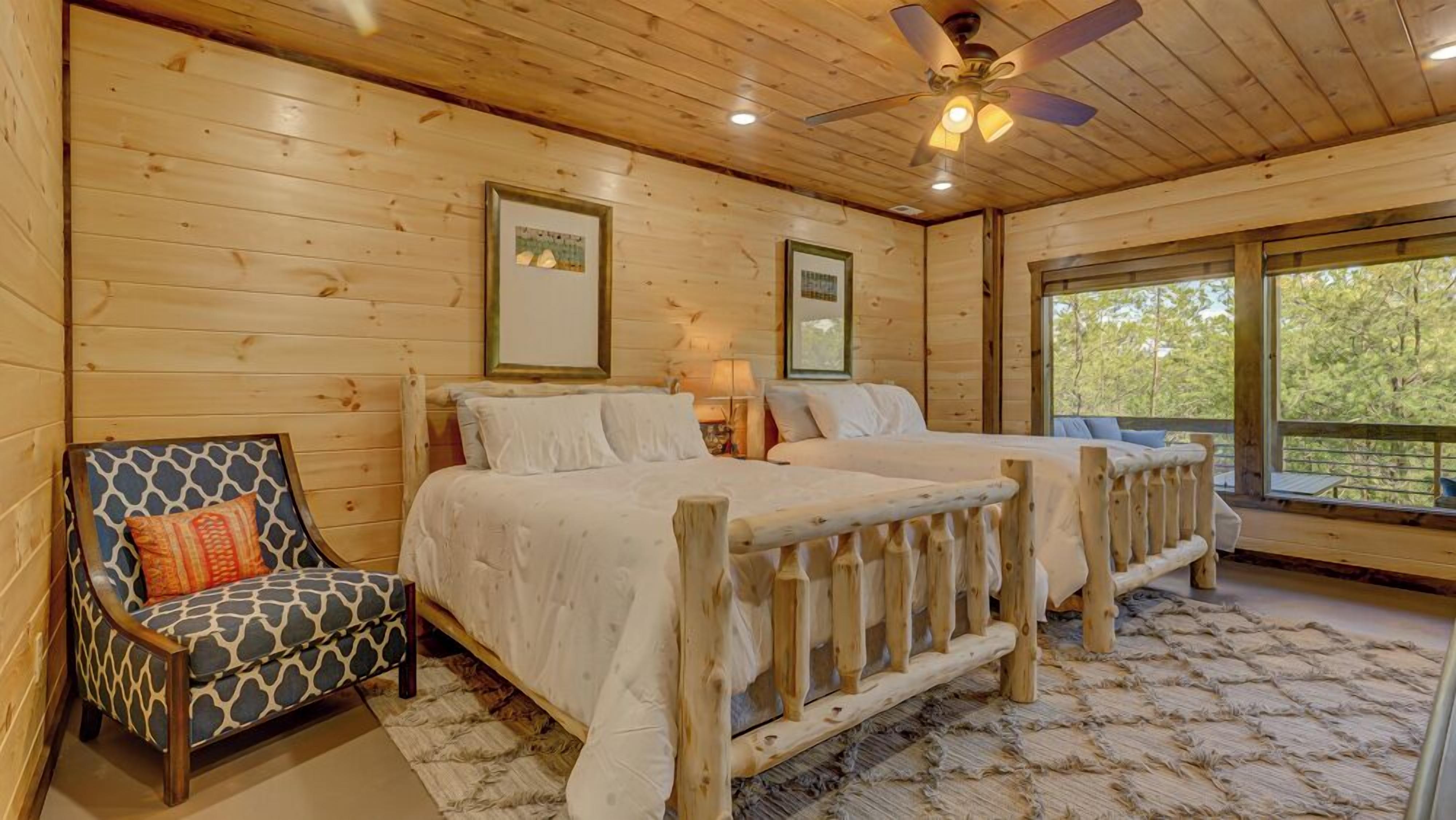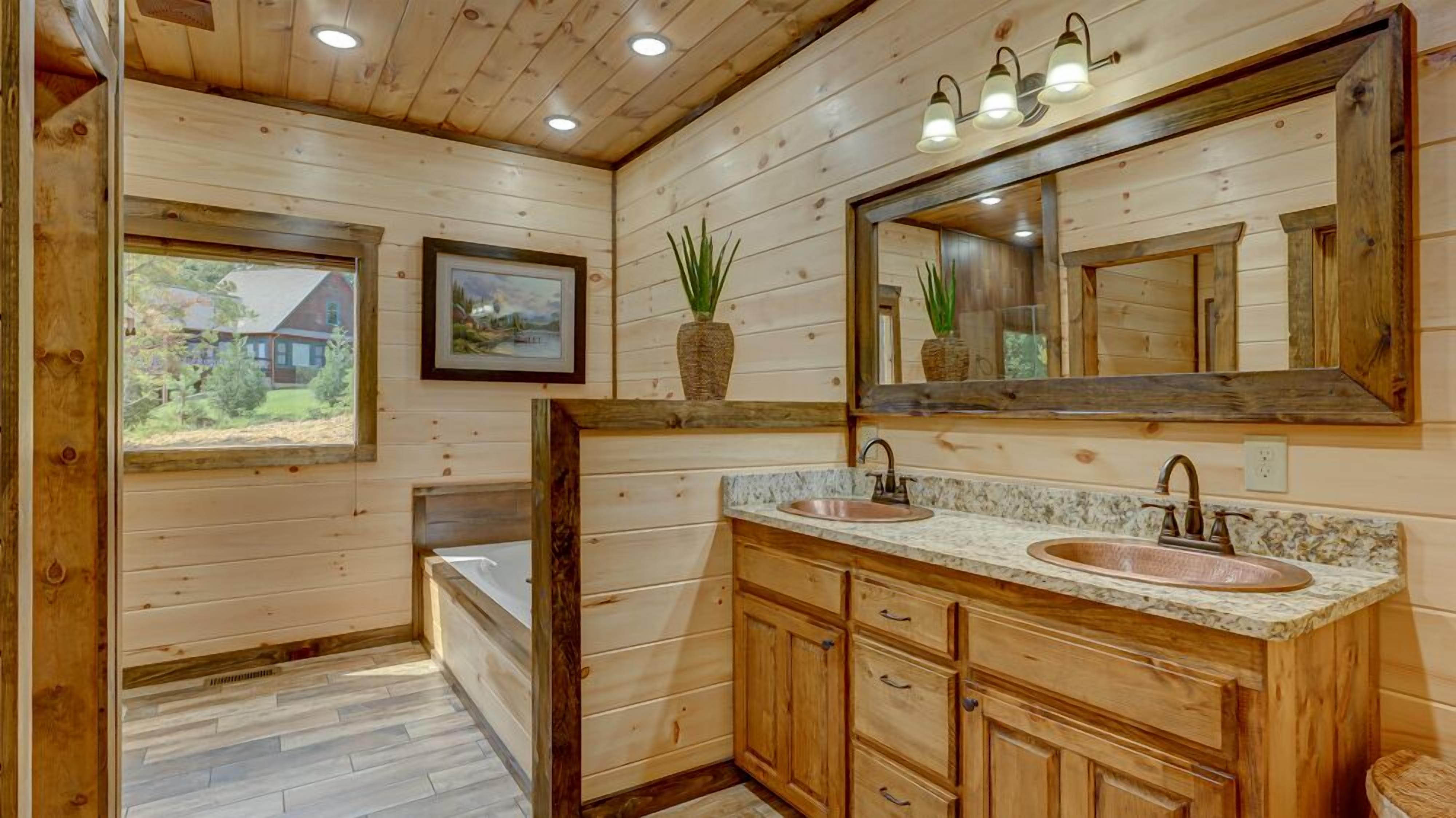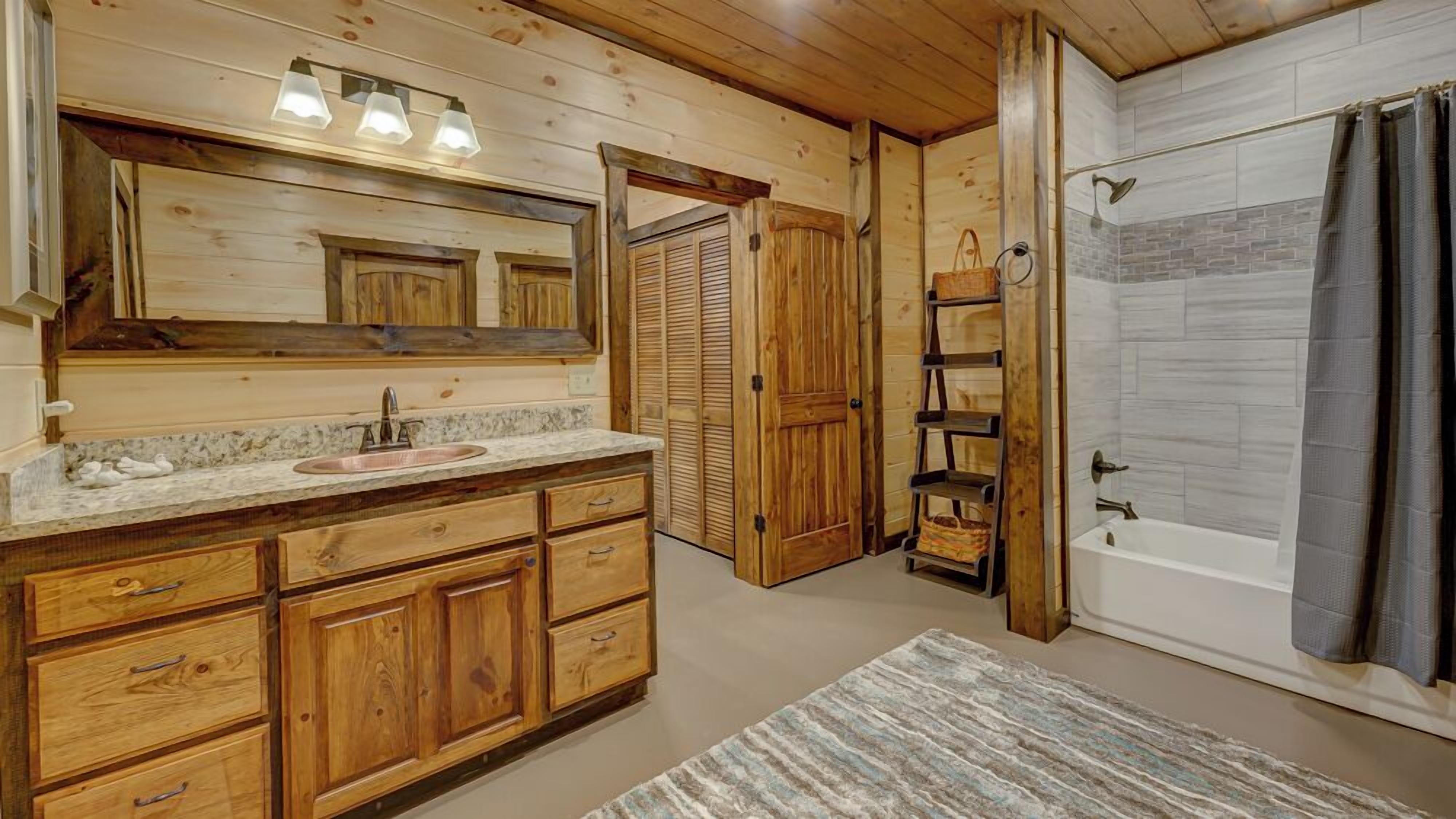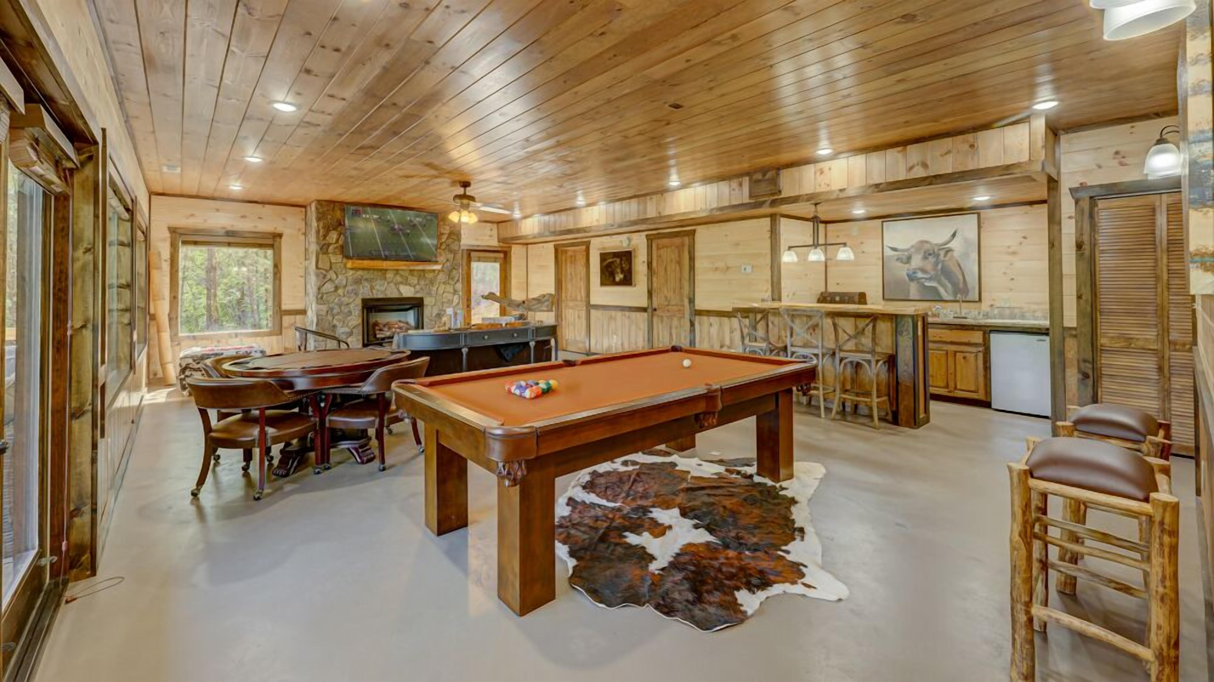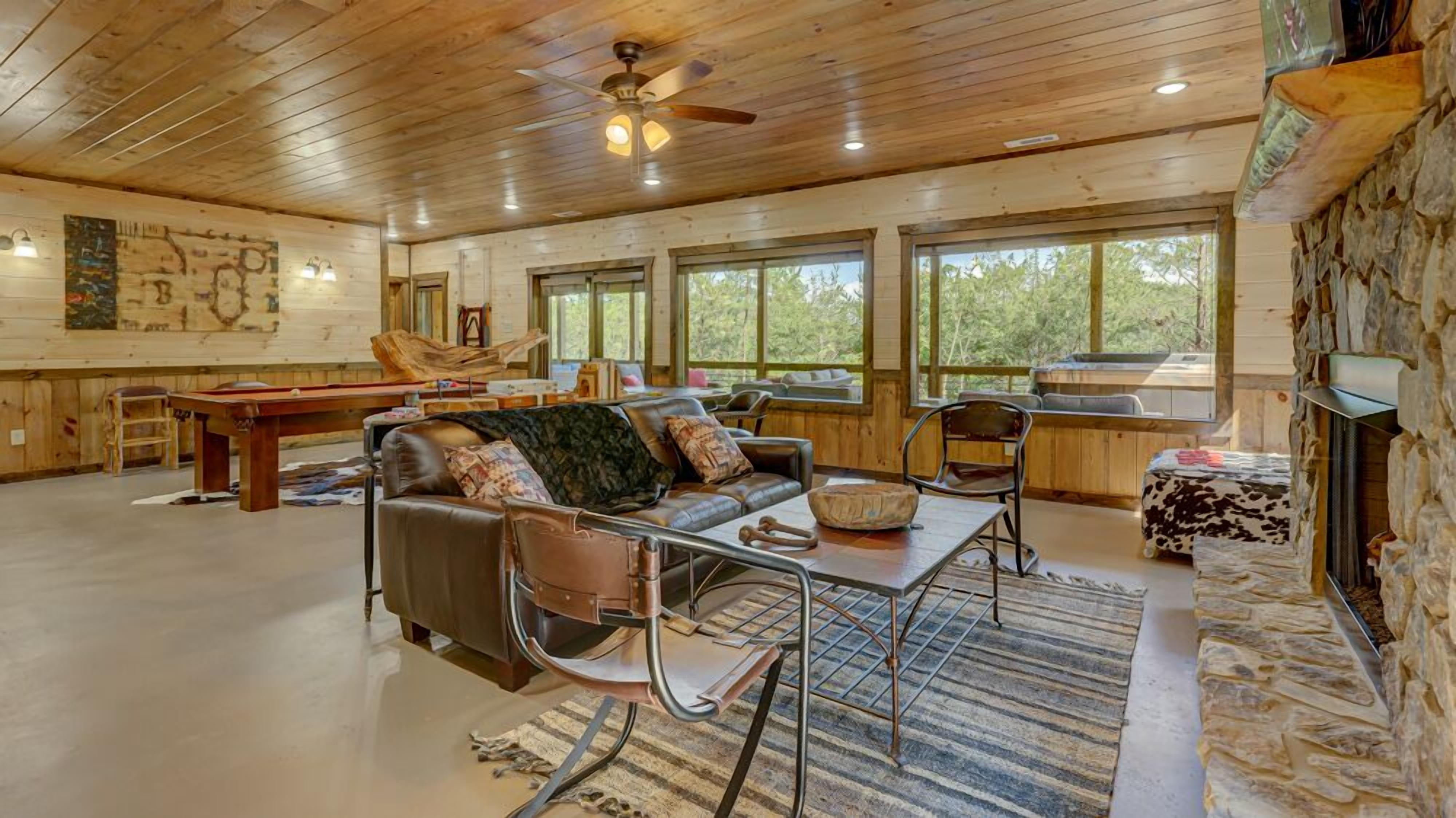 4 Leaf Clover - Pet Friendly | Mountain & River Views | Hot Tub | Pickleball Court | FirePit What if we told you that you could find a place in a gated community with a great view of the mountains, river, and railroad, and where you can see the train? Would you like to spend your stay there during your vacation? If you answer yes to that, then it's your lucky day. 4 Leaf Clover is perfect for you! Named after its owners, this is a true gem of a house. A specialty of this cabin that many others don't have? You can see the railroad track from the upstairs deck off the kid's bunk room (the Blue Ridge Train goes through on occasion) and the river from the upstairs bedroom. A wonderful surprise during your trip! As you walk inside, you'll notice the immaculate attention to detail taken in every piece of styling. From the multiple colors of luxurious wood to the massive chandelier with breathtaking 25' ceilings and large glass windows, no expense was spared to make this the perfect spot for unwinding and relaxing. You'll feel lucky to have found this beauty! The family room has lovely couches to sink into, along with a fireplace. So, curl up with a blanket, a good book, and a glass of wine, and enjoy! After you venture out of the living area, you'll be greeted by the immaculate kitchen. It is a chef's dream: the granite countertops, stainless steel appliances and the plethora of space will have you serving up some fantastic dishes. Carry your creations over to the dining area, complete with a fireplace, and share some stories while you share a meal. Get your game on with your loved ones - there's a pool table, poker table, shuffleboard, and plenty of board games inside. The basement has a wet bar with a mini refrigerator as well with stools - a great spot to post up and enjoy each other's company. If you're looking for some R&R in the great outdoors, you're in luck (again). 4 Leaf Clover has four separate balconies with plenty of seating for everyone. On the main level, you'll enjoy dining with a view, while grilling out at the gas grill. Looking for some friendly competition, 4 Leaf Clover has it's own pickleball court ready for its next match-up. When it gets chilly out, light up the outdoor fireplace. Or head down to the lower-level deck for a dip in the hot tub - such an excellent spot to spend late nights with family or friends. After a full day of fun in Blue Ridge, 4 Leaf Clover has the perfect places for you to rest your tired eyes. Retreat to the master bedroom on the main level and light up the gas fireplace. Each spacious bedroom has its own Smart TV, deck access and private bathroom. One of the most exciting parts about staying here is that 4 Leaf Clover is near some beautiful spots to do outdoor fun activities such as going to the river, fishing, kayaking, or watching trains. How wonderful is that? Such enjoyable things to do during your stay. Still deciding which place to stay? Consider 4 Leaf Clover! A beautiful place for your vacation. AmenitiesUnlimited WiFiCabin sleeps 12 (2 kings, 2 queens, 2 fulls, 2 twins)Game Room - pool table, pool table light, poker table, 4 chairs, 2 stools, board games, leather sofa, stone gas fireplace, 65” Smart TV, 2 chairs, coffee table, rug, ceiling fan, wet bar seats 3, granite countertops, mini refrigeratorOutdoor - covered front porch; main level covered deck, patio table seats 6, gas grill, rug, patio sofa, chairs, stone gas fireplace, coffee table, rug, patio swivel chairs, 2 ceiling fans; upstairs deck, 2 patio sofas, rug; second upstairs deck, patio sofa, 4 patio chairs, coffee table, rug, ceiling fan; downstairs deck, hot tub seats 6, 2 patio sofas, 2 patio love seats, 4 patio chairs, foot rests, coffee tables, rug, ceiling fans; fire pit with 6 king size Adirondack chairs; pickleball court Interior - natural wood, ceiling fansKitchen - fully equipped main level kitchen, stainless steel appliances, oven, custom cabinets, granite countertops, breakfast bar seats 2, kitchen utensils, microwave, crockpot, coffeemaker, KeurigDining Room - dining table seats 6, breakfast bar seats 2, fireplace, 42” Smart TVMedia - Cable TV, Smart TV streaming entertainment (sign-in to your subscription channels), local telephoneFamily Room - 2 leather sofas with built in electric recliners, stone gas fireplace, 65” Smart TV, 2 chairs, coffee table, side table, lamps, rugLoft - shuffleboard, sofa, rugBedrooms - master on main, king bed, 55” Smart TV, stone electric fireplace, dresser, night stands, lamps, bench, ceiling fan, rug, deck access; upstairs bedroom, king bed, 55” Smart TV, chair, dresser, night stands, lamps, rug, ceiling fan, deck access; second upstairs bedroom, 2 full beds, 2 twin beds, chaise, 65” Smart TV, dresser, night stand, lamp, rug, deck access; downstairs bedroom, 2 queen beds, 55” Smart TV, chair, dresser, night stand, lamp, rug, ceiling fanBathrooms - main level master bath, jetted tub, walk-in shower, granite top vanity; main level half bath, granite top vanity; upstairs bath, tub/shower combo, granite top vanity; second upstairs bath, walk-in shower, granite top double vanity; downstairs bath, tub/shower combo, granite top vanity; downstairs half bath, granite top vanityLaundry - washer and dryer downstairsPet Friendly - up to 2 well behaved dogs with prior management approvalCentral HVACDrive to Cabin - paved roads to cabin, gated community, concrete driveway, 2 car portico in front