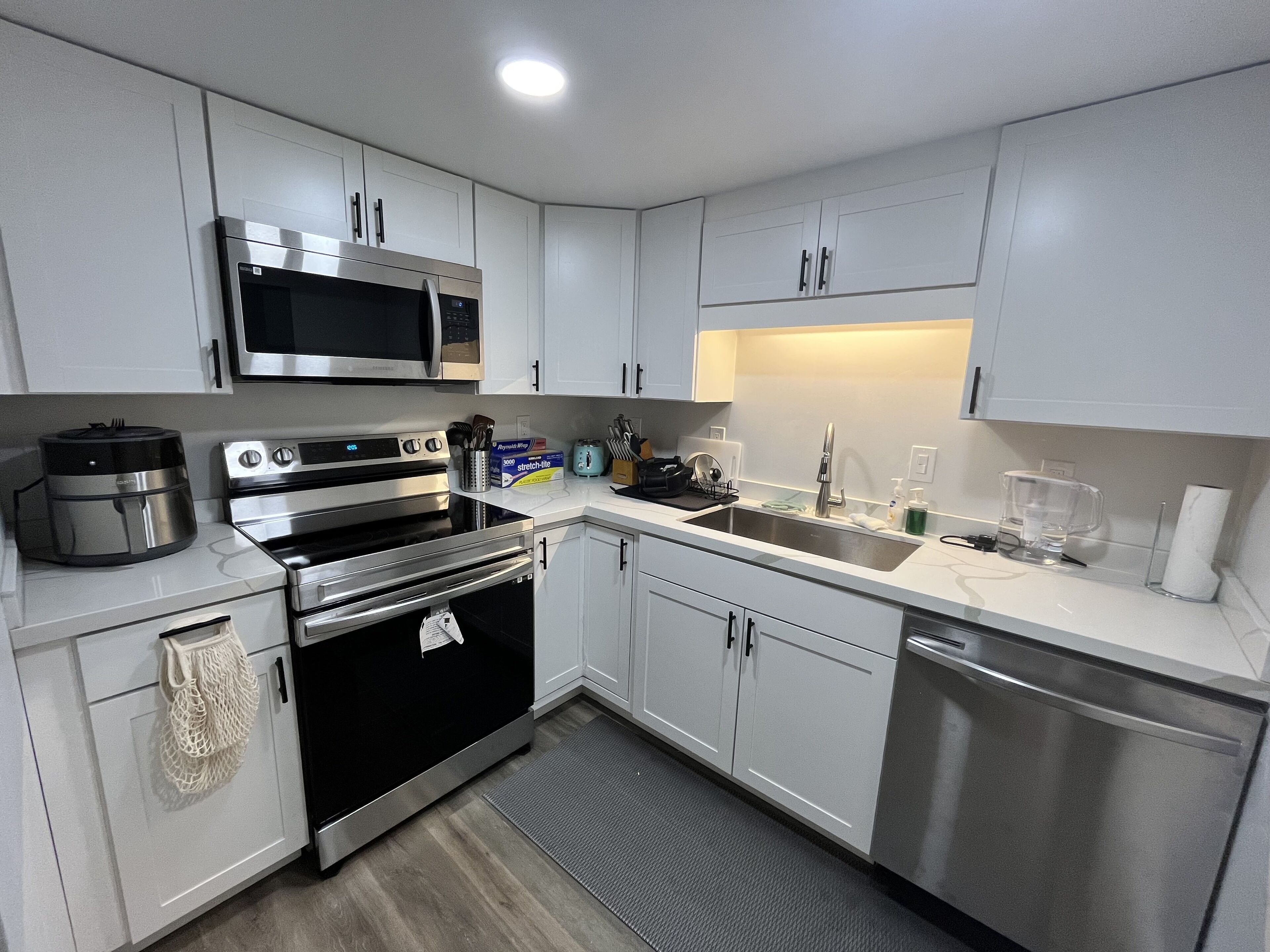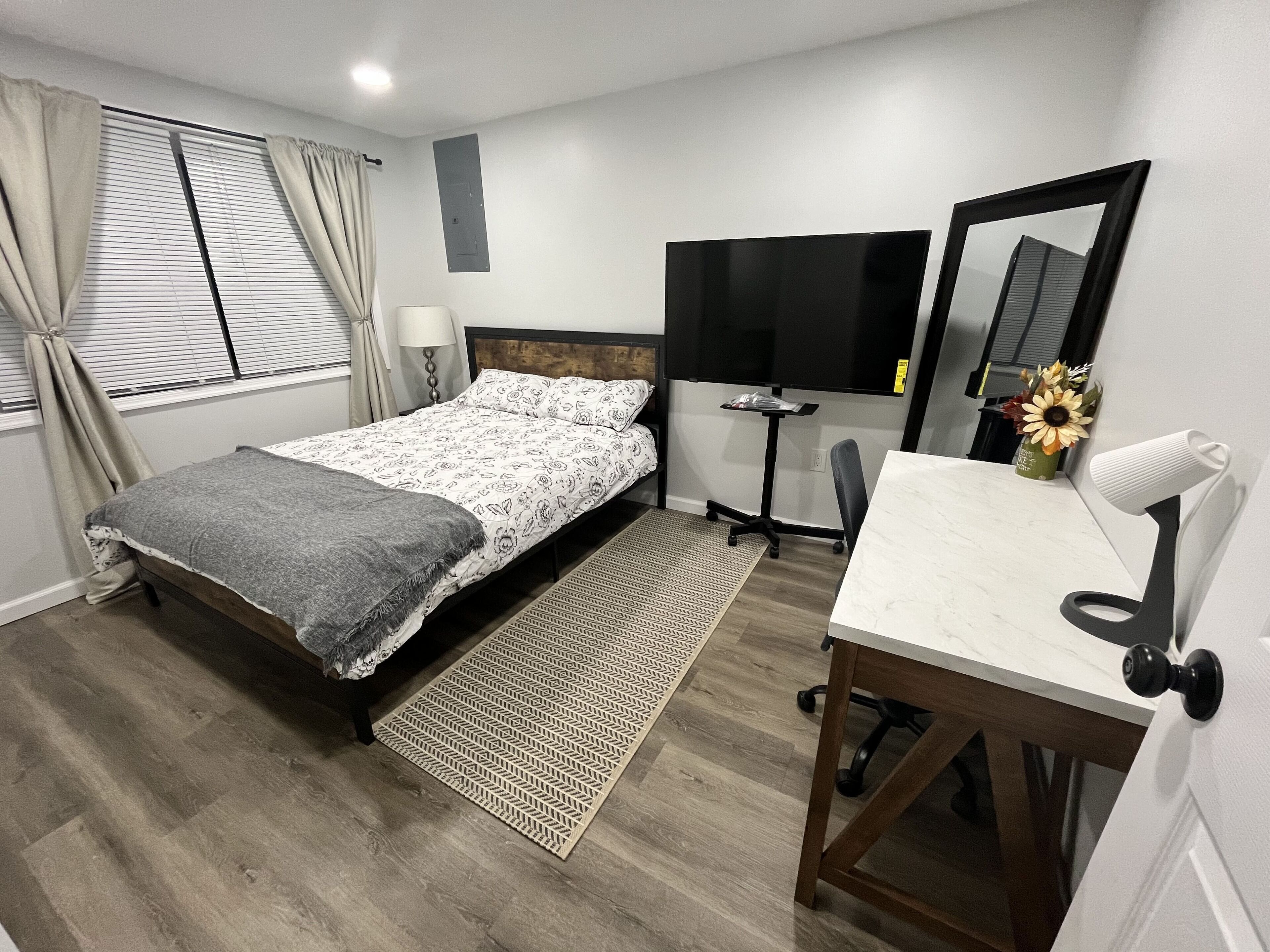 Newly Renovated Master Bedroom w/Private Bath. Access to Kitchen & Washer/Dryer. The room is in a newly renovated, above-ground & separate downstairs unit w/private entrance:-You will be provided with personal door code and room key.-ALL utilities included.-Fully Furnished Bedroom w/Queen bed, desk, chair, nightstand, closet, mirror & brand new 50" smart TV.-Access to a fully equipped Kitchen, Keu...