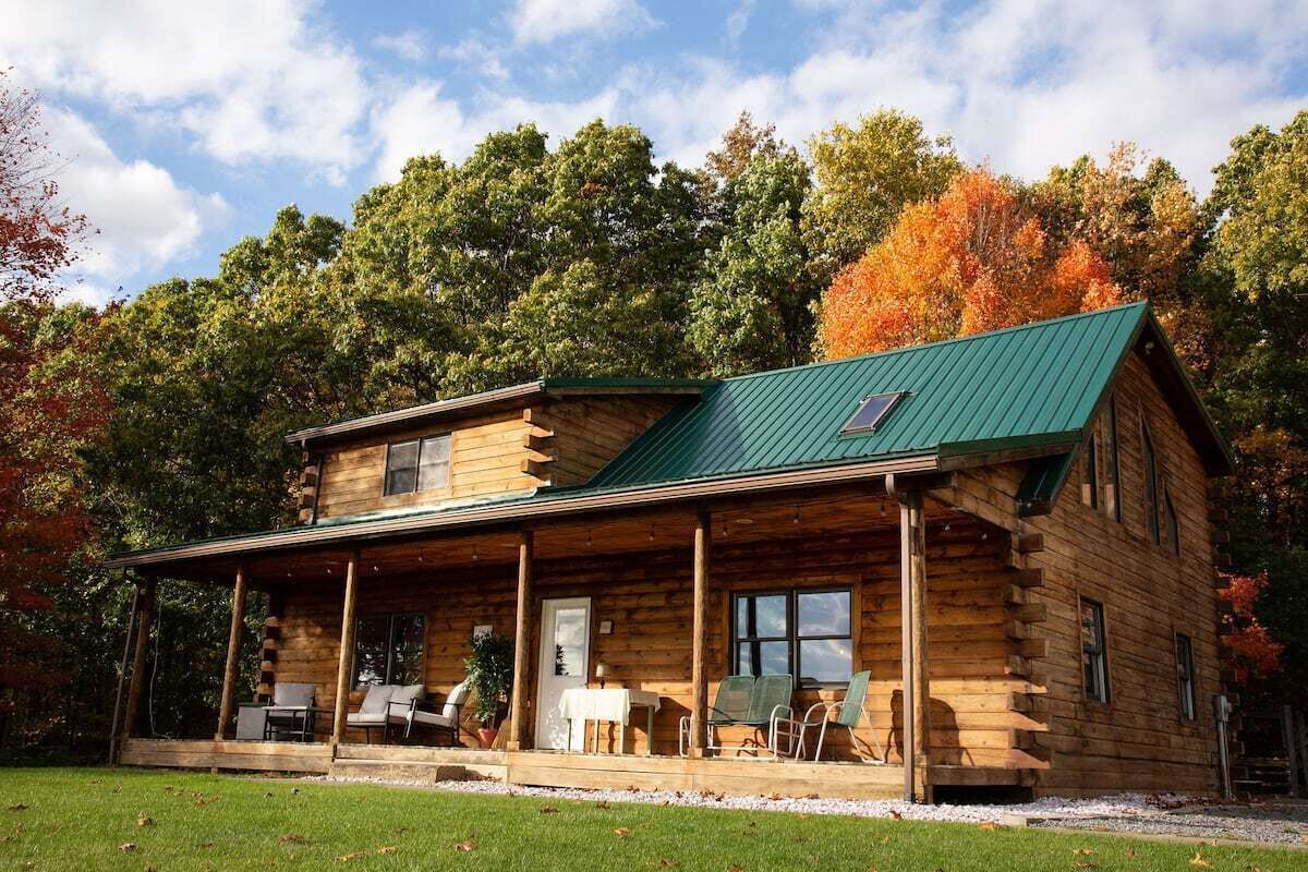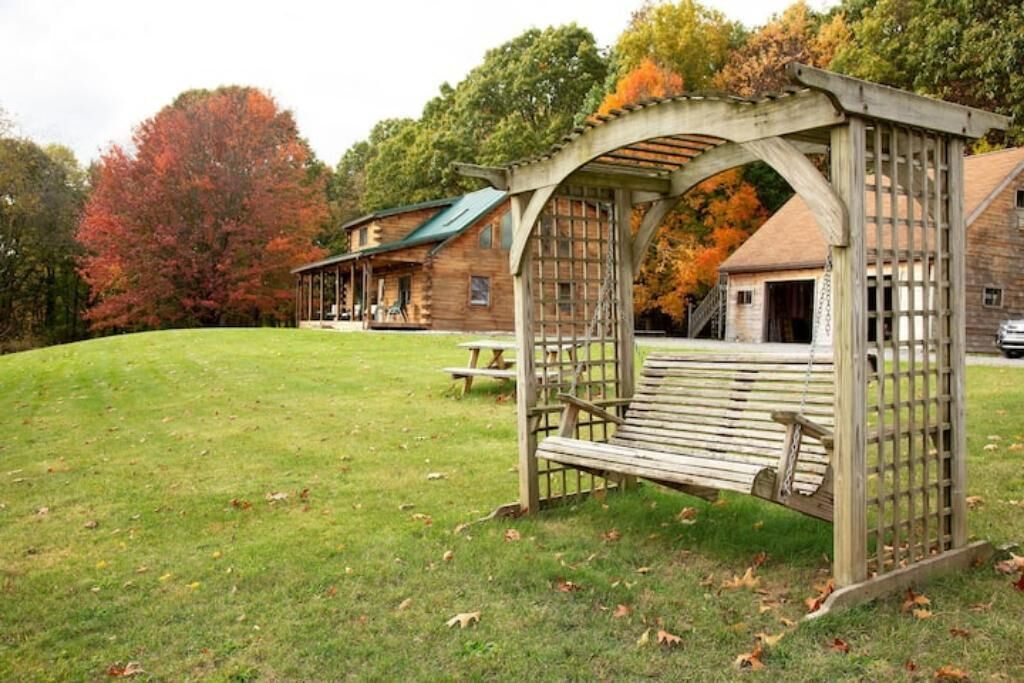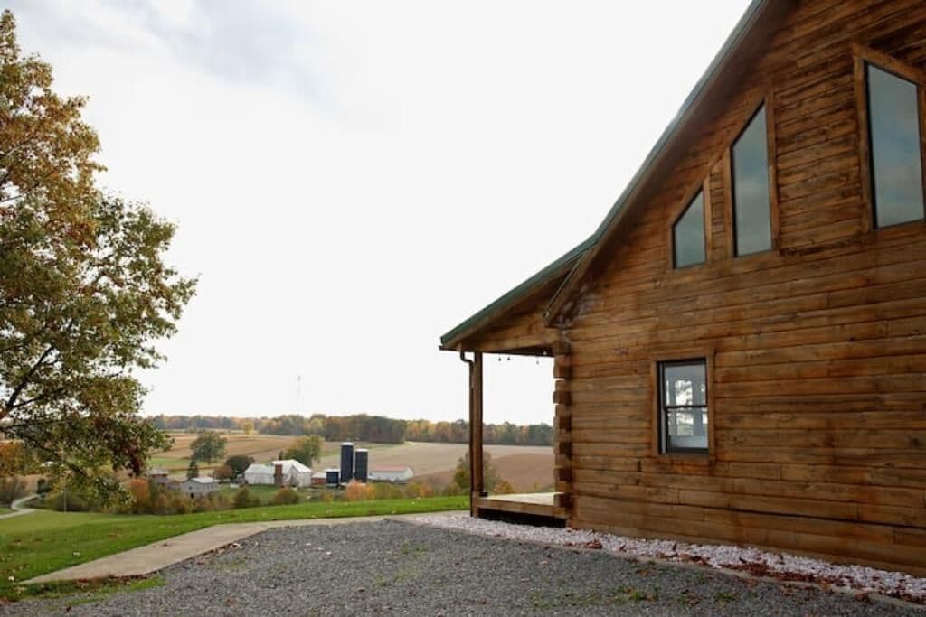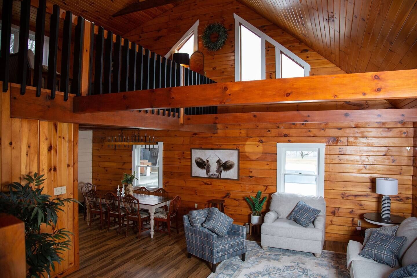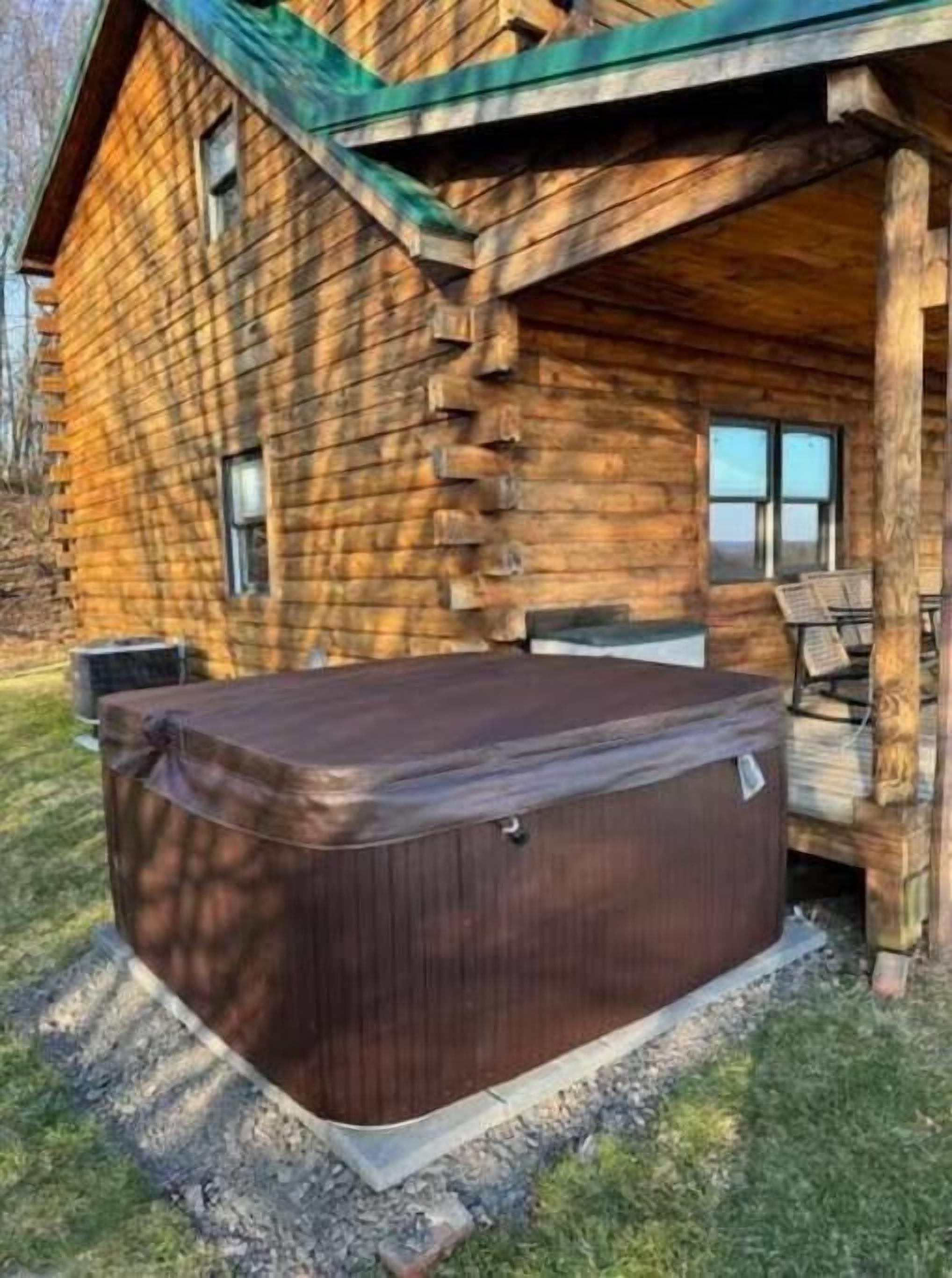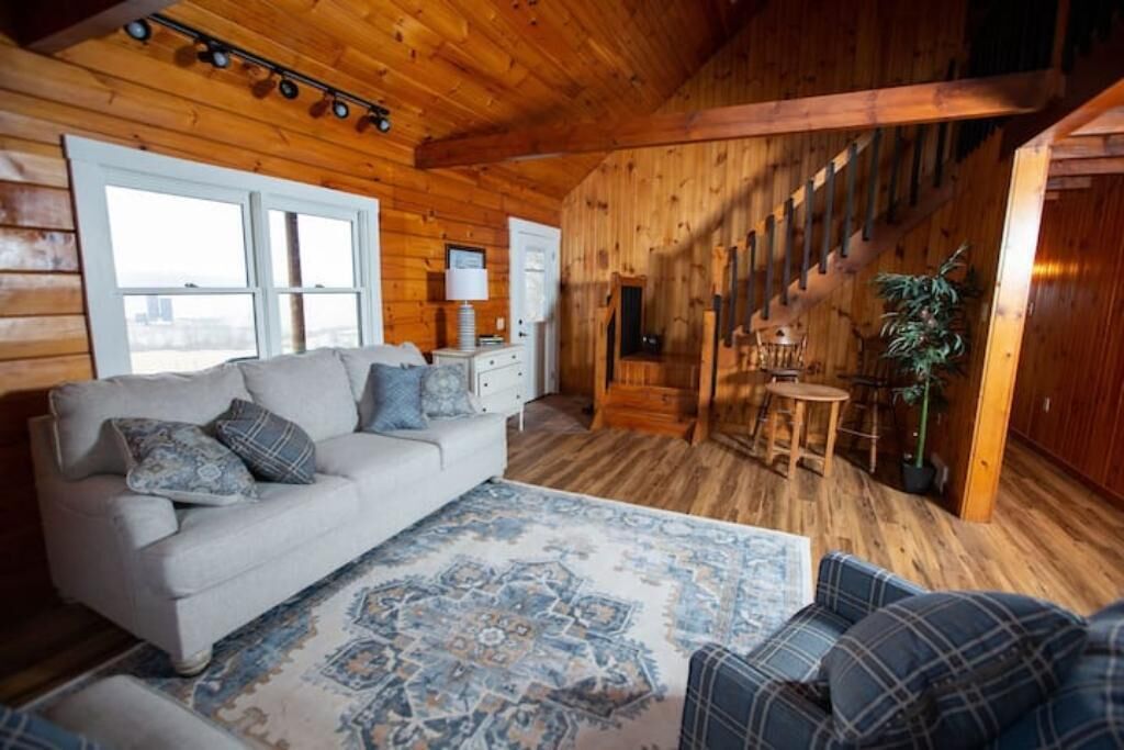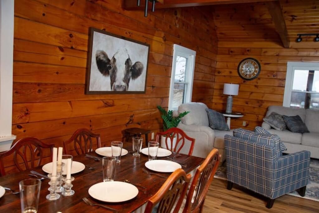 Peaceful log home retreat. Welcome to our peaceful log home nestled on 8 acres of serene beauty overlooking a 200 acre farm. This spacious and family friendly home is a haven for those seeking a tranquil escape accommodating up to 8 guests. Includes large open living room, kitchen and dining areas with a loft that offers more sitting and sleeping areas. Features a beautiful front porch, outdoor seating areas, fire pit and hot tub with amazing star gazing opportunities.