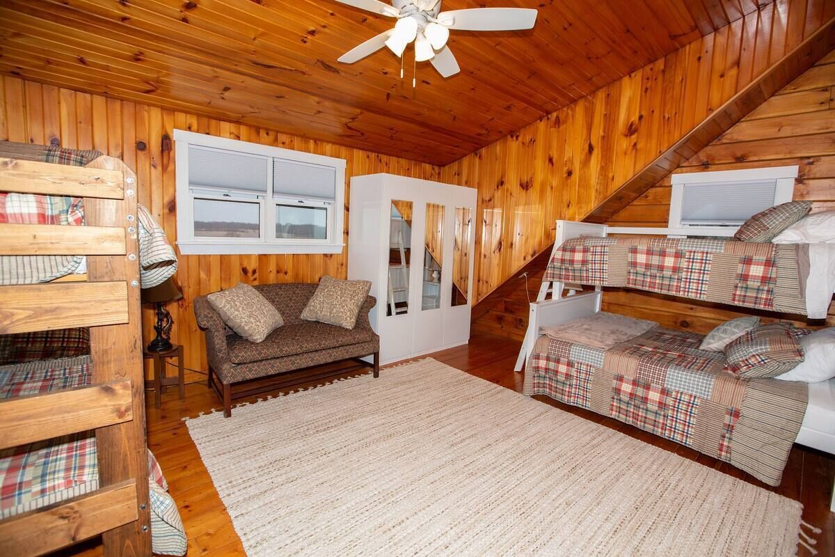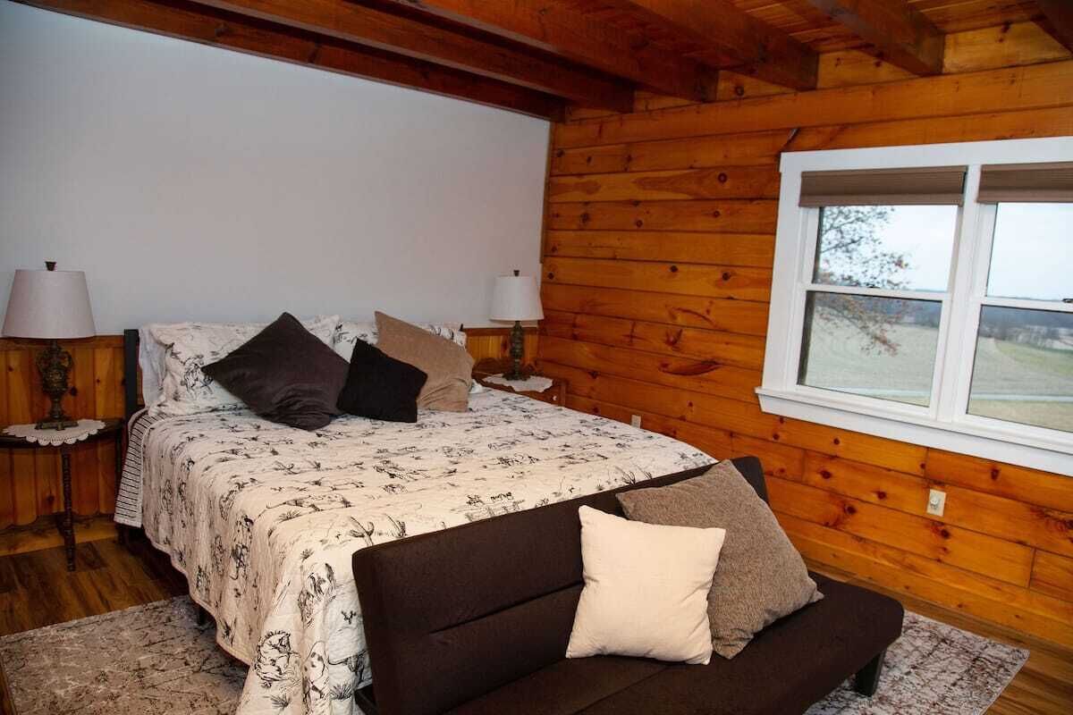 Peaceful log home retreat. Welcome to our peaceful log home nestled on 8 acres of serene beauty overlooking a 200 acre farm. This spacious and family friendly home is a haven for those seeking a tranquil escape accommodating up to 8 guests. Includes large open living room, kitchen and dining areas with a loft that offers more sitting and sleeping areas. Features a beautiful front porch, outd...