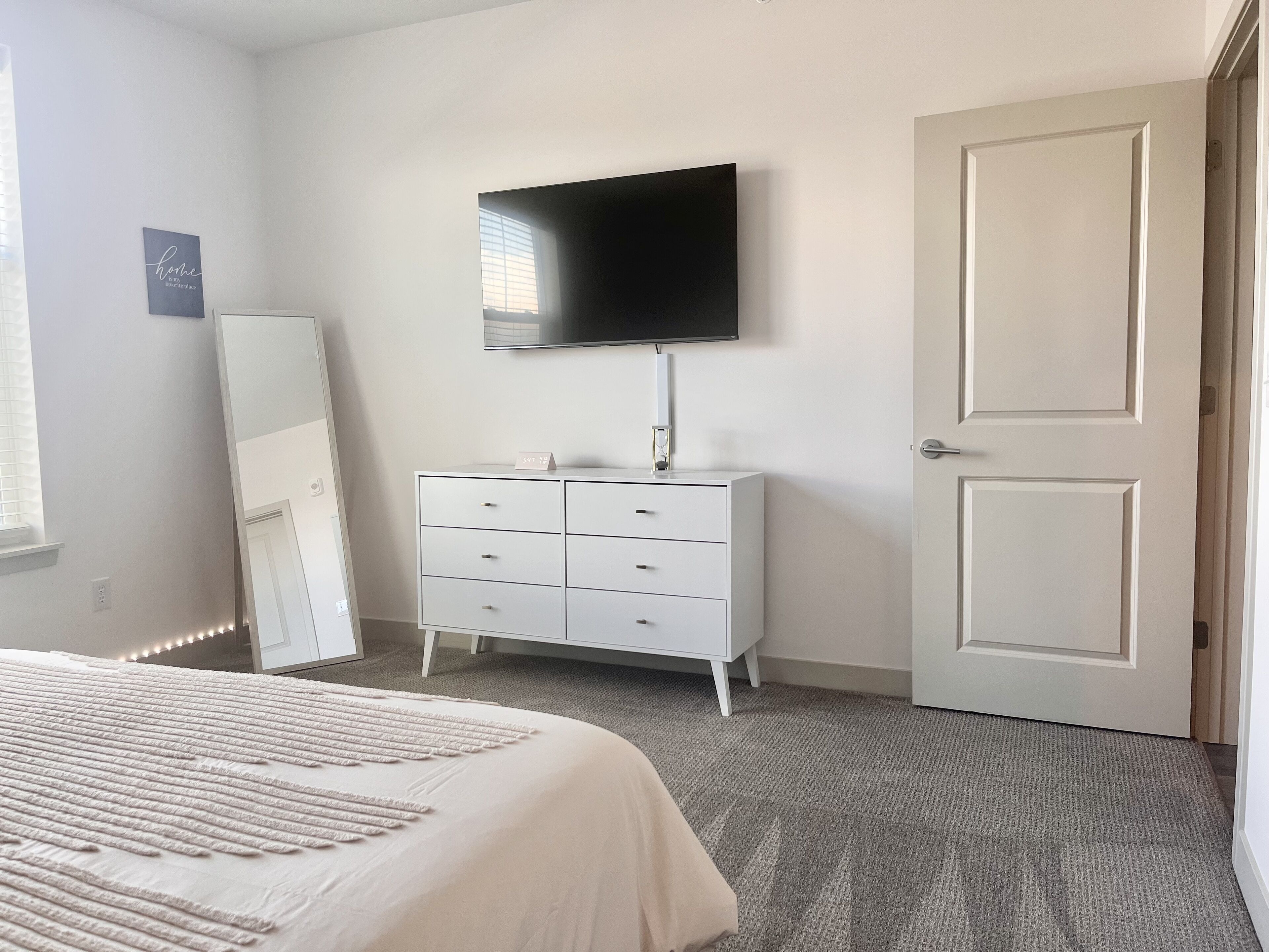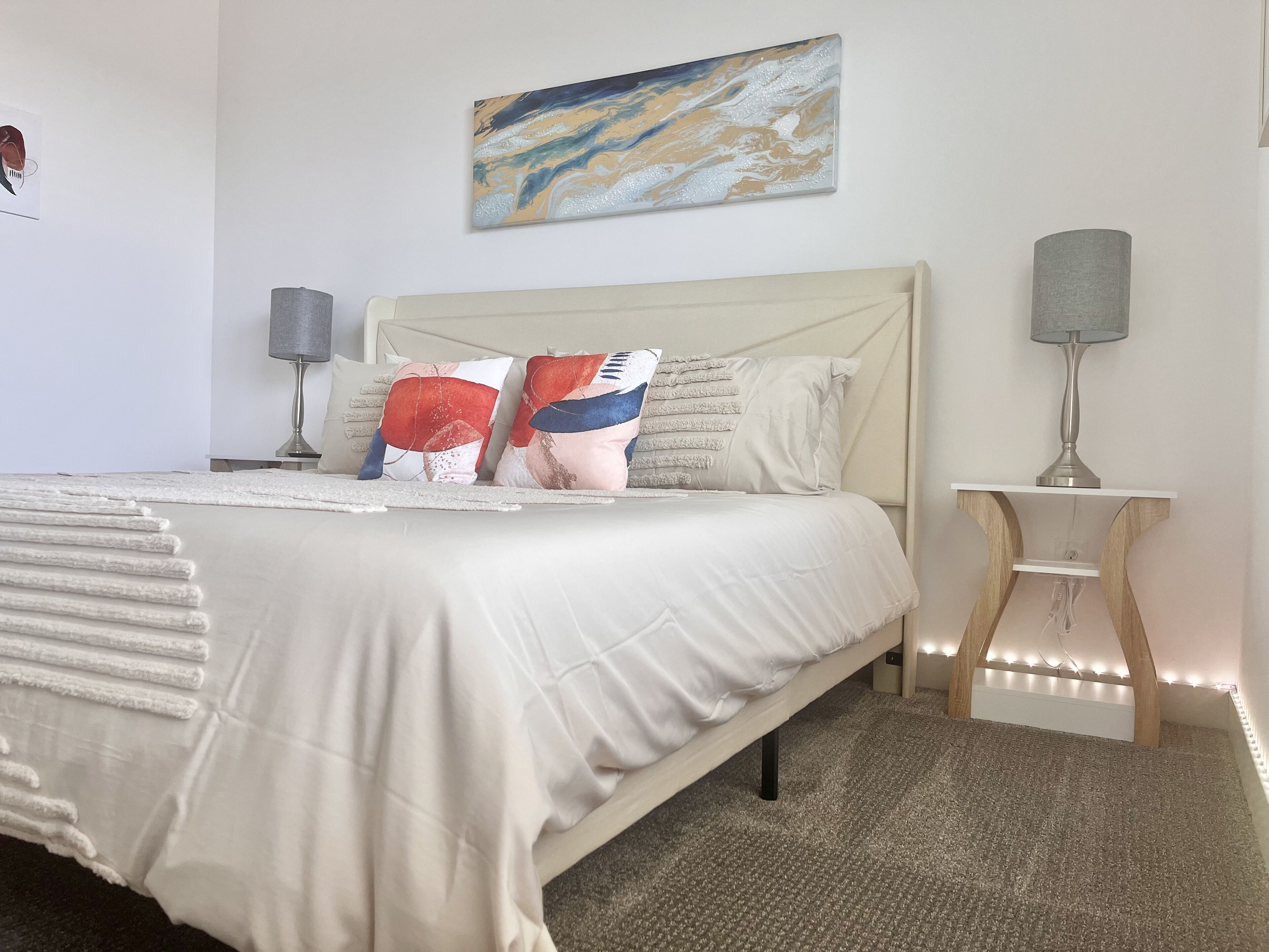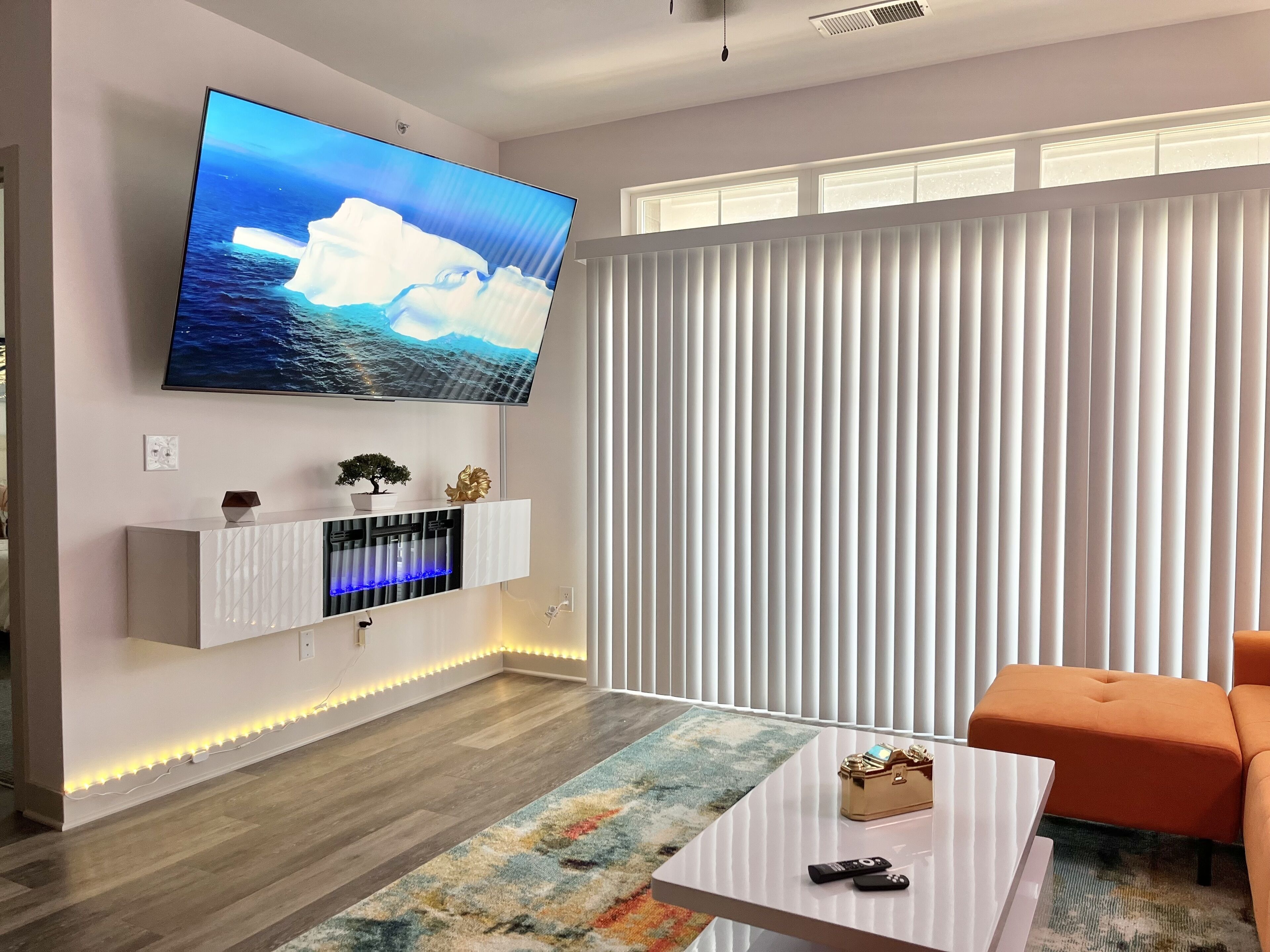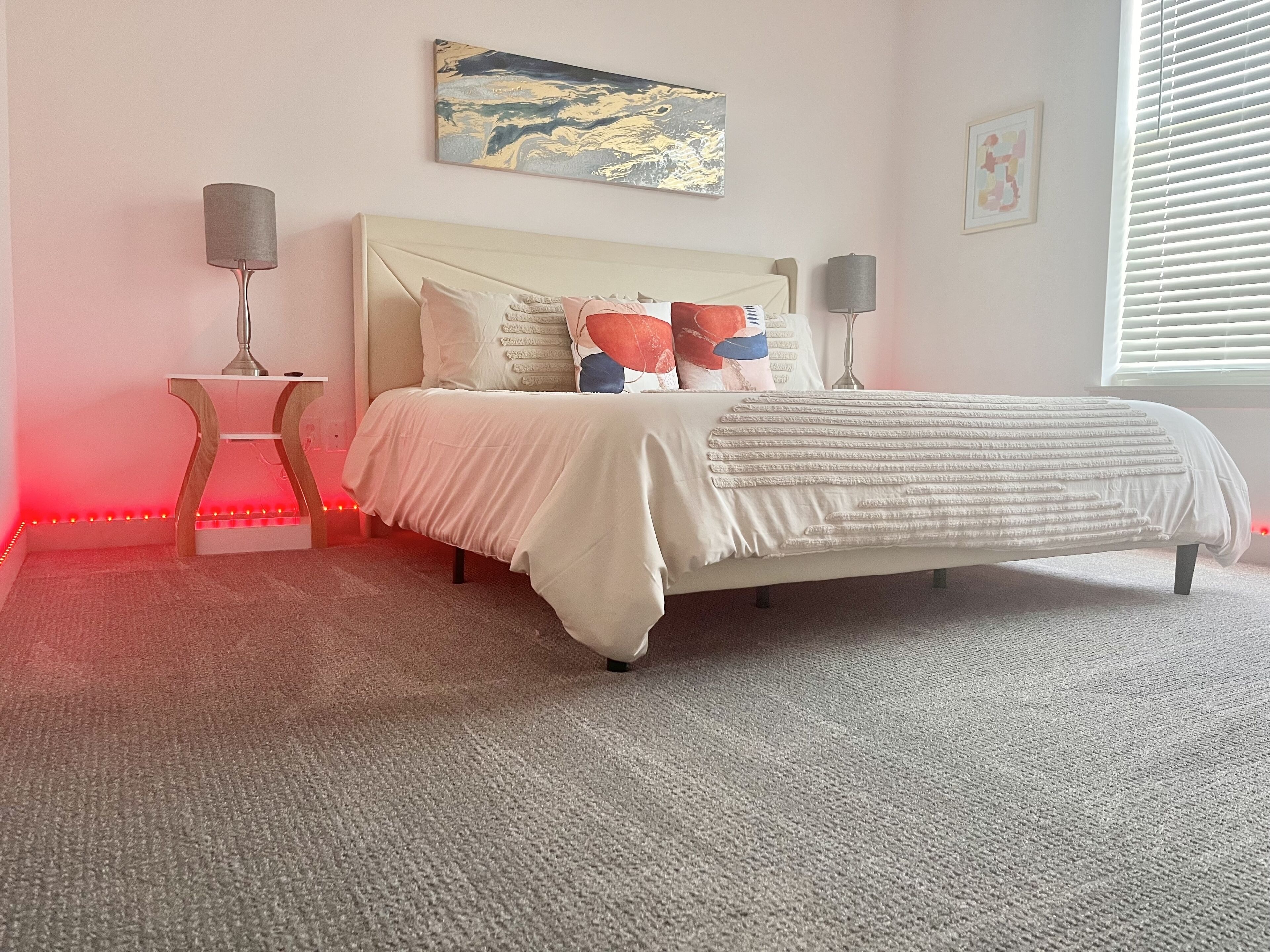 Oliver Capital - Relaxing King Bed Suite This relaxing suite has a comfortable memory foam king bed. Snuggle up and watch your favorite movies or shows on the large 75” TV in the living room. Optional LED lights throughout the living room and bedroom will change to your color of choice. TVs include streaming apps. Just steps from trails and parks, with nearby shopping and restaurants. Easy access...