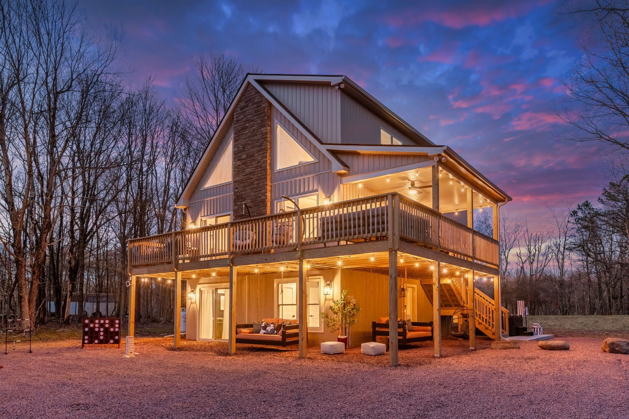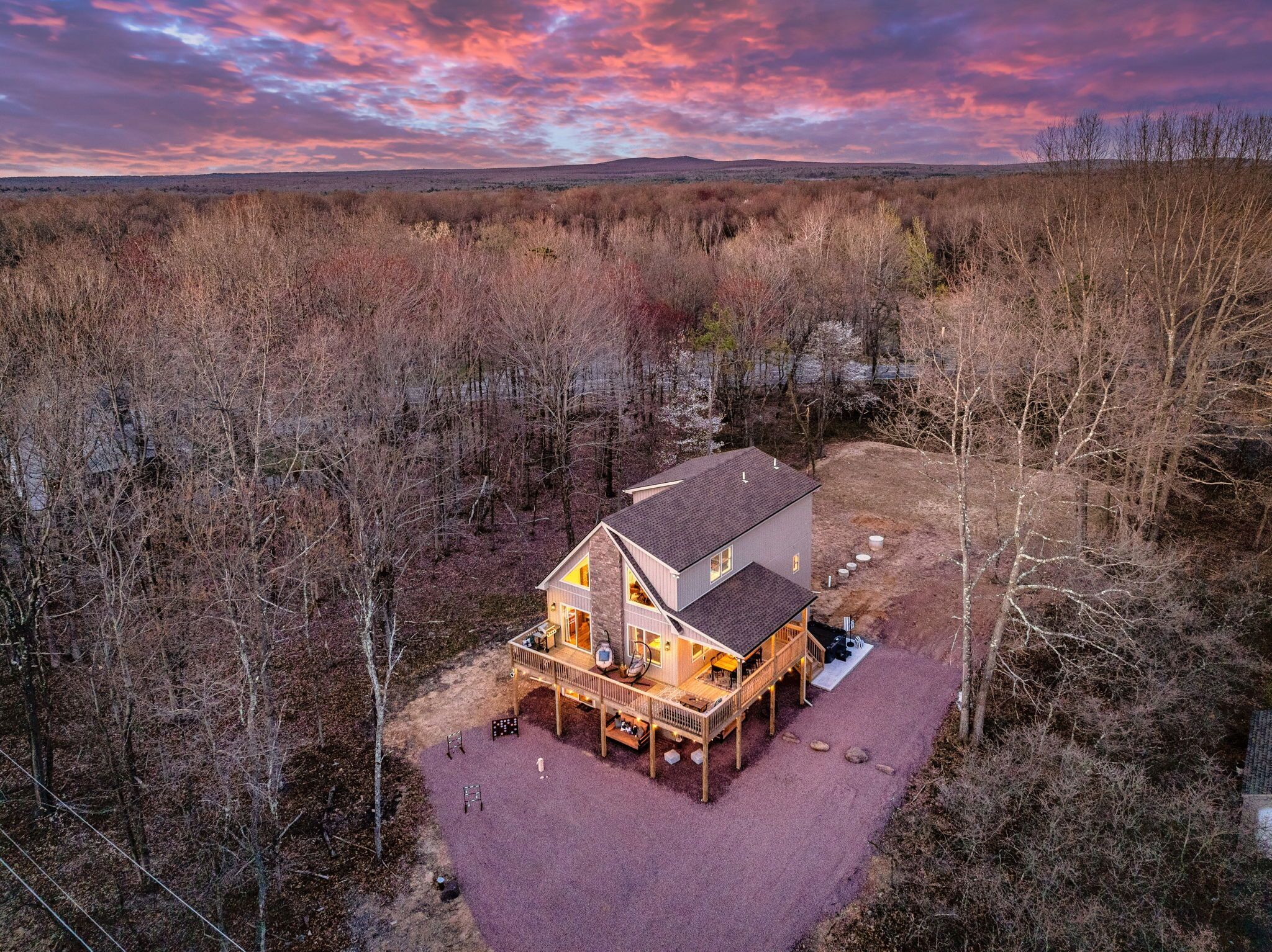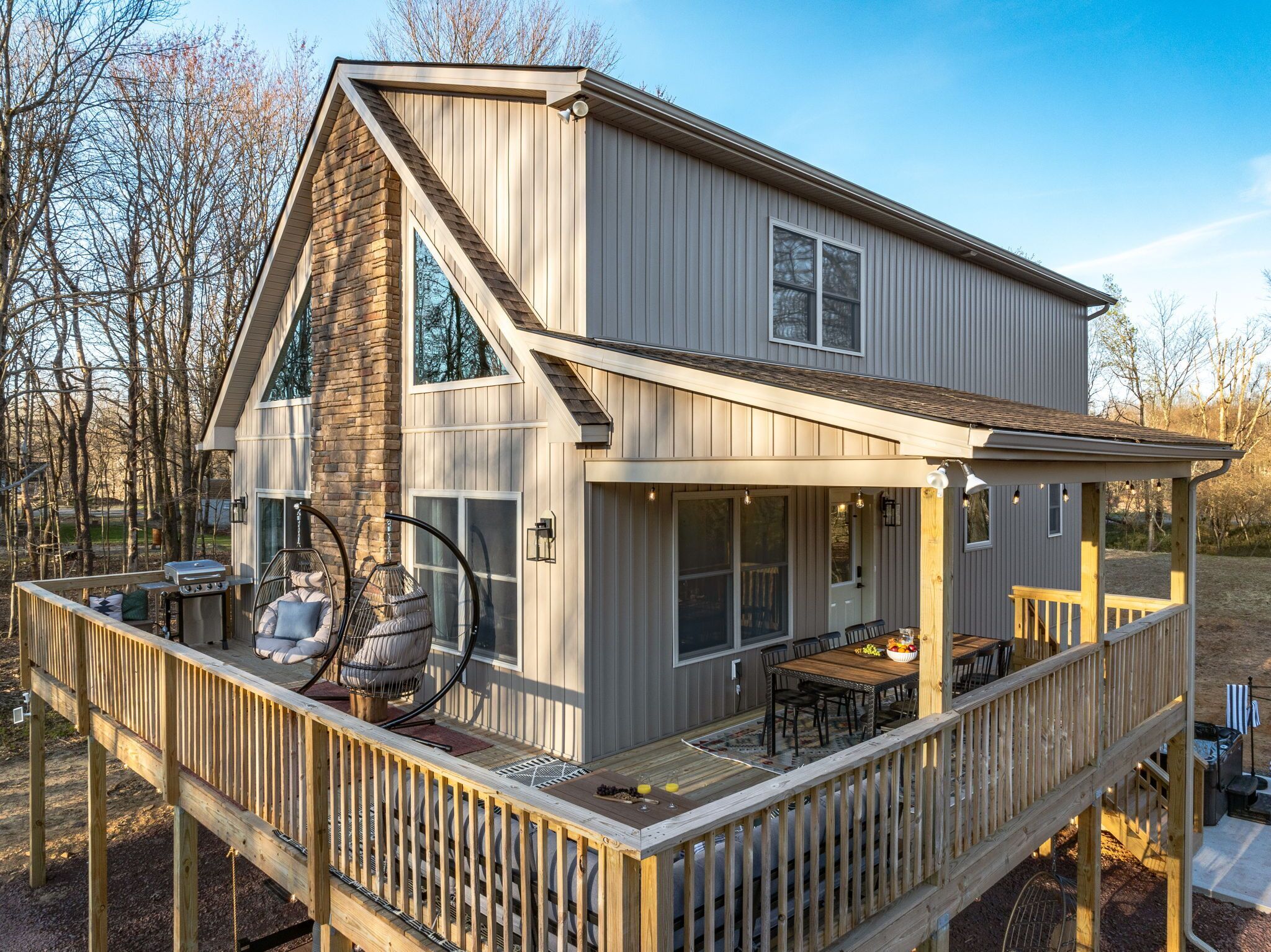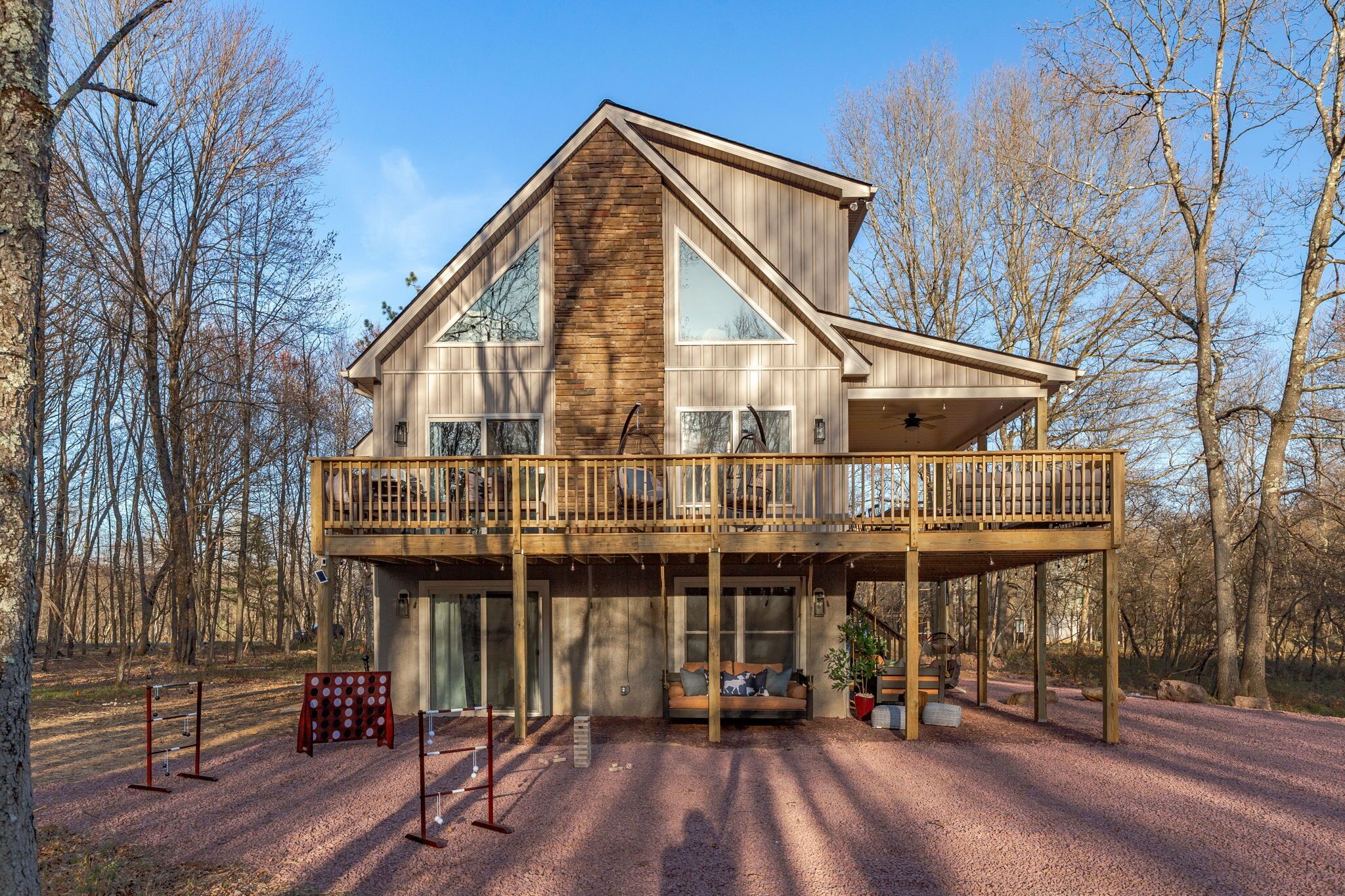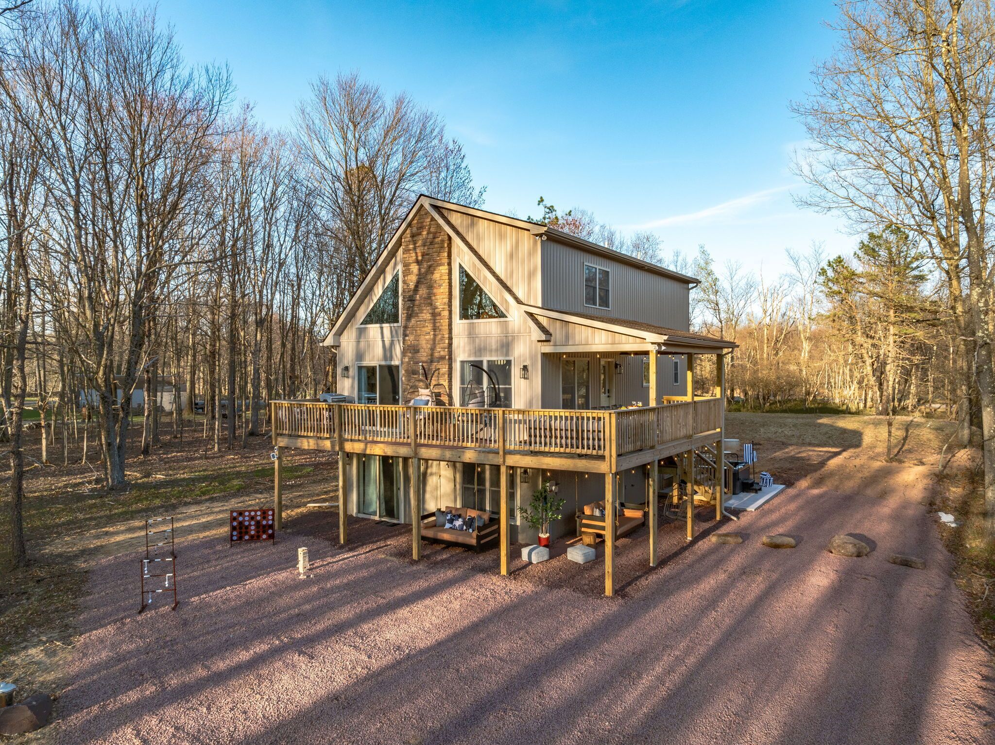 NEW - Wolf Run Lodge II - Luxury 6bd, Hot Tub, Indoor and Outdoor Games NEW LISTING - New construction in 2023. Spacious luxury 6 bed room and 3 bathroom house conveniently located less than a mile from the Towamensing trails lake and community center. Game room with Shuffle Board, Arcade Game and Foosball. Very close to major Pocono attractions (White Water rafting/Kayaking/Canoeing, Paint ball, Skiing, Horseback riding, Biking/Hiking trails, Pocono Raceway, Wineries, Fishing, etc). First floor ~3 bedrooms with TV’s (Bed 1 – queen, Bed 2 – 2 bunk beds full over full, Bed 3 – king) ~Movie area~Popcorn Machine~Full Bath Second floor~Gorgeous kitchen~Large living room with TV~Huge dining area (14 seats, 4 additional at breakfast bar)~1 bedroom with TV (King) ~Full bath~Laundry (washer and dryer)Third floor~2 bedrooms with TV’s (Bed 1 – King, Bed 2 -2 full beds)~Full bath ~Game room (arcade game, foosball, shuffle board, chess, etc)Outside~Hot tub~Deck with grill/outdoor dining, seating area ~2 outdoor bed swings~Parking for 6Community amenities – lake, pool (seasonal), community center and more. Amenities can be closed due to unforeseen circumstances beyond our control. No swim diapers in main pool. Note: HOA limits 8 beach tags (Wrist bands) per stay and does not allow to purchase additional tags and are required for everyone 5 and over. However there are public lake beaches at Beltzville and Hickory Run State Park nearby.
