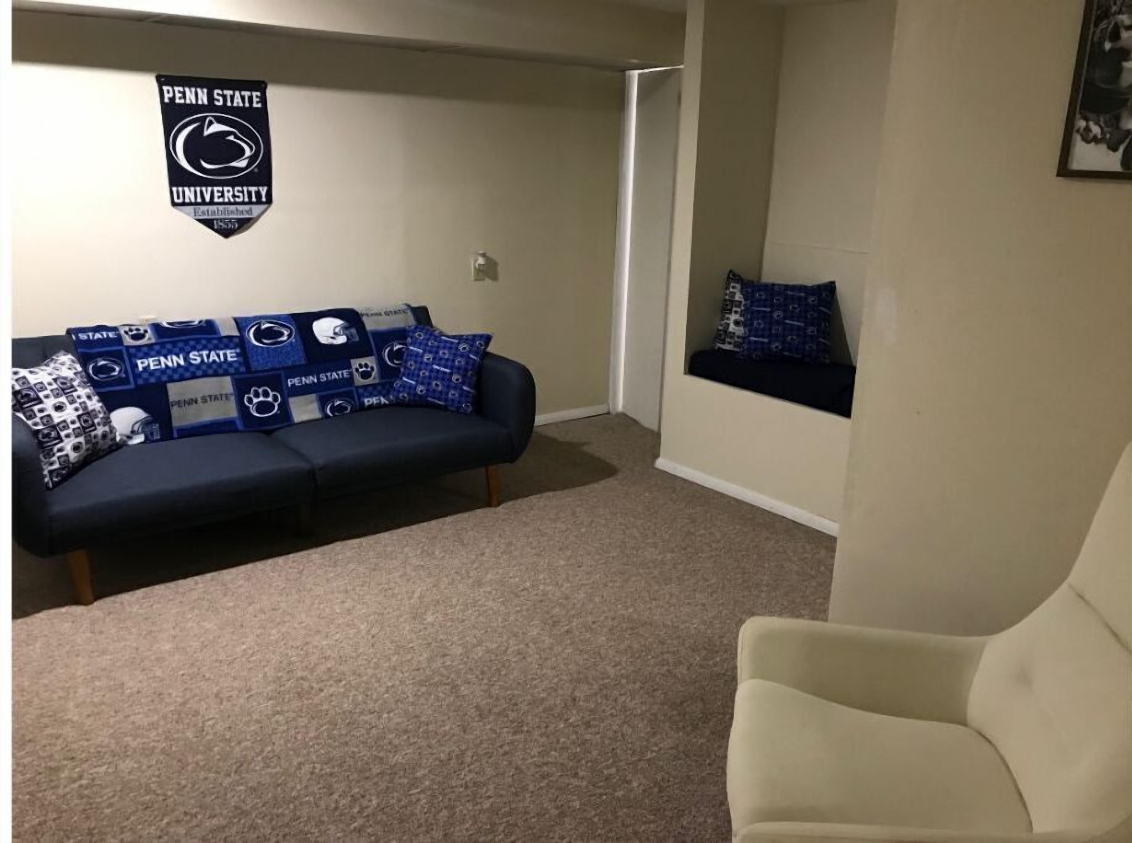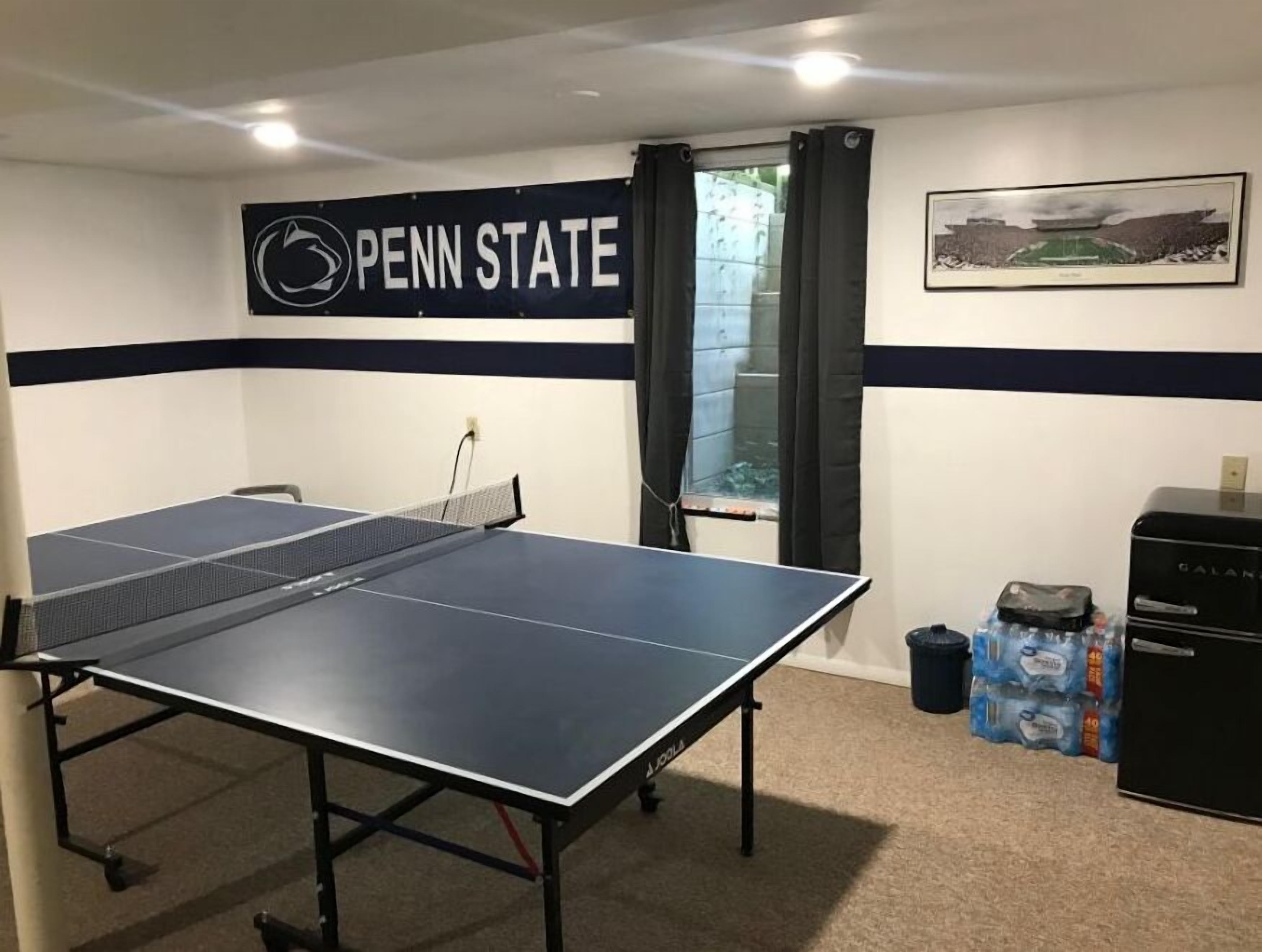 Mount Nittany Ranch Welcome to our mid-century ranch home that we affectionatelycall "The Pig". Newly renovated with additional enhancements comingnext summer. It has 4 bedrooms. The three on the main level include an ownersuite with king size bed, one with a queen size bed and one with a twin bed. Downstairsthere is an open suite with two twin beds and a futon. There are two full baths,one with a large shower and one with a soaking tub/shower combo. A fully equipped 1950's kitchen,dining room with seating for six, and living room with two large couches and asmall ‘gossip bench’. Plus, a Penn State themed rec room complete with pingpong table and dart board. Located in Lemont at the base of Mount Nittany andwithin 3 miles of beaver stadium, and less than 1.5 miles to many great localrestaurants.