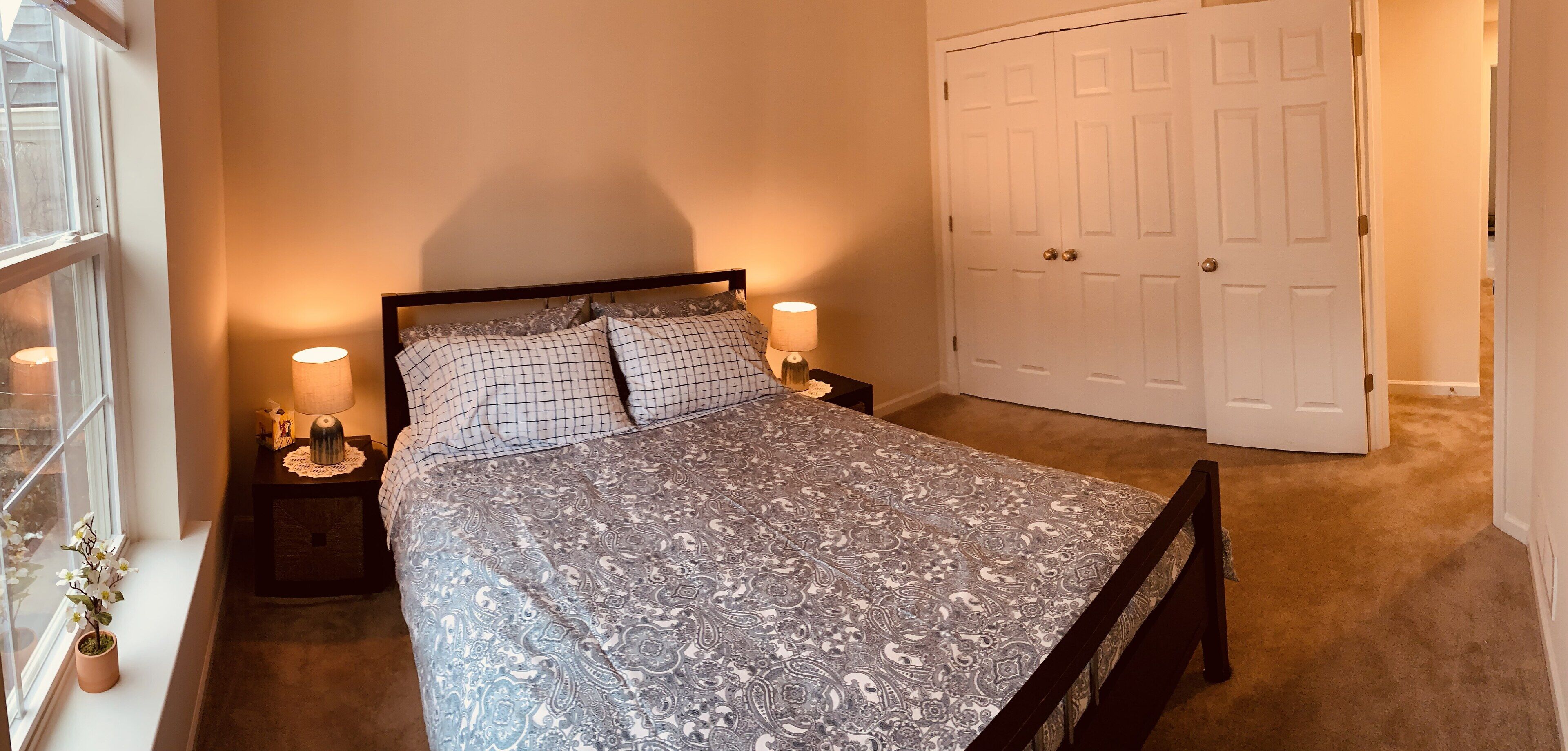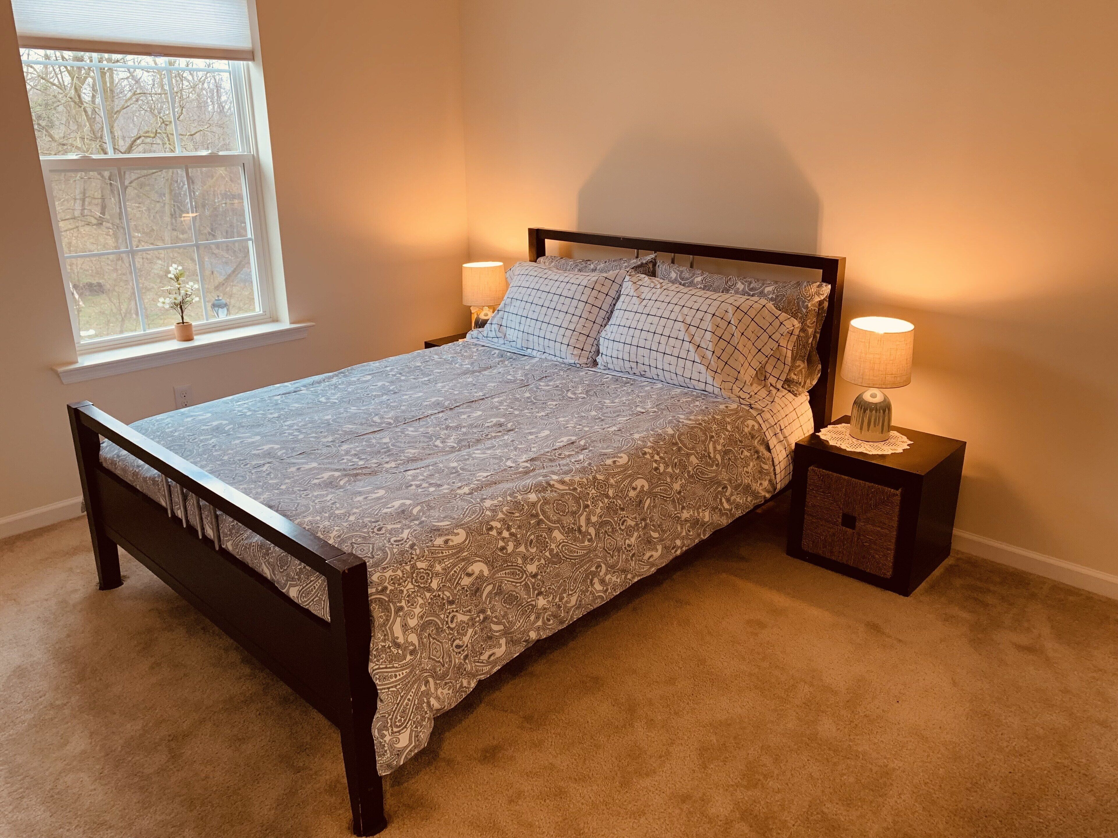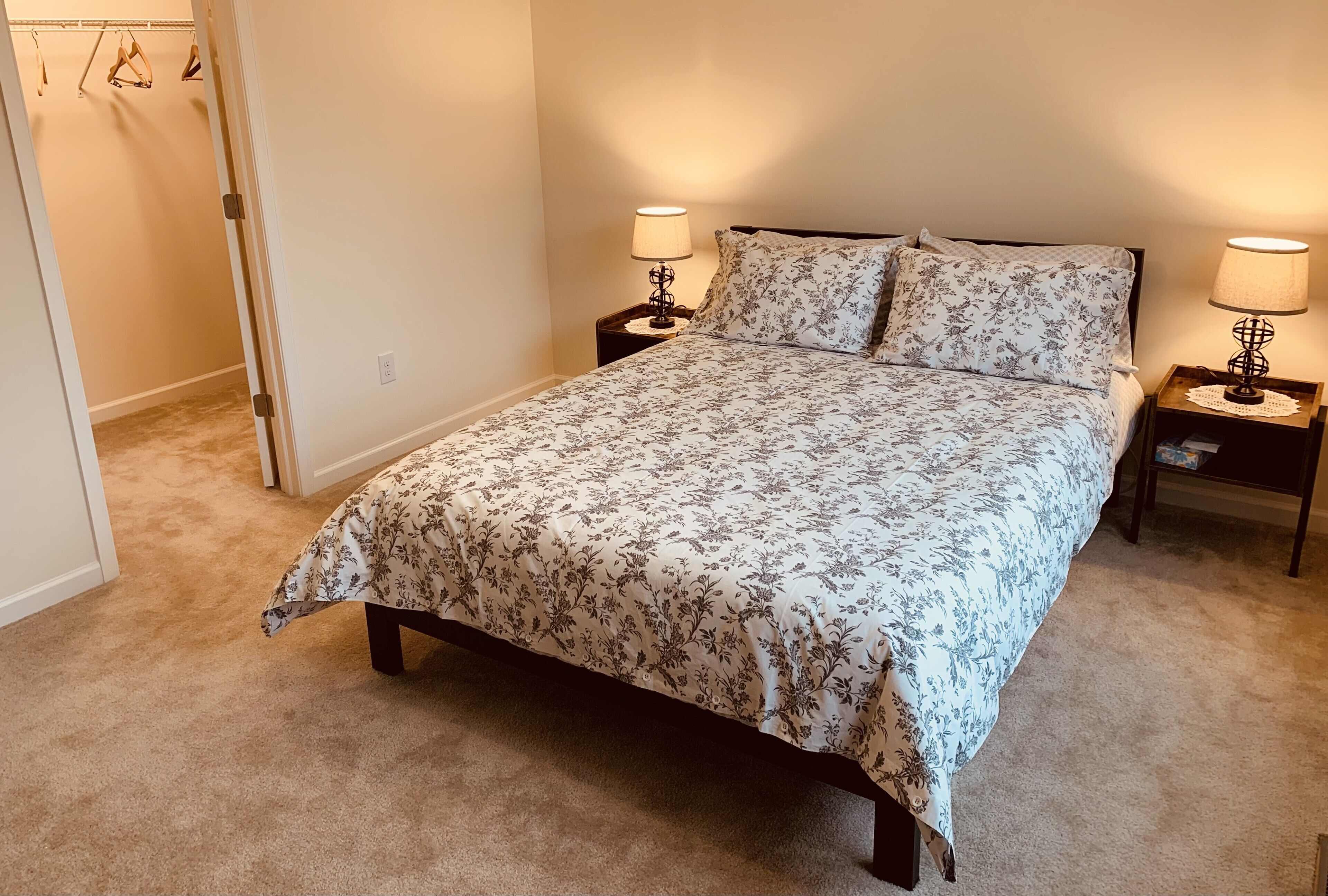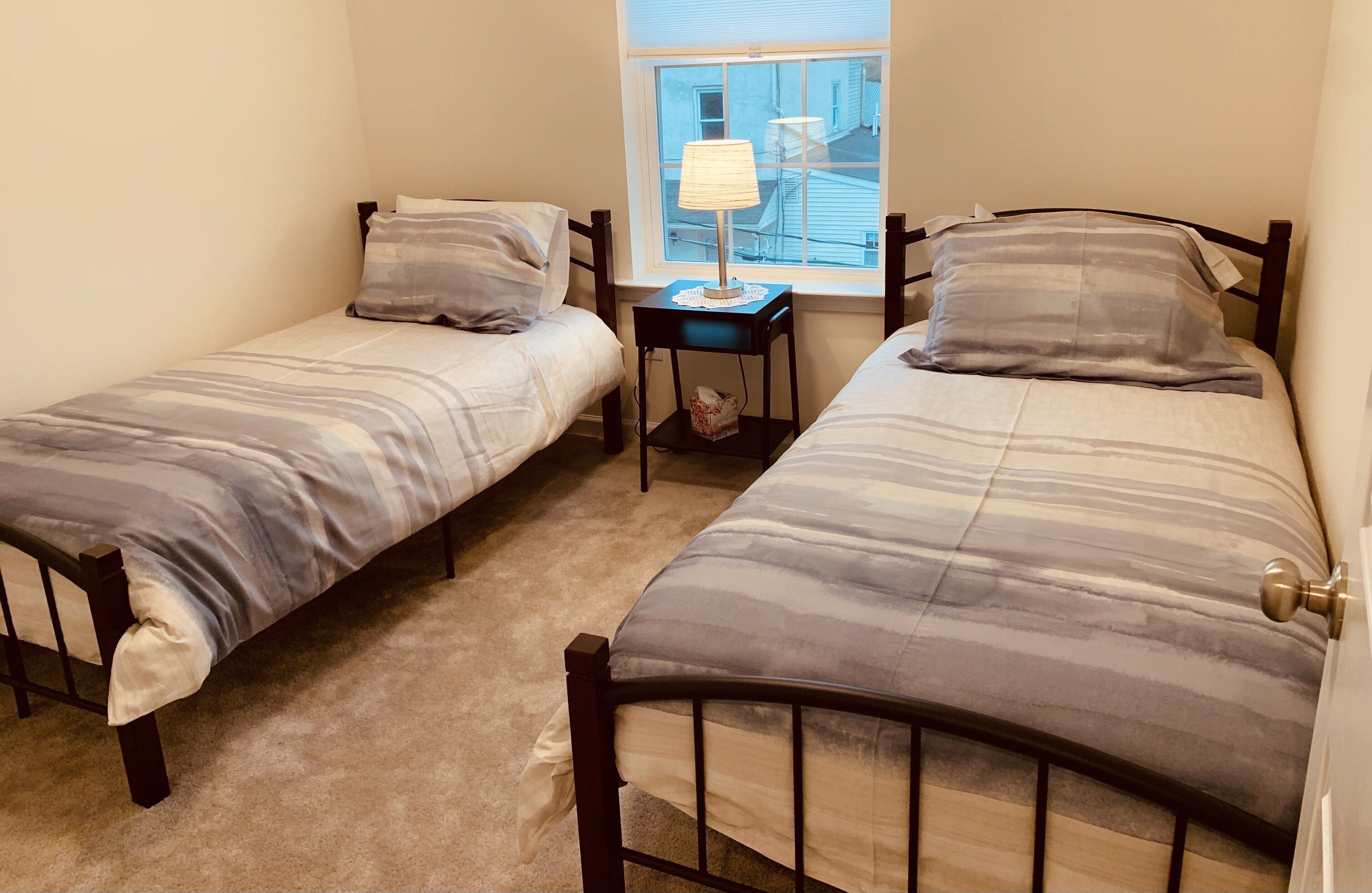 Modern Industrial, 12 min walk to Bridge St Three bedroom, two full bath across two floors. Three BRs are on the top floor. Master BR has bathroom with walk in shower and walk in closet. 2nd and 3rd BRs share a bathroom. Queen, queen, and two twins. W/D are also on third floor.Nearly a half acre of land with off-street parking. W/D, dishwasher and off street parking included. Fire pit and gas grill in the backyard. Ten minute walk to Bridge Street.