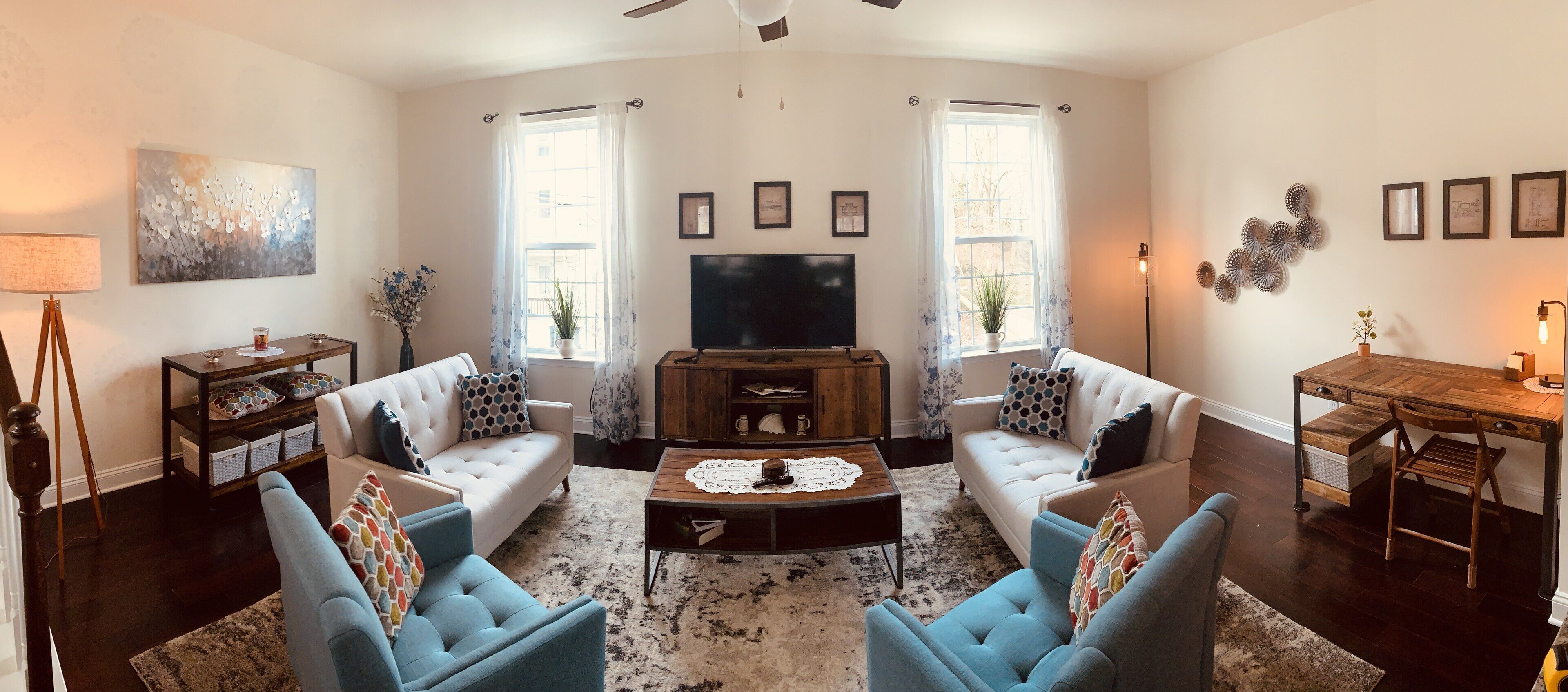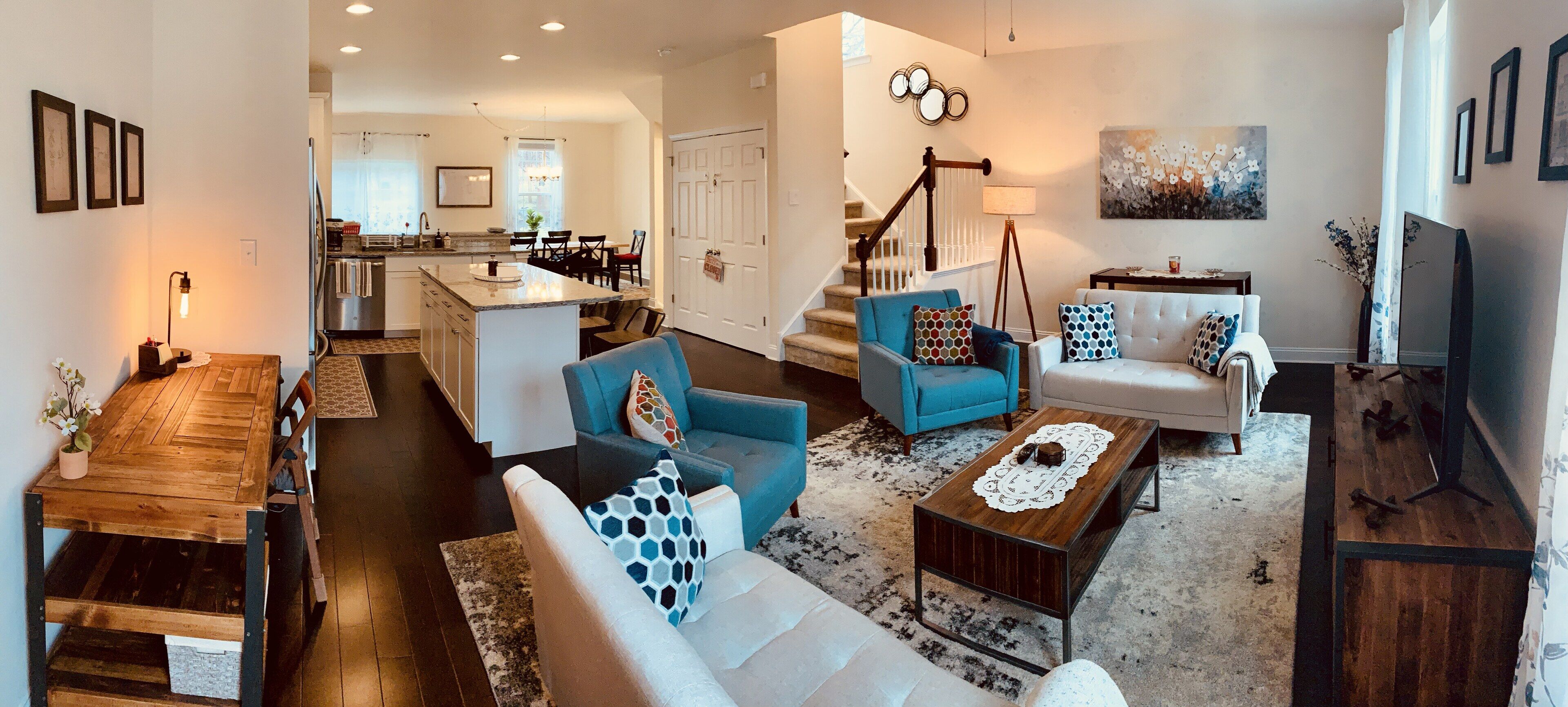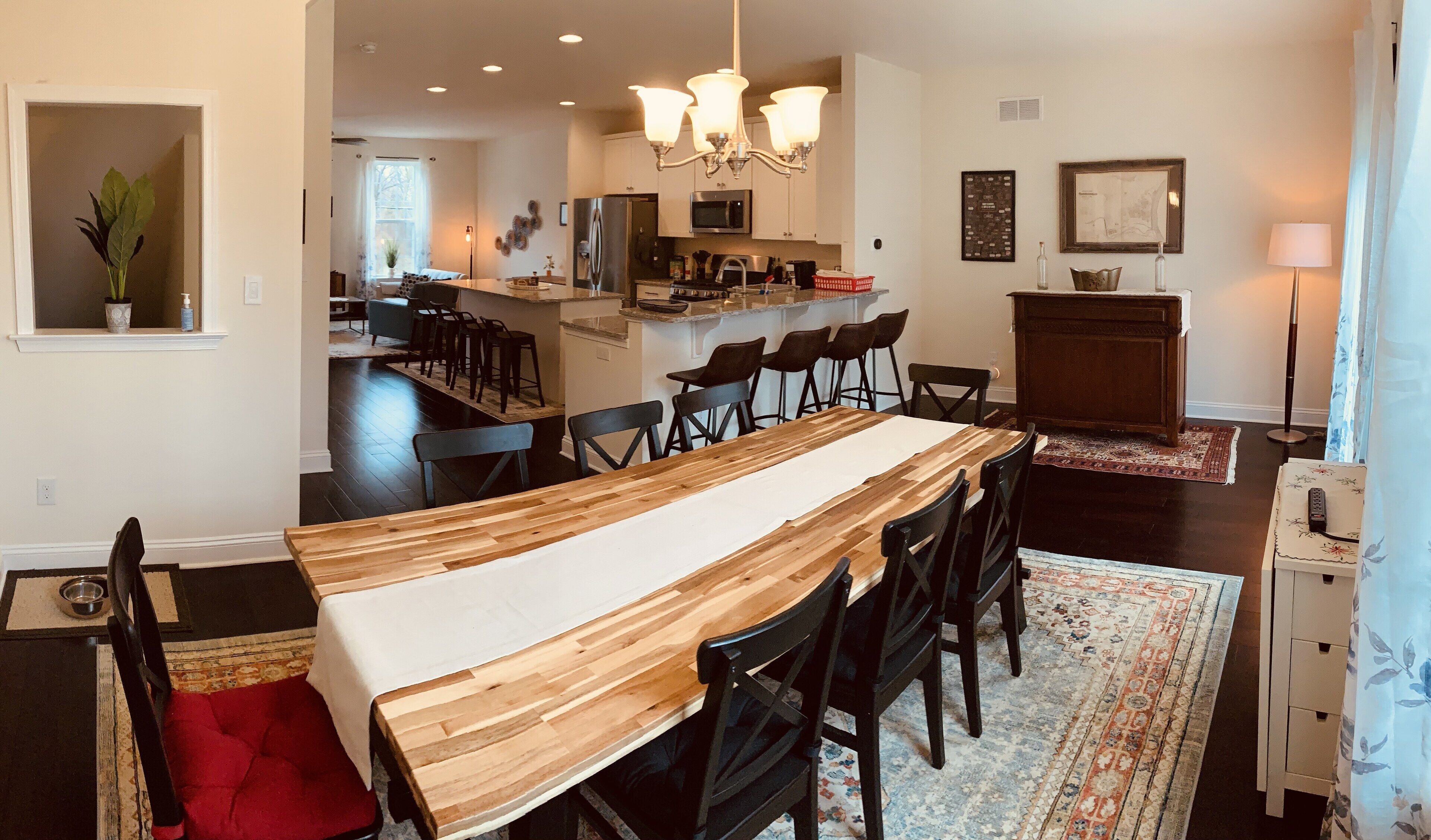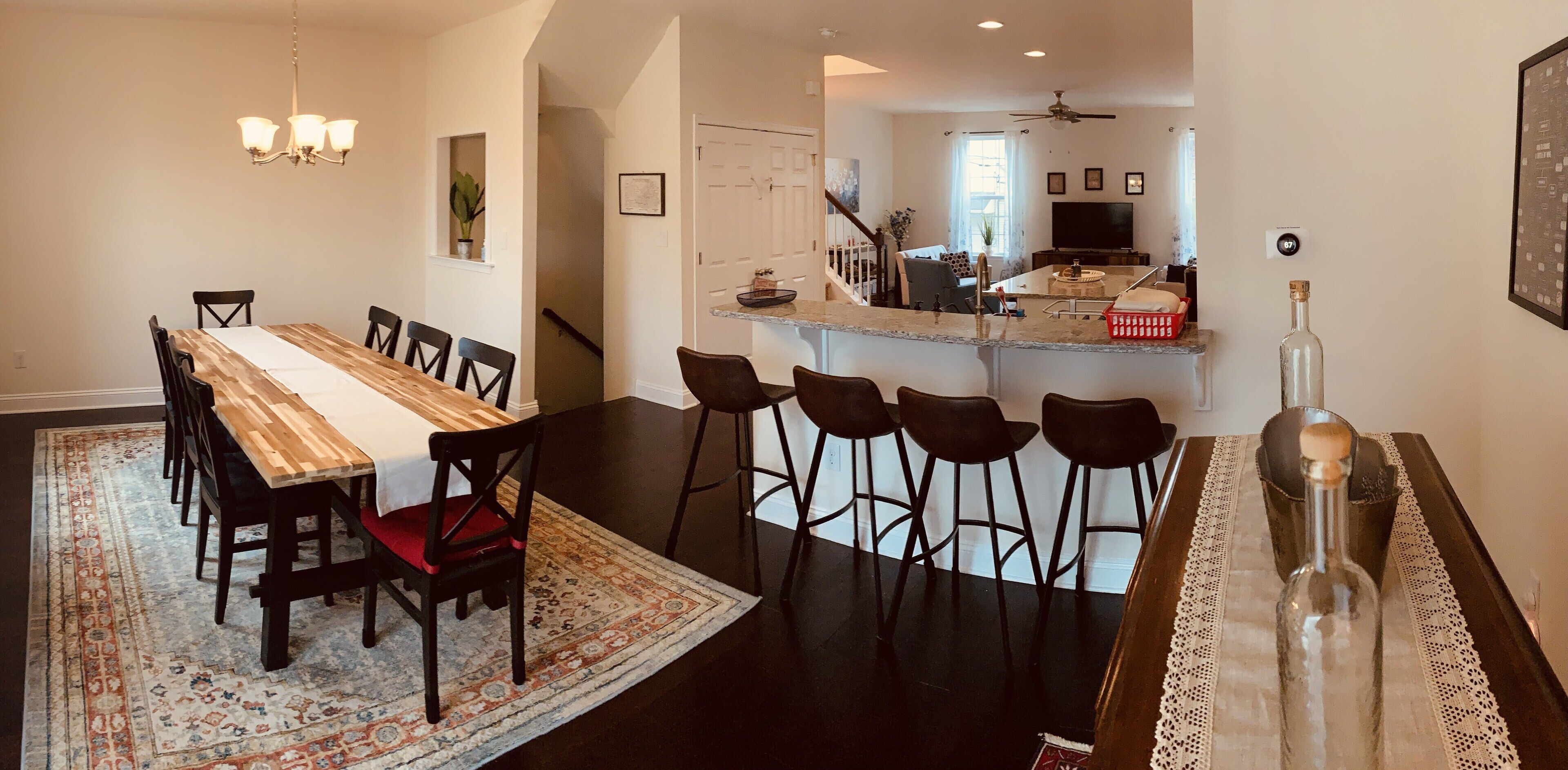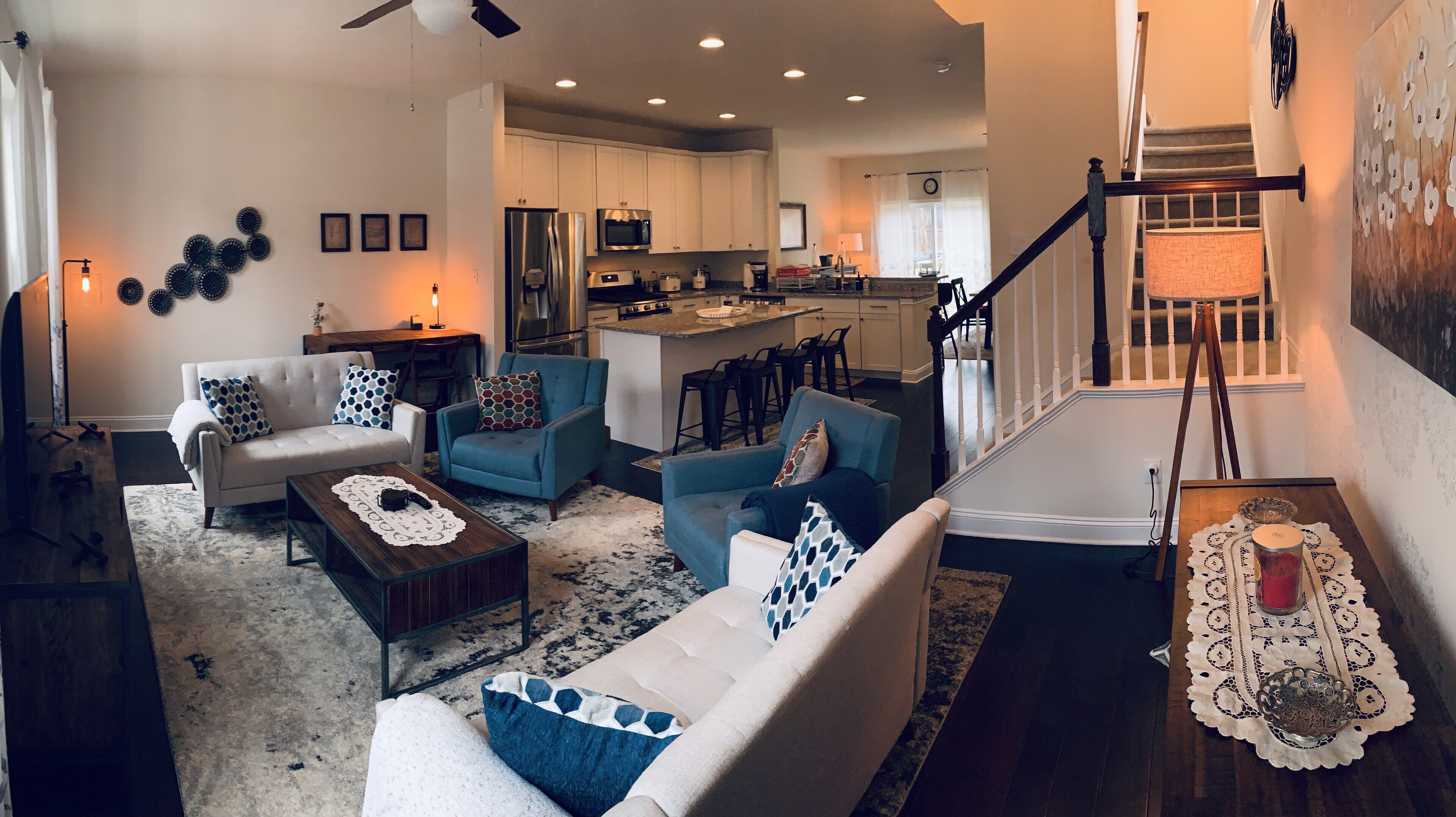 Modern Industrial, 12 min walk to Bridge St Three bedroom, two full bath across two floors. Three BRs are on the top floor. Master BR has bathroom with walk in shower and walk in closet. 2nd and 3rd BRs share a bathroom. Queen, queen, and two twins. W/D are also on third floor.Nearly a half acre of land with off-street parking. W/D, dishwasher and off street parking included. Fire pit and gas grill in the backyard. Ten minute walk to Bridge Street.