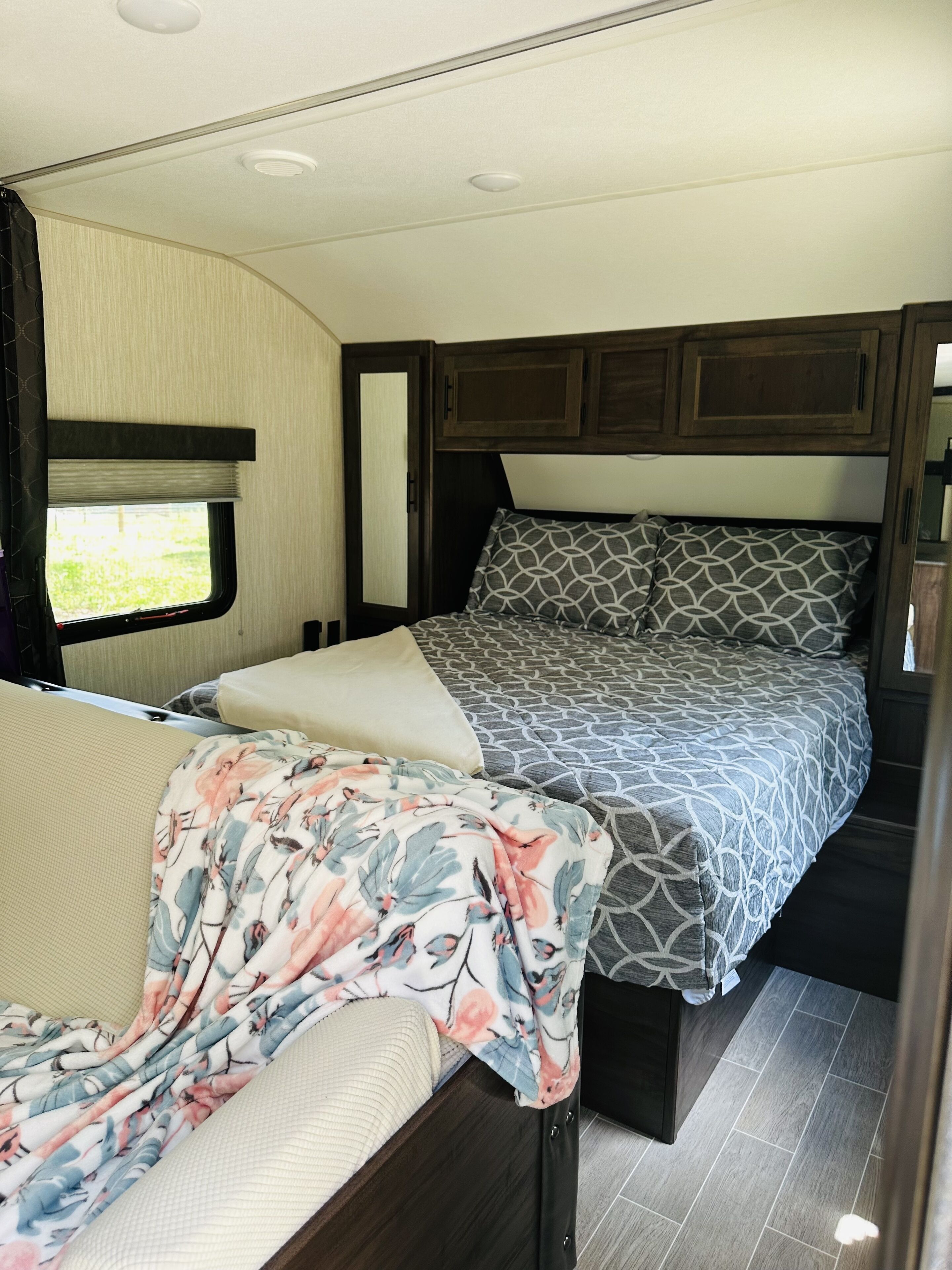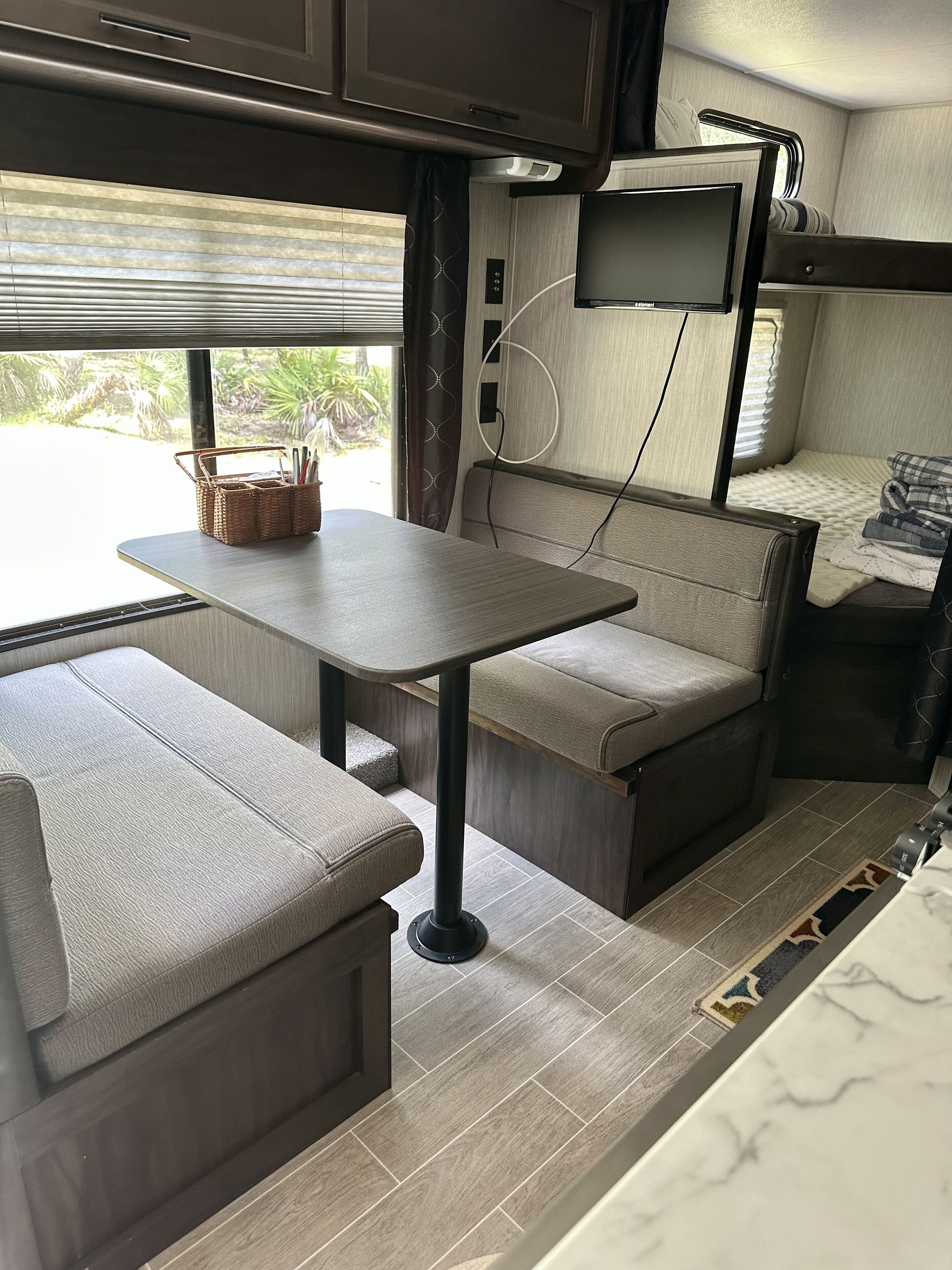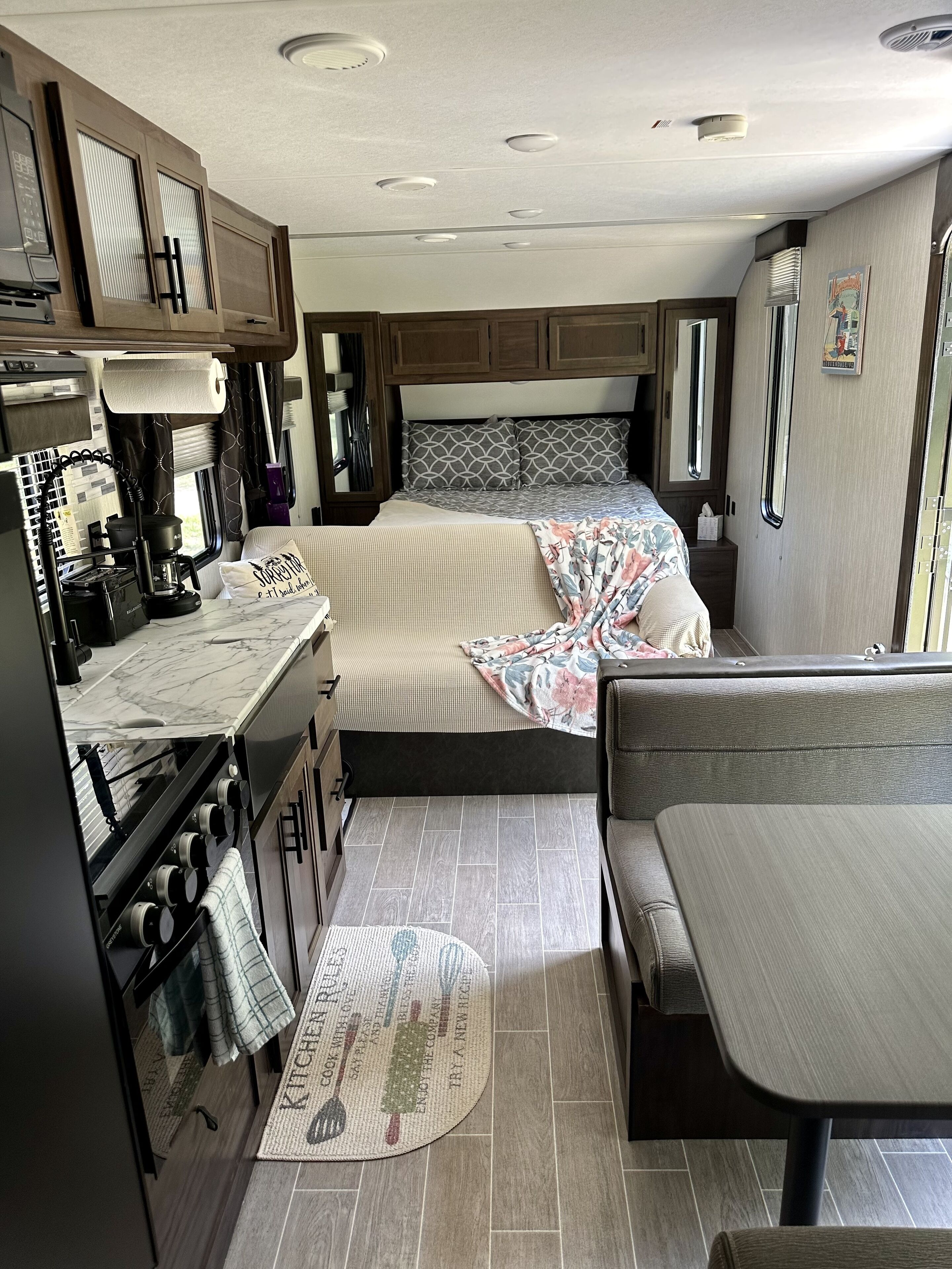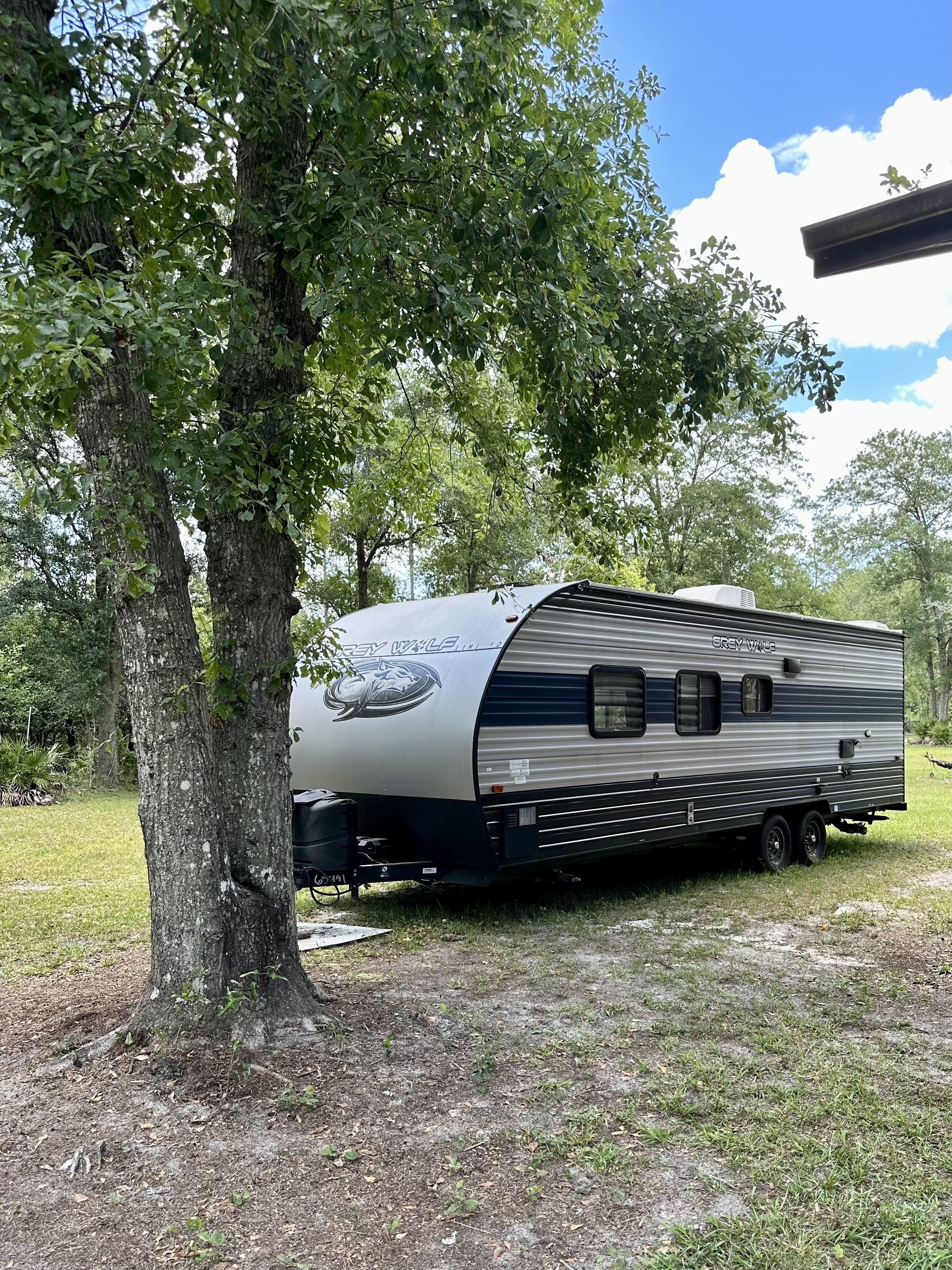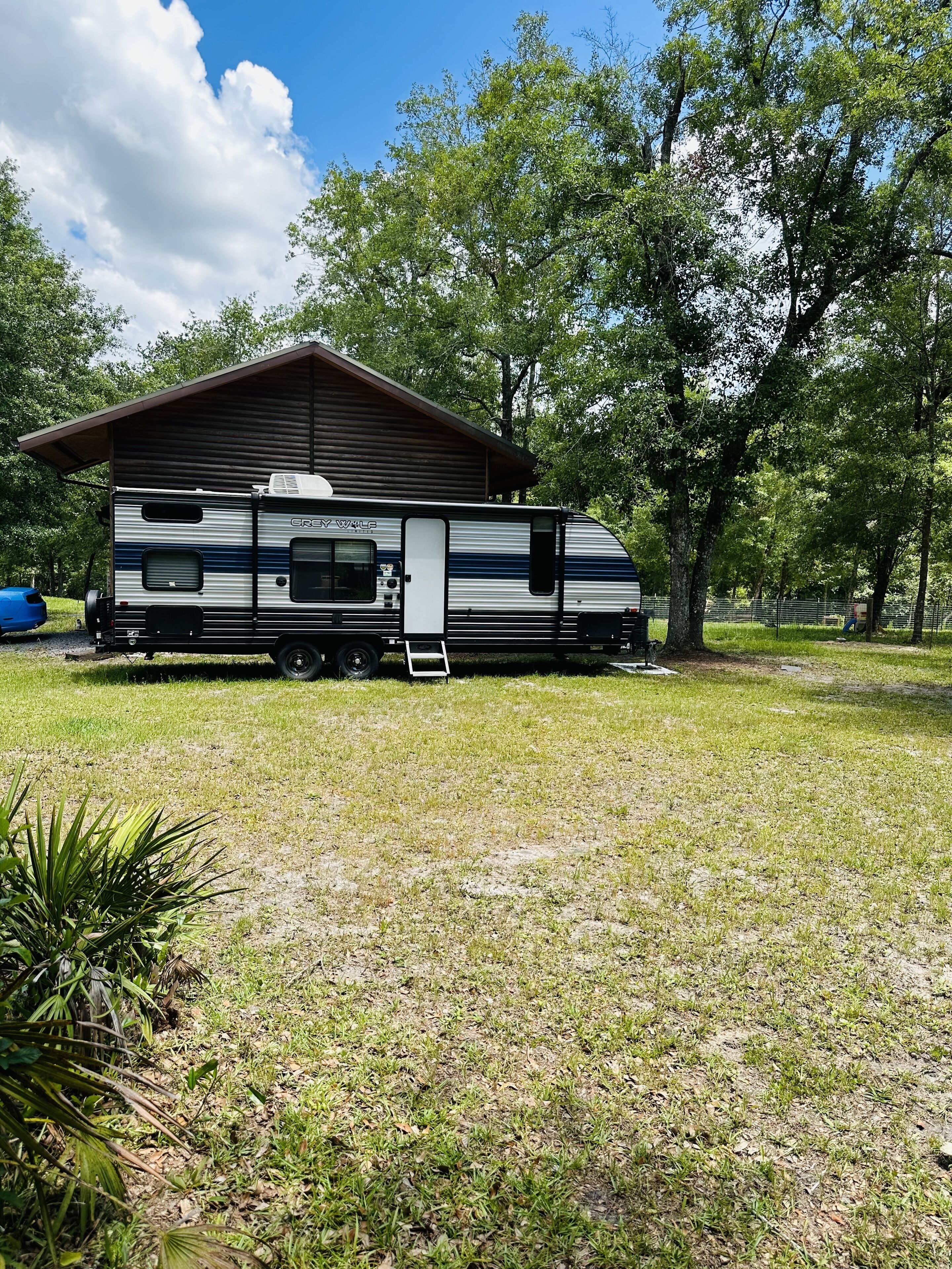 Clean 30’ Travel Trailer on a small 5 acre farm. Bring the kids, room for 7! The property is on a five acre farm in Middleburg Fl. Middleburg is between Jacksonville Fl. And Gainesville Fl. It is also close to Green cove springs, Jenny Springs and St. Augustine Florida. It is about 1 hr 1/5 minutes from Beaches. Most Grocery and more is 3.5 mls away. Uber, and delivery come out to property. The Travel trailer is on property that contains a small finger of the black creek. When half full it creates nice ambiance. Farm contains goats, Rooster, chickens, dogs and 2 guinea hens. More animals to come. The location is private and rural but close to shopping, Hospitals, the V.A. and to multiple city’s. This rental would be perfect for a family needing a nights rest on the way to Disney World, or Traveling a nurse. Nightly and weekly rental an option.Trailer is equipped with USB ports in bunks and main bed area. It has two closets and cupboards for clothes. It has clean linens and blankets for all sleep areas. Couch is a futon, the bed collapses down to a small sleeping space suitable for young children. There are storage areas for luggage under table benches, futon and main queen bed. Step in shower has a small basin a toddler could bath in. Towels and wash cloths are provided. Kitchen is fully equipped with cooking and baking supplies. All appliances are super clean. Water is from well and waste is set up on septic. Toilet paper suitable for septic is provided. No feminine products are to be flushed, EVER! Waste cans and bags are provided in trailer and a large waste can is provided outside trailer. There is plenty of parking space and a light pole is near for light. More light at carport (carport not available) can be provided upon request. Property contains 2 gates. Main home is less than 100 yards away and owners reside on property.