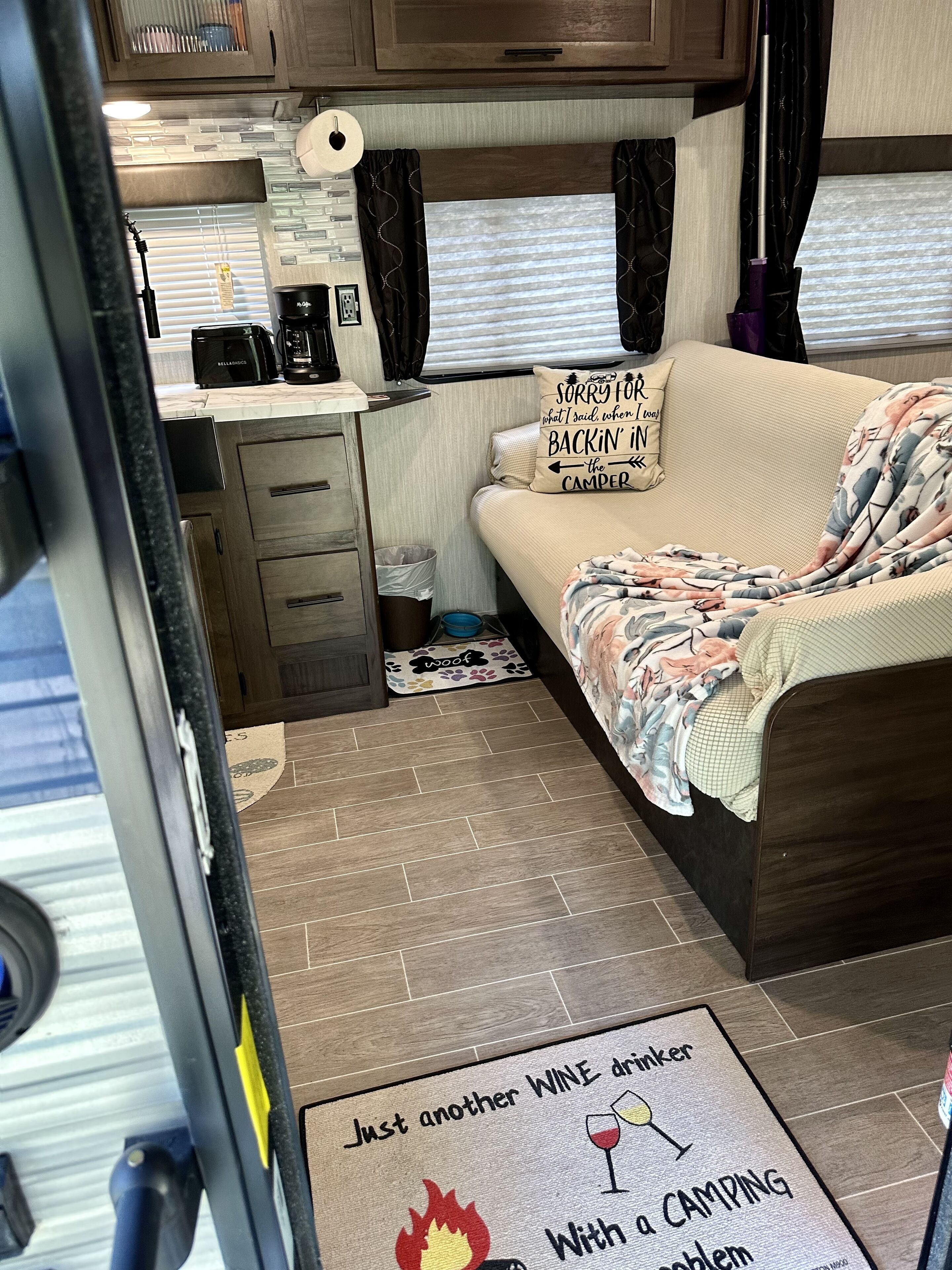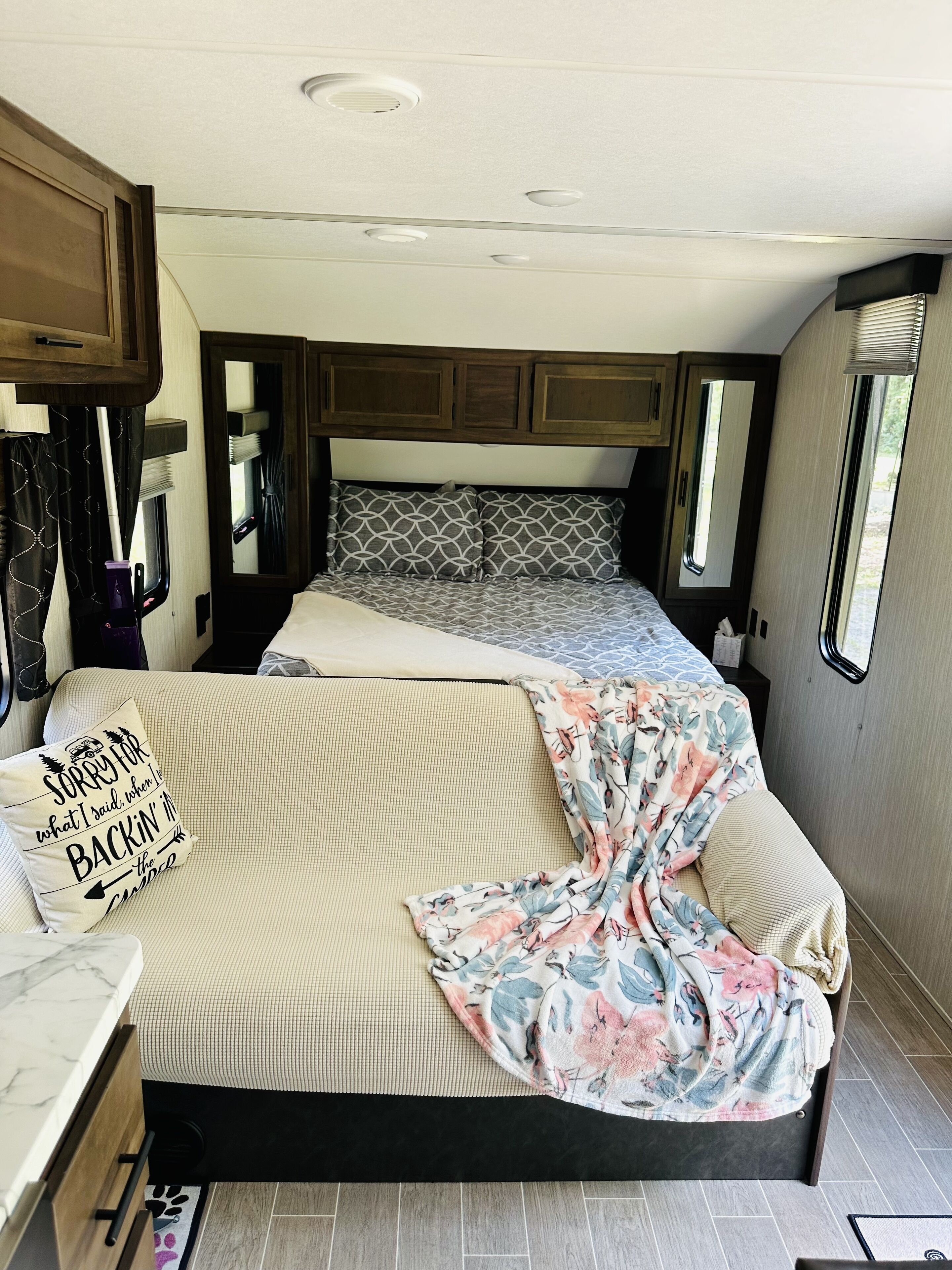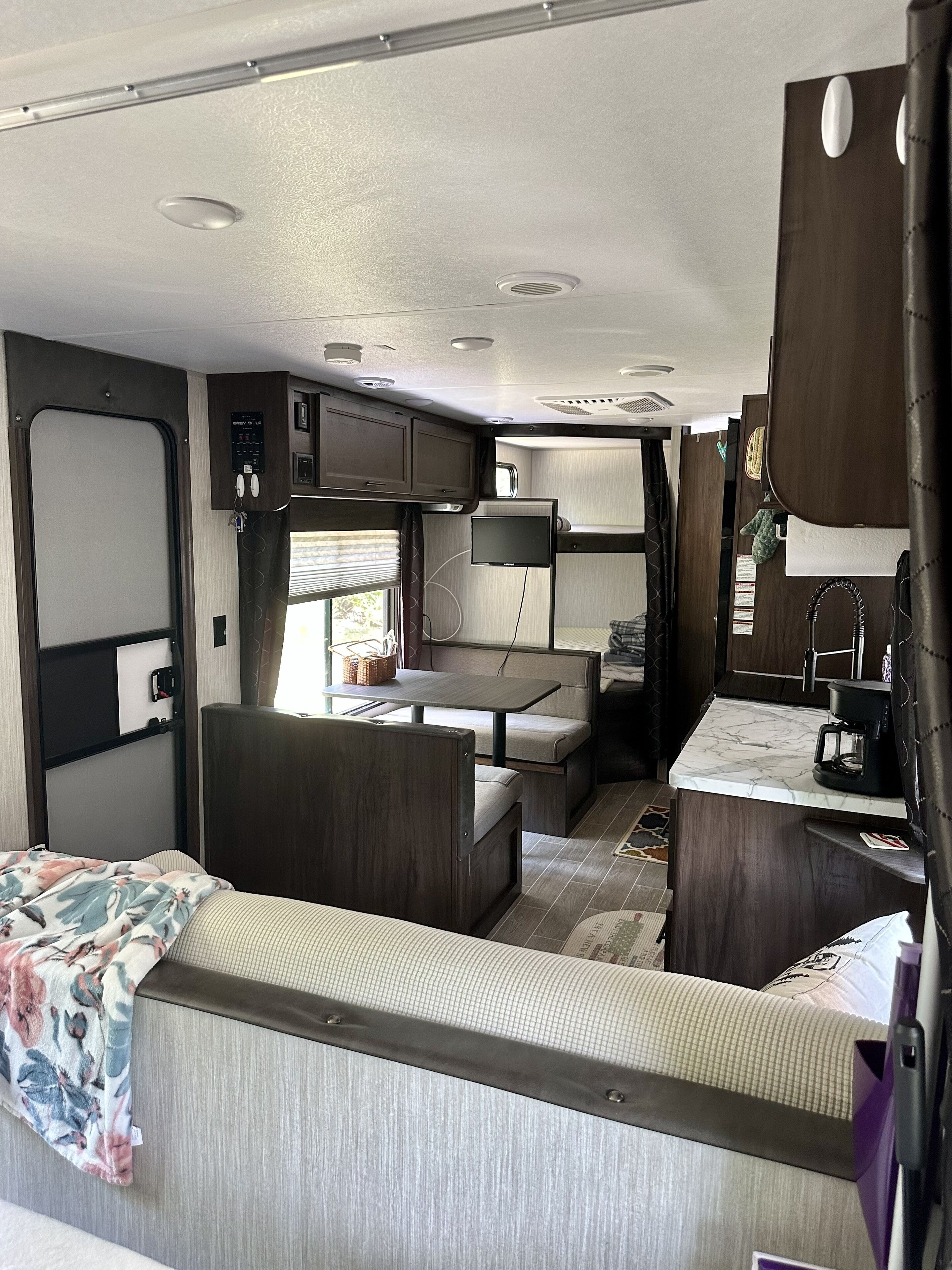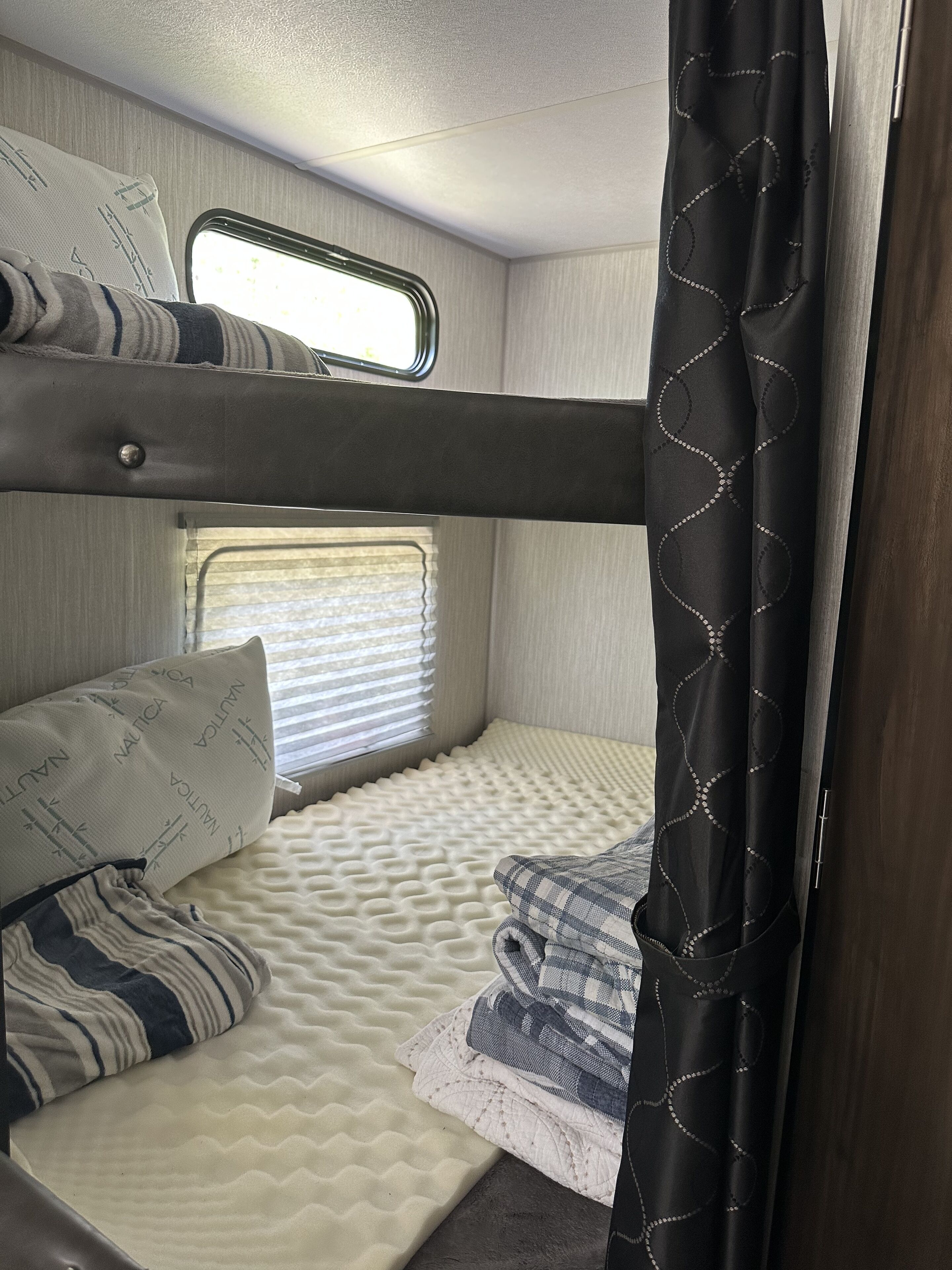 Clean 30’ Travel Trailer on a small 5 acre farm. Bring the kids, room for 7! The property is on a five acre farm in Middleburg Fl. Middleburg is between Jacksonville Fl. And Gainesville Fl. It is also close to Green cove springs, Jenny Springs and St. Augustine Florida. It is about 1 hr 1/5 minutes from Beaches. Most Grocery and more is 3.5 mls away. Uber, and delivery come out to property. The Travel trailer is on property that contains a small finger of the black creek. When half full it creates nice ambiance. Farm contains goats, Rooster, chickens, dogs and 2 guinea hens. More animals to come. The location is private and rural but close to shopping, Hospitals, the V.A. and to multiple city’s. This rental would be perfect for a family needing a nights rest on the way to Disney World, or Traveling a nurse. Nightly and weekly rental an option.Trailer is equipped with USB ports in bunks and main bed area. It has two closets and cupboards for clothes. It has clean linens and blankets for all sleep areas. Couch is a futon, the bed collapses down to a small sleeping space suitable for young children. There are storage areas for luggage under table benches, futon and main queen bed. Step in shower has a small basin a toddler could bath in. Towels and wash cloths are provided. Kitchen is fully equipped with cooking and baking supplies. All appliances are super clean. Water is from well and waste is set up on septic. Toilet paper suitable for septic is provided. No feminine products are to be flushed, EVER! Waste cans and bags are provided in trailer and a large waste can is provided outside trailer. There is plenty of parking space and a light pole is near for light. More light at carport (carport not available) can be provided upon request. Property contains 2 gates. Main home is less than 100 yards away and owners reside on property.