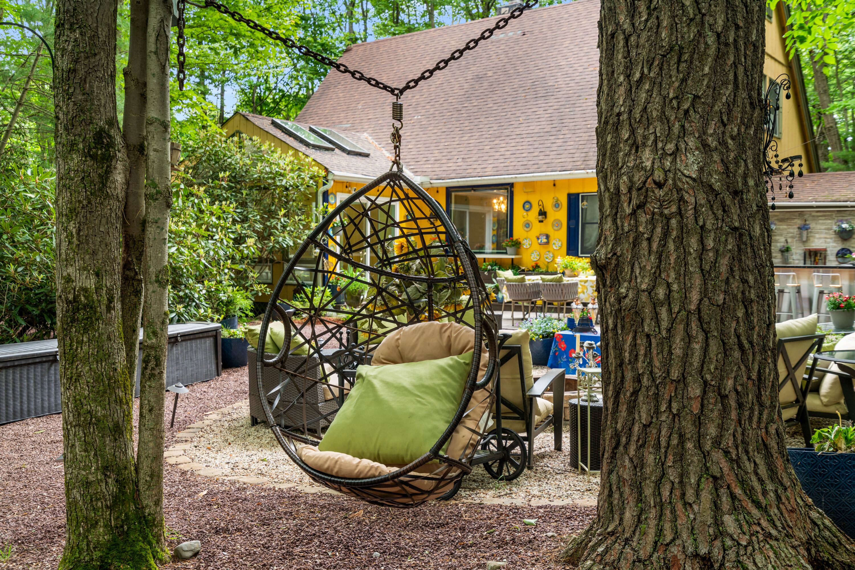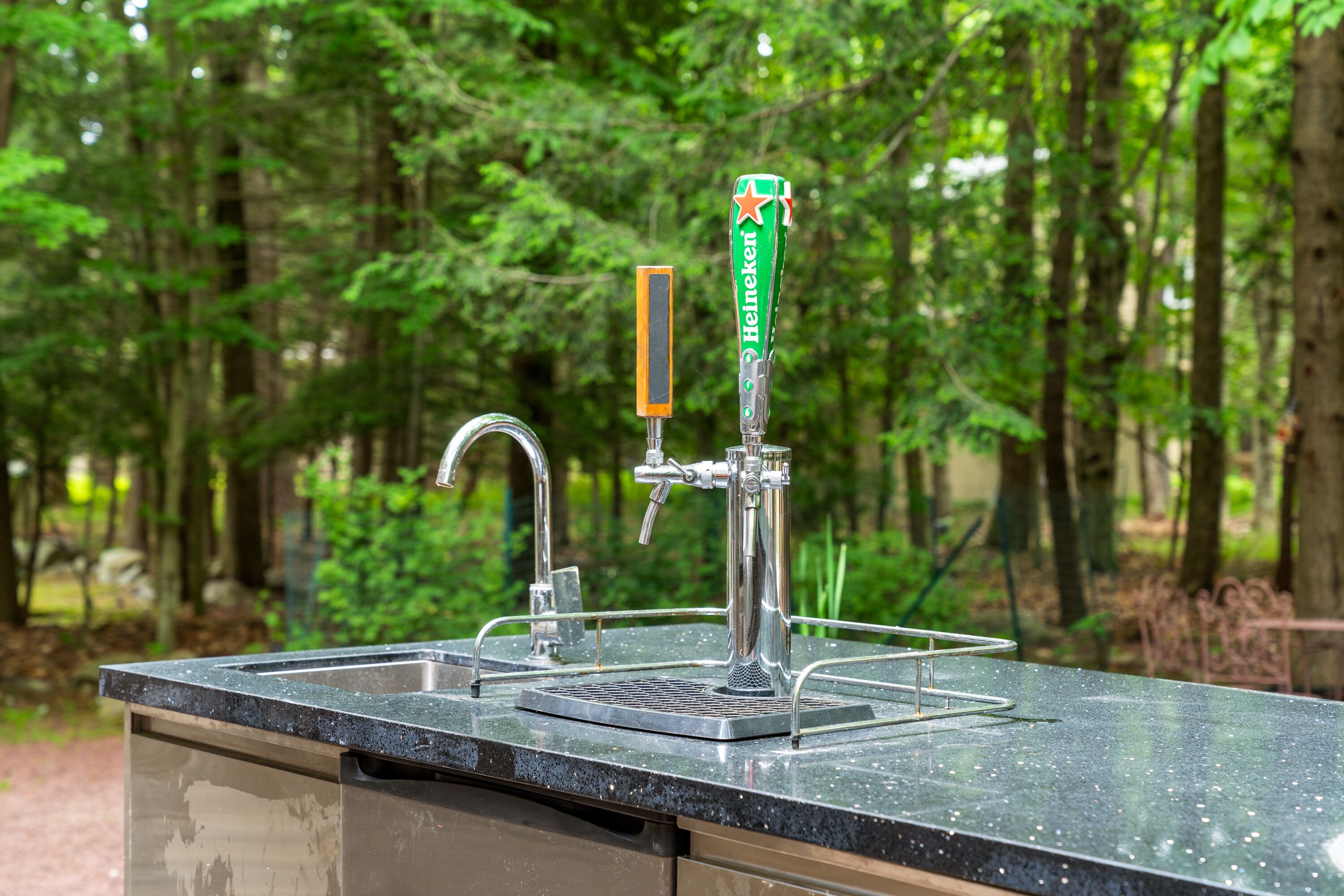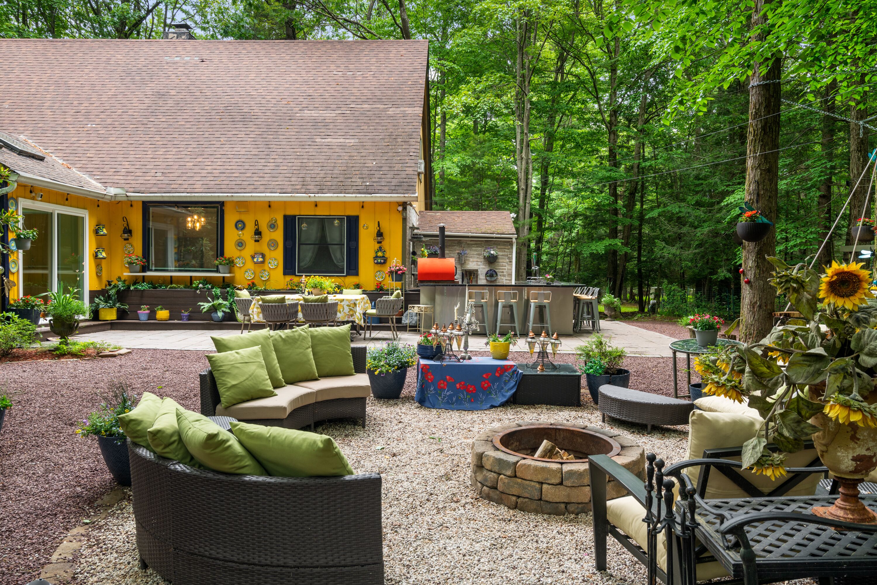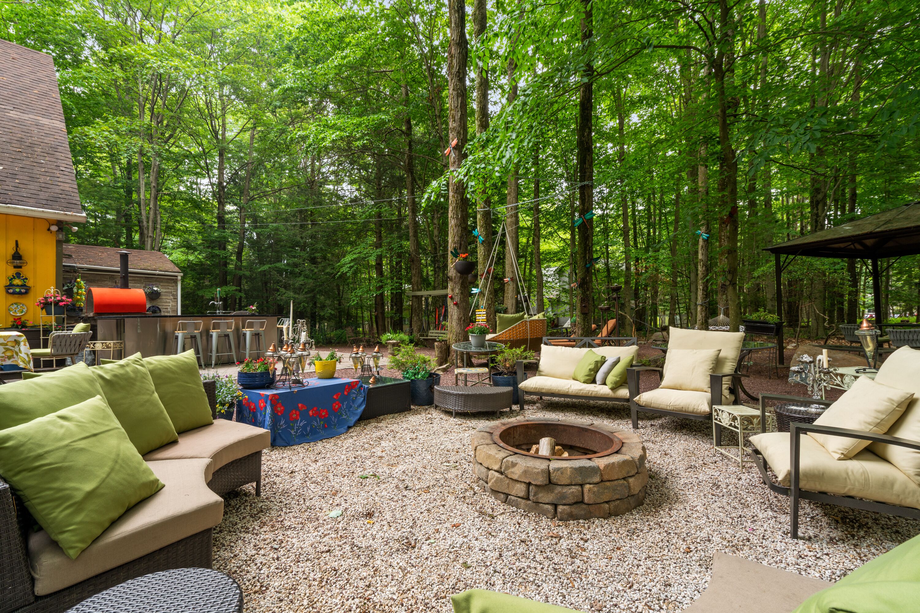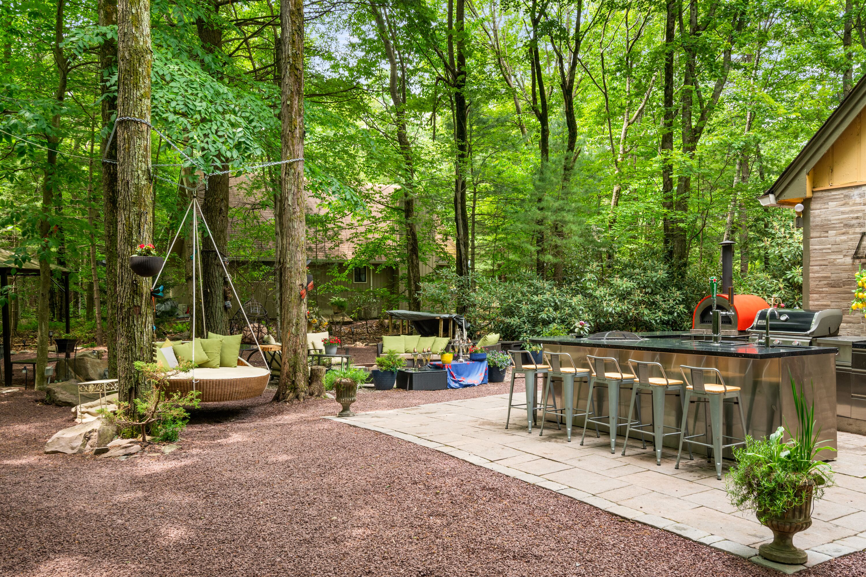Lake Naomi Forest Oasis Retreat with Hot Tub & Lounging Galore This Modern Luxury French Country Villa in Lake Naomi, 5 minute walk or 1 min drive to the lake, Paddle board, kayaks available, has 4 King size bedrooms, 2 full BathsMarble counters, Spacious Living Room, flat screen TVs. Heos Sound System inside and outside, Large Deck, 2 Huge Fire Pit, Outdoor Bar, gas BBQ, wood burning Pizza Oven and a Beer Tap!! Hot tub and Japanese massage chair. Welcome to the exquisite Lake Naomi Modern Luxury French Country Villa, your ultimate Vrbo retreat in the beautiful Poconos. This magical vacation home offers an unforgettable escape with its luxurious amenities, including a private pool and hot tub, making it a true haven for relaxation and rejuvenation.As one of the premier Lake Naomi rentals, this lake house retreat is designed to provide a luxurious experience like no other. Nestled amidst nature's beauty, it offers a serene and enchanting ambiance, perfect for those seeking a luxury retreat.Indulge in the comforts of this magical vacation home, featuring 4 king-size bedrooms adorned with luxurious Egyptian cotton linens, ensuring a restful and indulgent stay. The villa boasts 2 full baths with elegant marble counters, adding a touch of sophistication to your daily routines.Step into the spacious living room, where you can unwind and create cherished memories with your loved ones. The well-appointed dining room sets the stage for memorable meals, while the flat-screen TVs and immersive Heos Sound System provide entertainment and enhance the atmosphere.The outdoor space is truly a gem, featuring a private pool and a soothing hot tub, inviting you to relax and enjoy the picturesque surroundings. This luxury retreat offers the perfect blend of tranquility and adventure, with easy access to the pristine lake and recreational activities.Discover the allure of this Lake Naomi rental, where luxury meets nature's beauty. Whether you're seeking a romantic getaway or a family vacation, this enchanting vacation home is the ideal choice for a magical and unforgettable experience.Book your stay at Lake Naomi Modern Luxury French Country Villa and unlock the door to a world of luxury, relaxation, and cherished memories. Explore the Poconos, indulge in the beauty of Lake Naomi, and embrace the serenity of this extraordinary retreat.Please note that a Lake Naomi Club (LNC) temporary membership is required for pool, beach, and camp access, ensuring access to a wide range of amenities and recreational activities. As a special offer, enjoy a complimentary LNC membership with a stay of 3 weeks or more.Outdoor Space has a Floating Bed, A Fire Pit, a Gazebo, This is a Wooded Shangrala!!! with access to the Lake Naomi, (Pool & Beach lounging req LNC temp Membership)