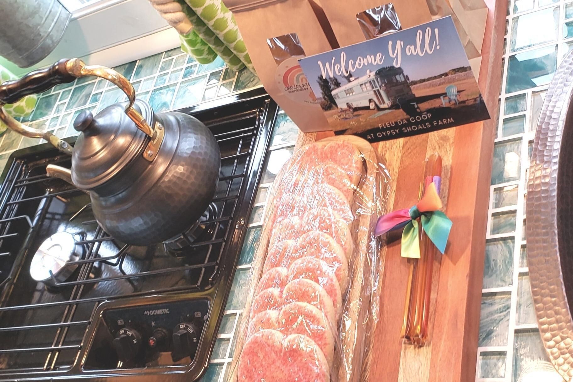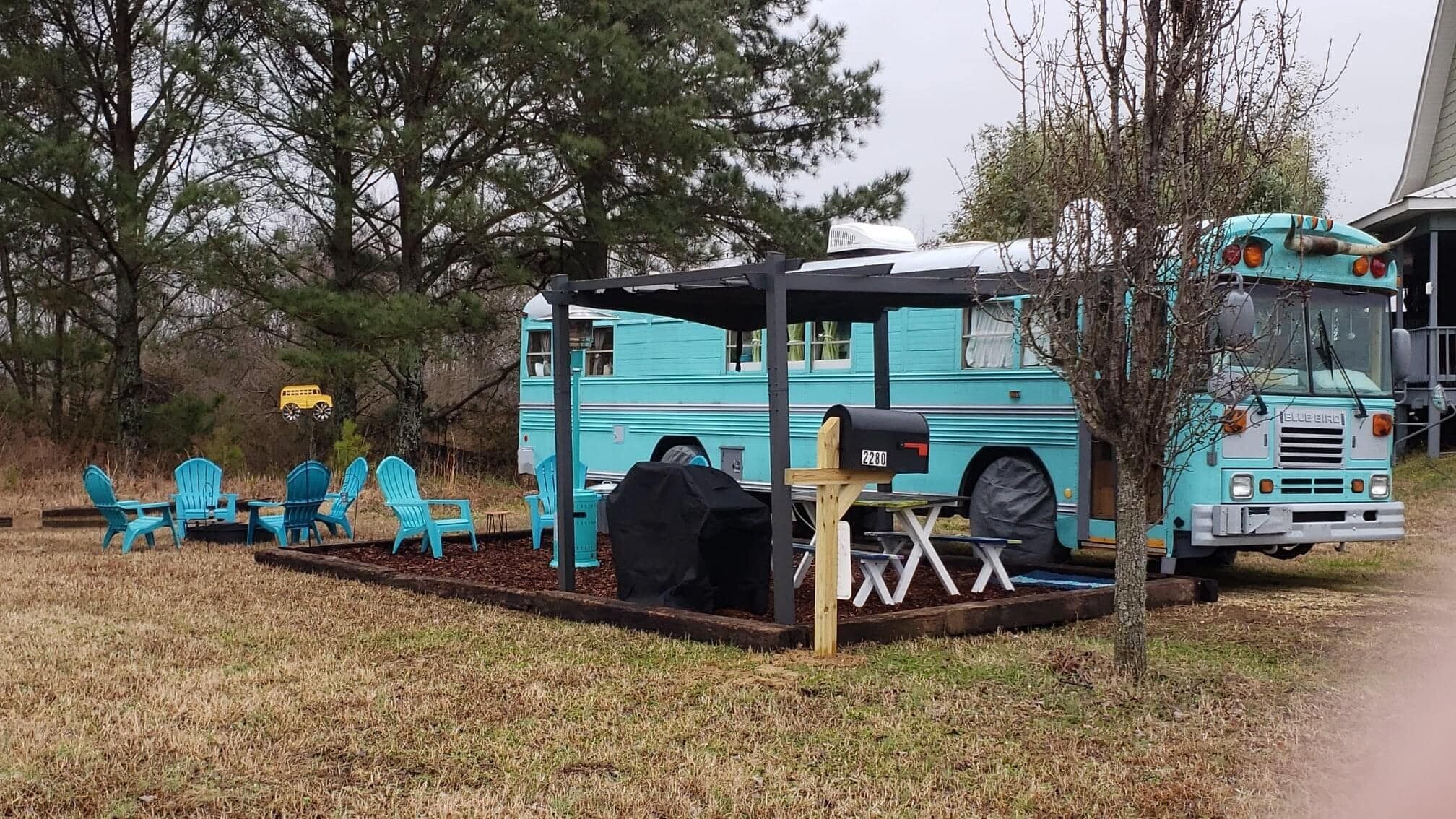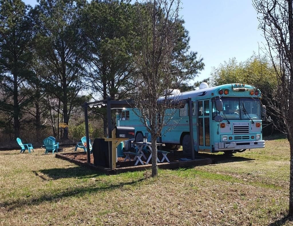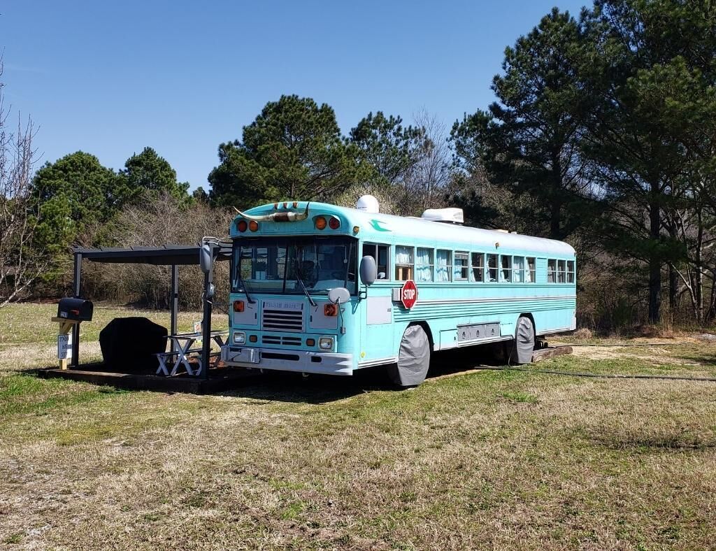 Skoolie Glamping Fleu da Coop is part of a recent revival to convert retired school buses into stylish motorhomes. These unique homes on wheels are called skoolies (or schoolies) and provide a truly unique glamping experience.Our skoolie is a 38 ft. converted 2003 Bluebird school bus and offers all of the amenities you would expect in a traditional vacation rental, but kicked up a few levels of coolness. The perfect fish camp for a guy's getaway to fish the Crappie Capital of the World, Weiss Lake. (Fish cleaning station and fish fry equipment on site too!)Enjoy farm fresh eggs delivered to your door to cook an amazing breakfast. Enjoy local honey from right here on our farm. Visit with our alpacas, emus, goats and chickens for a fun farm experience.We are on the lake, but not on deep water. (the lake is behind our house but not accessible by boat). The closest launch is less than 1 mile away on our road and we have plenty of easy and secure boat parking.SLEEPING ARRANGEMENTS:Fleu da Coop has 1 Queen memory foam bed in the back with 1 twin memory foam bed in the cabin and 1 twin memory foam bed that doubles as a couch. (Sleeps a total of 4 max). There is a TV in the queen bedroom with two small nightstands with shelves, lights, plugs/usb ports.COOKING ARRANGEMENTS:The kitchen has a 2 burner RV size propane stove top. There is also a gas grill with side burner on the patio. Need to clean those fish you caught on Weiss Lake? There is also a fish cleaning station available to guests on property. The kitchen holds a wine refrigerator and a hotel size refrigerator/freezer combo. Small appliances on board include a microwave, coffee pot, tea kettle, mixer, and all the pots/pans, cooking utensils, dishes and glassware needed to do basic cooking.BATH ARRANGEMENTS:Space is a premium on a school bus, so the bathroom is where you take it from. Fleu da Coop's bathroom is built around the school bus wheel well. This creative use of space makes for a very tight entrance, but a full stand up shower. There is a lav sink on the wall to brush your teeth and wash your face. The toilet is a standard household model and sits up on the wheel well. (We only mention this because some skoolies have composting toilets. This one does not.) Reality: if you're big on luxury bathrooms, this skoolie is not that.TV & INTERNET SITUATIONOur skoolie has one large TV in the main cabin and another small TV in the queen bedroom. Both Smart TV's have YouTube TV Premium and get all the live channels including local stations, comparable to Dish 200 package. The farm has internet with Weiss Internet and gets the best service possible for our rural area.OUTDOOR LIVING SPACEIn addition to sitting on a 23 acre farm, Fleu da Coop has it's own patio area just outside the bus. The space includes a picnic table, large outdoor space heater for those chillier evenings, a gas grill with side burner, firepit area with Adirondack chairs and a canopy covered seating area. You are free to explore our 23 acre farm anywhere outside the gates that enclose our personal living spaces and barn.SECURITYWe are on property 24/7 for any concerns. You will also have a unique code for your entry to the bus via keypad. There is a safe inside the bus to secure your valuables.When booking, please keep in mind that it is a converted school bus so it is 6'2" high for head room and 7.5 feet wide. There are also steps to climb when entering the school bus and the bathroom/shower. This is a "glamping" experience and there is a picnic table, grill, seating and firepit for outdoor relaxing.